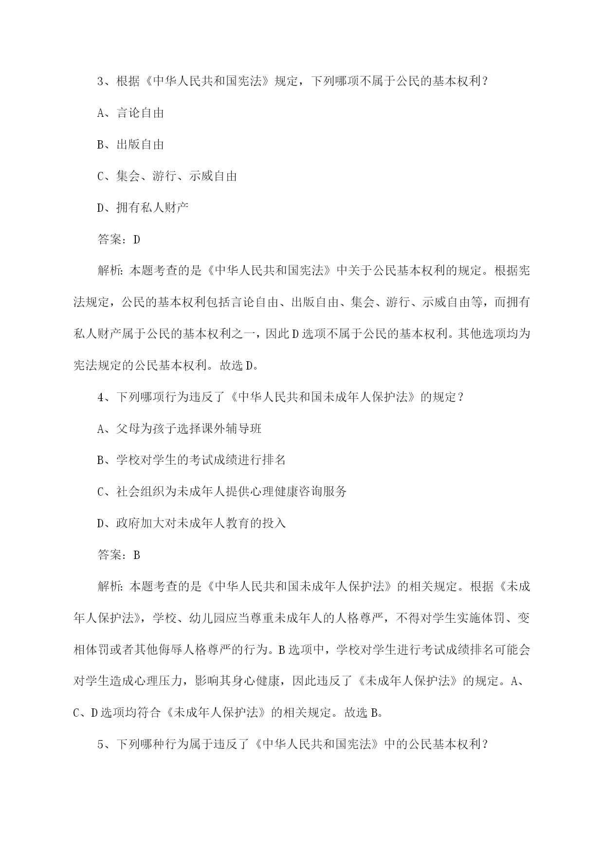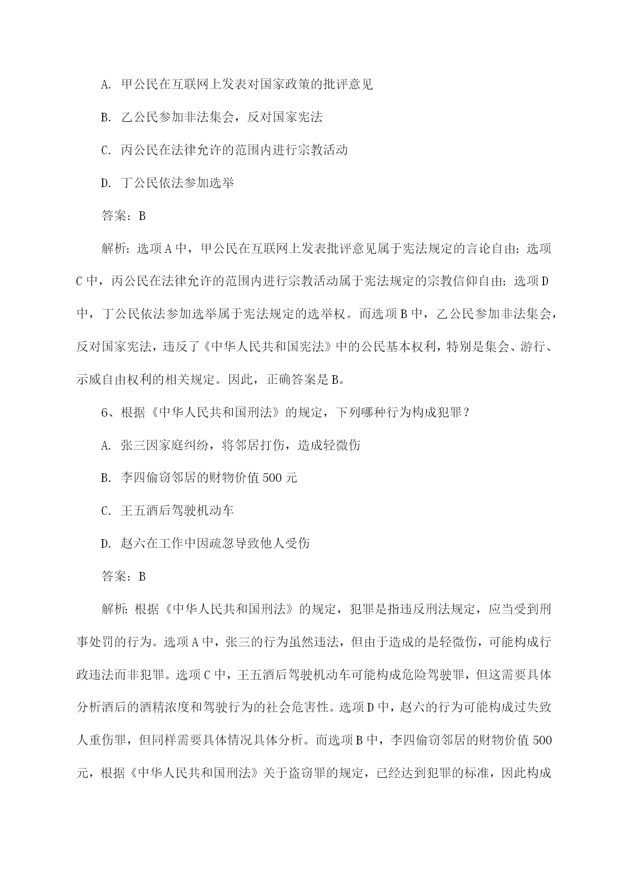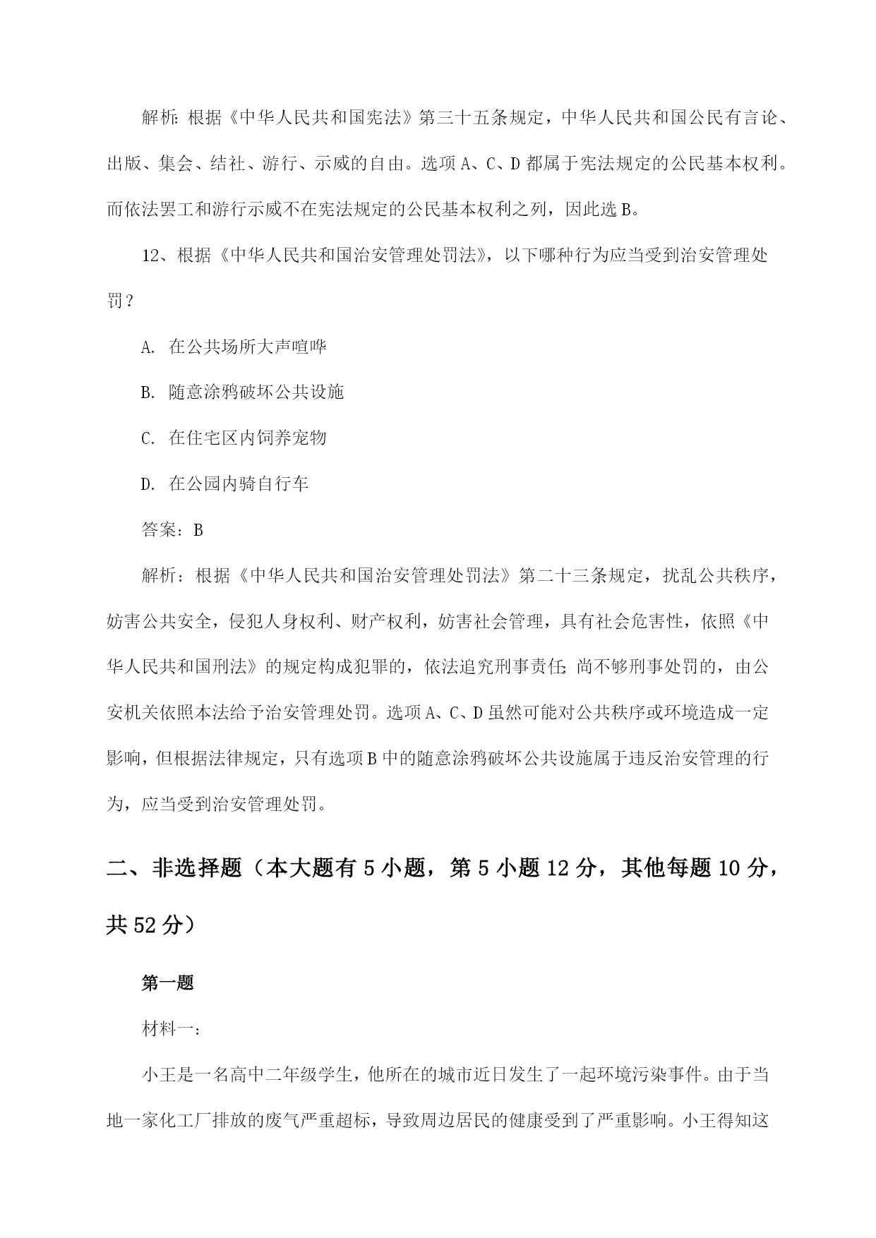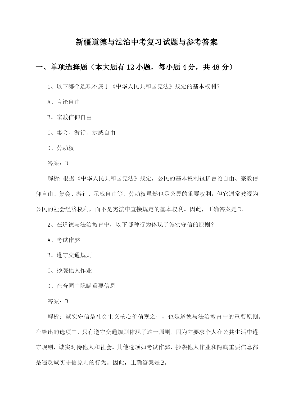 新疆道德与法治中考复习试题与参考答案一、单项选择题(本大题有12小题,每小题4分,共48分)1、以下哪个选项不属于《中华人民共和国宪法》规定的基本权利?A、言论自由B、宗教信仰自由C、集会、游行、示威自由D、劳动权答案:D解析:根据《中华人民共和国宪法》规定,公民的基本权利包括言论自由、宗教信仰自由、集会、游行、示威自由等。劳动权虽然也是公民的重要权利,但它通常被视为公民的社会经济权利,而不是宪法中直接规定的基本权利。因此,正确答案是D。2、在道德与法治教育中,以下哪种行为体现了诚实守信的原则?A、考试作弊B、遵守交通规则C、抄袭他人作业D、在合同中隐瞒重要信息答案:B解析:诚实守信是社会主义核心价值观之一,也是道德与法治教育中的重要原则。在给出的选项中,只有遵守交通规则体现了这一原则,因为它要求个人在公共生活中遵守规则,诚实对待他人和社会。其他选项如考试作弊、抄袭他人作业和隐瞒重要信息都是违反诚实守信原则的行为。因此,正确答案是B。3、根据《中华人民共和国宪法》规定,下列哪项不属于公民的基本权利?A、言论自由B、出版自由C、集会、游行、示威自由D、拥有私人财产答案:D解析:本题考查的是《中华人民共和国宪法》中关于公民基本权利的规定。根据宪法规定,公民的基本权利包括言论自由、出版自由、集会、游行、示威自由等,而拥有私人财产属于公民的基本权利之一,因此D选项不属于公民的基本权利。其他选项均为宪法规定的公民基本权利。故选D。4、下列哪项行为违反了《中华人民共和国未成年人保护法》的规定?A、父母为孩子选择课外辅导班B、学校对学生的考试成绩进行排名C、社会组织为未成年人提供心理健康咨询服务D、政府加大对未成年人教育的投入答案:B解析:本题考查的是《中华人民共和国未成年人保护法》的相关规定。根据《未成年人保护法》,学校、幼儿园应当尊重未成年人的人格尊严,不得对学生实施体罚、变相体罚或者其他侮辱人格尊严的行为。B选项中,学校对学生进行考试成绩排名可能会对学生造成心理压力,影响其身心健康,因此违反了《未成年人保护法》的规定。A、C、D选项均符合《未成年人保护法》的相关规定。故选B。5、下列哪种行为属于违反了《中华人民共和国宪法》中的公民基本权利?A.甲公民在互联网上发表对国家政策的批评意见B.乙公民参加非法集会,反对国家宪法C.丙公民在法律允许的范围内进行宗教活动D.丁公民依法参加选举答案:B解析:选项A中,甲公民在互联网上发表批评意见属于宪法规定的言论自由;选项C中,丙公民在法律允许的范围内进行宗教活动属于宪法规定的宗教信仰自由;选项D中,丁公民依法参加选举属于宪法规定的选举权。而选项B中,乙公民参加非法集会,反对国家宪法,违反了《中华人民共和国宪法》中的公民基本权利,特别是集会、游行、示威自由权利的相关规定。因此,正确答案是B。6、根据《中华人民共和国刑法》的规定,下列哪种行为构成犯罪?A.张三因家庭纠纷,将邻居打伤,造成轻微伤B.李四偷窃邻居的财物价值500元C.王五酒后驾驶机动车D.赵六在工作中因疏忽导致他人受伤答案:B解析:根据《中华人民共和国刑法》的规定,犯罪是指违反刑法规定,应当受到刑事处罚的行为。选项A中,张三的行为虽然违法,但由于造成的是轻微伤,可能构成行政违法而非犯罪。选项C中,王五酒后驾驶机动车可能构成危险驾驶罪,但这需要具体分析酒后的酒精浓度和驾驶行为的社会危害性。选项D中,赵六的行为可能构成过失致人重伤罪,但同样需要具体情况具体分析。而选项B中,李四偷窃邻居的财物价值500元,根据《中华人民共和国刑法》关于盗窃罪的规定,已经达到犯罪的标准,因此构成犯罪。正确答案是B。7、根据我国《宪法》规定,下列哪项不属于公民的基本权利?A.选举权和被选举权B.言论自由C.劳动权D.财产权答案:D解析:根据我国《宪法》规定,公民的基本权利包括选举权和被选举权、言论自由、劳动权等。财产权虽然也是公民的重要权利,但它不属于《宪法》明确规定的公民的基本权利。因此,选项D是正确答案。8、我国《治安管理处罚法》规定,扰乱公共秩序,妨害公共安全的行为,将受到何种处罚?A.警告B.罚款C.行政拘留D.以上都是答案:D解析:根据我国《治安管理处罚法》的规定,扰乱公共秩序,妨害公共安全的行为,可以受到警告、罚款、行政拘留等处罚。因此,选项D“以上都是”是正确答案。9、下列关于法律与道德关系的表述,正确的是:A.法律高于道德,道德是法律的补充B.道德高于法律,法律是道德的体现C.法律与道德是相互独立、没有联系的D.法律与道德同等重要,相互替代答案:B解析:道德是社会公认的行为准则,法律是国家制定的行为规范。道德通常在法律没有