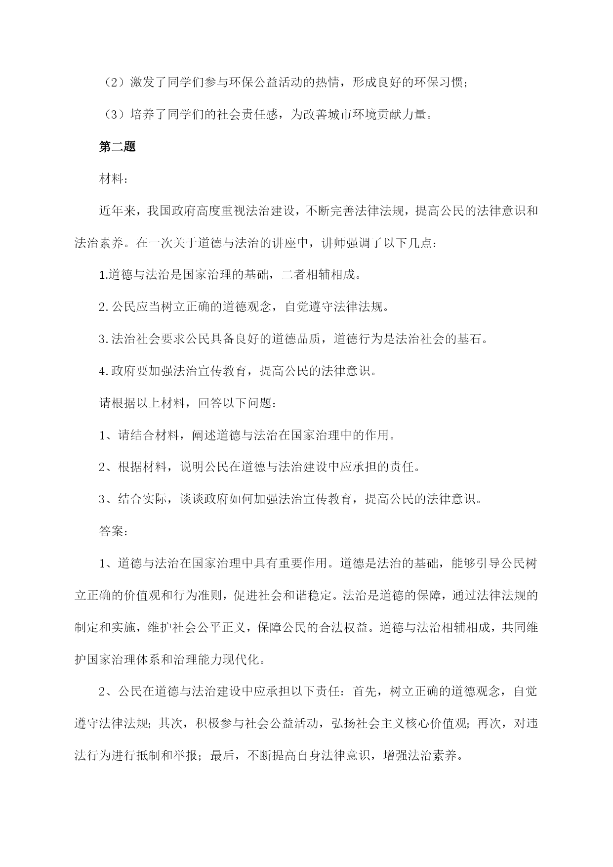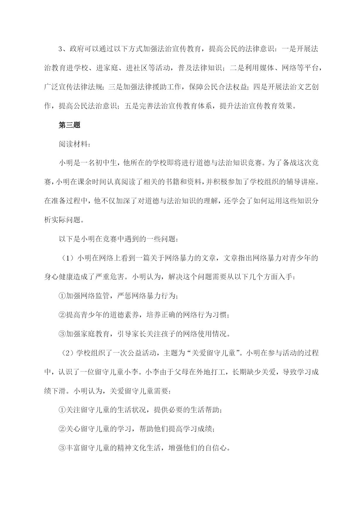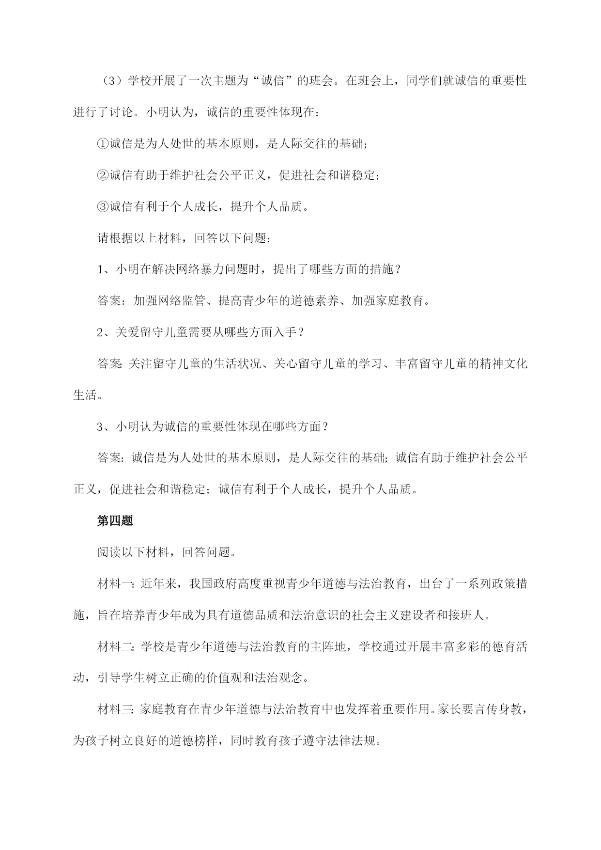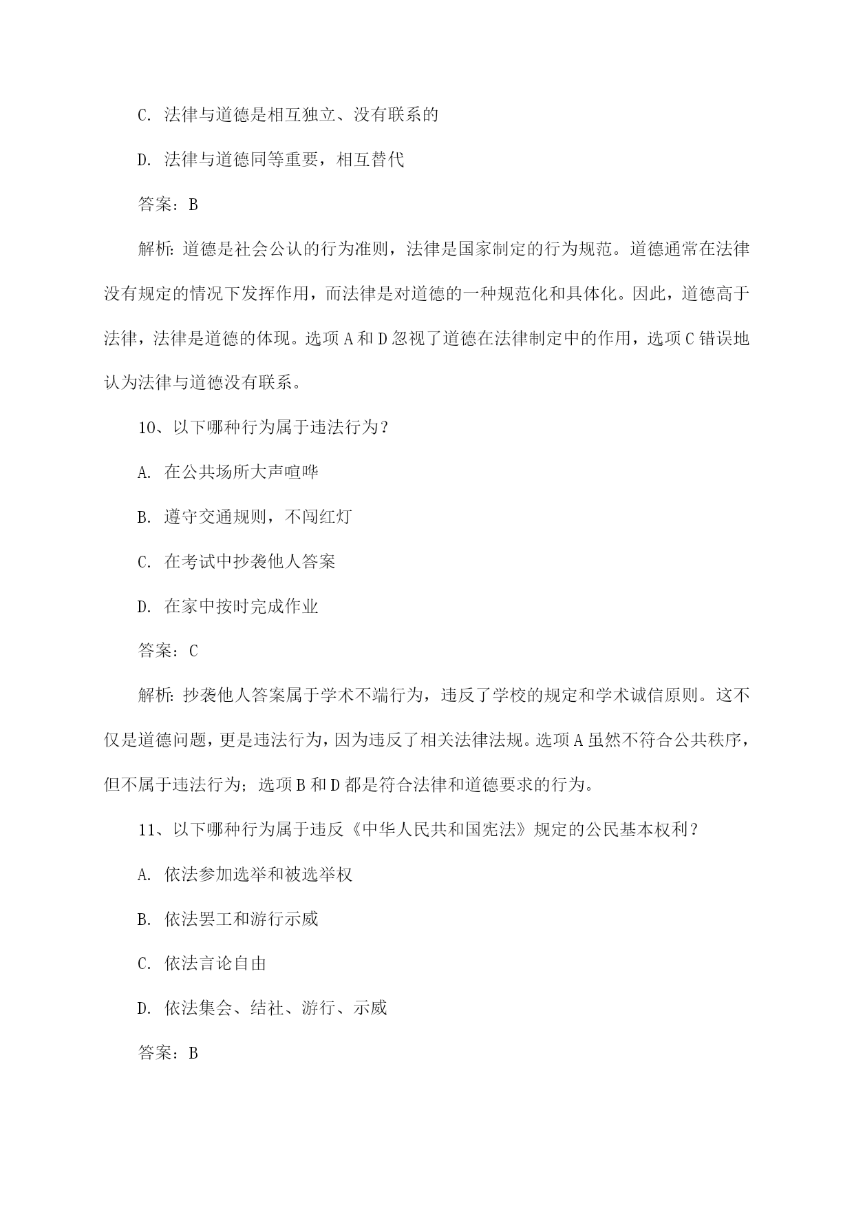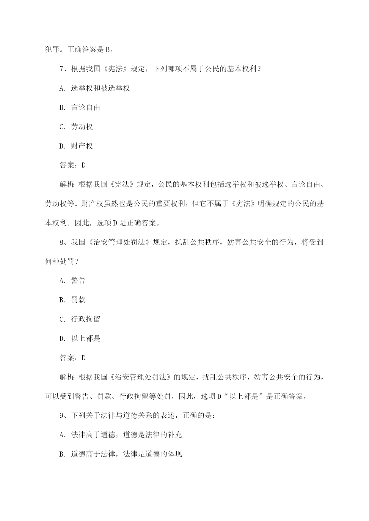 新疆道德与法治中考复习试题与参考答案一、单项选择题(本大题有12小题,每小题4分,共48分)1、以下哪个选项不属于《中华人民共和国宪法》规定的基本权利?A、言论自由B、宗教信仰自由C、集会、游行、示威自由D、劳动权答案:D解析:根据《中华人民共和国宪法》规定,公民的基本权利包括言论自由、宗教信仰自由、集会、游行、示威自由等。劳动权虽然也是公民的重要权利,但它通常被视为公民的社会经济权利,而不是宪法中直接规定的基本权利。因此,正确答案是D。2、在道德与法治教育中,以下哪种行为体现了诚实守信的原则?A、考试作弊B、遵守交通规则C、抄袭他人作业D、在合同中隐瞒重要信息答案:B解析:诚实守信是社会主义核心价值观之一,也是道德与法治教育中的重要原则。在给出的选项中,只有遵守交通规则体现了这一原则,因为它要求个人在公共生活中遵守规则,诚实对待他人和社会。其他选项如考试作弊、抄袭他人作业和隐瞒重要信息都是违反诚实守信原则的行为。因此,正确答案是B。3、根据《中华人民共和国宪法》规定,下列哪项不属于公民的基本权利?A、言论自由B、出版自由C、集会、游行、示威自由D、拥有私人财产答案:D解析:本题考查的是《中华人民共和国宪法》中关于公民基本权利的规定。根据宪法规定,公民的基本权利包括言论自由、出版自由、集会、游行、示威自由等,而拥有私人财产属于公民的基本权利之一,因此D选项不属于公民的基本权利。其他选项均为宪法规定的公民基本权利。故选D。4、下列哪项行为违反了《中华人民共和国未成年人保护法》的规定?A、父母为孩子选择课外辅导班B、学校对学生的考试成绩进行排名C、社会组织为未成年人提供心理健康咨询服务D、政府加大对未成年人教育的投入答案:B解析:本题考查的是《中华人民共和国未成年人保护法》的相关规定。根据《未成年人保护法》,学校、幼儿园应当尊重未成年人的人格尊严,不得对学生实施体罚、变相体罚或者其他侮辱人格尊严的行为。B选项中,学校对学生进行考试成绩排名可能会对学生造成心理压力,影响其身心健康,因此违反了《未成年人保护法》的规定。A、C、D选项均符合《未成年人保护法》的相关规定。故选B。5、下列哪种行为属于违反了《中华人民共和国宪法》中的公民基本权利?A.甲公民在互联网上发表对国家政策的批评意见B.乙公民参加非法集会,反对国家宪法C.丙公民在法律允许的范围内进行宗教活动D.丁公民依法参加选举答案:B解析:选项A中,甲公民在互联网上发表批评意见属于宪法规定的言论自由;选项C中,丙公民在法律允许的范围内进行宗教活动属于宪法规定的宗教信仰自由;选项D中,丁公民依法参加选举属于宪法规定的选举权。而选项B中,乙公民参加非法集会,反对国家宪法,违反了《中华人民共和国宪法》中的公民基本权利,特别是集会、游行、示威自由权利的相关规定。因此,正确答案是B。6、根据《中华人民共和国刑法》的规定,下列哪种行为构成犯罪?A.张三因家庭纠纷,将邻居打伤,造成轻微伤B.李四偷窃邻居的财物价值500元C.王五酒后驾驶机动车D.赵六在工作中因疏忽导致他人受伤答案:B解析:根据《中华人民共和国刑法》的规定,犯罪是指违反刑法规定,应当受到刑事处罚的行为。选项A中,张三的行为虽然违法,但由于造成的是轻微伤,可能构成行政违法而非犯罪。选项C中,王五酒后驾驶机动车可能构成危险驾驶罪,但这需要具体分析酒后的酒精浓度和驾驶行为的社会危害性。选项D中,赵六的行为可能构成过失致人重伤罪,但同样需要具体情况具体分析。而选项B中,李四偷窃邻居的财物价值500元,根据《中华人民共和国刑法》关于盗窃罪的规定,已经达到犯罪的标准,因此构成犯罪。正确答案是B。7、根据我国《宪法》规定,下列哪项不属于公民的基本权利?A.选举权和被选举权B.言论自由C.劳动权D.财产权答案:D解析:根据我国《宪法》规定,公民的基本权利包括选举权和被选举权、言论自由、劳动权等。财产权虽然也是公民的重要权利,但它不属于《宪法》明确规定的公民的基本权利。因此,选项D是正确答案。8、我国《治安管理处罚法》规定,扰乱公共秩序,妨害公共安全的行为,将受到何种处罚?A.警告B.罚款C.行政拘留D.以上都是答案:D解析:根据我国《治安管理处罚法》的规定,扰乱公共秩序,妨害公共安全的行为,可以受到警告、罚款、行政拘留等处罚。因此,选项D“以上都是”是正确答案。9、下列关于法律与道德关系的表述,正确的是:A.法律高于道德,道德是法律的补充B.道德高于法律,法律是道德的体现C.法律与道德是相互独立、没有联系的D.法律与道德同等重要,相互替代答案:B解析:道德是社会公认的行为准则,法律是国家制定的行为规范。道德通常在法律没有