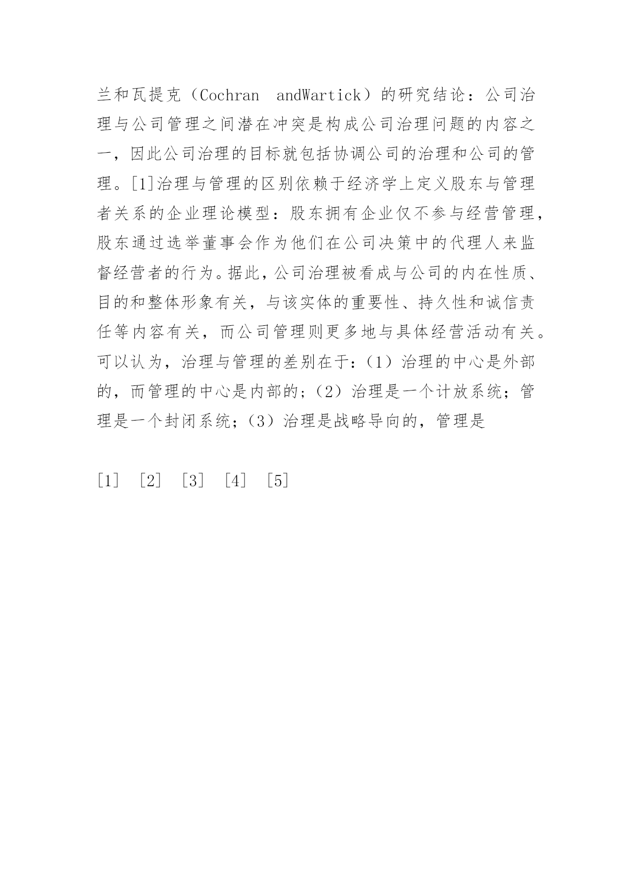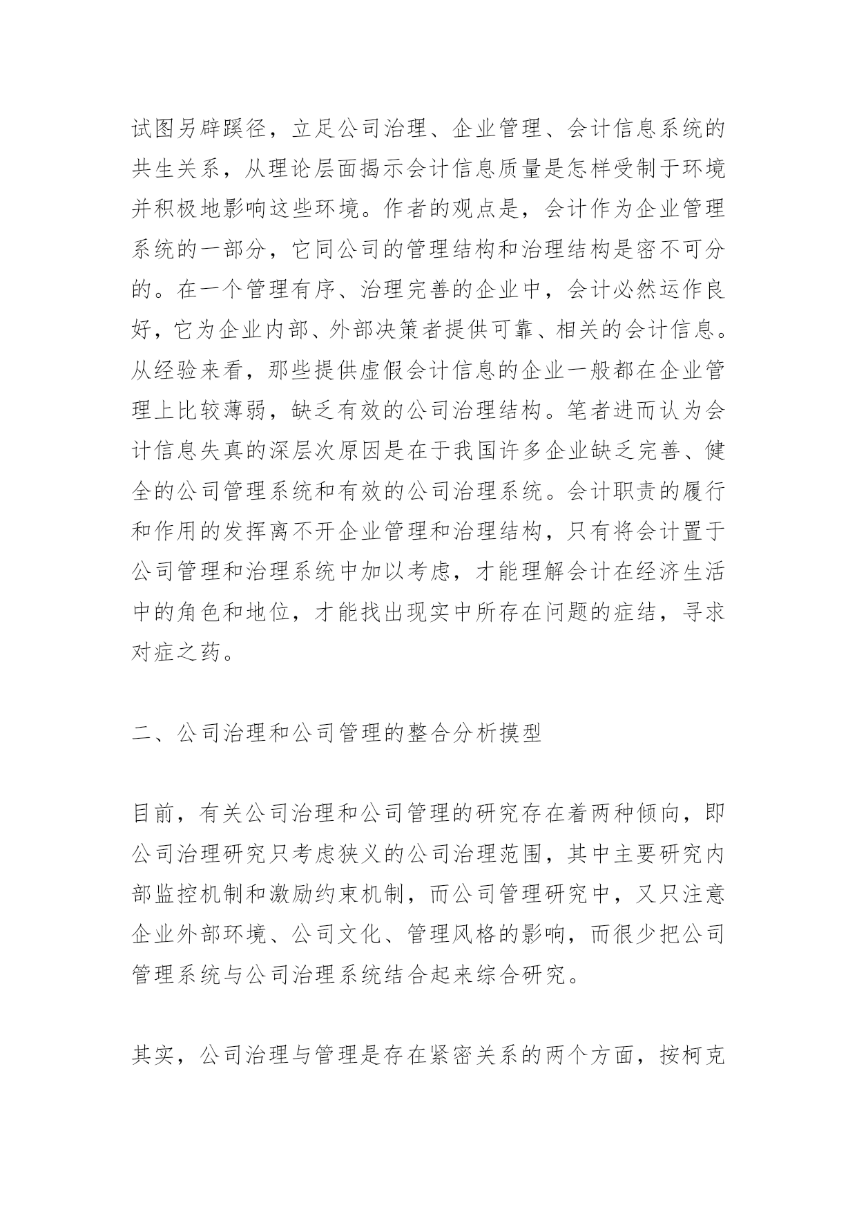 公司治理、企业管理与会计信息系统【摘要】本文在公司治理和公司管理整合的框架中,全面论述了会计的地位和作用:会计信息系统一方面是联系公司治理系统和公司管理系统的纽带,是治理系统和管理系统得以正常运转的基础;另一方面,会计信息系统的完善及其作用的发挥亦离不开企业内部科学、严密的组织管理和公司治理结构对其的引导和控制。三者之间形戚一互相影响,互相制约的关系。因此,会计改革不能局限于就会讨论会计,而是应站在管理的高度,通过健全公司治理结构和加强企业内部管理来使会计改革取得事半功倍的效果,以最终形成公司治理系统、公司管理系统和会计信息系统良性循环的局面。【关键词】公司治理系统公司管理系统会计信息系统一、引言:纵观会计发展历史,会计已经从简单地记录事项并向所有者报告管理者经营业绩的阶段演变到向组织内部和外部的利益相关者提供决策有用信息。会计的目标相应地也从报告解除受托责任拓展到优化配置资源。但是,从我国会计信息质量现状来看,会计在很大程度上不仅没有起到优化资源配置的作用,甚至有时还误导了资源的流向,使投资者的利益受到了损害。会计信息质量不高,与会计人员素质。会计法规和准则等方面均有关系,这方面的研究已有诸多成果。本文试图另辟蹊径,立足公司治理、企业管理、会计信息系统的共生关系,从理论层面揭示会计信息质量是怎样受制于环境并积极地影响这些环境。作者的观点是,会计作为企业管理系统的一部分,它同公司的管理结构和治理结构是密不可分的。在一个管理有序、治理完善的企业中,会计必然运作良好,它为企业内部、外部决策者提供可靠、相关的会计信息。从经验来看,那些提供虚假会计信息的企业一般都在企业管理上比较薄弱,缺乏有效的公司治理结构。笔者进而认为会计信息失真的深层次原因是在于我国许多企业缺乏完善、健全的公司管理系统和有效的公司治理系统。会计职责的履行和作用的发挥离不开企业管理和治理结构,只有将会计置于公司管理和治理系统中加以考虑,才能理解会计在经济生活中的角色和地位,才能找出现实中所存在问题的症结,寻求对症之药。二、公司治理和公司管理的整合分析摸型目前,有关公司治理和公司管理的研究存在着两种倾向,即公司治理研究只考虑狭义的公司治理范围,其中主要研究内部监控机制和激励约束机制,而公司管理研究中,又只注意企业外部环境、公司文化、管理风格的影响,而很少把公司管理系统与公司治理系统结合起来综合研究。其实,公司治理与管理是存在紧密关系的两个方面,按柯克兰和瓦提克(CochranandWartick)的研究结论:公司治理与公司管理之间潜在冲突是构成公司治理问题的内容之一,因此公司治理的目标就包括协调公司的治理和公司的管理。[1]治理与管理的区别依赖于经济学上定义股东与管理者关系的企业理论模型:股东拥有企业仅不参与经营管理,股东通过选举董事会作为他们在公司决策中的代理人来监督经营者的行为。据此,公司治理被看成与公司的内在性质、目的和整体形象有关,与该实体的重要性、持久性和诚信责任等内容有关,而公司管理则更多地与具体经营活动有关。可以认为,治理与管理的差别在于:(1)治理的中心是外部的,而管理的中心是内部的;(2)治理是一个计放系统;管理是一个封闭系统;(3)治理是战略导向的,管理是[1][2][3][4][5]