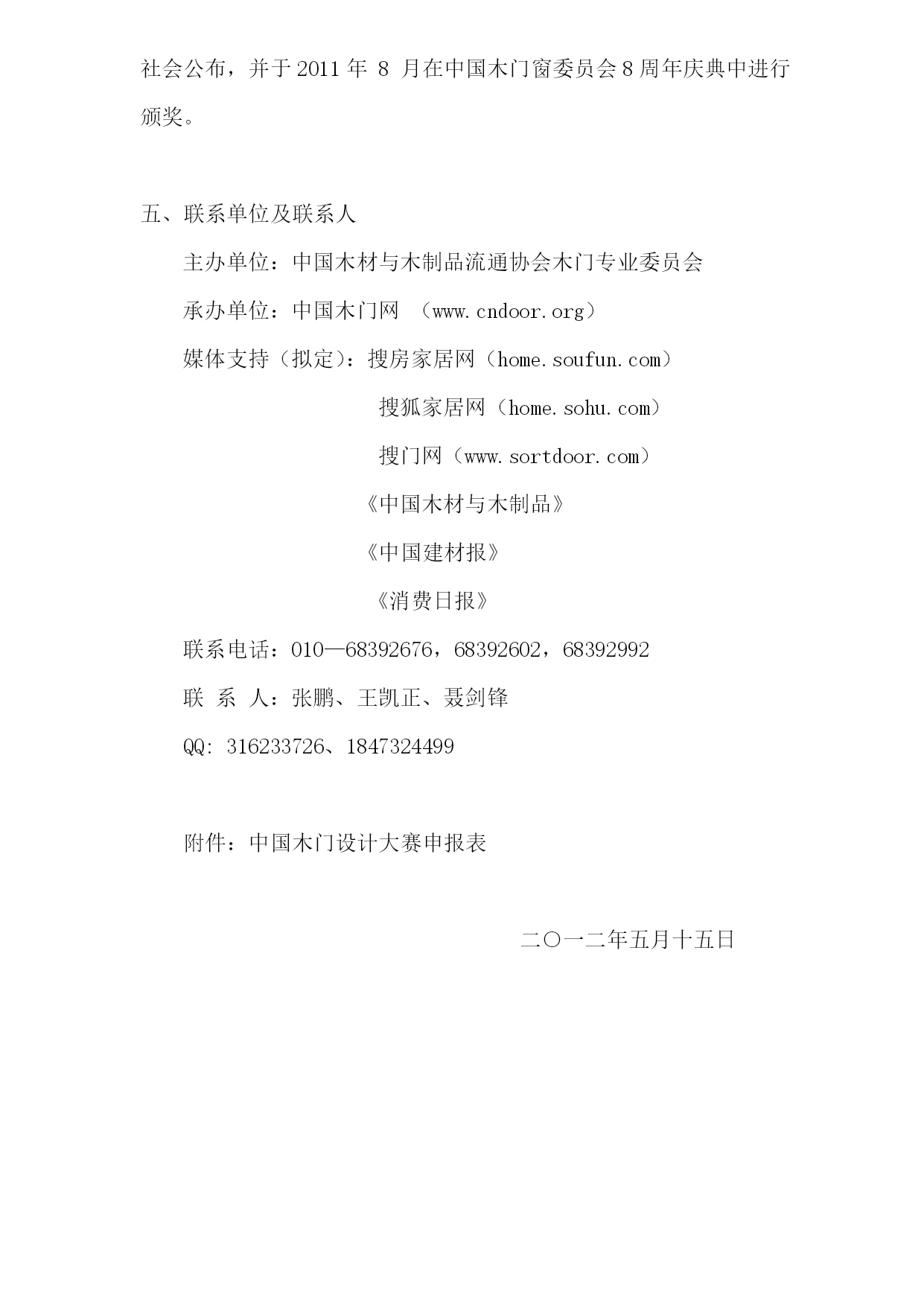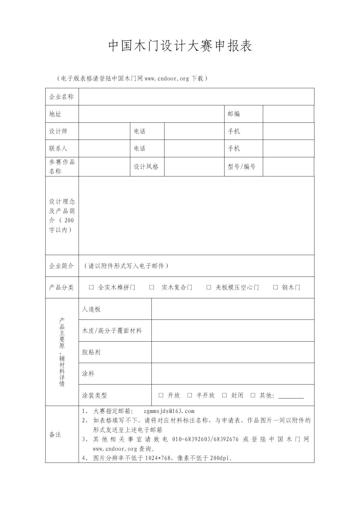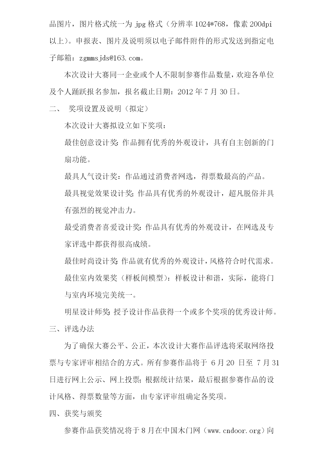 中木协门字〔2012〕号关于举办2012年中国木门设计大赛的通知各会员及相关单位:在经历了2011年房地产市场的低迷后,中国木门行业遭遇了兴起以来最严峻的考验,但在市场中大部分企业依然十分活跃,不但没有受到大环境的影响,反而逆势走强,创造了业绩新高。仔细观察不难发现,这些企业之所以能够取得逆市飘红的成绩,还是得益于他们的产品不断推陈出新,加强原创,使其产品更具有市场竞争力,这也进一步证明了产品的设计是影响销售成绩的重要因素之一。在成功举办了三届中国木门设计大赛后,中国木材与木制品流通协会木门窗专业委员会今年继续与——中国木门网(www.cndoor.org)决定联合举办2012年中国木门设计大赛,并以“超凡脱俗-引领潮流”为主题。本次大赛延续了2011年中国木门“汇龙涂料杯”设计大赛公正权威、贴近消费者的特点,并且在作品展示及奖项方面加以改善,使木门产品设计更加创新典雅,更加符合日益升高消费者审美观。现面向HYPERLINK"http://www.sortdoor.com/compare/"\t"_blank"木门生产企业、自由HYPERLINK"http://www.sortdoor.com/vote/"\t"_blank"设计师、产品HYPERLINK"http://www.sortdoor.com/vote/"\t"_blank"设计爱好者、国内外大专院校师生广泛征集作品。现将有关事宜通知如下:参赛须知本次设计大赛于即日起面向行业及社会征集参赛作品。凡参与本次设计大赛者须提交填写完整的“中国木门设计大赛申报表”(或从中国木门网www.cndoor.org下载),并提供相关参赛作品图片,图片格式统一为jpg格式(分辨率1024*768,像素200dpi以上)。申报表、图片及说明须以电子邮件附件的形式发送到指定电子邮箱:zgmmsjds@163.com。本次设计大赛同一企业或个人不限制参赛作品数量,欢迎各单位及个人踊跃报名参加,报名截止日期:2012年7月30日。奖项设置及说明(拟定)本次设计大赛拟设立如下奖项:最佳创意设计奖:作品拥有优秀的外观设计,具有自主创新的门扇功能。最具人气设计奖:作品通过消费者网选,得票数最高的产品。最具视觉效果设计奖;作品具有优秀的外观设计,超凡脱俗并具有强烈的视觉冲击力。最受消费者喜爱设计奖:作品具有优秀的外观设计,在网选及专家评选中都获得很高成绩。最佳时尚设计奖:作品就有优秀的外观设计,风格符合时代需求。最佳室内效果奖(样板间模型):样板设计和谐,实际,能将门与室内环境完美统一。明星设计师奖:授予设计作品获得一个或多个奖项的优秀设计师。三、评选办法为了确保大赛公平、公正,本次设计大赛作品评选将采取网络投票与专家评审相结合的方式。所有参赛作品将于6月20日至7月31日进行网上公示、网上投票;根据统计结果,最后根据参赛作品的设计风格、得票数量等方面,由专家评审组确定各奖项。四、获奖与颁奖参赛作品获奖情况将于8月在中国木门网(www.cndoor.org)向社会公布,并于2011年8月在中国木门窗委员会8周年庆典中进行颁奖。五、联系单位及联系人主办单位:中国木材与木制品流通协会木门专业委员会承办单位:中国木门网(www.cndoor.org)媒体支持(拟定):搜房家居网(home.soufun.com)搜狐家居网(home.sohu.com)搜门网(www.sortdoor.com)《中国木材与木制品》《中国建材报》《消费日报》联系电话:010—68392676,68392602,68392992联系人:张鹏、王凯正、聂剑锋QQ:316233726、1847324499附件:中国木门设计大赛申报表二○一二年五月十五日中国木门设计大赛申报表(电子版表格请登陆中国木门网www.cndoor.org下载)企业名称地址邮编设计师电话手机联系人电话手机参赛作品名称设计风格型号/编号设计理念及产品简介(200字以内)企业简介(请以附件形式写入电子邮件)产品分类□全实木榫拼门□实木复合门□夹板模压空心门□钢木门产品主要原、辅材料详情人造板木皮/高分子覆面材料胶粘剂涂料涂装类型□开放□半开放□封闭□其他:备注大赛指定邮箱:zgmmsjds@163.com如表格填写不下,请将对应材料标注名称,与申请表、作品图片一同以附件的形式发送至上述电子邮箱其他相关事宜请致电010-68392603/68392676或登陆中国木门网www.cndoor.org查询。图片分辨率不低于1024*768,像素不低于200dpi。