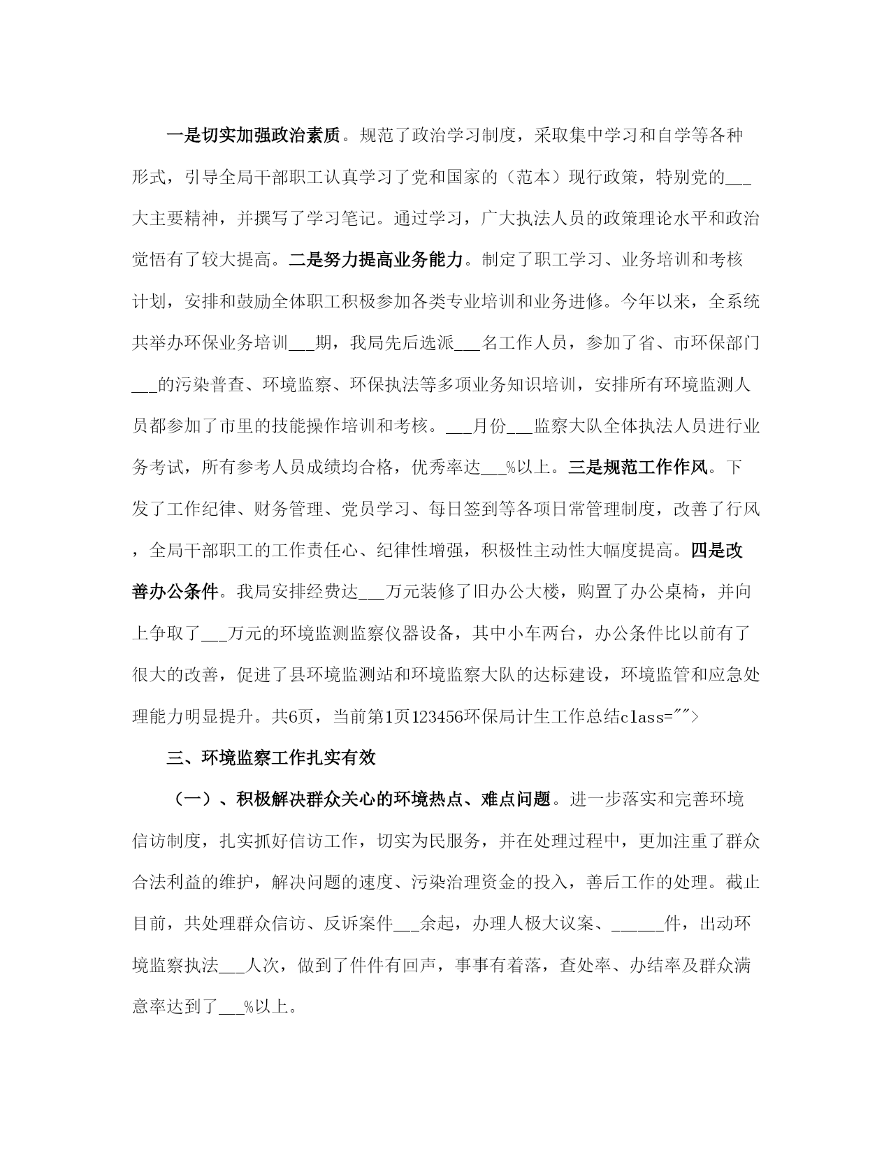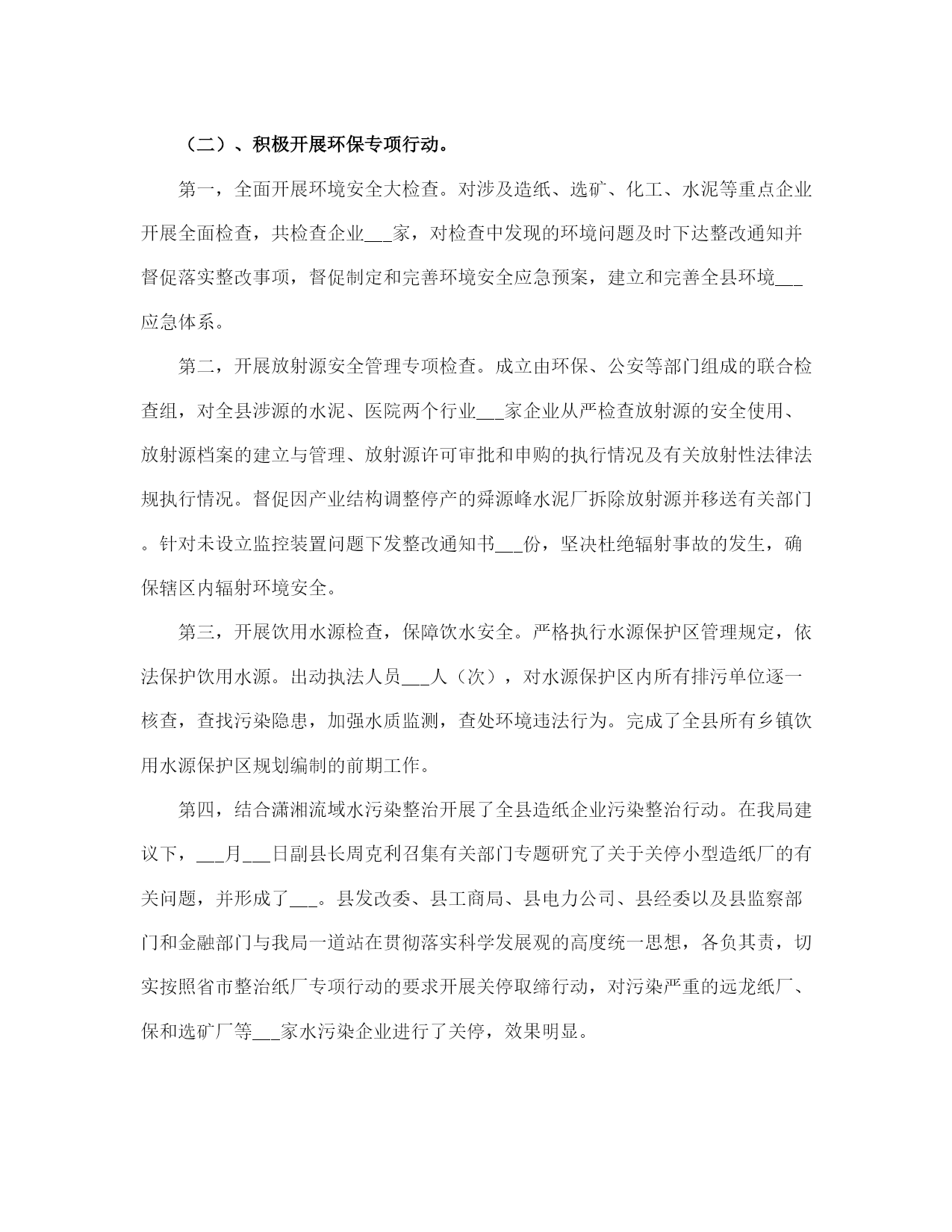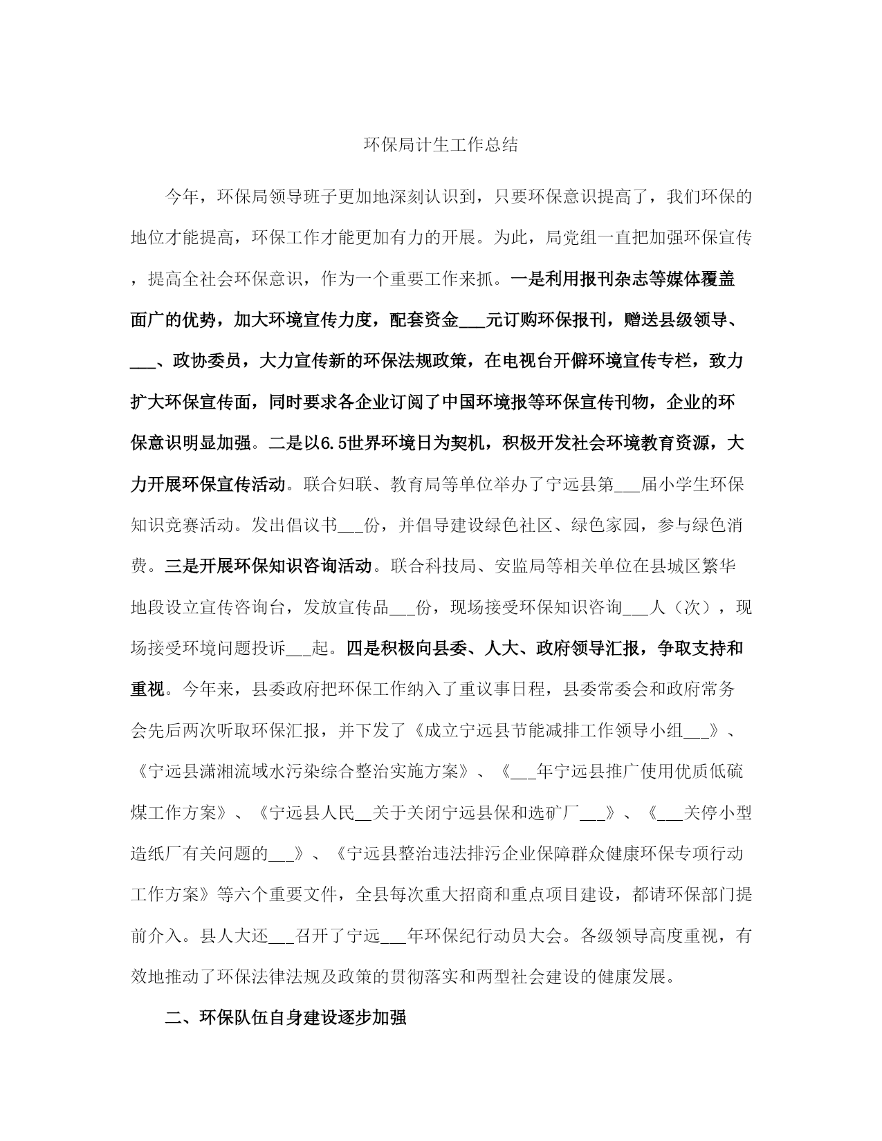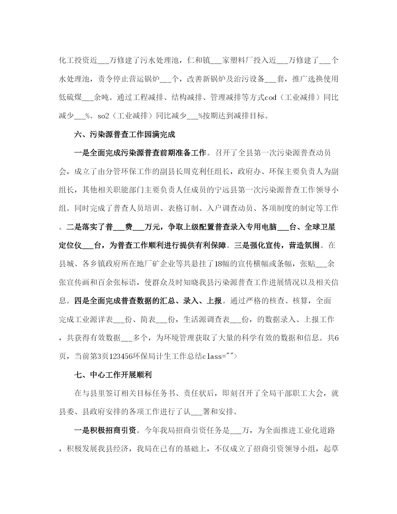 环保局计生工作总结(完整版)文档资料可直接使用,可编辑,欢迎下载环保局计生工作总结今年,环保局领导班子更加地深刻认识到,只要环保意识提高了,我们环保的地位才能提高,环保工作才能更加有力的开展。为此,局党组一直把加强环保宣传,提高全社会环保意识,作为一个重要工作来抓。一是利用报刊杂志等媒体覆盖面广的优势,加大环境宣传力度,配套资金___元订购环保报刊,赠送县级领导、___、政协委员,大力宣传新的环保法规政策,在电视台开僻环境宣传专栏,致力扩大环保宣传面,同时要求各企业订阅了中国环境报等环保宣传刊物,企业的环保意识明显加强。二是以6.5世界环境日为契机,积极开发社会环境教育资源,大力开展环保宣传活动。联合妇联、教育局等单位举办了宁远县第___届小学生环保知识竞赛活动。发出倡议书___份,并倡导建设绿色社区、绿色家园,参与绿色消费。三是开展环保知识咨询活动。联合科技局、安监局等相关单位在县城区繁华地段设立宣传咨询台,发放宣传品___份,现场接受环保知识咨询___人(次),现场接受环境问题投诉___起。四是积极向县委、人大、政府领导汇报,争取支持和重视。今年来,县委政府把环保工作纳入了重议事日程,县委常委会和政府常务会先后两次听取环保汇报,并下发了《成立宁远县节能减排工作领导小组___》、《宁远县潇湘流域水污染综合整治实施方案》、《___年宁远县推广使用优质低硫煤工作方案》、《宁远县人民__关于关闭宁远县保和选矿厂___》、《___关停小型造纸厂有关问题的___》、《宁远县整治违法排污企业保障群众健康环保专项行动工作方案》等六个重要文件,全县每次重大招商和重点项目建设,都请环保部门提前介入。县人大还___召开了宁远___年环保纪行动员大会。各级领导高度重视,有效地推动了环保法律法规及政策的贯彻落实和两型社会建设的健康发展。二、环保队伍自身建设逐步加强一是切实加强政治素质。规范了政治学习制度,采取集中学习和自学等各种形式,引导全局干部职工认真学习了党和国家的(范本)现行政策,特别党的___大主要精神,并撰写了学习笔记。通过学习,广大执法人员的政策理论水平和政治觉悟有了较大提高。二是努力提高业务能力。制定了职工学习、业务培训和考核计划,安排和鼓励全体职工积极参加各类专业培训和业务进修。今年以来,全系统共举办环保业务培训___期,我局先后选派___名工作人员,参加了省、市环保部门___的污染普查、环境监察、环保执法等多项业务知识培训,安排所有环境监测人员都参加了市里的技能操作培训和考核。___月份___监察大队全体执法人员进行业务考试,所有参考人员成绩均合格,优秀率达___%以上。三是规范工作作风。下发了工作纪律、财务管理、党员学习、每日签到等各项日常管理制度,改善了行风,全局干部职工的工作责任心、纪律性增强,积极性主动性大幅度提高。四是改善办公条件。我局安排经费达___万元装修了旧办公大楼,购置了办公桌椅,并向上争取了___万元的环境监测监察仪器设备,其中小车两台,办公条件比以前有了很大的改善,促进了县环境监测站和环境监察大队的达标建设,环境监管和应急处理能力明显提升。,当前123456环保局计生工作总结class="">三、环境监察工作扎实有效(一)、积极解决群众关心的环境热点、难点问题。进一步落实和完善环境信访制度,扎实抓好信访工作,切实为民服务,并在处理过程中,更加注重了群众合法利益的维护,解决问题的速度、污染治理资金的投入,善后工作的处理。截止目前,共处理群众信访、反诉案件___余起,办理人极大议案、______件,出动环境监察执法___人次,做到了件件有回声,事事有着落,查处率、办结率及群众满意率达到了___%以上。(二)、积极开展环保专项行动。第一,全面开展环境安全大检查。对涉及造纸、选矿、化工、水泥等重点企业开展全面检查,共检查企业___家,对检查中发现的环境问题及时下达整改通知并督促落实整改事项,督促制定和完善环境安全应急预案,建立和完善全县环境___应急体系。第二,开展放射源安全管理专项检查。成立由环保、公安等部门组成的联合检查组,对全县涉源的水泥、医院两个行业___家企业从严检查放射源的安全使用、放射源档案的建立与管理、放射源许可审批和申购的执行情况及有关放射性法律法规执行情况。督促因产业结构调整停产的舜源峰水泥厂拆除放射源并移送有关部门。针对未设立监控装置问题下发整改通知书___份,坚决杜绝辐射事故的发生,确保辖区内辐射环境安全。第三,开展饮用水源检查,保障饮水安全。严格执行水源保护区管理规定,依法保护饮用水源。出动执法人员___人(次),对水源保护区内所有排污单位逐一核查,查找污染隐患,加强水质监测,查处环境违法行为。完成了全县所有乡镇饮用水源保护区规划编制的前期工作。第四,结合潇湘流域水污