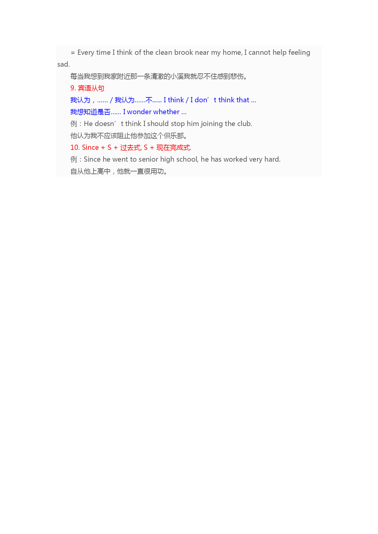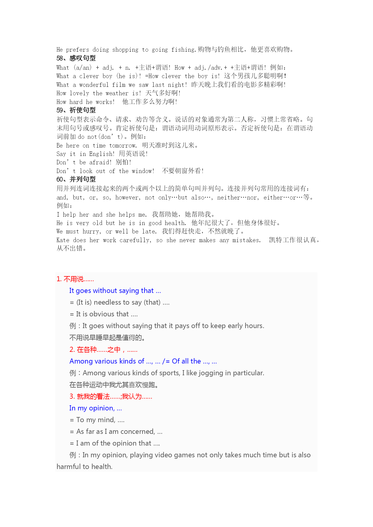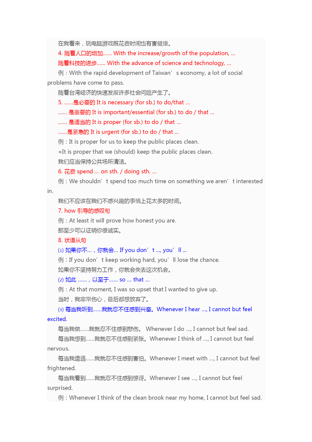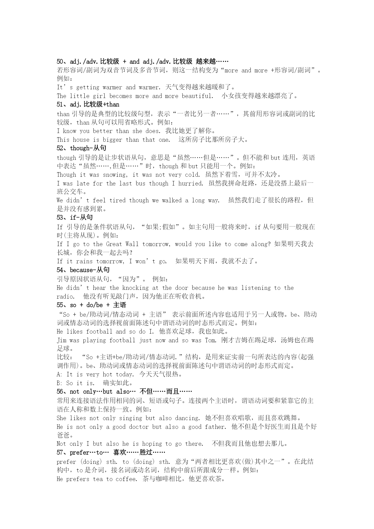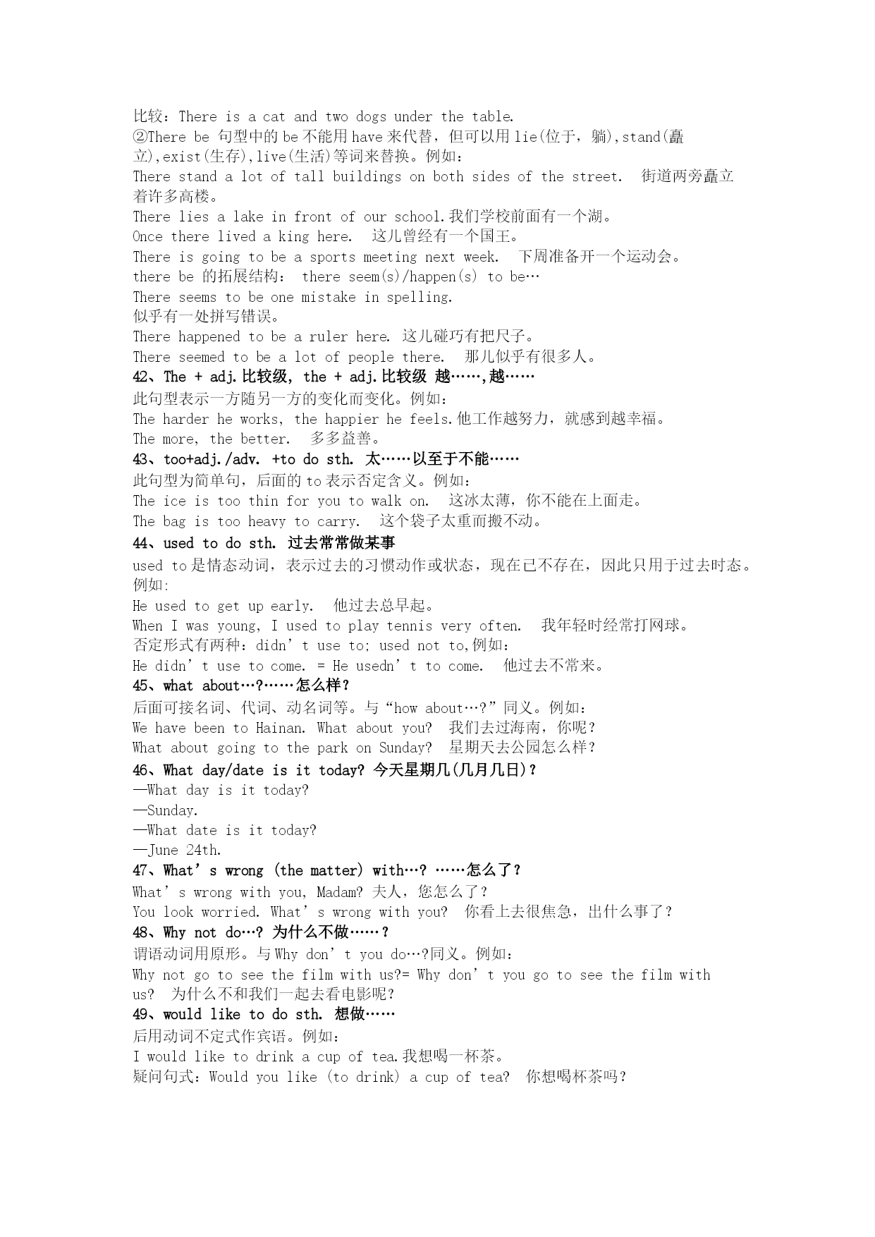 31、keepsb.doingsth.让某人一直做某事不可和keepsb.fromdoingsth.结构混淆。例如:Whydoyoukeepmewaitingforalongtime?你为什么让我等了很长时间?32、makesb.dosth.使某人干某事make意为“使”时,其后要有不带to的动词不定式。例如:Hemademeworktenhoursaday.他让我每天工作10小时。注意:上句如改为被动语态,则work前的to不能省略。例如:Iwasmadetoworktenhoursaday.33、neither…nor…既不……也不……当连接两个并列主语时,谓语动词与邻近的主语取得一致(就近一致原则)。例如:NeitherwenorJackknowshim.我们和杰克都不认识他。Heneitherknowsnorcareswhathappened.他对发生的事情不闻不问。34、not…until…直到……才……until后可跟名词或从句,表示时间。例如:Hedidn’tcomeuntillateintheevening.他直到晚上很迟才来。Hedidn’tarriveuntilthegamebegan.直到比赛开始他才来。35、sb.paysmoneyforsth.某人花钱买某物此句型主语是人。例如:I’vealreadypaid2,000yuanforthemotorbike.我已经花了2000元买这辆摩托车。36、spendtime/moneyonsth./(in)doingsth.花费(时间、钱)在某事上/做某事其中in可以省略,通常主语为“人”。例如:Ispentfiveyuanonthisbook.我在这本书上花了五元钱。Ispenttwohours(in)doingmyhomeworkyesterday.昨晚我花了两个小时做作业。37、so…that…太……以至于……用于复合句,that引导的是结果状语从句。so是副词,后面应接形容词或副词,如果接名词,应用such。例如:Theiceissothinthatyoucan’twalkonit.冰太薄了,你不能在上面走。Heissuchakindmanthatwealllikehim.他是一个非常好的人,我们都很喜欢他。38、stoptodosth.,stopdoingsth.stoptodosth.意为“停下来去做另一件事”,stopdoingsth.意为“停止正在做的事”例如:You’retootired.You’dbetterstoptohavearest.你们太累了,最好停下来休息一会儿。Theteacheriscoming.Let’sstoptalking.老师来了,咱们别说话了。39、Thankyoufordoingsth.感激你做了……for之后除了加动名词doing外,还可以加名词。例如:Thankyouforgivingmethepresent.谢谢你给我的礼物。Thankyouforyourhelp.=Thankyouforhelpingme.谢谢你的帮助。40、thanksto多亏……,由于……thanks后的s不能省略,to是介词。例如:ThankstomyfriendJim,I’veworkedoutthisproblem.多亏了我朋友吉姆的帮助,我已经解决了这个问题。41、Therebe句型①在此结构中,there是引导词,在句中不能充当任何成分,也不必翻译出来。句中的主语是某人或某物,谓语动词be要与主语的数保持一致。例如:Thereisamanatthedoor.门口有一个人。当主语是由两个或者两者以上的名词充当时,谓语动词be要跟它邻近的那个名词的数一致(就近一致)。例如:Therearetwodogsandacatunderthetable.桌下有两只狗和一只猫。比较:Thereisacatandtwodogsunderthetable.②Therebe句型中的be不能用have来代替,但可以用lie(位于,躺),stand(矗立),exist(生存),live(生活)等词来替换。例如:Therestandalotoftallbuildingsonbothsidesofthestreet.街道两旁矗立着许多高楼。Thereliesalakeinfrontofourschool.我们学校前面有一个湖。Oncetherelivedakinghere.这儿曾经有一个国王。Thereisgoingtobeasportsmeetingnextweek.下周准备开一个运动会。therebe的拓展结构:thereseem(s)/happen(s)tobe