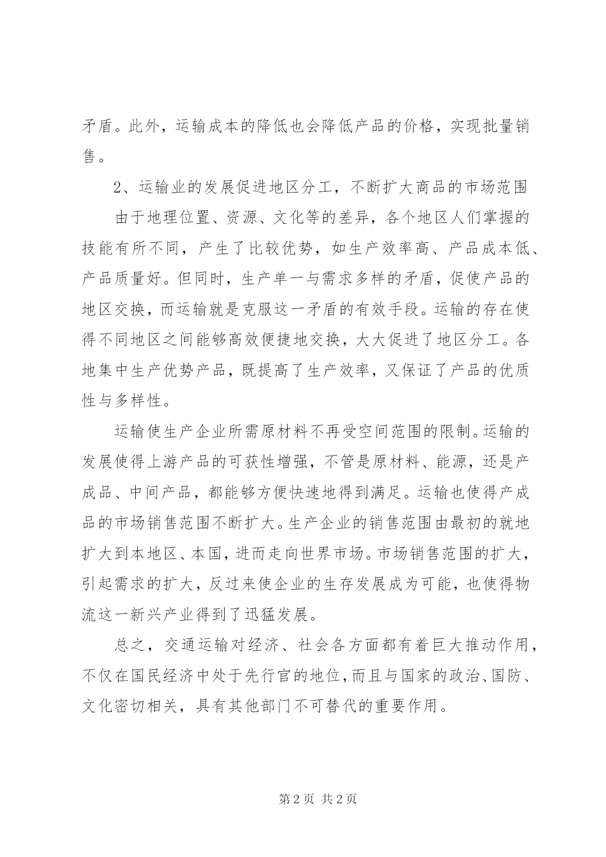 第PAGE\*Arabic\*MERGEFORMAT2页共NUMPAGES\*MERGEFORMAT2页交通安全的重要性交通运输在经济发展中的重要作用运输的基本含义是改变物体的地点或位置,它与人们的生产生活息息相关。我们日常的出行、所接触的各种商品,都离不开运输。交通运输把社会生产、分配、交换和消费等各个环节有机地联系起来,既是重要的基础产业,又为商品流通和人员流动提供基本条件。交通运输对于经济发展具有重要作用,具体表现在:1、运输使生产、销售集中,使规模经济得以实现运输是生产和分配的必要组成部分,经济发展有赖于大规模生产和成批销售,如果没有高效率和相对便宜的运输,二者都不可能实现。因此,运输是经济发展的基础。从生产角度看,除非把生产原材料送到所需的地方,否则它们就毫无价值,运输通过改变人和物的位移使得生产活动的进行成为可能。通过高效的运输,还可以降低各种原料送达的时间,减少停工待料的出现,减少不必要的时间损耗,降低成本。规模经济指出,随着数量的增大,产品的平均成本降低。如果没有运输将大批量的原料送到产地,就不会有大批量生产。从销售角度看,生产出的产品如果不能及时分散出去,大批量生产就不能持续有效地进行。因此,运输是成批销售的保障。规模经济造成生产和资源的集中,形成垄断,不利于竞争,而运输可以带来产品的分散,在一定意义上促进竞争,有效缓解这一矛盾。此外,运输成本的降低也会降低产品的价格,实现批量销售。2、运输业的发展促进地区分工,不断扩大商品的市场范围由于地理位置、资源、文化等的差异,各个地区人们掌握的技能有所不同,产生了比较优势,如生产效率高、产品成本低、产品质量好。但同时,生产单一与需求多样的矛盾,促使产品的地区交换,而运输就是克服这一矛盾的有效手段。运输的存在使得不同地区之间能够高效便捷地交换,大大促进了地区分工。各地集中生产优势产品,既提高了生产效率,又保证了产品的优质性与多样性。运输使生产企业所需原材料不再受空间范围的限制。运输的发展使得上游产品的可获性增强,不管是原材料、能源,还是产成品、中间产品,都能够方便快速地得到满足。运输也使得产成品的市场销售范围不断扩大。生产企业的销售范围由最初的就地扩大到本地区、本国,进而走向世界市场。市场销售范围的扩大,引起需求的扩大,反过来使企业的生存发展成为可能,也使得物流这一新兴产业得到了迅猛发展。总之,交通运输对经济、社会各方面都有着巨大推动作用,不仅在国民经济中处于先行官的地位,而且与国家的政治、国防、文化密切相关,具有其他部门不可替代的重要作用。