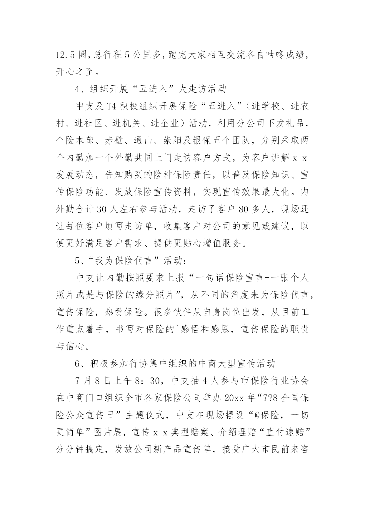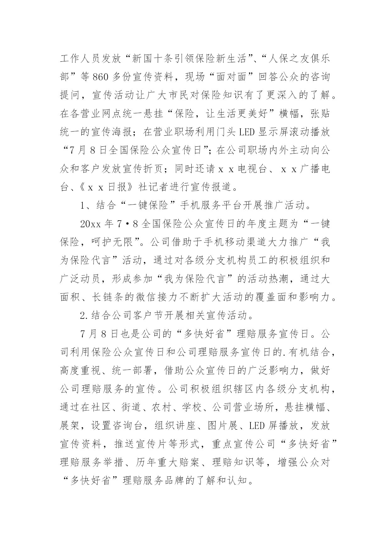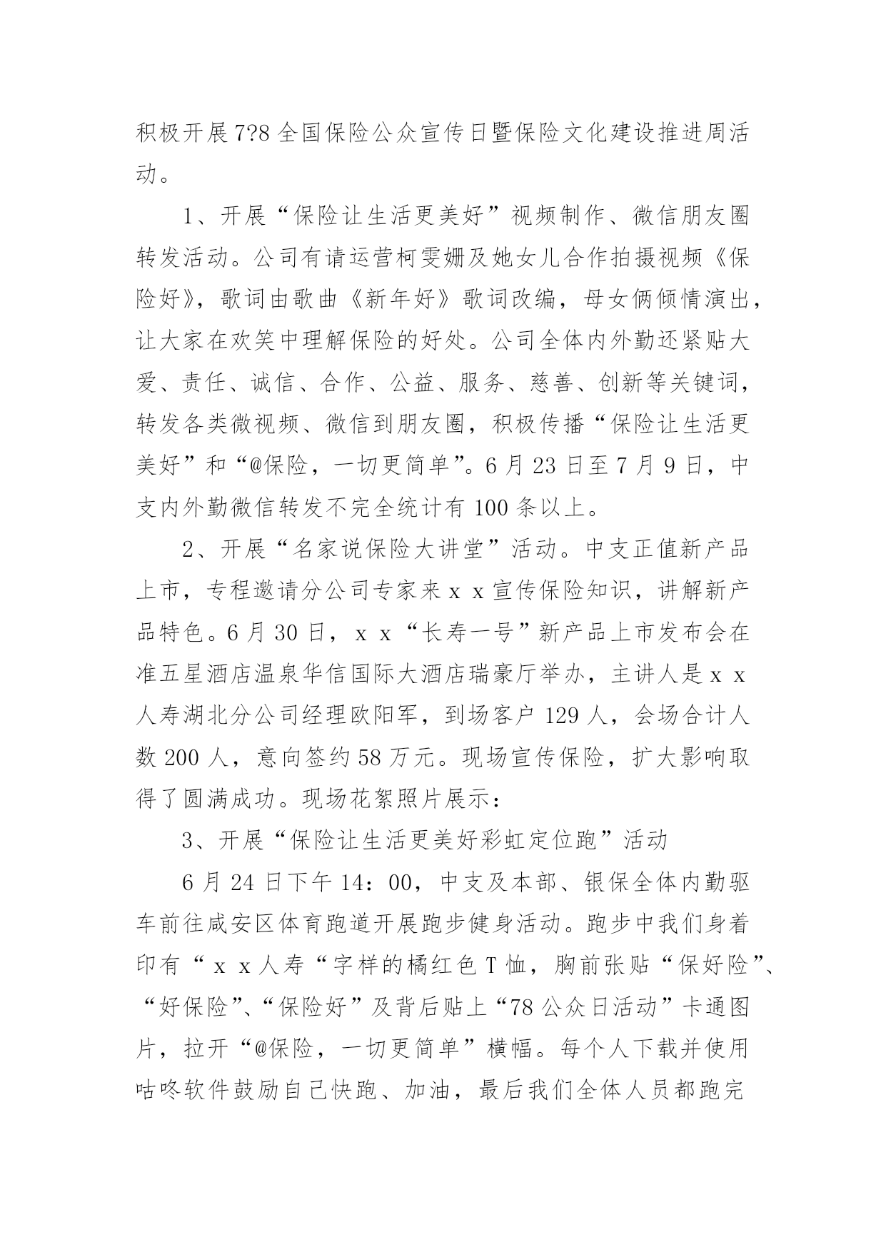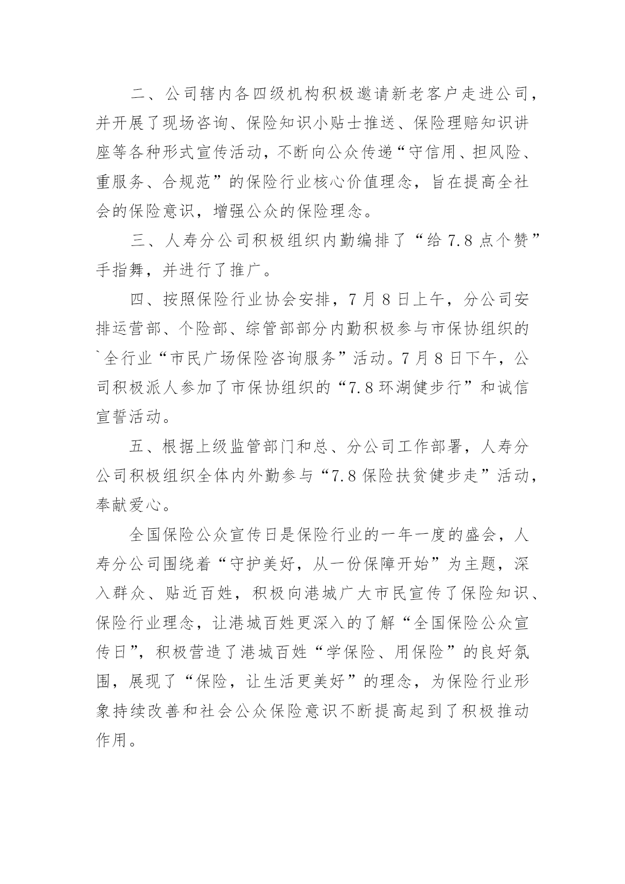 保险公众宣传日活动总结总结是事后对某一阶段的学习、工作或其完成情况加以回顾和分析的一种书面材料,它可以提升我们发现问题的能力,因此我们要做好归纳,写好总结。我们该怎么去写总结呢?下面是小编为大家收集的保险公众宣传日活动总结,希望对大家有所帮助。保险公众宣传日活动总结1根据《辽宁保监局关于开展保险公众宣传日系列活动的通知》和省协会《关于开展20xx年辽宁省保险公众宣传日活动的通知》文件精神和相关部署要求,为做好20xx年锦州市保险公众宣传日活动,加强保险公众宣传工作,进一步提升保险业形象,锦州市保险行业协会组织开展了“xxx”为主题的20xx保险公众宣传日活动。现将活动情况总结如下:一、精心策划方案,积极部署活动市协会接到保监局和省协会相关文件通知后,第一时间召开秘书处工作会议,对此次活动进行安排部署。明确了本次活动年度主题为“xxx”,并制定了具体活动方案20xx年保险公众宣传日活动总结20xx年保险公众宣传日活动总结。方案确定后,立即向全市40家公司下发了锦保协发[20xx]16号文件《关于开展20xx年锦州市保险公众宣传日活动的'通知》,并提出具体要求。二、整合有利资源,丰富宣传手段本次保险公众宣传日活动,市协会在继承以往好的宣传手段的同时,又进一步开拓了新的宣传方式,并取得了良好效果,具体组织开展了以下工作:7月8日保险公众宣传日当天,全市40家公司在本公司经营场所及附近区域开展形式多样的宣传活动。通过在本公司门前、营业场所、附近街道、社区、小区内设置宣传服务展板、悬挂宣传横幅、设立保险咨询台,开展保险知识宣传,传播保险行业正能量。据统计,此次活动全市40家公司内勤、外勤近700人参与。其中22家公司总经理亲自带队组织并参与活动,有9家公司将活动开展到县域地区20xx年保险公众宣传日活动总结工作总结。共摆设展台73台,展出展板93面、展出司旗、条幅96面、使用电视18台、电子展板23台、发放宣传资料7000余份。保险公众宣传日活动总结2为提高社会公众风险防范意识,有效遏制非法集资行为,7月8日华夏保险枣庄中支在全辖范围内集中开展了“保险公众宣传日”活动。据了解,宣传月期间,华夏保险枣庄中支多措并举开展各类宣传活动:在公司客服大厅摆放宣传折页;现场开展专项咨询,向消费者宣讲非法集资危害和防范措施;在所辖机构职场悬挂横幅、张贴海报,在营造活动氛围的同时给广大消费者在视觉上给予提示;制作防范非法集资的易企秀,通过内、外勤微信群、朋友圈发布,不断扩大范围开展防范和打击非法集资法规教育;通过内勤早会、内勤微信群对全员开展防范非法集资培训,对非法集资特征、表现形式、常见手段、典型案例进行讲解;利用周末时间组织员工在职场门前人群密集区域设置宣传咨询点,发放宣传单,现场向过往群众讲解非法集资的定义、非法集资活动的`危害性、非法集资的主要表现形式与防范重点。防范非法集资工作是一项长期、复杂、艰巨的系统工程,华夏保险枣庄中支将以本次保险宣传日活动为契机,认真总结活动经验,推动防范非法集资宣传教育工作的常态化和规范化,持续提升社会公众风险意识,履行社会责任。保险公众宣传日活动总结3xx人寿xx中支根据行协及分公司关于20xx年7.8日公众宣传日活动要求,积极开展线上、线下各项活动,具体总结如下:一、突出活动主题进行职场布置中支围绕20xx年“7.8全国保险公众宣传日”活动主题,在职场醒目张贴两张大海报、两张“保险让生活更美好”、“@保险,一切更简单”横幅,来往业务员和客户能一目了然看到,起到很好视觉宣传效果。二、开展多项线上线下宣传活动中支联络员参加行协动员会后,及时传达学习保监局、省市协会文件,要求中支及所有T4人员认真领悟会议精神,积极开展7?8全国保险公众宣传日暨保险文化建设推进周活动。1、开展“保险让生活更美好”视频制作、微信朋友圈转发活动。公司有请运营柯雯姗及她女儿合作拍摄视频《保险好》,歌词由歌曲《新年好》歌词改编,母女俩倾情演出,让大家在欢笑中理解保险的好处。公司全体内外勤还紧贴大爱、责任、诚信、合作、公益、服务、慈善、创新等关键词,转发各类微视频、微信到朋友圈,积极传播“保险让生活更美好”和“@保险,一切更简单”。6月23日至7月9日,中支内外勤微信转发不完全统计有100条以上。2、开展“名家说保险大讲堂”活动。中支正值新产品上市,专程邀请分公司专家来xx宣传保险知识,讲解新产品特色。6月30日,xx“长寿一号”新产品上市发布会在准五星酒店温泉华信国际大酒店瑞豪厅举办,主讲人是xx人寿湖北分公司经理欧阳军,到场客户129人,会场合计人数200人,意向签约58万元。现场宣传保险,扩大影响取得了圆满成功。现场花絮照片展示:3、开展“保险让生活更美好彩虹定位跑”活动6月24日下午14:00,中支及本部、银保全体内勤驱车前往咸安区
