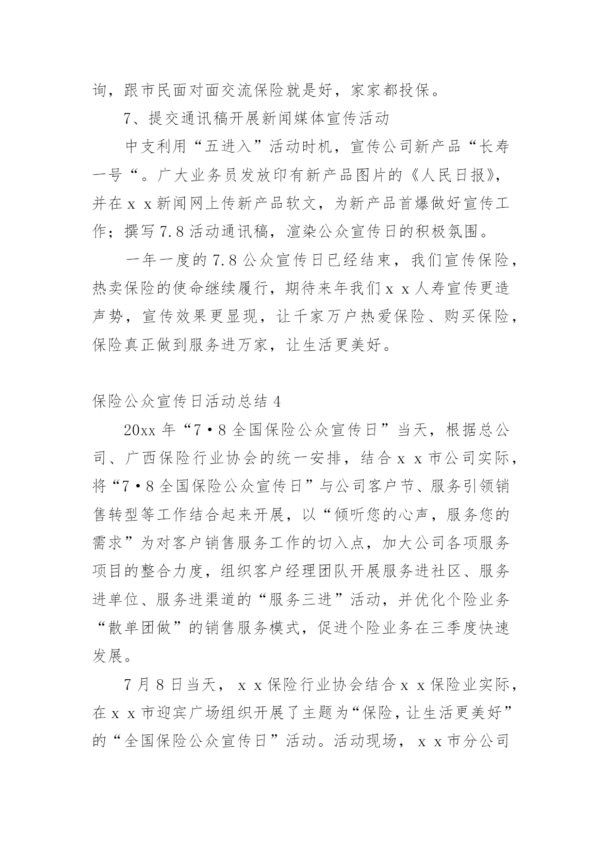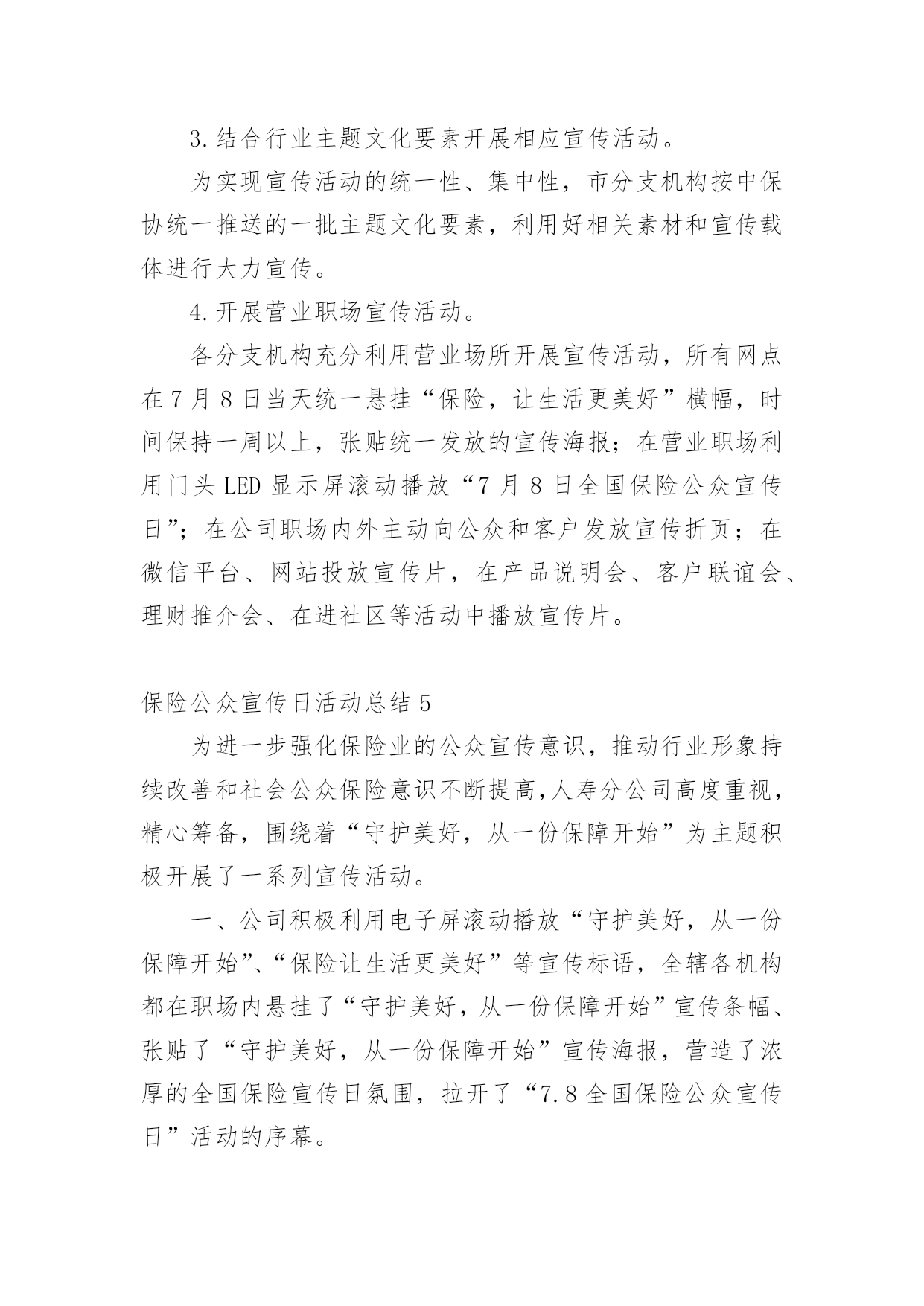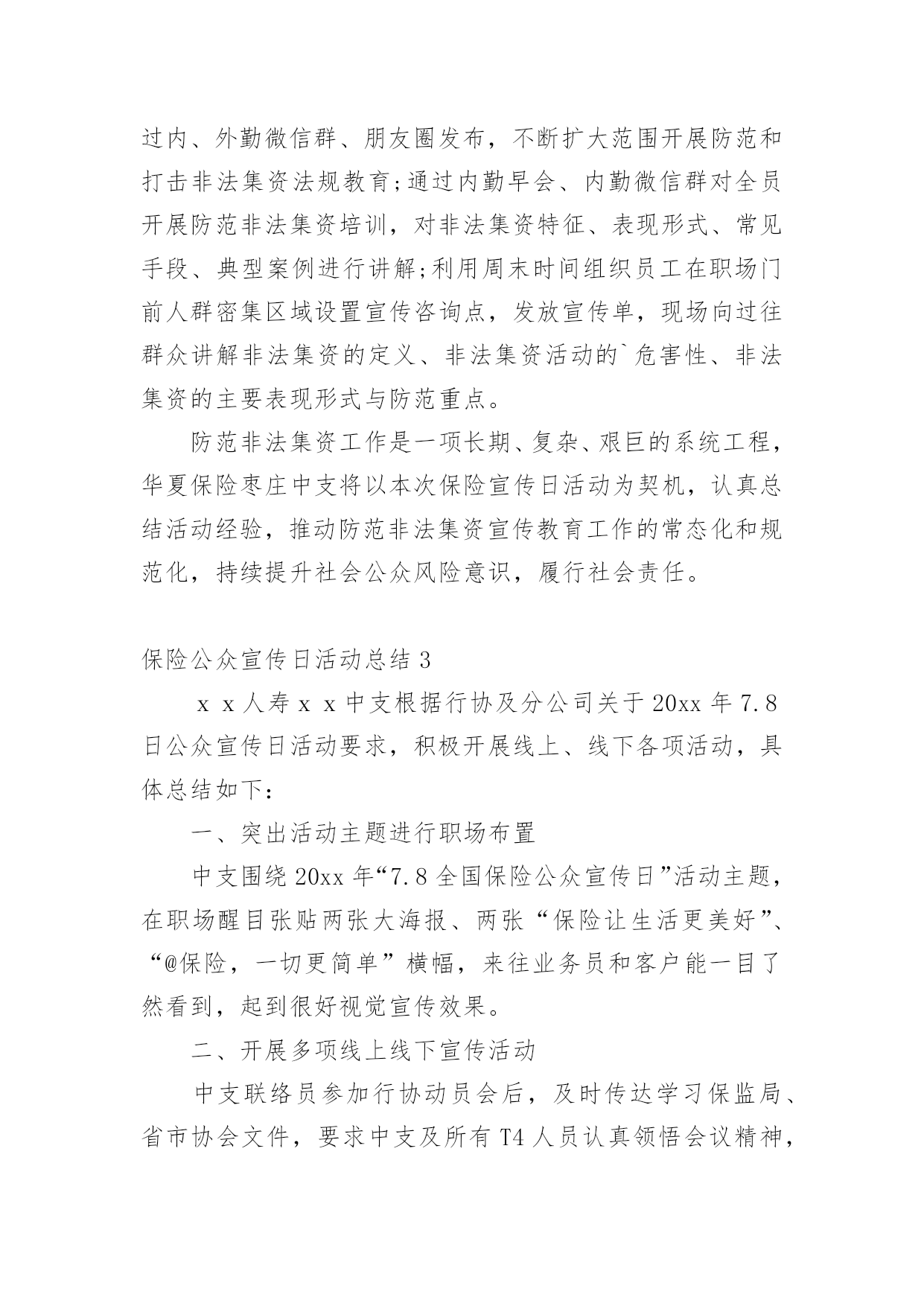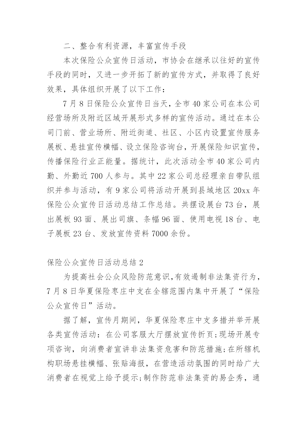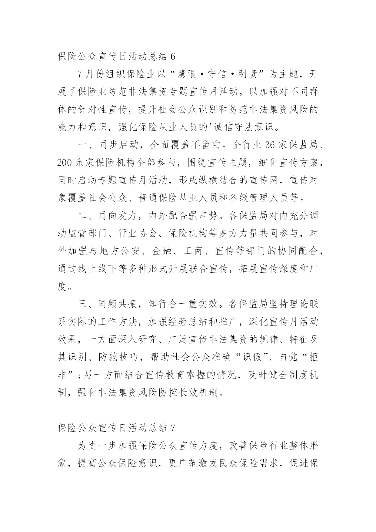 保险公众宣传日活动总结总结是事后对某一阶段的学习、工作或其完成情况加以回顾和分析的一种书面材料,它可以提升我们发现问题的能力,因此我们要做好归纳,写好总结。我们该怎么去写总结呢?下面是小编为大家收集的保险公众宣传日活动总结,希望对大家有所帮助。保险公众宣传日活动总结1根据《辽宁保监局关于开展保险公众宣传日系列活动的通知》和省协会《关于开展20xx年辽宁省保险公众宣传日活动的通知》文件精神和相关部署要求,为做好20xx年锦州市保险公众宣传日活动,加强保险公众宣传工作,进一步提升保险业形象,锦州市保险行业协会组织开展了“xxx”为主题的20xx保险公众宣传日活动。现将活动情况总结如下:一、精心策划方案,积极部署活动市协会接到保监局和省协会相关文件通知后,第一时间召开秘书处工作会议,对此次活动进行安排部署。明确了本次活动年度主题为“xxx”,并制定了具体活动方案20xx年保险公众宣传日活动总结20xx年保险公众宣传日活动总结。方案确定后,立即向全市40家公司下发了锦保协发[20xx]16号文件《关于开展20xx年锦州市保险公众宣传日活动的'通知》,并提出具体要求。二、整合有利资源,丰富宣传手段本次保险公众宣传日活动,市协会在继承以往好的宣传手段的同时,又进一步开拓了新的宣传方式,并取得了良好效果,具体组织开展了以下工作:7月8日保险公众宣传日当天,全市40家公司在本公司经营场所及附近区域开展形式多样的宣传活动。通过在本公司门前、营业场所、附近街道、社区、小区内设置宣传服务展板、悬挂宣传横幅、设立保险咨询台,开展保险知识宣传,传播保险行业正能量。据统计,此次活动全市40家公司内勤、外勤近700人参与。其中22家公司总经理亲自带队组织并参与活动,有9家公司将活动开展到县域地区20xx年保险公众宣传日活动总结工作总结。共摆设展台73台,展出展板93面、展出司旗、条幅96面、使用电视18台、电子展板23台、发放宣传资料7000余份。保险公众宣传日活动总结2为提高社会公众风险防范意识,有效遏制非法集资行为,7月8日华夏保险枣庄中支在全辖范围内集中开展了“保险公众宣传日”活动。据了解,宣传月期间,华夏保险枣庄中支多措并举开展各类宣传活动:在公司客服大厅摆放宣传折页;现场开展专项咨询,向消费者宣讲非法集资危害和防范措施;在所辖机构职场悬挂横幅、张贴海报,在营造活动氛围的同时给广大消费者在视觉上给予提示;制作防范非法集资的易企秀,通过内、外勤微信群、朋友圈发布,不断扩大范围开展防范和打击非法集资法规教育;通过内勤早会、内勤微信群对全员开展防范非法集资培训,对非法集资特征、表现形式、常见手段、典型案例进行讲解;利用周末时间组织员工在职场门前人群密集区域设置宣传咨询点,发放宣传单,现场向过往群众讲解非法集资的定义、非法集资活动的`危害性、非法集资的主要表现形式与防范重点。防范非法集资工作是一项长期、复杂、艰巨的系统工程,华夏保险枣庄中支将以本次保险宣传日活动为契机,认真总结活动经验,推动防范非法集资宣传教育工作的常态化和规范化,持续提升社会公众风险意识,履行社会责任。保险公众宣传日活动总结3xx人寿xx中支根据行协及分公司关于20xx年7.8日公众宣传日活动要求,积极开展线上、线下各项活动,具体总结如下:一、突出活动主题进行职场布置中支围绕20xx年“7.8全国保险公众宣传日”活动主题,在职场醒目张贴两张大海报、两张“保险让生活更美好”、“@保险,一切更简单”横幅,来往业务员和客户能一目了然看到,起到很好视觉宣传效果。二、开展多项线上线下宣传活动中支联络员参加行协动员会后,及时传达学习保监局、省市协会文件,要求中支及所有T4人员认真领悟会议精神,积极开展7?8全国保险公众宣传日暨保险文化建设推进周活动。1、开展“保险让生活更美好”视频制作、微信朋友圈转发活动。公司有请运营柯雯姗及她女儿合作拍摄视频《保险好》,歌词由歌曲《新年好》歌词改编,母女俩倾情演出,让大家在欢笑中理解保险的好处。公司全体内外勤还紧贴大爱、责任、诚信、合作、公益、服务、慈善、创新等关键词,转发各类微视频、微信到朋友圈,积极传播“保险让生活更美好”和“@保险,一切更简单”。6月23日至7月9日,中支内外勤微信转发不完全统计有100条以上。2、开展“名家说保险大讲堂”活动。中支正值新产品上市,专程邀请分公司专家来xx宣传保险知识,讲解新产品特色。6月30日,xx“长寿一号”新产品上市发布会在准五星酒店温泉华信国际大酒店瑞豪厅举办,主讲人是xx人寿湖北分公司经理欧阳军,到场客户129人,会场合计人数200人,意向签约58万元。现场宣传保险,扩大影响取得了圆满成功。现场花絮照片展示:3、开展“保险让生活更美好彩虹定位跑”活动6月24日下午14:00,中支及本部、银保全体内勤驱车前往咸安区