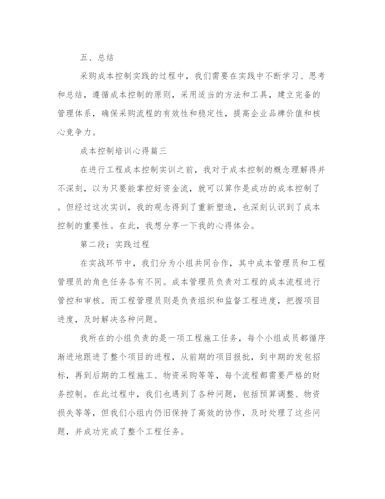 最优成本控制培训心得(通用21篇)人生苦短,总结能使人的经历更加有意义。如何有效管理时间4、通过看范文,我们可以学习到写作的技巧和方法。成本控制培训心得篇一成本控制说起来很大,很多企业很多人都进行了分析分析,有很多的方法。但企业在运行中怎样选择,怎么选择合适自己的成本控制?怎样把成本控制落到实处?这个问题,我只能讲一些自己实际工作中成本控制的些许心得体会。一、成本控制几个阶段控制成本控制分产前、制造过程中以及流程环节,以及售后等环节。(一)产品投产前的控制。这部分控制内容主要包括:产品设计成本,加工工艺成本,外部协作或本厂生产成本比较,物资采购成本,生产组织方式,材料定额与劳动定额水平等。(二)制造过程中的控制。制造过程是成本实际形成的主要阶段。绝大部分的成本支出在这里发生,包括原材料、人工、能源动力、各种辅料的消耗、工序间物料运输费用、车间以及其它管理部门的费用支出。投产前控制的种种方案设想、控制措施能否在制造过程中贯彻实施。(三)流通过程中的控制。流通过程中的控制关键是流通过程的合理库存、合理运输途径,以及市场上合理报价。合理的销售市场定价,对利润的实现是起至关主要的作用。定价前进行市场销售比较等。二、常见的成本控制的关键点(一)定额制定。主要有材料定额bom表和工时定额。成本控制主要是关注材料消耗定额,制定、校正消耗定额,这个需要技术部门配合。最好精细化管理,做到定额领料,先核算每笔订单的材料定额需求量,实际生产中的超额领料进行领导签字控制。工时定额的制定。工序涉及繁简,以及技术含量等问题,合理的工时制定,有利于生产任务的实现,而且增加员工的工作积极性,对员工内部和谐生产大有裨益。在实际工作中,还会出现动力定额、制造费用定额等。定额管理是成本控制基础工作的核心,建立定额领料制度,控制材料成本、燃料动力成本,建立人工包干制度,控制工时成本,以及控制制造费用,都要依赖定额制度。(二)关键环节的把控。生产性企业产品生产都有生产环节关键点,有时候生产环节关键点和财务控制环节的关键点是一致的。比如材料投入的关键点或者质量控制的关键点。一次性投入价值很大的材料,这块的材料投入率控制就成本控制的关键点,要单独进行精细控制。实现精细化管理的有时涉及到各车间交接半成品的问题,财务核算涉及到半成品价格制定。内部价格(价格标准化),即内部结算价格,它用于厂部个车间内部核算。还有质量标准化。关键生产环节的质量控制是产品优次的点,这块的成本控制,单独精细化管理很重要。(三)销售结算价格的制定。销售结算价格的制定,即企业销售结算价格。销售价格的定位要与企业产品相匹配,与相应市场进行吻合。进行市场调研价格,是有效手段。也是检测bom和实际生产是否匹配的调节剂。价格制定有些项目研发生产,有时候要根据预算、合同和实际生产情况确定。(四)管理细节。1、存货的合理库存量。2、物资采购控制。分析物资价格变动规律,以及供应商进行竞标选择等。3、协作分包方式。部分半成品外包使成本降低等。4、成本指标的考核。投入产出率、废品率、完工率、成本毛利率等。三、成本控制执行(一)制度建设。制度建设是根本,文化建设是补充。没有制度建设,就不能固化成本控制运行,就不能保证成本控制质量。成本控制中最重要的制度是定额管理制度、预算管理制度、费用审报制度等。制度建设其一是要从运行出发,这样才能使责任人找准位置,便于操作。其二是制度执行力,要进行制度的执行追踪。(二)成本目标考核。首先确定财务所需的成本目标,需要各部门提供的财务数据。在实施过程中,注意减少目标不明确的项目和任务。要明确各部门的成本任务。考核目标要数字量化,包括可控费用(人事、水电、包装、耗材等)和不可控费用(固定资产折旧、原料采购、利息、销售费用等)。每月、每季度都由财务汇总后发到管理者的手中,超支和异常的数据就用红色特别标识。在月底的总结会议中,相关部门需要对超支的部分做出解释。四、模具及特制品项目成本模具及特制品可分为研发、制造、销售、服务四个阶段。(一)模具及特制品项目成本特殊。项目和研发成本,有时候生产周期比较长,总体环节比较多,繁杂。特性主要包括:1、生产类型和产品流程:属定购型,先与用户签订合同再生产,产品流程与大批量生产的产品区别很大。2、生产数量:为单件或小批量生产,没有规模效应。3、产品:技术密集型,涉及多领域知识,具有系统性、复杂的功能和界面,研发成本高。4、风险:项目周期长、风险大,在设计和制造过程中会有无法预料的事件发生。(二)模具及特制品项目成本控制着手点。成本控制的起始点延伸到营销和研发阶段,即主要成本形成阶段,在成本的最佳可控时间点,利用框架合同等方法进行控制。通过从项目的起点开始,直到项目保修完成的整个过