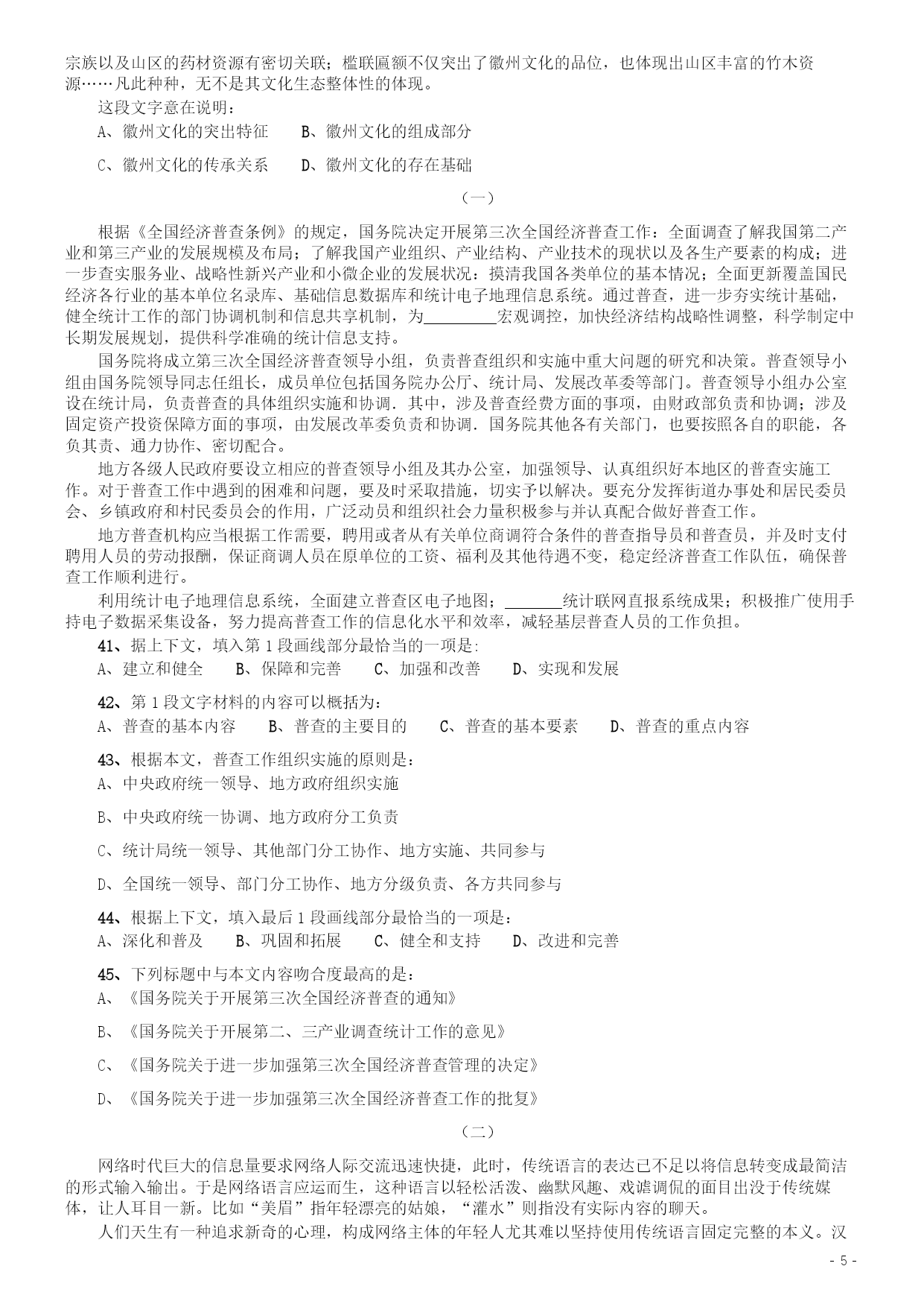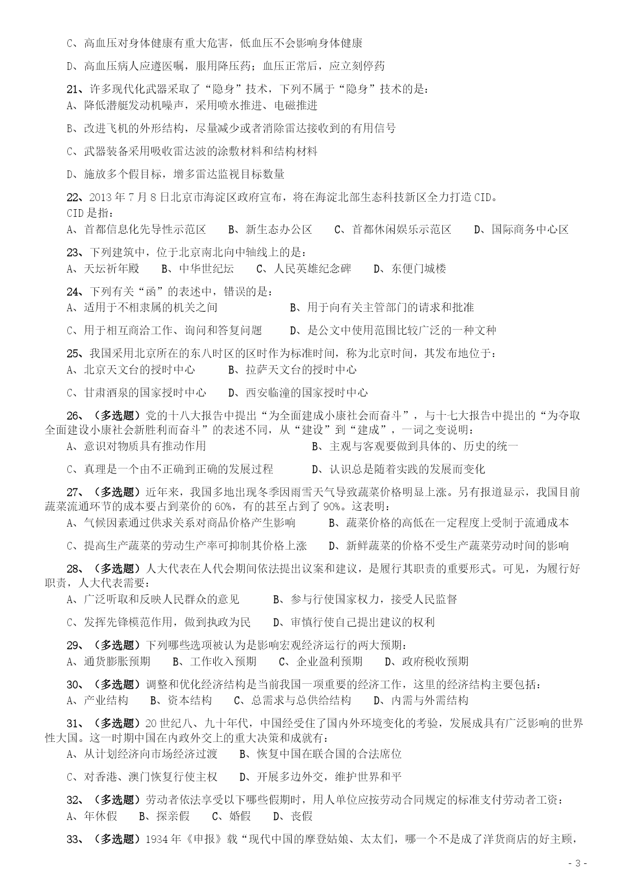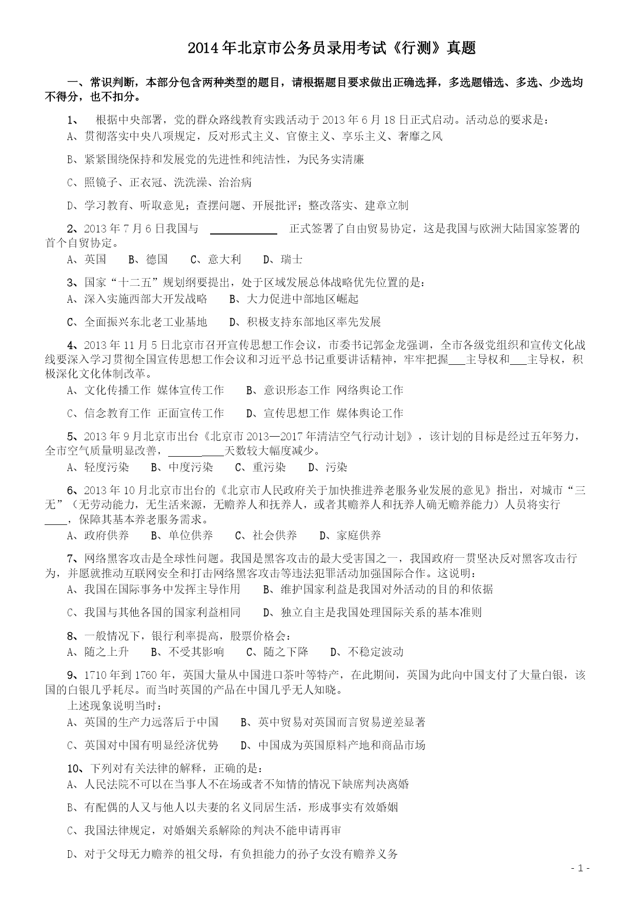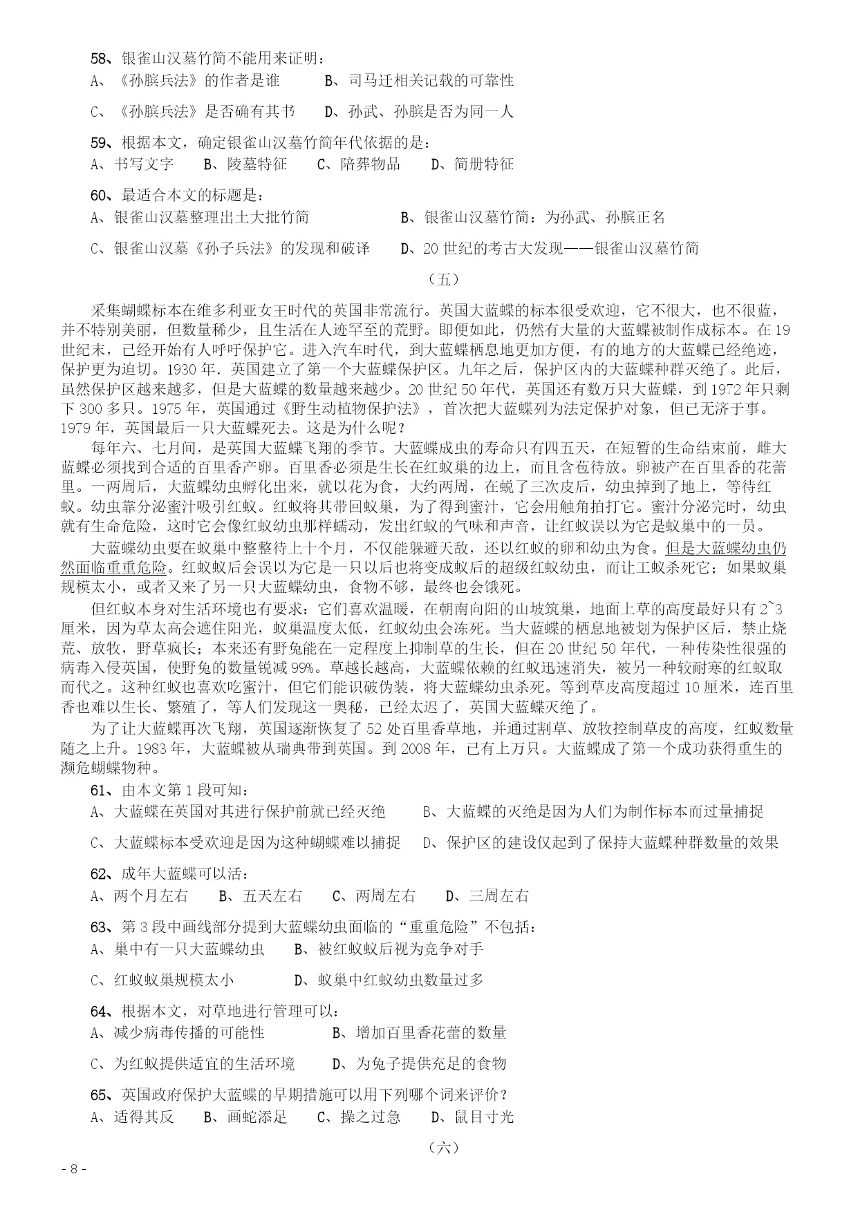 PAGE\*MERGEFORMAT-19-2014年北京市公务员录用考试《行测》真题一、常识判断,本部分包含两种类型的题目,请根据题目要求做出正确选择,多选题错选、多选、少选均不得分,也不扣分。1、根据中央部署,党的群众路线教育实践活动于2013年6月18日正式启动。活动总的要求是:A、贯彻落实中央八项规定,反对形式主义、官僚主义、享乐主义、奢靡之风B、紧紧围绕保持和发展党的先进性和纯洁性,为民务实清廉C、照镜子、正衣冠、洗洗澡、治治病D、学习教育、听取意见;查摆问题、开展批评;整改落实、建章立制2、2013年7月6日我国与正式签署了自由贸易协定,这是我国与欧洲大陆国家签署的首个自贸协定。A、英国B、德国C、意大利D、瑞士3、国家“十二五”规划纲要提出,处于区域发展总体战略优先位置的是:A、深入实施西部大开发战略B、大力促进中部地区崛起C、全面振兴东北老工业基地D、积极支持东部地区率先发展4、2013年11月5日北京市召开宣传思想工作会议,市委书记郭金龙强调,全市各级党组织和宣传文化战线要深入学习贯彻全国宣传思想工作会议和习近平总书记重要讲话精神,牢牢把握___主导权和___主导权,积极深化文化体制改革。A、文化传播工作媒体宣传工作B、意识形态工作网络舆论工作C、信念教育工作正面宣传工作D、宣传思想工作媒体舆论工作5、2013年9月北京市出台《北京市2013—2017年清洁空气行动计划》,该计划的目标是经过五年努力,全市空气质量明显改善,____天数较大幅度减少。A、轻度污染B、中度污染C、重污染D、污染6、2013年10月北京市出台的《北京市人民政府关于加快推进养老服务业发展的意见》指出,对城市“三无”(无劳动能力,无生活来源,无赡养人和抚养人,或者其赡养人和抚养人确无赡养能力)人员将实行____,保障其基本养老服务需求。A、政府供养B、单位供养C、社会供养D、家庭供养7、网络黑客攻击是全球性问题。我国是黑客攻击的最大受害国之一,我国政府一贯坚决反对黑客攻击行为,并愿就推动互联网安全和打击网络黑客攻击等违法犯罪活动加强国际合作。这说明:A、我国在国际事务中发挥主导作用B、维护国家利益是我国对外活动的目的和依据C、我国与其他各国的国家利益相同D、独立自主是我国处理国际关系的基本准则8、一般情况下,银行利率提高,股票价格会:A、随之上升B、不受其影响C、随之下降D、不稳定波动9、1710年到1760年,英国大量从中国进口茶叶等特产,在此期间,英国为此向中国支付了大量白银,该国的白银几乎耗尽。而当时英国的产品在中国几乎无人知晓。上述现象说明当时:A、英国的生产力远落后于中国B、英中贸易对英国而言贸易逆差显著C、英国对中国有明显经济优势D、中国成为英国原料产地和商品市场10、下列对有关法律的解释,正确的是:A、人民法院不可以在当事人不在场或者不知情的情况下缺席判决离婚B、有配偶的人又与他人以夫妻的名义同居生活,形成事实有效婚姻C、我国法律规定,对婚姻关系解除的判决不能申请再审D、对于父母无力赡养的祖父母,有负担能力的孙子女没有赡养义务11、2013年高考前夕,一则消息让广大农村考生感到温暖和振奋:国家决定,提高重点高校招收农村学生比例,今年比去年增加8.6%。这主要体现了:A、党和政府维护社会公平B、党和政府以人为本的执政理念C、党同人民群众的血肉联系D、党和政府求真务实的工作作风12、王某不服工商所对其依法作出的300元罚款的决定,应向____提出复议。A、该工商所B、派出该工商所的工商局的上级机关C、该工商所所在地的乡政府D、派出该工商所的工商局13、王某明知某电器产品不符合保障人身安全的国家标准,仍然大量进货销售,销售金额达80万元。某企业因使用这种电器造成短路,引起火灾,致3人轻伤,部分厂房被烧毁。下列说法中正确的是:A、王某的行为已构成失火罪B、王某的行为已构成销售伪劣产品罪C、对王某应按照失火罪和销售伪劣产品罪中的一个重罪定罪处罚D、对王某应按照销售伪劣产品罪和过失伤人罪,数罪并罚14、2013年11月18日国家主席习近平在会见美国前总统克林顿时指出,中美两国正在共同致力于中美“新型大国关系”。下列对于中美两国关系发展历程中的历史事件,时间排序正确的是:①签订《中美贸易关系协定》②尼克松访华③中美联合发表“八一七公报”④乒乓外交A、④③②①B、③①④②C、④②①③D、④②③①15、我国南方和北方的地理分界线是:A、乌蒙山—长江B、祁连山—黄河C、伏牛山—淮河D、秦岭—淮河16、“新思潮的精神是一种评判的态度。新思潮的手段是研究问题和输入学理。……新思潮对旧文化的态度,在积极一面是反对盲从,是反对