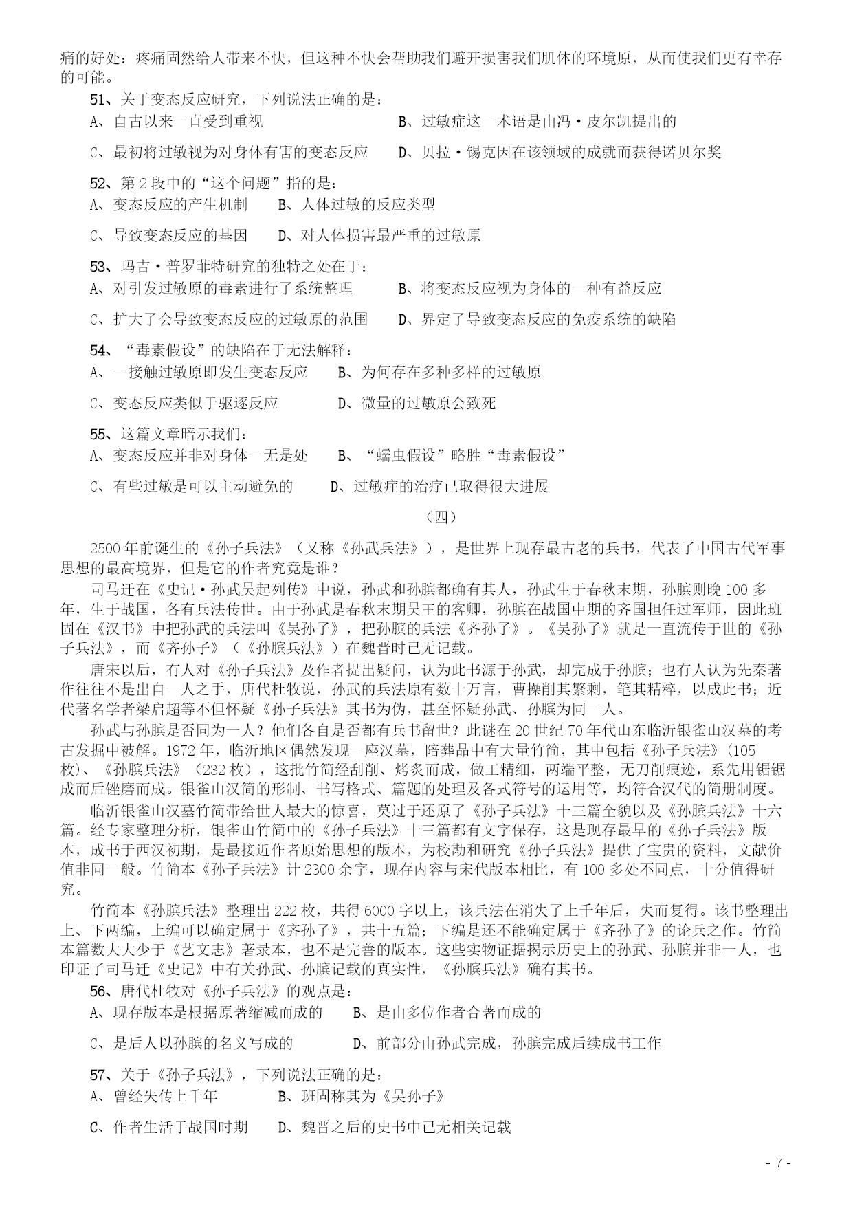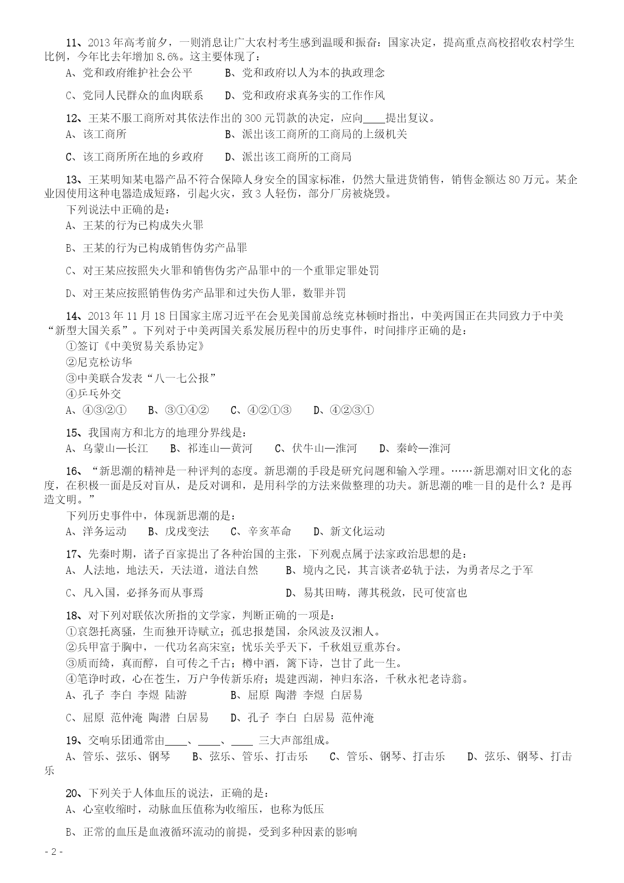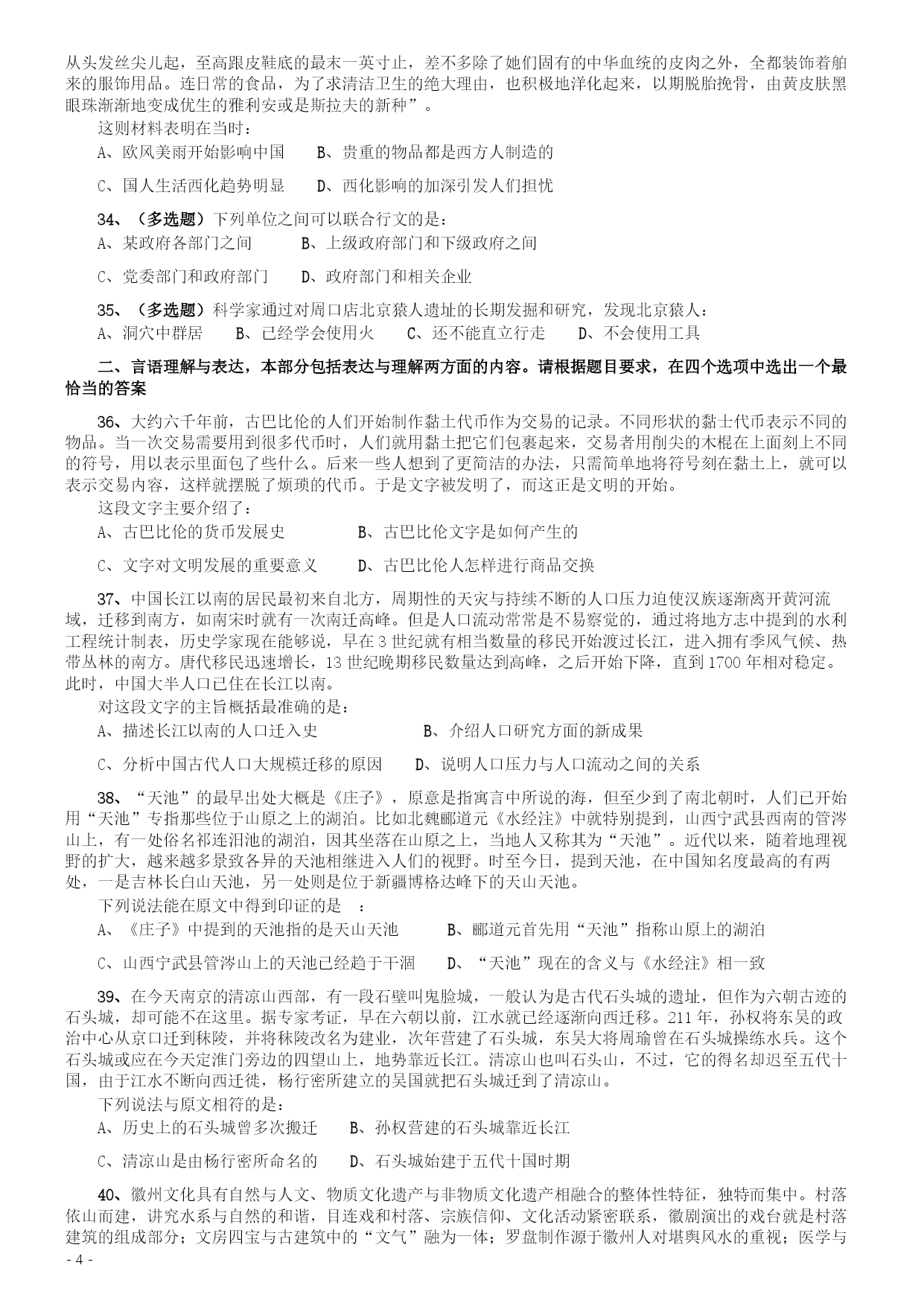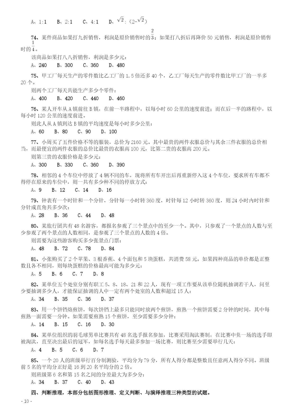 PAGE\*MERGEFORMAT-19-2014年北京市公务员录用考试《行测》真题一、常识判断,本部分包含两种类型的题目,请根据题目要求做出正确选择,多选题错选、多选、少选均不得分,也不扣分。1、根据中央部署,党的群众路线教育实践活动于2013年6月18日正式启动。活动总的要求是:A、贯彻落实中央八项规定,反对形式主义、官僚主义、享乐主义、奢靡之风B、紧紧围绕保持和发展党的先进性和纯洁性,为民务实清廉C、照镜子、正衣冠、洗洗澡、治治病D、学习教育、听取意见;查摆问题、开展批评;整改落实、建章立制2、2013年7月6日我国与正式签署了自由贸易协定,这是我国与欧洲大陆国家签署的首个自贸协定。A、英国B、德国C、意大利D、瑞士3、国家“十二五”规划纲要提出,处于区域发展总体战略优先位置的是:A、深入实施西部大开发战略B、大力促进中部地区崛起C、全面振兴东北老工业基地D、积极支持东部地区率先发展4、2013年11月5日北京市召开宣传思想工作会议,市委书记郭金龙强调,全市各级党组织和宣传文化战线要深入学习贯彻全国宣传思想工作会议和习近平总书记重要讲话精神,牢牢把握___主导权和___主导权,积极深化文化体制改革。A、文化传播工作媒体宣传工作B、意识形态工作网络舆论工作C、信念教育工作正面宣传工作D、宣传思想工作媒体舆论工作5、2013年9月北京市出台《北京市2013—2017年清洁空气行动计划》,该计划的目标是经过五年努力,全市空气质量明显改善,____天数较大幅度减少。A、轻度污染B、中度污染C、重污染D、污染6、2013年10月北京市出台的《北京市人民政府关于加快推进养老服务业发展的意见》指出,对城市“三无”(无劳动能力,无生活来源,无赡养人和抚养人,或者其赡养人和抚养人确无赡养能力)人员将实行____,保障其基本养老服务需求。A、政府供养B、单位供养C、社会供养D、家庭供养7、网络黑客攻击是全球性问题。我国是黑客攻击的最大受害国之一,我国政府一贯坚决反对黑客攻击行为,并愿就推动互联网安全和打击网络黑客攻击等违法犯罪活动加强国际合作。这说明:A、我国在国际事务中发挥主导作用B、维护国家利益是我国对外活动的目的和依据C、我国与其他各国的国家利益相同D、独立自主是我国处理国际关系的基本准则8、一般情况下,银行利率提高,股票价格会:A、随之上升B、不受其影响C、随之下降D、不稳定波动9、1710年到1760年,英国大量从中国进口茶叶等特产,在此期间,英国为此向中国支付了大量白银,该国的白银几乎耗尽。而当时英国的产品在中国几乎无人知晓。上述现象说明当时:A、英国的生产力远落后于中国B、英中贸易对英国而言贸易逆差显著C、英国对中国有明显经济优势D、中国成为英国原料产地和商品市场10、下列对有关法律的解释,正确的是:A、人民法院不可以在当事人不在场或者不知情的情况下缺席判决离婚B、有配偶的人又与他人以夫妻的名义同居生活,形成事实有效婚姻C、我国法律规定,对婚姻关系解除的判决不能申请再审D、对于父母无力赡养的祖父母,有负担能力的孙子女没有赡养义务11、2013年高考前夕,一则消息让广大农村考生感到温暖和振奋:国家决定,提高重点高校招收农村学生比例,今年比去年增加8.6%。这主要体现了:A、党和政府维护社会公平B、党和政府以人为本的执政理念C、党同人民群众的血肉联系D、党和政府求真务实的工作作风12、王某不服工商所对其依法作出的300元罚款的决定,应向____提出复议。A、该工商所B、派出该工商所的工商局的上级机关C、该工商所所在地的乡政府D、派出该工商所的工商局13、王某明知某电器产品不符合保障人身安全的国家标准,仍然大量进货销售,销售金额达80万元。某企业因使用这种电器造成短路,引起火灾,致3人轻伤,部分厂房被烧毁。下列说法中正确的是:A、王某的行为已构成失火罪B、王某的行为已构成销售伪劣产品罪C、对王某应按照失火罪和销售伪劣产品罪中的一个重罪定罪处罚D、对王某应按照销售伪劣产品罪和过失伤人罪,数罪并罚14、2013年11月18日国家主席习近平在会见美国前总统克林顿时指出,中美两国正在共同致力于中美“新型大国关系”。下列对于中美两国关系发展历程中的历史事件,时间排序正确的是:①签订《中美贸易关系协定》②尼克松访华③中美联合发表“八一七公报”④乒乓外交A、④③②①B、③①④②C、④②①③D、④②③①15、我国南方和北方的地理分界线是:A、乌蒙山—长江B、祁连山—黄河C、伏牛山—淮河D、秦岭—淮河16、“新思潮的精神是一种评判的态度。新思潮的手段是研究问题和输入学理。……新思潮对旧文化的态度,在积极一面是反对盲从,是反对