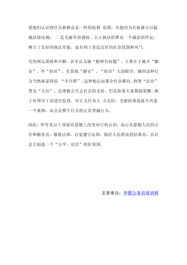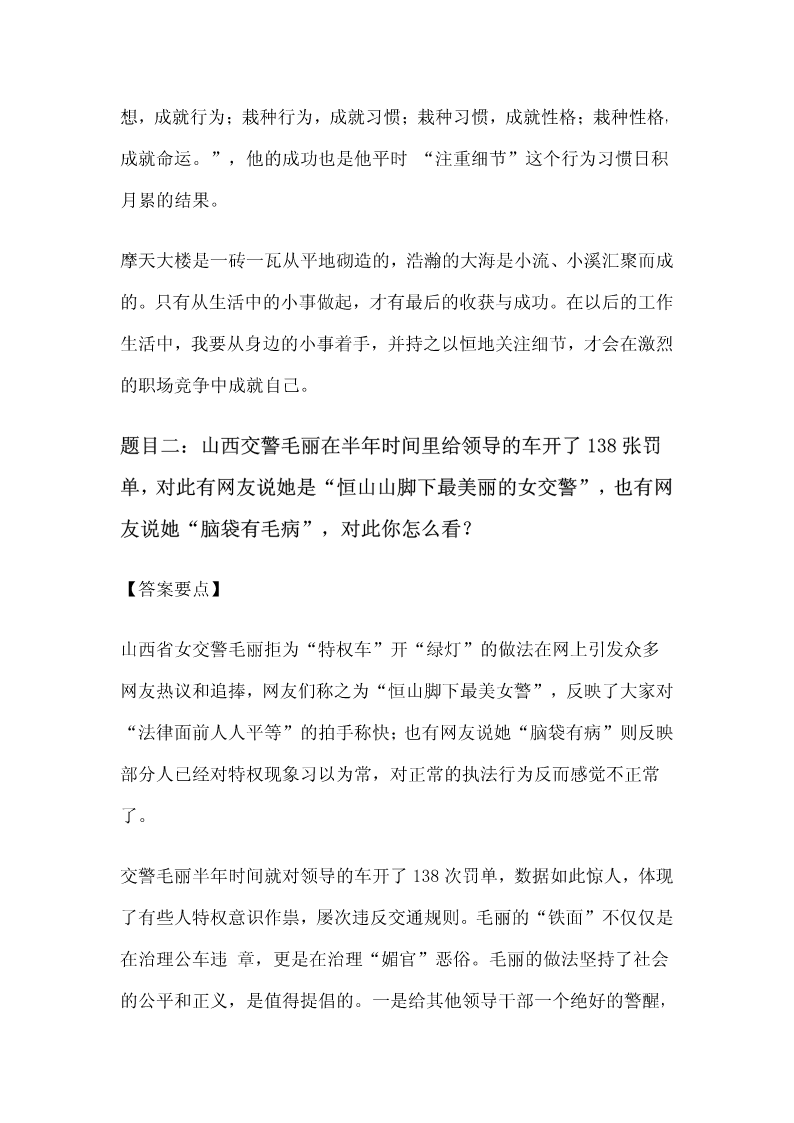 公务员面试题目举例详解面试题目一:老子曰:天下难事,必做于易;天下大事,必做于细。你怎么理解?【答案要点】老子这句话的意思是说天下的难事都是从容易开始做起的,天下的大事都是从细枝末节处一步步形成的。由此可见,一个人要想成就一番事业,必须从简单的事情做起,从细微之处入手。小事成就大事,细节成就完美。很多事情,一个人能做,其他人也能做,只是做出来的效果不一样。往往是一些细节上的功夫,决定着完成的质量。海尔集团总裁张瑞敏曾说:“什么是不简单?把每一件简单的事做好就是不简单;什么是不平凡?把每一件平凡的事做好就是不平凡。”看不到细节,不把细节当回事的人,对工作缺乏认真的态度,对任务只能是敷衍了事。他们只能永远做别人分配给他们做的工作,甚至即便这样也不能把事情做好。而考虑到细节,注重细节的人,不仅认真对待工作,将小事做细,而且注重在做事的细节中找到机会,从而使自己走上成功之路。香港商业巨子李嘉诚无论是在事业上还是在与人的交往中都可以说是取得了巨大的成功,他就在一次讲学中说到:“栽种思想,成就行为;栽种行为,成就习惯;栽种习惯,成就性格;栽种性格,成就命运。”,他的成功也是他平时“注重细节”这个行为习惯日积月累的结果。摩天大楼是一砖一瓦从平地砌造的,浩瀚的大海是小流、小溪汇聚而成的。只有从生活中的小事做起,才有最后的收获与成功。在以后的工作生活中,我要从身边的小事着手,并持之以恒地关注细节,才会在激烈的职场竞争中成就自己。题目二:山西交警毛丽在半年时间里给领导的车开了138张罚单,对此有网友说她是“恒山山脚下最美丽的女交警”,也有网友说她“脑袋有毛病”,对此你怎么看?【答案要点】山西省女交警毛丽拒为“特权车”开“绿灯”的做法在网上引发众多网友热议和追捧,网友们称之为“恒山脚下最美女警”,反映了大家对“法律面前人人平等”的拍手称快;也有网友说她“脑袋有病”则反映部分人已经对特权现象习以为常,对正常的执法行为反而感觉不正常了。交警毛丽半年时间就对领导的车开了138次罚单,数据如此惊人,体现了有些人特权意识作祟,屡次违反交通规则。毛丽的“铁面”不仅仅是在治理公车违章,更是在治理“媚官”恶俗。毛丽的做法坚持了社会的公平和正义,是值得提倡的。一是给其他领导干部一个绝好的警醒,使他们认识到官员和群众是一样的权利范围,不能因为有权就可以超越法律法规;二是毛丽不畏强权、公正执法给群众一个满意的答复,树立了良好的执法形象,也有利于营造良好的社会氛围和风气。有的网友质疑和不解,甚至认为她“精神有问题”,主要在于她不“媚官”、不“怕官”,在其他“媚官”、“怕官”人的眼里,她的这种行为当然就显得很“不合群”。这种想法如果全社会都有,将使“法治”变为“人治”,法律就会失去社会的支持。但是如果大家都能觉醒,敢于对领导干部进行监督,对正义行为大力支持,毛丽的事迹就不再是一个案例,而会是整个社会的正常普遍行为。因此,所有党员干部要从思想上改变对官的认识,真心实意做人民的公仆和勤务员,敬畏法律,自觉遵守法律,做好人民群众的好典范,在社会上创造一个“公平、法治”的好氛围。文章来自:华图公务员培训班