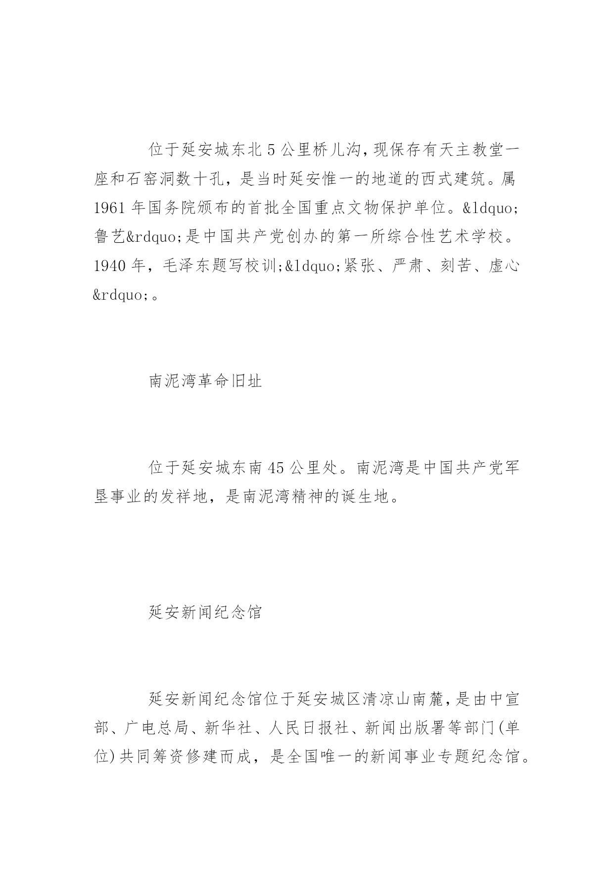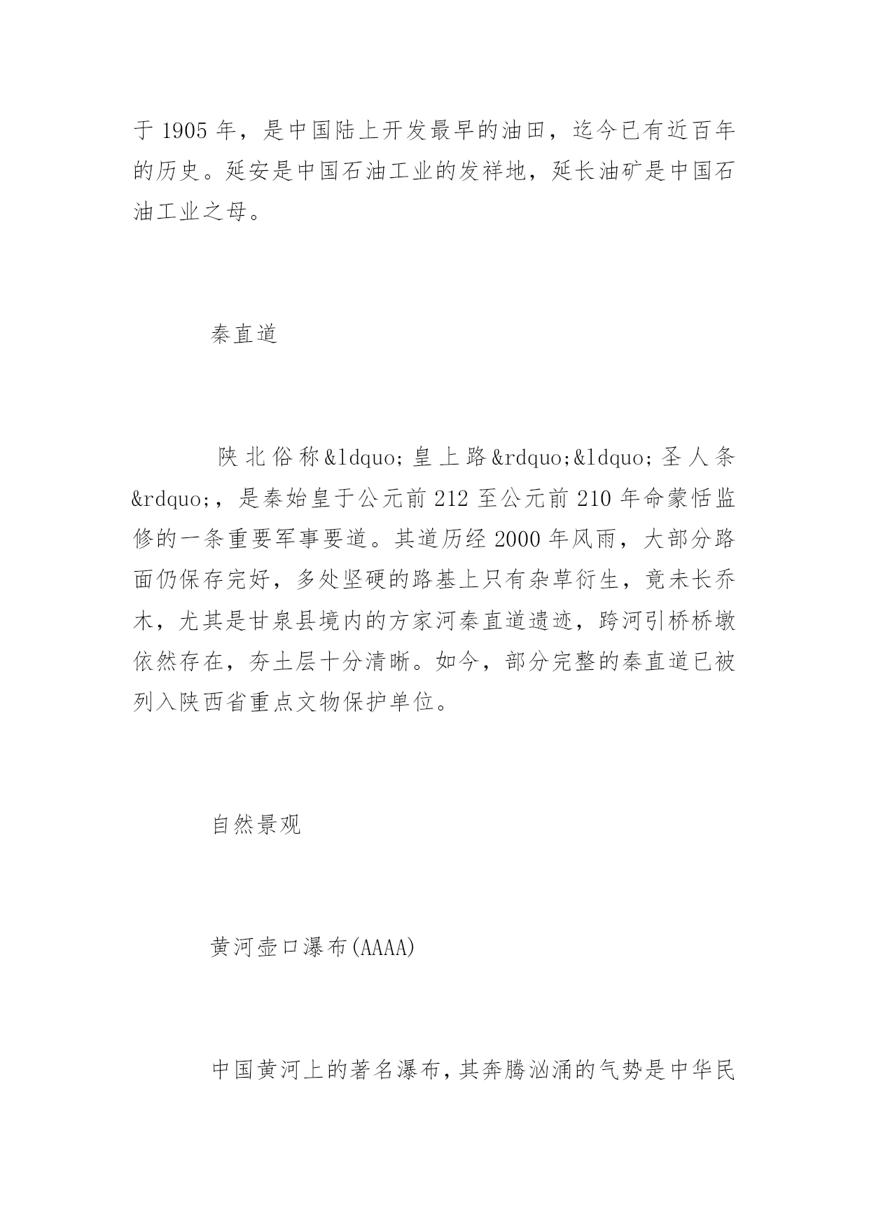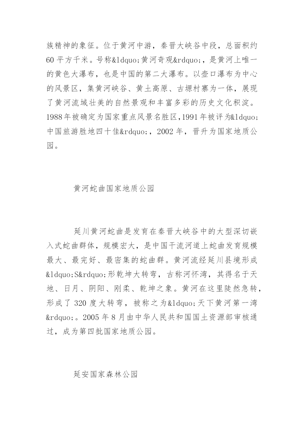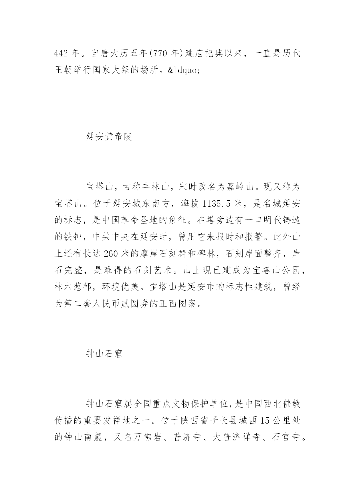 延安旅游景点延安旅游景点大全延安是中国革命的圣地,清凉山是新中国新闻出版事业的摇篮。本文特意为大家收集整理了延安旅游景点大全,赶紧收藏起来吧!人文景观黄帝陵(AAAAA)黄帝陵,是中华民族始祖黄帝(Huangdi;YellowEmperor)轩辕氏的陵墓,相传黄帝得道升天,故此陵墓为衣冠冢。位于陕西省延安市黄陵县城北桥山;1961年,国务院公布为全国第一批全国重点文物保护单位,编为“古墓葬第一号”,号称“天下第一陵”。黄帝陵为全国首批确定的5A级旅游景区。黄帝陵古称“桥陵”,为中国历代帝王和著名人士祭祀黄帝的场所。据记载,最早举行祭祀黄帝始于公元前442年。自唐大历五年(770年)建庙祀典以来,一直是历代王朝举行国家大祭的场所。“延安黄帝陵宝塔山,古称丰林山,宋时改名为嘉岭山。现又称为宝塔山。位于延安城东南方,海拔1135.5米,是名城延安的标志,是中国革命圣地的象征。在塔旁边有一口明代铸造的铁钟,中共中央在延安时,曾用它来报时和报警。此外山上还有长达260米的摩崖石刻群和碑林,石刻岸面整齐,岸石完整,是难得的石刻艺术。山上现已建成为宝塔山公园,林木葱郁,环境优美。宝塔山是延安市的标志性建筑,曾经为第二套人民币贰圆券的正面图案。钟山石窟钟山石窟属全国重点文物保护单位,是中国西北佛教传播的重要发祥地之一。位于陕西省子长县城西15公里处的钟山南麓,又名万佛岩、普济寺、大普济禅寺、石宫寺。被有关专家誉为"中国最早的石窟群"、“全世界罕见的石窟,艺术价值不在莫高窟、龙门、云岗石窟之下”、“第二个敦煌”。[24]太和山太和山又名清凉山,位于延安城北的延河岸上,隔延河水与凤凰山、宝塔山相望。这里山势高耸,风景别致。山上保存完好的建筑物有自隋唐至清代的各类石窟,其中万佛洞是最大的石窟,窟内四周墙壁上雕刻有神态各异的大小佛像万余尊,山顶有太和宫,西有尸毗岩、桃花洞、山腰有诗湾、水照延安、月儿井、琵琶桥、定痂泉、仙人洞、琉璃塔等名胜。清凉山东侧是延安时期的中央印刷厂、新华广播电台、新华通讯社总社、解放日报社、新华书店等革命文物旧址。中国大陆第一口油井中国大陆第一口油井位于延长县城西石油希望小学操场,延长油矿的前身“延长石油官厂”,创建于1905年,是中国陆上开发最早的油田,迄今已有近百年的历史。延安是中国石油工业的发祥地,延长油矿是中国石油工业之母。秦直道陕北俗称“皇上路”“圣人条”,是秦始皇于公元前212至公元前210年命蒙恬监修的一条重要军事要道。其道历经2000年风雨,大部分路面仍保存完好,多处坚硬的路基上只有杂草衍生,竟未长乔木,尤其是甘泉县境内的方家河秦直道遗迹,跨河引桥桥墩依然存在,夯土层十分清晰。如今,部分完整的秦直道已被列入陕西省重点文物保护单位。自然景观黄河壶口瀑布(AAAA)中国黄河上的著名瀑布,其奔腾汹涌的气势是中华民族精神的象征。位于黄河中游,秦晋大峡谷中段,总面积约60平方千米。号称“黄河奇观”,是黄河上唯一的黄色大瀑布,也是中国的第二大瀑布。以壶口瀑布为中心的风景区,集黄河峡谷、黄土高原、古塬村寨为一体,展现了黄河流域壮美的自然景观和丰富多彩的历史文化积淀。1988年被确定为国家重点风景名胜区,1991年被评为“中国旅游胜地四十佳”,2002年,晋升为国家地质公园。黄河蛇曲国家地质公园延川黄河蛇曲是发育在秦晋大峡谷中的大型深切嵌入式蛇曲群体,规模宏大,是中国干流河道上蛇曲发育规模最大、最完好、最密集的蛇曲群。黄河流经延川县境形成“S”形乾坤大转弯,古称河怀湾,其得名于天地、日月、阴阳、刚柔、乾坤之象。黄河在这里陡然急转,形成了320度大转弯,被称之为“天下黄河第一湾”。2005年8月由中华人民共和国国土资源部审核通过,成为第四批国家地质公园。延安国家森林公园位于陕西省延安市,1992年建园、面积为5446.67公顷。森林覆盖率为55.6%,是国家惟一的城郊生态型森林公园。魏塔古村落魏塔村古朴,宁静,原生态。没有城市的喧嚣和拥堵。人置身于此,轻松、自由,可寻找到一片心灵宁静的归宿,吸引了大量画家写生、摄影以及电影拍摄。延安大学艺术学院、首都师范大学美术学院、中央美院附中、陕西国画院等在此挂牌并确定为写生创作基地。先后有许多画家来此写生,著名的就有李爱国、袁武、许勇、孙志钧、陈钰铭、李乃蔚、邹立颖、马新林、邢庆仁、范华、陈晓光、盛沉、张春华、钟剑秋、廖哲林