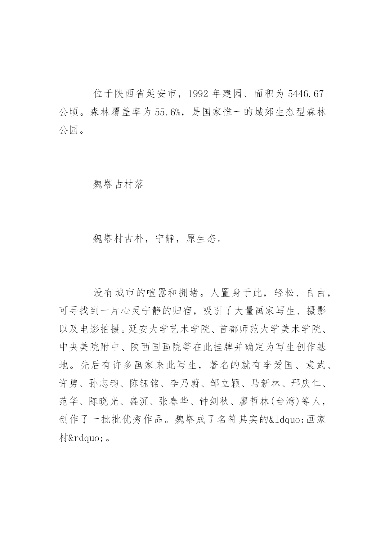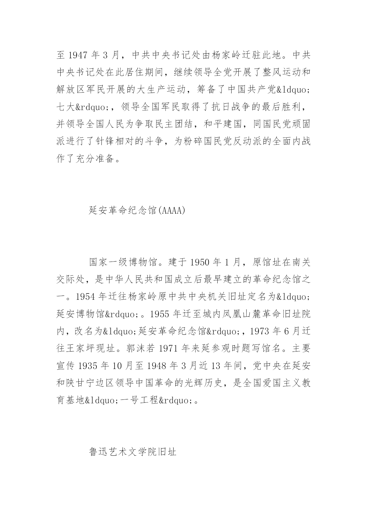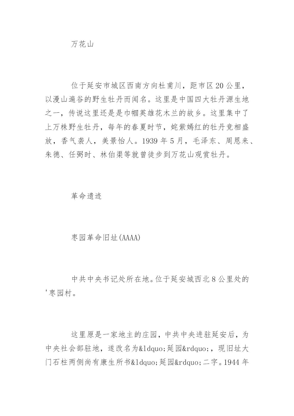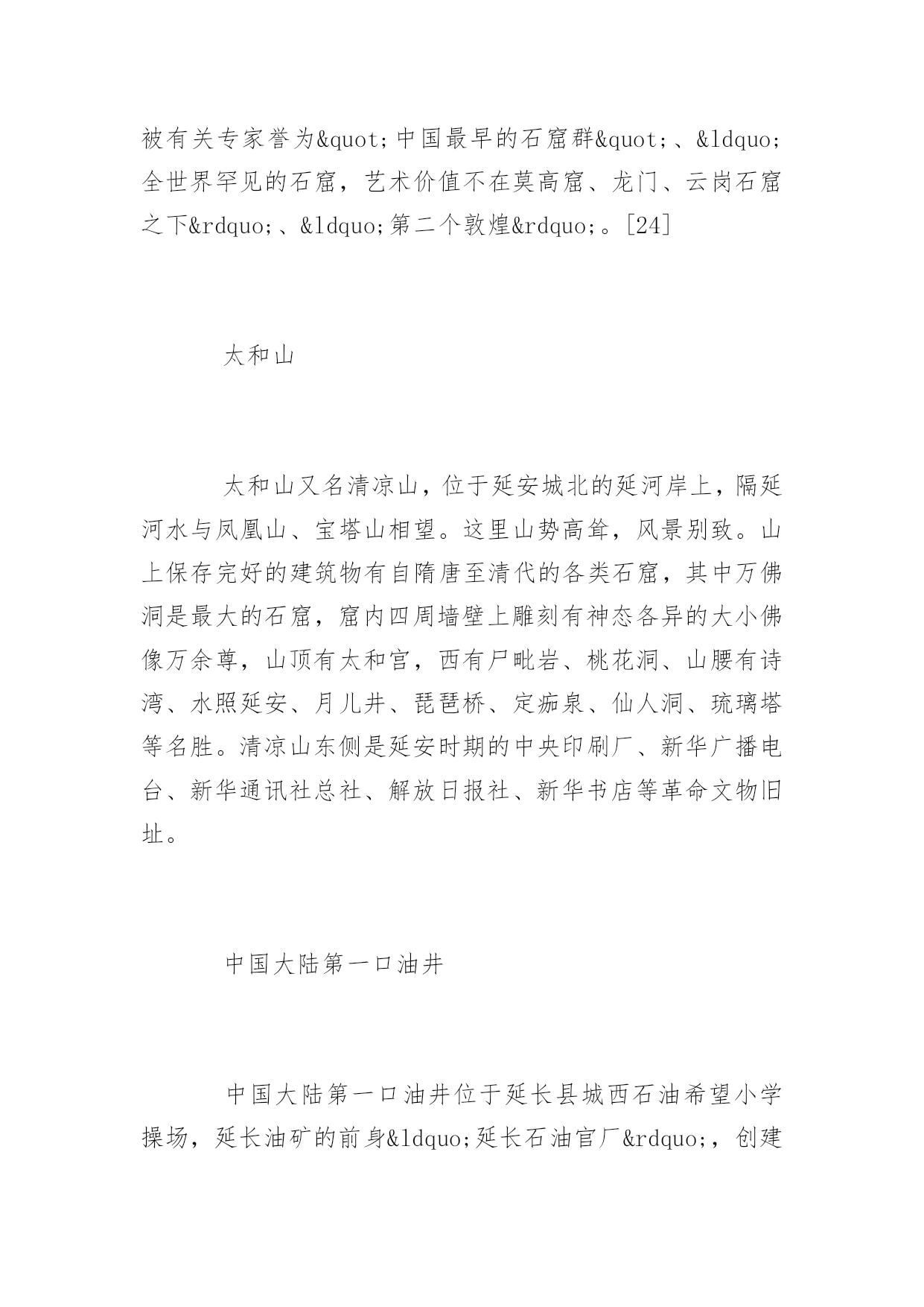 延安旅游景点延安旅游景点大全延安是中国革命的圣地,清凉山是新中国新闻出版事业的摇篮。本文特意为大家收集整理了延安旅游景点大全,赶紧收藏起来吧!人文景观黄帝陵(AAAAA)黄帝陵,是中华民族始祖黄帝(Huangdi;YellowEmperor)轩辕氏的陵墓,相传黄帝得道升天,故此陵墓为衣冠冢。位于陕西省延安市黄陵县城北桥山;1961年,国务院公布为全国第一批全国重点文物保护单位,编为“古墓葬第一号”,号称“天下第一陵”。黄帝陵为全国首批确定的5A级旅游景区。黄帝陵古称“桥陵”,为中国历代帝王和著名人士祭祀黄帝的场所。据记载,最早举行祭祀黄帝始于公元前442年。自唐大历五年(770年)建庙祀典以来,一直是历代王朝举行国家大祭的场所。“延安黄帝陵宝塔山,古称丰林山,宋时改名为嘉岭山。现又称为宝塔山。位于延安城东南方,海拔1135.5米,是名城延安的标志,是中国革命圣地的象征。在塔旁边有一口明代铸造的铁钟,中共中央在延安时,曾用它来报时和报警。此外山上还有长达260米的摩崖石刻群和碑林,石刻岸面整齐,岸石完整,是难得的石刻艺术。山上现已建成为宝塔山公园,林木葱郁,环境优美。宝塔山是延安市的标志性建筑,曾经为第二套人民币贰圆券的正面图案。钟山石窟钟山石窟属全国重点文物保护单位,是中国西北佛教传播的重要发祥地之一。位于陕西省子长县城西15公里处的钟山南麓,又名万佛岩、普济寺、大普济禅寺、石宫寺。被有关专家誉为"中国最早的石窟群"、“全世界罕见的石窟,艺术价值不在莫高窟、龙门、云岗石窟之下”、“第二个敦煌”。[24]太和山太和山又名清凉山,位于延安城北的延河岸上,隔延河水与凤凰山、宝塔山相望。这里山势高耸,风景别致。山上保存完好的建筑物有自隋唐至清代的各类石窟,其中万佛洞是最大的石窟,窟内四周墙壁上雕刻有神态各异的大小佛像万余尊,山顶有太和宫,西有尸毗岩、桃花洞、山腰有诗湾、水照延安、月儿井、琵琶桥、定痂泉、仙人洞、琉璃塔等名胜。清凉山东侧是延安时期的中央印刷厂、新华广播电台、新华通讯社总社、解放日报社、新华书店等革命文物旧址。中国大陆第一口油井中国大陆第一口油井位于延长县城西石油希望小学操场,延长油矿的前身“延长石油官厂”,创建于1905年,是中国陆上开发最早的油田,迄今已有近百年的历史。延安是中国石油工业的发祥地,延长油矿是中国石油工业之母。秦直道陕北俗称“皇上路”“圣人条”,是秦始皇于公元前212至公元前210年命蒙恬监修的一条重要军事要道。其道历经2000年风雨,大部分路面仍保存完好,多处坚硬的路基上只有杂草衍生,竟未长乔木,尤其是甘泉县境内的方家河秦直道遗迹,跨河引桥桥墩依然存在,夯土层十分清晰。如今,部分完整的秦直道已被列入陕西省重点文物保护单位。自然景观黄河壶口瀑布(AAAA)中国黄河上的著名瀑布,其奔腾汹涌的气势是中华民族精神的象征。位于黄河中游,秦晋大峡谷中段,总面积约60平方千米。号称“黄河奇观”,是黄河上唯一的黄色大瀑布,也是中国的第二大瀑布。以壶口瀑布为中心的风景区,集黄河峡谷、黄土高原、古塬村寨为一体,展现了黄河流域壮美的自然景观和丰富多彩的历史文化积淀。1988年被确定为国家重点风景名胜区,1991年被评为“中国旅游胜地四十佳”,2002年,晋升为国家地质公园。黄河蛇曲国家地质公园延川黄河蛇曲是发育在秦晋大峡谷中的大型深切嵌入式蛇曲群体,规模宏大,是中国干流河道上蛇曲发育规模最大、最完好、最密集的蛇曲群。黄河流经延川县境形成“S”形乾坤大转弯,古称河怀湾,其得名于天地、日月、阴阳、刚柔、乾坤之象。黄河在这里陡然急转,形成了320度大转弯,被称之为“天下黄河第一湾”。2005年8月由中华人民共和国国土资源部审核通过,成为第四批国家地质公园。延安国家森林公园位于陕西省延安市,1992年建园、面积为5446.67公顷。森林覆盖率为55.6%,是国家惟一的城郊生态型森林公园。魏塔古村落魏塔村古朴,宁静,原生态。没有城市的喧嚣和拥堵。人置身于此,轻松、自由,可寻找到一片心灵宁静的归宿,吸引了大量画家写生、摄影以及电影拍摄。延安大学艺术学院、首都师范大学美术学院、中央美院附中、陕西国画院等在此挂牌并确定为写生创作基地。先后有许多画家来此写生,著名的就有李爱国、袁武、许勇、孙志钧、陈钰铭、李乃蔚、邹立颖、马新林、邢庆仁、范华、陈晓光、盛沉、张春华、钟剑秋、廖哲林