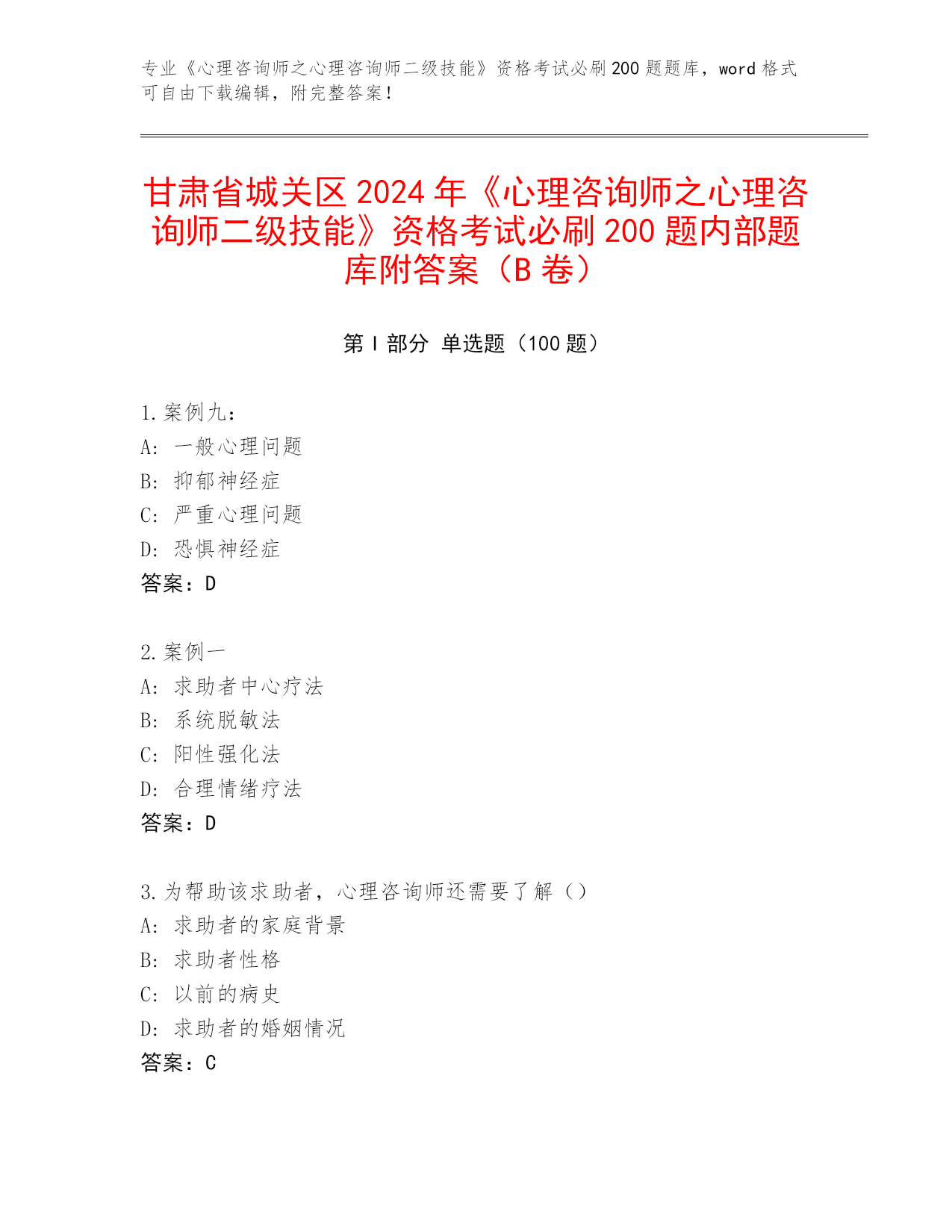 2024年甘肃省城关区《心理咨询师之心理咨询师二级技能》考试必刷200题王牌题库含答案【B卷】