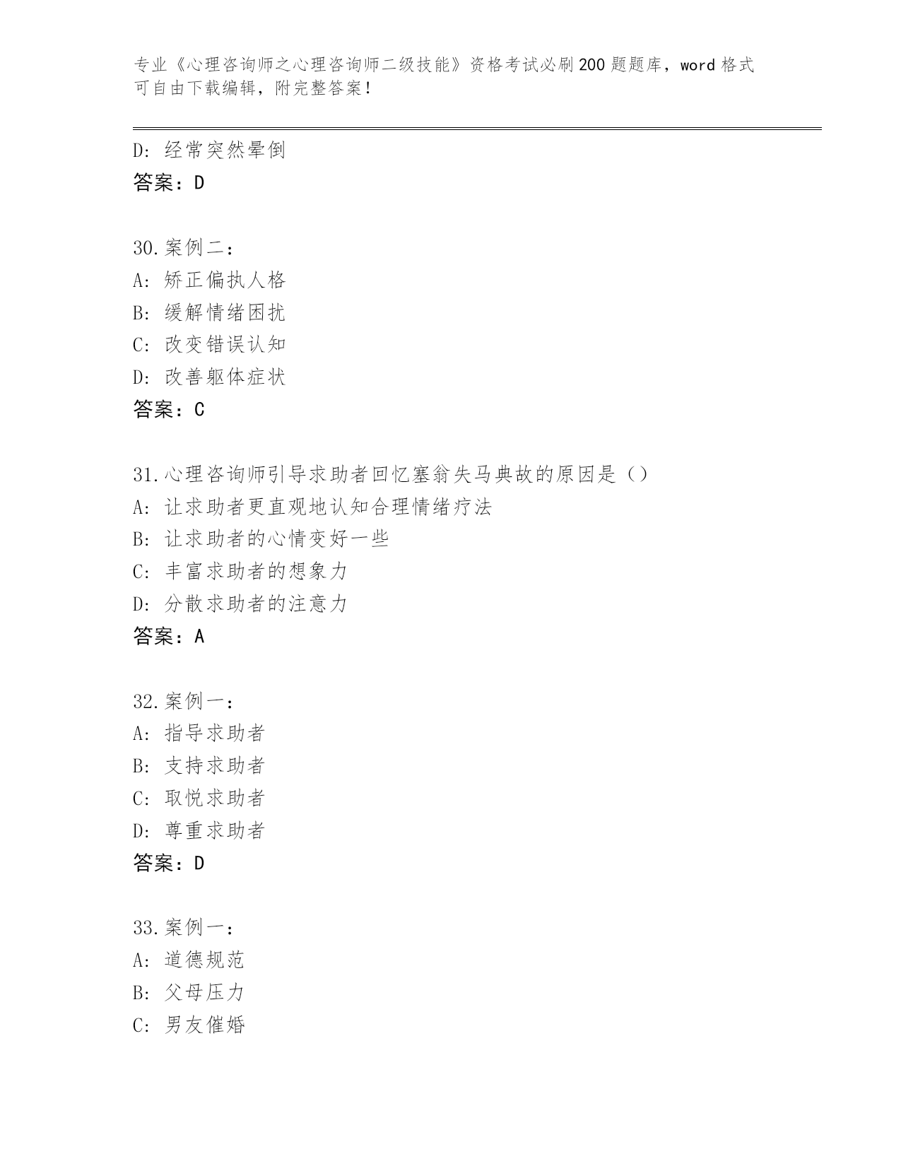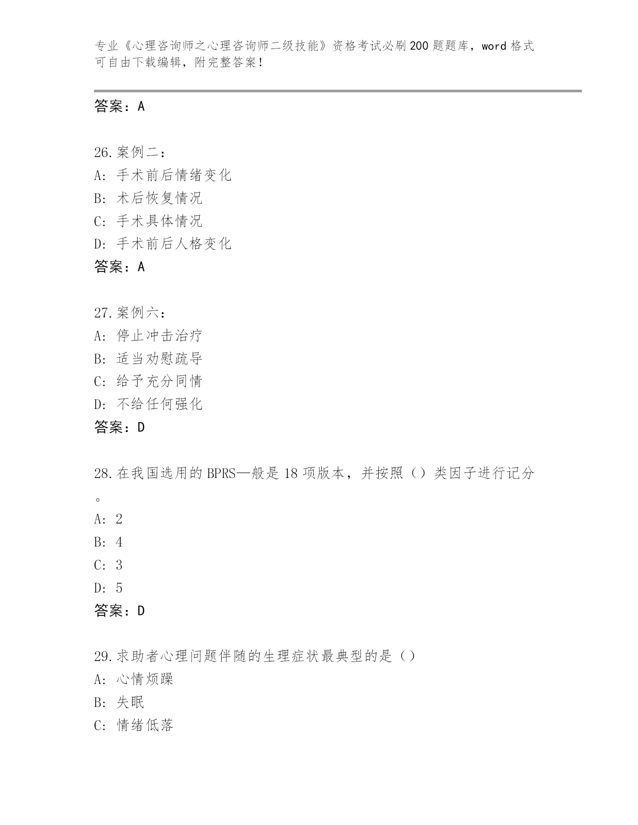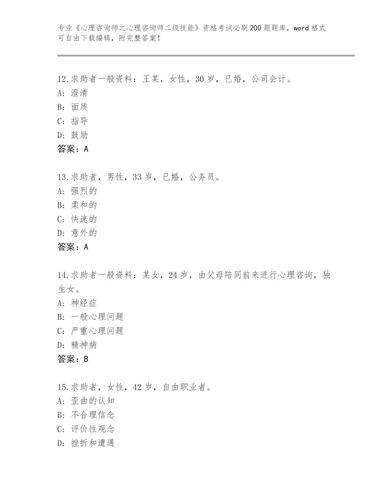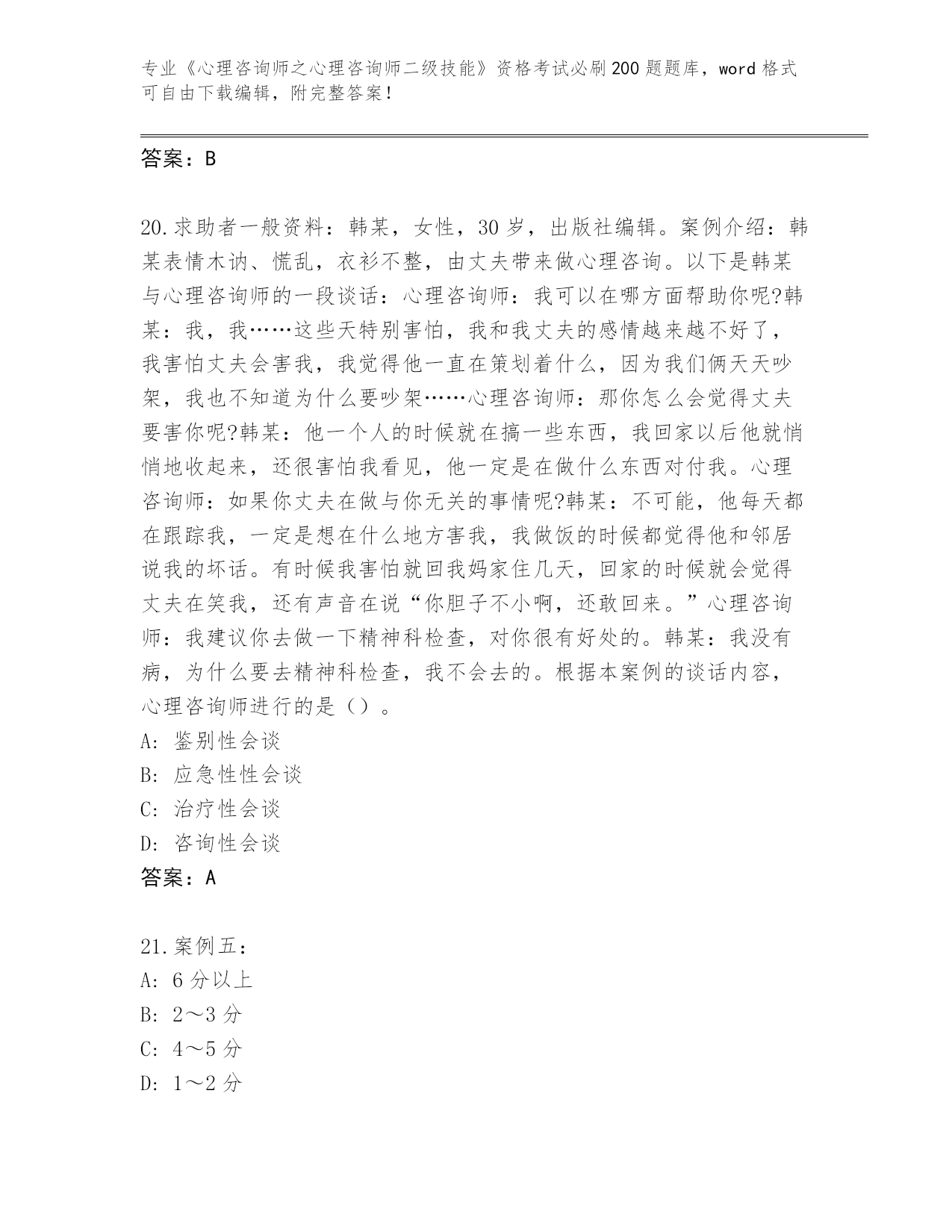 内部使用甘肃省《心理咨询师之心理咨询师二级技能》考试必刷200题内部题库附答案(名师推荐)