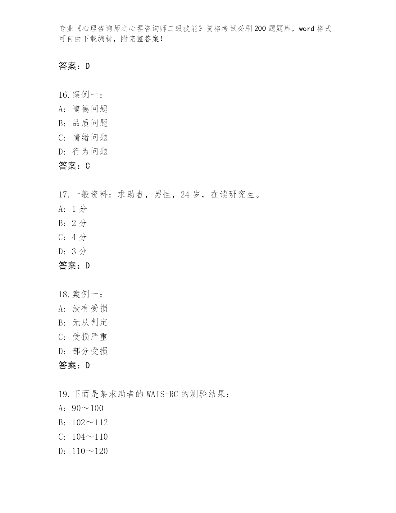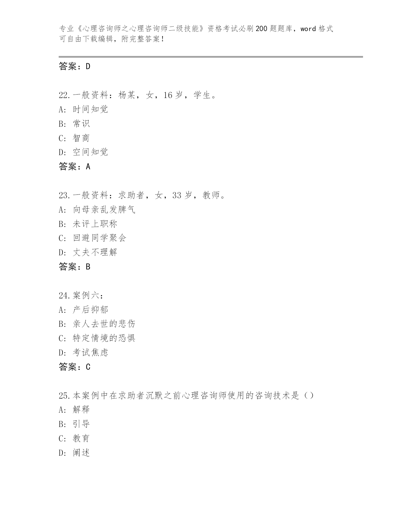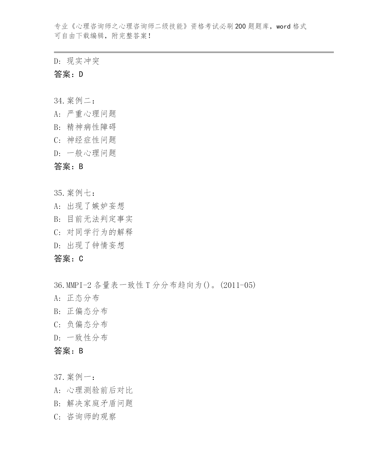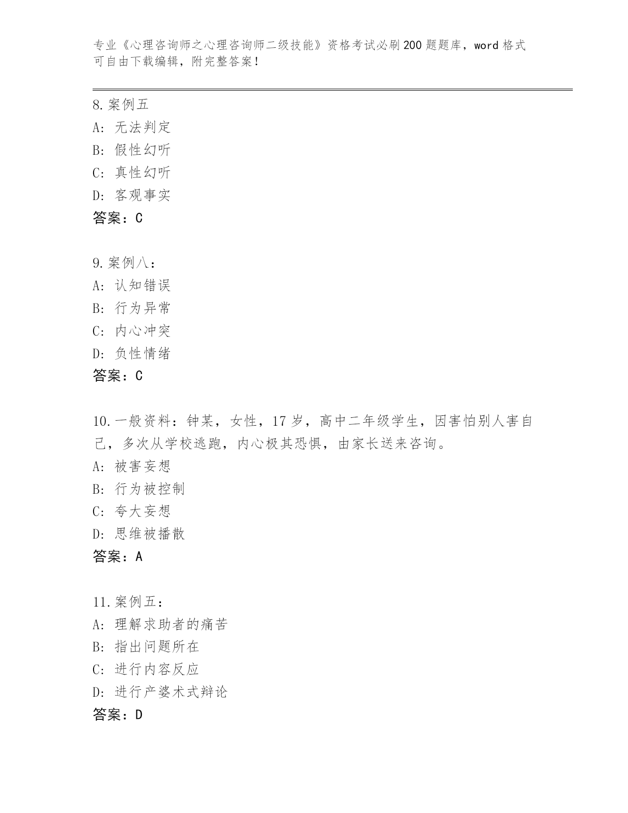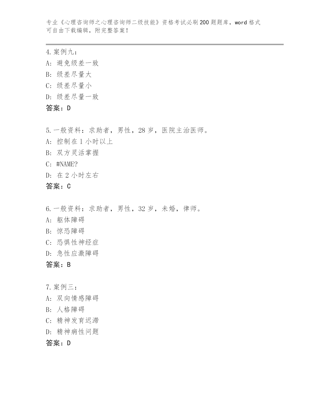 内部使用甘肃省《心理咨询师之心理咨询师二级技能》考试必刷200题内部题库附答案(名师推荐)