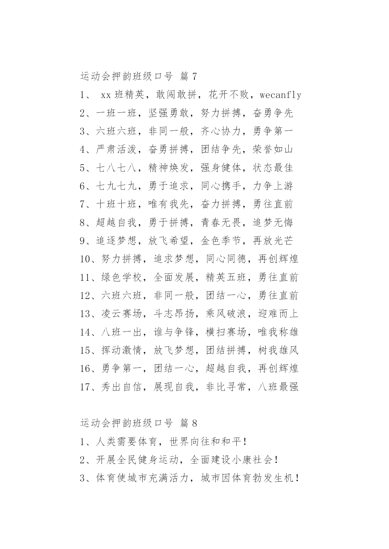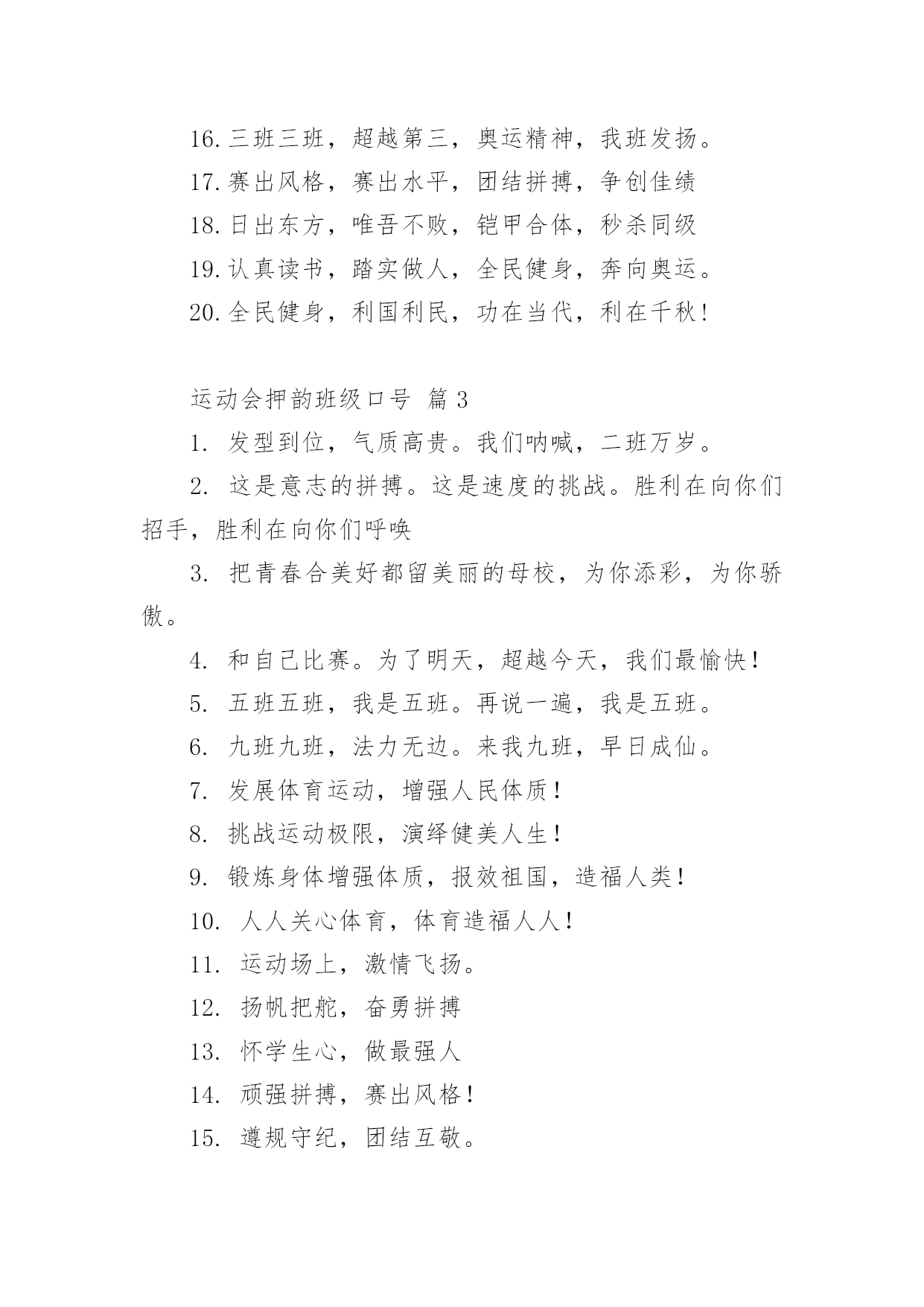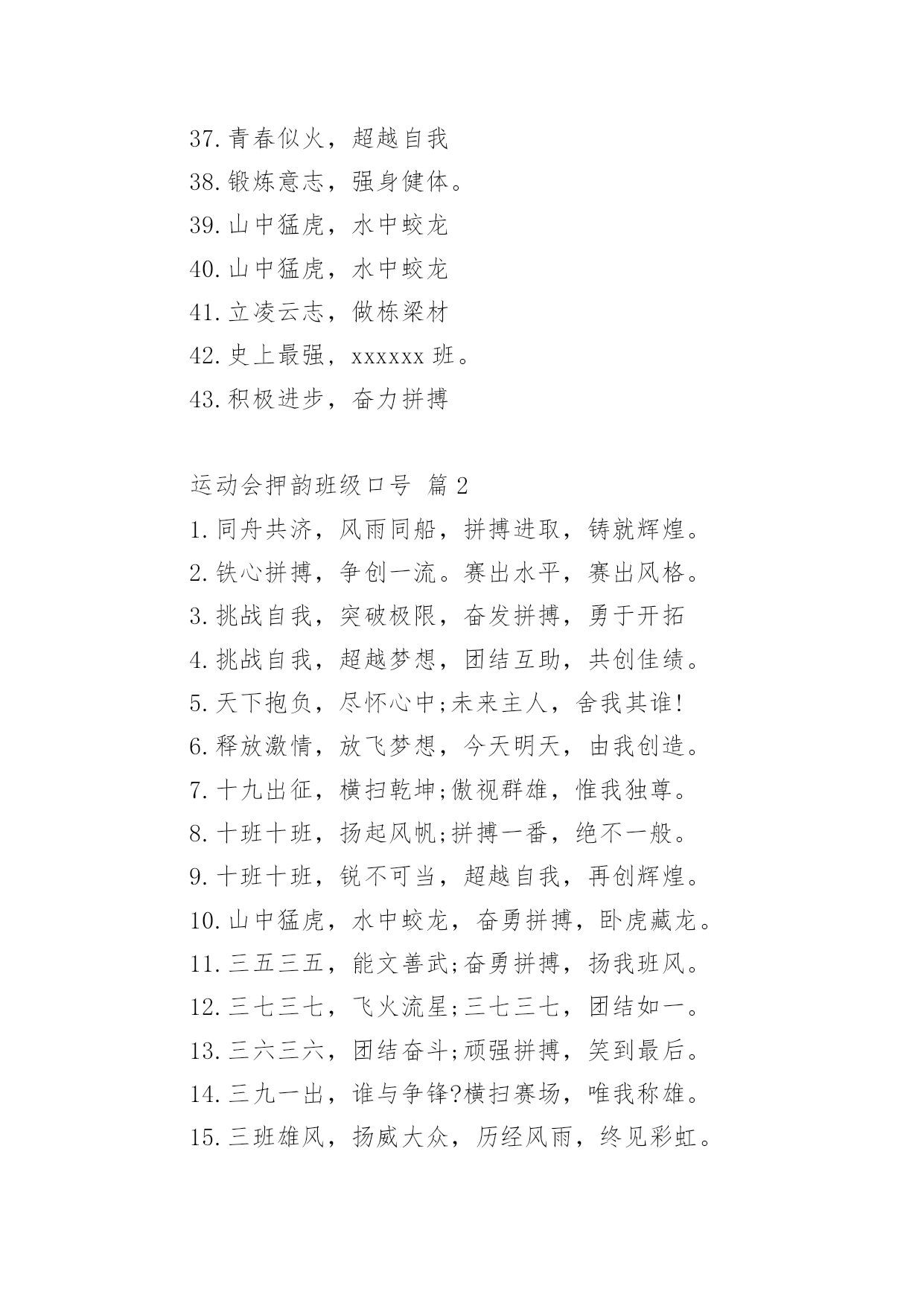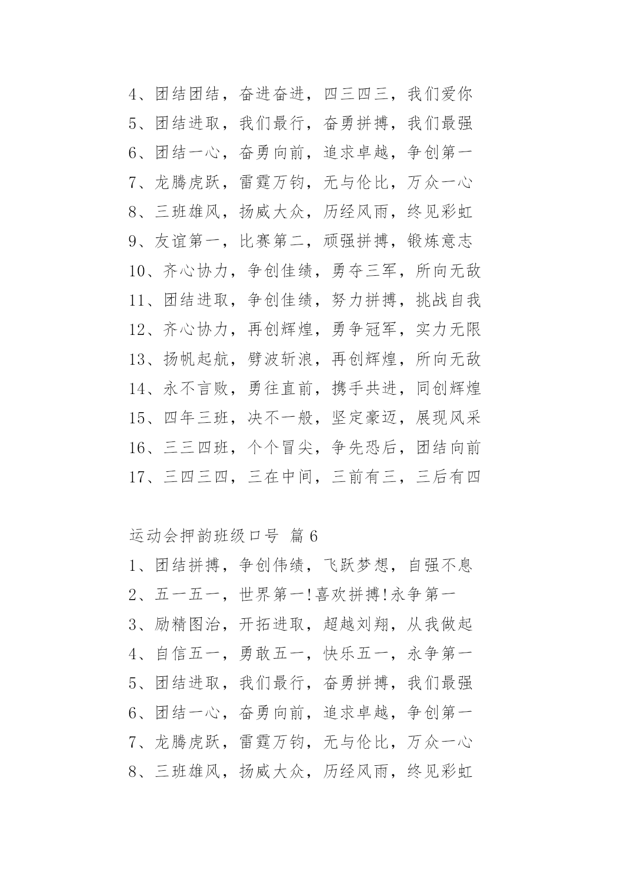 运动会押韵班级口号运动会押韵班级口号(通用15篇)在生活、工作和学习中,大家最不陌生的就是口号了吧,口号一般都用一两句完整的句子来表现一个信息或一个观念,信息单一,容易理解,没有过多的信息需要受众用心记忆和用心理解。究竟什么样的口号才是好的口号呢?以下是小编整理的运动会押韵班级口号,仅供参考,希望能够帮助到大家。运动会押韵班级口号篇11.横扫赛场,唯我称雄。2.龙腾虎跃,雷霆万钧3.秀你自信,展现自我4.非比寻常,xx班最强。5.xx班一出,谁与争锋6.勇夺三军,所向披靡。7.扬长避短,必定成才8.奋勇冲击,永争第一。9.团结拼搏,展现自我10.释放激情,放飞梦想11.力挫群雄,舍我其谁。12.耕耘今天,收获明天13.齐心协力,争创佳绩14.扬帆起航,劈波斩浪15.xx班一出,谁与争锋。16.今天明天,由我创造。17.放飞梦想,创造辉煌。18.刻苦学习,团结一心19.兴我中华,爱我x班20.积极进取,努力拼搏21.奋勇拼搏,披荆斩棘。22.团结一心,奋勇向前23.追求卓越,争创第一。24.莫放松点,莫轻视微25.亲密五班,合作无间26.无与伦比,万众一心。27.英明神武,勇冠江山28.爱我季延,立志成材29.慎而思之,勤而行之30.无与伦比,万众一心。31.龙腾虎跃,雷霆万钧32.天道酬勤,宁静致远33.磨炼意志,奋发冲刺34.奋勇拼搏,永创辉煌。35.磨练意志,强健体魄36.xxxxxx班,卧虎藏龙。37.青春似火,超越自我38.锻炼意志,强身健体。39.山中猛虎,水中蛟龙40.山中猛虎,水中蛟龙41.立凌云志,做栋梁材42.史上最强,xxxxxx班。43.积极进步,奋力拼搏运动会押韵班级口号篇21.同舟共济,风雨同船,拼搏进取,铸就辉煌。2.铁心拼搏,争创一流。赛出水平,赛出风格。3.挑战自我,突破极限,奋发拼搏,勇于开拓4.挑战自我,超越梦想,团结互助,共创佳绩。5.天下抱负,尽怀心中;未来主人,舍我其谁!6.释放激情,放飞梦想,今天明天,由我创造。7.十九出征,横扫乾坤;傲视群雄,惟我独尊。8.十班十班,扬起风帆;拼搏一番,绝不一般。9.十班十班,锐不可当,超越自我,再创辉煌。10.山中猛虎,水中蛟龙,奋勇拼搏,卧虎藏龙。11.三五三五,能文善武;奋勇拼搏,扬我班风。12.三七三七,飞火流星;三七三七,团结如一。13.三六三六,团结奋斗;顽强拼搏,笑到最后。14.三九一出,谁与争锋?横扫赛场,唯我称雄。15.三班雄风,扬威大众,历经风雨,终见彩虹。16.三班三班,超越第三,奥运精神,我班发扬。17.赛出风格,赛出水平,团结拼搏,争创佳绩18.日出东方,唯吾不败,铠甲合体,秒杀同级19.认真读书,踏实做人,全民健身,奔向奥运。20.全民健身,利国利民,功在当代,利在千秋!运动会押韵班级口号篇31.发型到位,气质高贵。我们呐喊,二班万岁。2.这是意志的拼搏。这是速度的挑战。胜利在向你们招手,胜利在向你们呼唤3.把青春合美好都留美丽的母校,为你添彩,为你骄傲。4.和自己比赛。为了明天,超越今天,我们最愉快!5.五班五班,我是五班。再说一遍,我是五班。6.九班九班,法力无边。来我九班,早日成仙。7.发展体育运动,增强人民体质!8.挑战运动极限,演绎健美人生!9.锻炼身体增强体质,报效祖国,造福人类!10.人人关心体育,体育造福人人!11.运动场上,激情飞扬。12.扬帆把舵,奋勇拼搏13.怀学生心,做最强人14.顽强拼搏,赛出风格!15.遵规守纪,团结互敬。运动会押韵班级口号篇41.人文人文,不学伦敦,全家和亲,百姓新闻。2.文者称雄,武者称霸,高三x班,雄霸一中。3.扬帆起航,劈波开浪,xx班出马,谁敢争锋。4.龙腾虎跃,雷霆万钧,无与伦比,万众一心。5.信笃志坚,奋起争先,机汽学子,再创辉煌。6.看我六班、影子飒爽、奋勇拼搏、展现自我。7.比出风采、超越自我。团结拼搏、奋发有为。8.挥动激情、挑战自我、突破极限、超越自我。9.年轻没有失败,只要亮出风采!10.互相学习、取长补短、再接再厉、勇攀高峰。11.九班九班、勇夺桂冠、齐心协力、共创辉煌。12.命运全在拼击,奋斗就是希望。创造另一个新天地。13.顽强拼搏、超越自我、不鸣则已、一鸣惊人。14.青春演绎,勇者激情,机汽健儿,永不言弃。15.一班参加运动会,其他班级洗了睡。神马运动皆浮云,我信春哥我必行。运动会押韵班级口号篇51、三班三班,超越第三,奥运精神,我班发杨2、积极进取,努力拼搏,磨练意志,强健体魄3、四三四三,齐心协力,我们一起,勇夺第一4、团结团结,奋进奋进,四三四三,我们爱你5、团结进取,我们最行,奋勇拼搏,我们最强6、团结一心,奋勇向前,追求卓越,争创第一7、龙腾虎跃,雷霆万钧,无与伦比,万众一心8、三班雄风,扬威大众,历经风雨,终见彩虹9、友谊第一,比