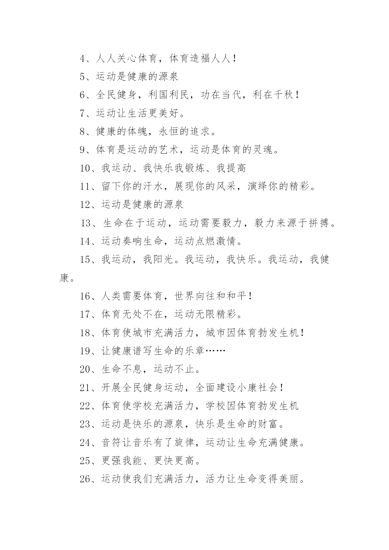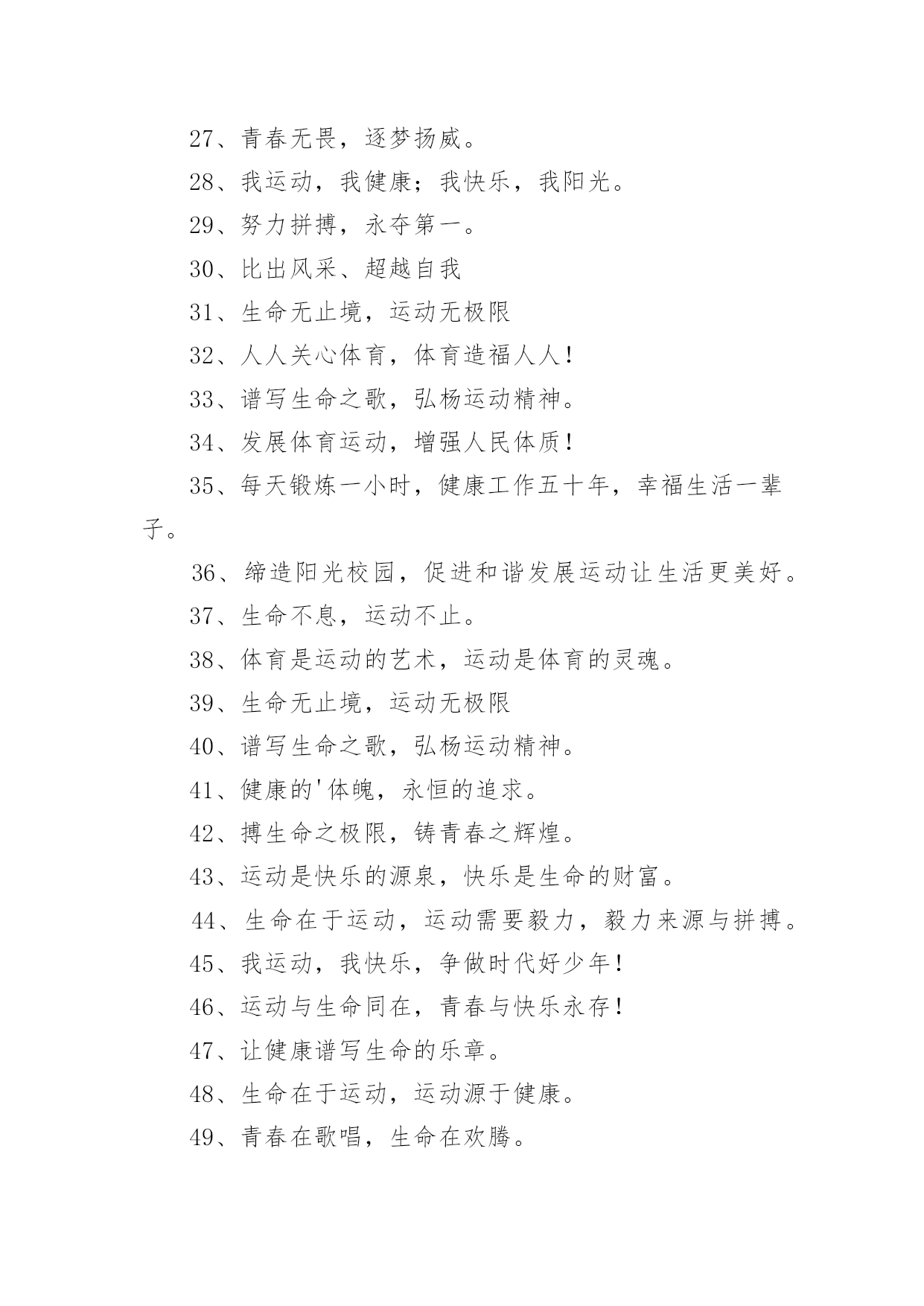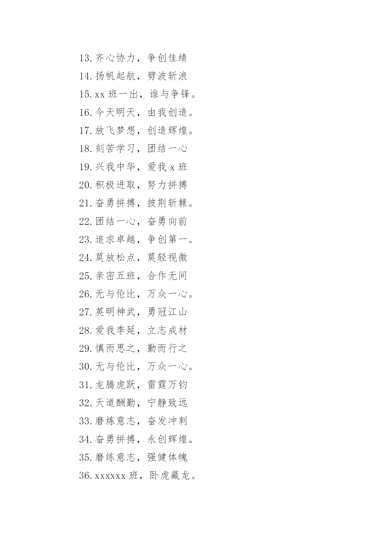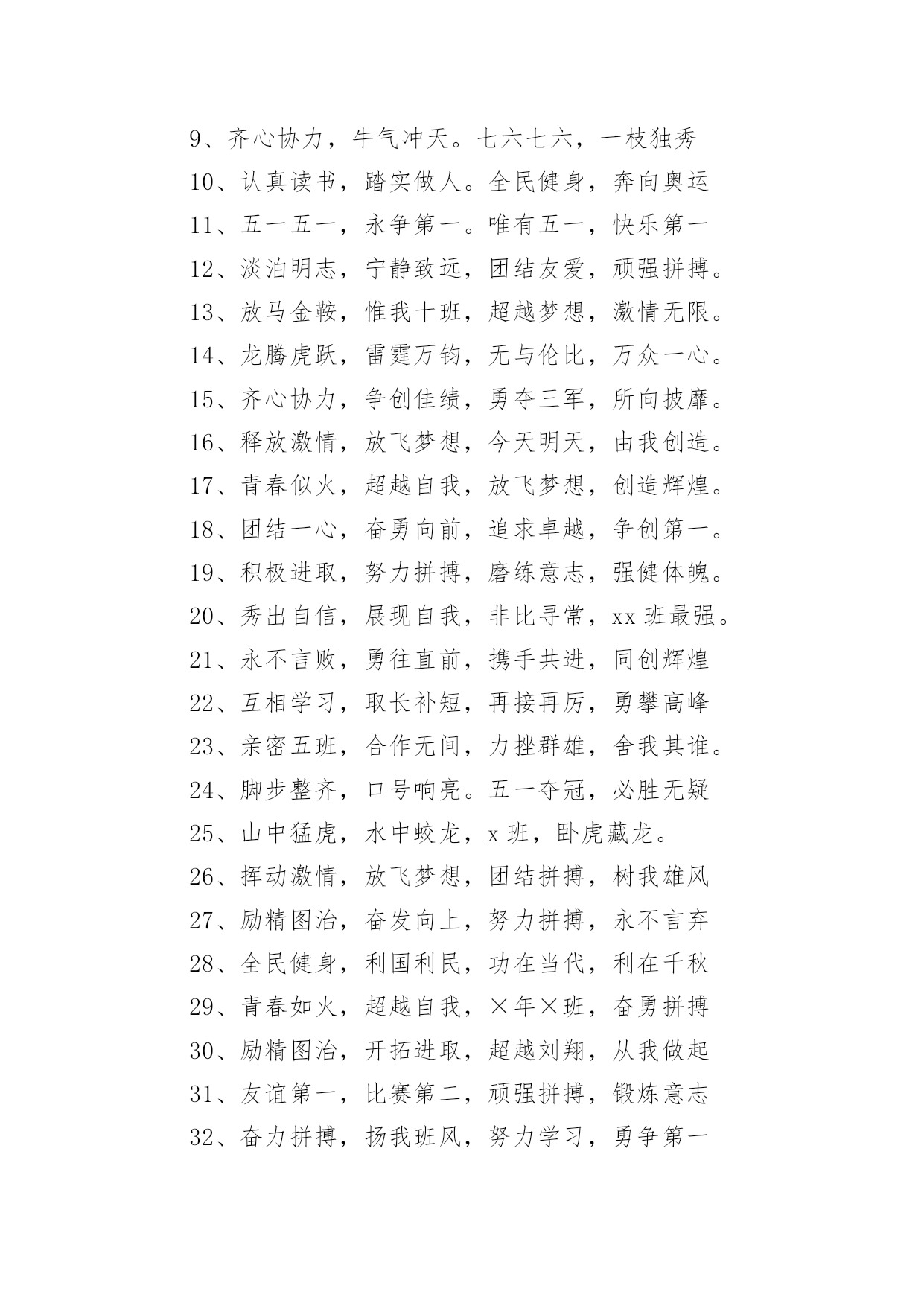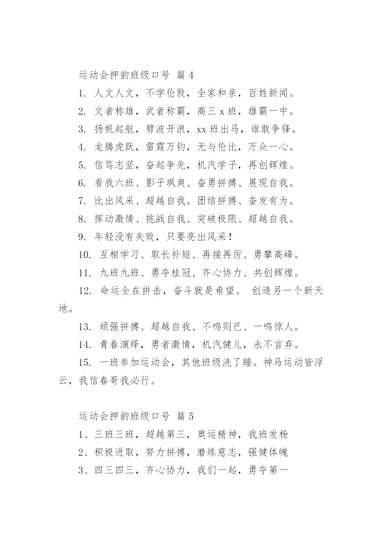 运动会押韵班级口号运动会押韵班级口号(通用15篇)在生活、工作和学习中,大家最不陌生的就是口号了吧,口号一般都用一两句完整的句子来表现一个信息或一个观念,信息单一,容易理解,没有过多的信息需要受众用心记忆和用心理解。究竟什么样的口号才是好的口号呢?以下是小编整理的运动会押韵班级口号,仅供参考,希望能够帮助到大家。运动会押韵班级口号篇11.横扫赛场,唯我称雄。2.龙腾虎跃,雷霆万钧3.秀你自信,展现自我4.非比寻常,xx班最强。5.xx班一出,谁与争锋6.勇夺三军,所向披靡。7.扬长避短,必定成才8.奋勇冲击,永争第一。9.团结拼搏,展现自我10.释放激情,放飞梦想11.力挫群雄,舍我其谁。12.耕耘今天,收获明天13.齐心协力,争创佳绩14.扬帆起航,劈波斩浪15.xx班一出,谁与争锋。16.今天明天,由我创造。17.放飞梦想,创造辉煌。18.刻苦学习,团结一心19.兴我中华,爱我x班20.积极进取,努力拼搏21.奋勇拼搏,披荆斩棘。22.团结一心,奋勇向前23.追求卓越,争创第一。24.莫放松点,莫轻视微25.亲密五班,合作无间26.无与伦比,万众一心。27.英明神武,勇冠江山28.爱我季延,立志成材29.慎而思之,勤而行之30.无与伦比,万众一心。31.龙腾虎跃,雷霆万钧32.天道酬勤,宁静致远33.磨炼意志,奋发冲刺34.奋勇拼搏,永创辉煌。35.磨练意志,强健体魄36.xxxxxx班,卧虎藏龙。37.青春似火,超越自我38.锻炼意志,强身健体。39.山中猛虎,水中蛟龙40.山中猛虎,水中蛟龙41.立凌云志,做栋梁材42.史上最强,xxxxxx班。43.积极进步,奋力拼搏运动会押韵班级口号篇21.同舟共济,风雨同船,拼搏进取,铸就辉煌。2.铁心拼搏,争创一流。赛出水平,赛出风格。3.挑战自我,突破极限,奋发拼搏,勇于开拓4.挑战自我,超越梦想,团结互助,共创佳绩。5.天下抱负,尽怀心中;未来主人,舍我其谁!6.释放激情,放飞梦想,今天明天,由我创造。7.十九出征,横扫乾坤;傲视群雄,惟我独尊。8.十班十班,扬起风帆;拼搏一番,绝不一般。9.十班十班,锐不可当,超越自我,再创辉煌。10.山中猛虎,水中蛟龙,奋勇拼搏,卧虎藏龙。11.三五三五,能文善武;奋勇拼搏,扬我班风。12.三七三七,飞火流星;三七三七,团结如一。13.三六三六,团结奋斗;顽强拼搏,笑到最后。14.三九一出,谁与争锋?横扫赛场,唯我称雄。15.三班雄风,扬威大众,历经风雨,终见彩虹。16.三班三班,超越第三,奥运精神,我班发扬。17.赛出风格,赛出水平,团结拼搏,争创佳绩18.日出东方,唯吾不败,铠甲合体,秒杀同级19.认真读书,踏实做人,全民健身,奔向奥运。20.全民健身,利国利民,功在当代,利在千秋!运动会押韵班级口号篇31.发型到位,气质高贵。我们呐喊,二班万岁。2.这是意志的拼搏。这是速度的挑战。胜利在向你们招手,胜利在向你们呼唤3.把青春合美好都留美丽的母校,为你添彩,为你骄傲。4.和自己比赛。为了明天,超越今天,我们最愉快!5.五班五班,我是五班。再说一遍,我是五班。6.九班九班,法力无边。来我九班,早日成仙。7.发展体育运动,增强人民体质!8.挑战运动极限,演绎健美人生!9.锻炼身体增强体质,报效祖国,造福人类!10.人人关心体育,体育造福人人!11.运动场上,激情飞扬。12.扬帆把舵,奋勇拼搏13.怀学生心,做最强人14.顽强拼搏,赛出风格!15.遵规守纪,团结互敬。运动会押韵班级口号篇41.人文人文,不学伦敦,全家和亲,百姓新闻。2.文者称雄,武者称霸,高三x班,雄霸一中。3.扬帆起航,劈波开浪,xx班出马,谁敢争锋。4.龙腾虎跃,雷霆万钧,无与伦比,万众一心。5.信笃志坚,奋起争先,机汽学子,再创辉煌。6.看我六班、影子飒爽、奋勇拼搏、展现自我。7.比出风采、超越自我。团结拼搏、奋发有为。8.挥动激情、挑战自我、突破极限、超越自我。9.年轻没有失败,只要亮出风采!10.互相学习、取长补短、再接再厉、勇攀高峰。11.九班九班、勇夺桂冠、齐心协力、共创辉煌。12.命运全在拼击,奋斗就是希望。创造另一个新天地。13.顽强拼搏、超越自我、不鸣则已、一鸣惊人。14.青春演绎,勇者激情,机汽健儿,永不言弃。15.一班参加运动会,其他班级洗了睡。神马运动皆浮云,我信春哥我必行。运动会押韵班级口号篇51、三班三班,超越第三,奥运精神,我班发杨2、积极进取,努力拼搏,磨练意志,强健体魄3、四三四三,齐心协力,我们一起,勇夺第一4、团结团结,奋进奋进,四三四三,我们爱你5、团结进取,我们最行,奋勇拼搏,我们最强6、团结一心,奋勇向前,追求卓越,争创第一7、龙腾虎跃,雷霆万钧,无与伦比,万众一心8、三班雄风,扬威大众,历经风雨,终见彩虹9、友谊第一,比