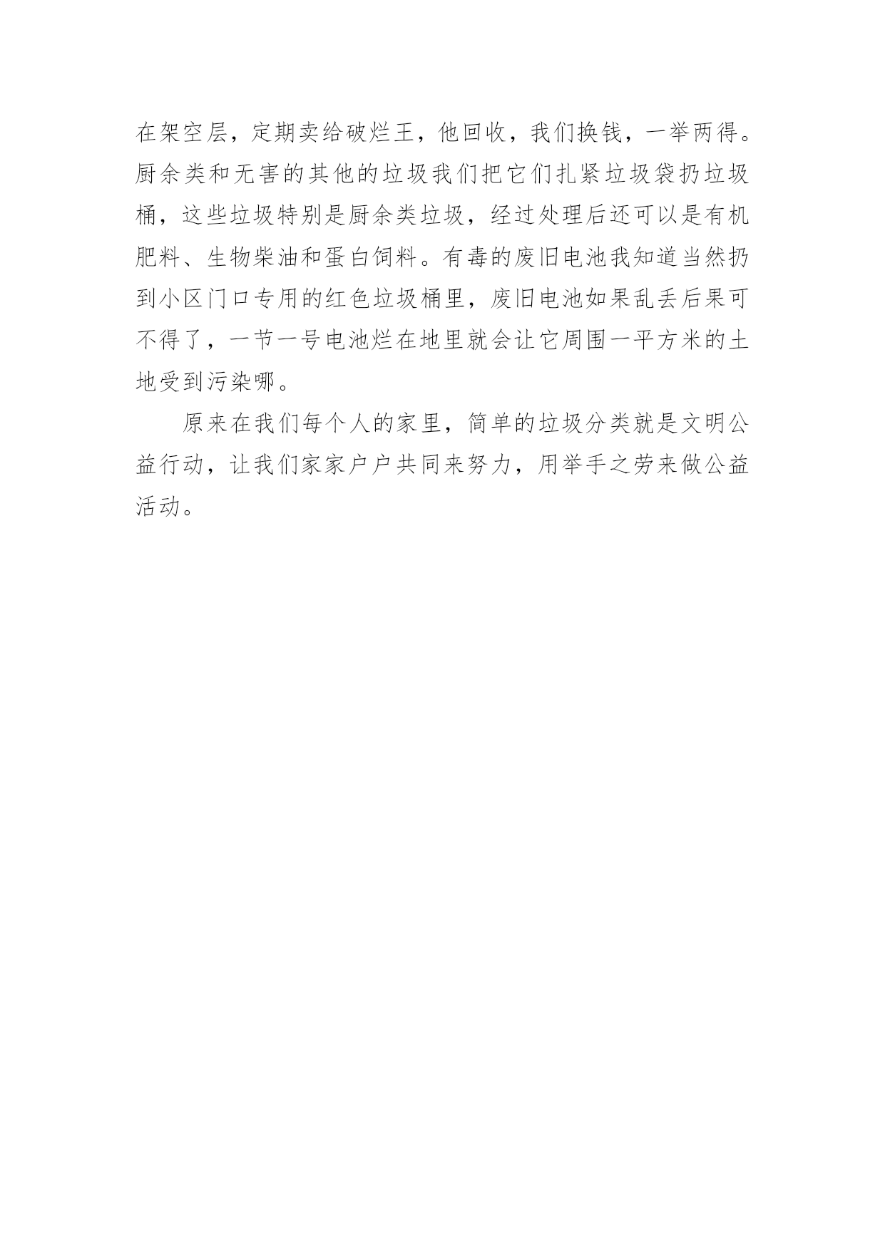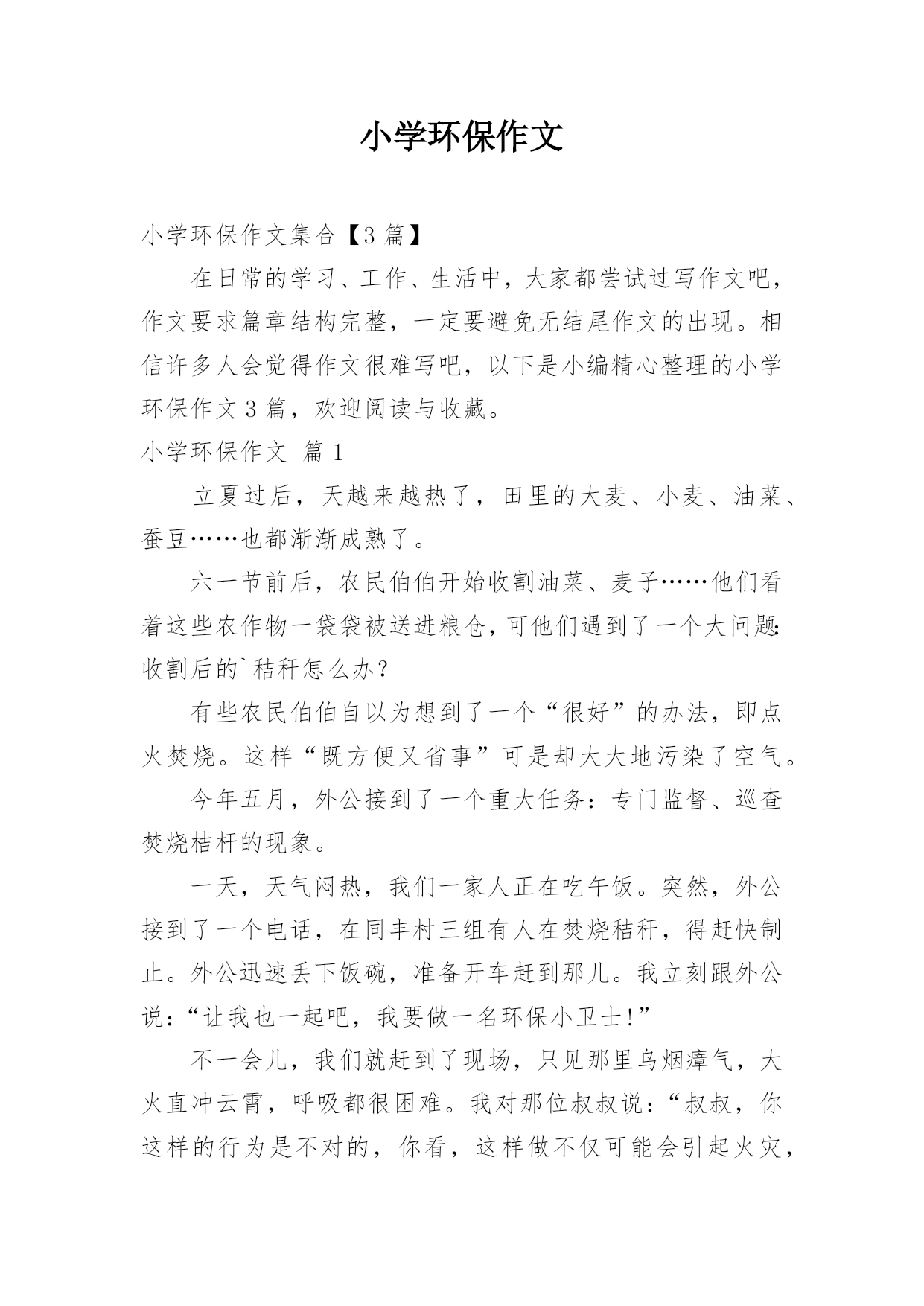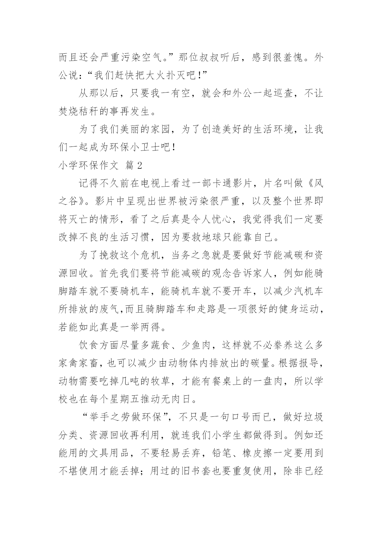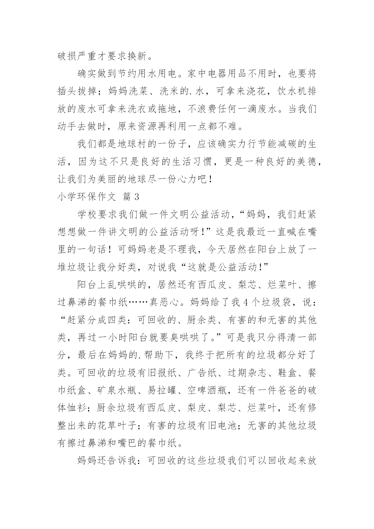 小学环保作文小学环保作文集合【3篇】在日常的学习、工作、生活中,大家都尝试过写作文吧,作文要求篇章结构完整,一定要避免无结尾作文的出现。相信许多人会觉得作文很难写吧,以下是小编精心整理的小学环保作文3篇,欢迎阅读与收藏。小学环保作文篇1立夏过后,天越来越热了,田里的大麦、小麦、油菜、蚕豆……也都渐渐成熟了。六一节前后,农民伯伯开始收割油菜、麦子……他们看着这些农作物一袋袋被送进粮仓,可他们遇到了一个大问题:收割后的`秸秆怎么办?有些农民伯伯自以为想到了一个“很好”的办法,即点火焚烧。这样“既方便又省事”可是却大大地污染了空气。今年五月,外公接到了一个重大任务:专门监督、巡查焚烧桔杆的现象。一天,天气闷热,我们一家人正在吃午饭。突然,外公接到了一个电话,在同丰村三组有人在焚烧秸秆,得赶快制止。外公迅速丢下饭碗,准备开车赶到那儿。我立刻跟外公说:“让我也一起吧,我要做一名环保小卫士!”不一会儿,我们就赶到了现场,只见那里乌烟瘴气,大火直冲云霄,呼吸都很困难。我对那位叔叔说:“叔叔,你这样的行为是不对的,你看,这样做不仅可能会引起火灾,而且还会严重污染空气。”那位叔叔听后,感到很羞愧。外公说:“我们赶快把大火扑灭吧!”从那以后,只要我一有空,就会和外公一起巡查,不让焚烧秸秆的事再发生。为了我们美丽的家园,为了创造美好的生活环境,让我们一起成为环保小卫士吧!小学环保作文篇2记得不久前在电视上看过一部卡通影片,片名叫做《风之谷》。影片中呈现出世界被污染很严重,以及整个世界即将灭亡的情形,看了之后真是令人忧心,我觉得我们一定要改掉不良的生活习惯,因为要救地球只能靠自己。为了挽救这个危机,当务之急就是要做好节能减碳和资源回收。首先我们要将节能减碳的观念告诉家人,例如能骑脚踏车就不要骑机车,能骑机车就不要开车,以减少汽机车所排放的废气,而且骑脚踏车和走路是一项很好的健身运动,若能如此真是一举两得。饮食方面尽量多蔬食、少鱼肉,这样就不必豢养这么多家禽家畜,也可以减少由动物体内排放出的碳量。根据报导,动物需要吃掉几吨的牧草,才能有餐桌上的一盘肉,所以学校也在每个星期五推动无肉日。“举手之劳做环保”,不只是一句口号而已,做好垃圾分类、资源回收再利用,就连我们小学生都做得到。例如还能用的文具用品,不要轻易丢弃,铅笔、橡皮擦一定要用到不堪使用才能丢掉;用过的旧书套也要重复使用,除非已经破损严重才要求换新。确实做到节约用水用电。家中电器用品不用时,也要将插头拔掉;妈妈洗菜、洗米的.水,可拿来浇花,饮水机排放的废水可拿来洗衣或拖地,不浪费任何一滴废水。当我们动手去做时,原来资源再利用一点都不难。我们都是地球村的一份子,应该确实力行节能减碳的生活,因为这不只是良好的生活习惯,更是一种良好的美德,让我们为美丽的地球尽一份心力吧!小学环保作文篇3学校要求我们做一件文明公益活动,“妈妈,我们赶紧想想做一件讲文明的公益活动呀!”这是我最近一直喊在嘴里的一句话!可妈妈老是不理我,今天居然在阳台上放了一堆垃圾让我分好类,对说我“这就是公益活动!”阳台上乱哄哄的,居然还有西瓜皮、梨芯、烂菜叶、擦过鼻涕的餐巾纸……真恶心。妈妈给了我4个垃圾袋,说:“赶紧分成四类:可回收的、厨余类、有害的和无害的其他类,再过一小时阳台就要臭哄哄了。”可是我只分得清一部分,最后在妈妈的.帮助下,我终于把所有的垃圾都分好了类。可回收的垃圾有旧报纸、广告纸、过期杂志、鞋盒、餐巾纸盒、矿泉水瓶、易拉罐、空啤酒瓶,还有一件爸爸的破体恤衫;厨余垃圾有西瓜皮、梨皮、梨芯、烂菜叶,还有修整出来的花草叶子;有害的垃圾有旧电池;无害的其他垃圾有擦过鼻涕和嘴巴的餐巾纸。妈妈还告诉我:可回收的这些垃圾我们可以回收起来放在架空层,定期卖给破烂王,他回收,我们换钱,一举两得。厨余类和无害的其他的垃圾我们把它们扎紧垃圾袋扔垃圾桶,这些垃圾特别是厨余类垃圾,经过处理后还可以是有机肥料、生物柴油和蛋白饲料。有毒的废旧电池我知道当然扔到小区门口专用的红色垃圾桶里,废旧电池如果乱丢后果可不得了,一节一号电池烂在地里就会让它周围一平方米的土地受到污染哪。原来在我们每个人的家里,简单的垃圾分类就是文明公益行动,让我们家家户户共同来努力,用举手之劳来做公益活动。