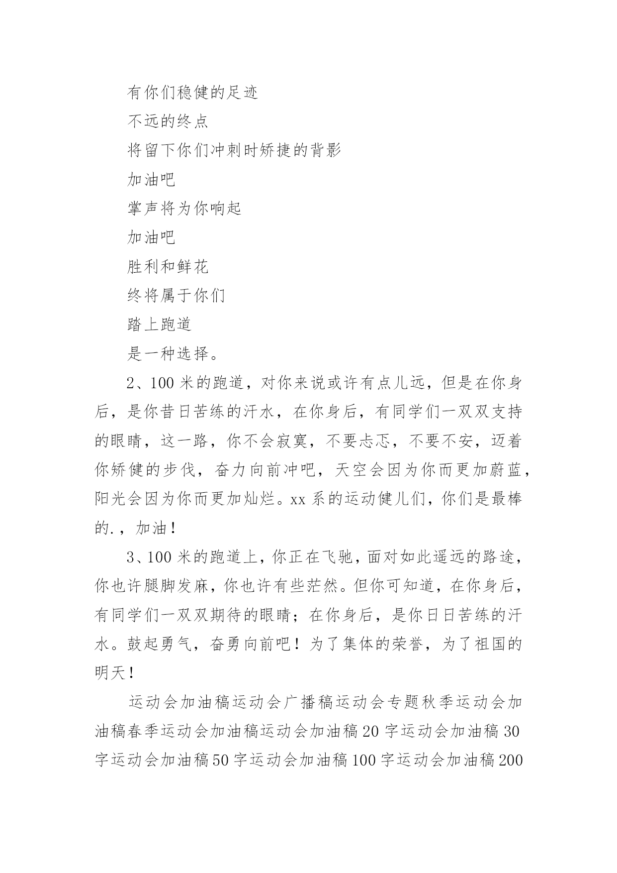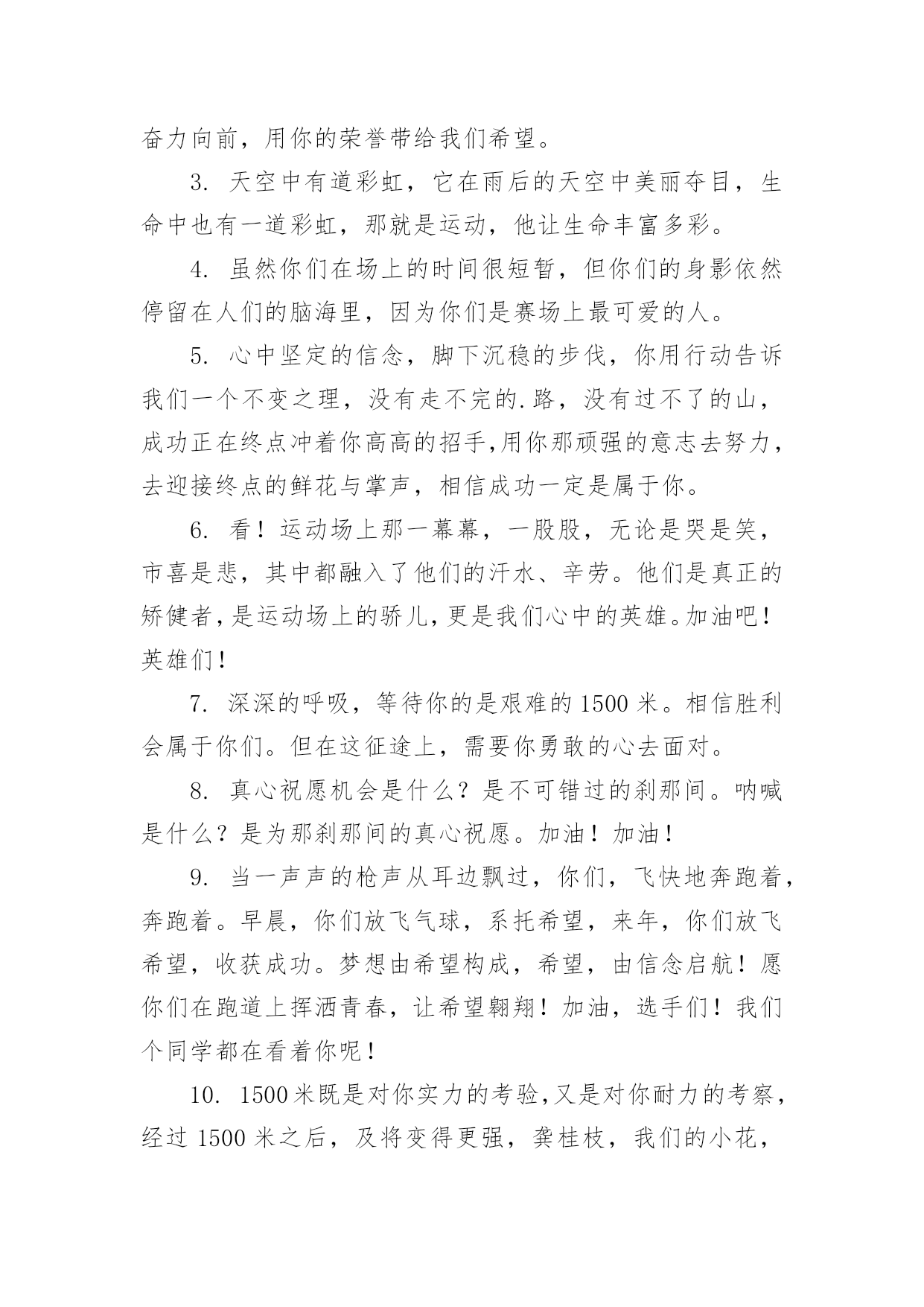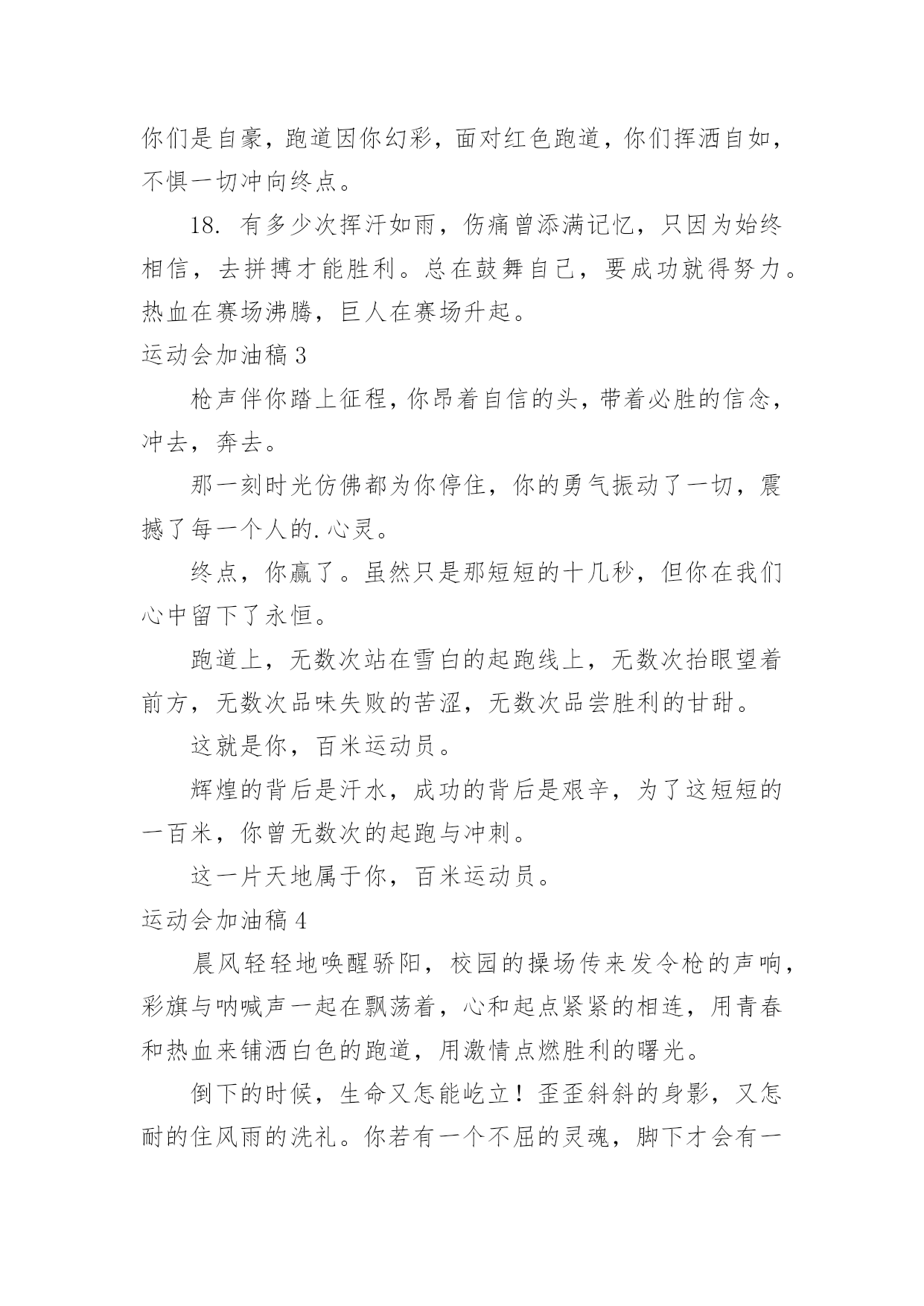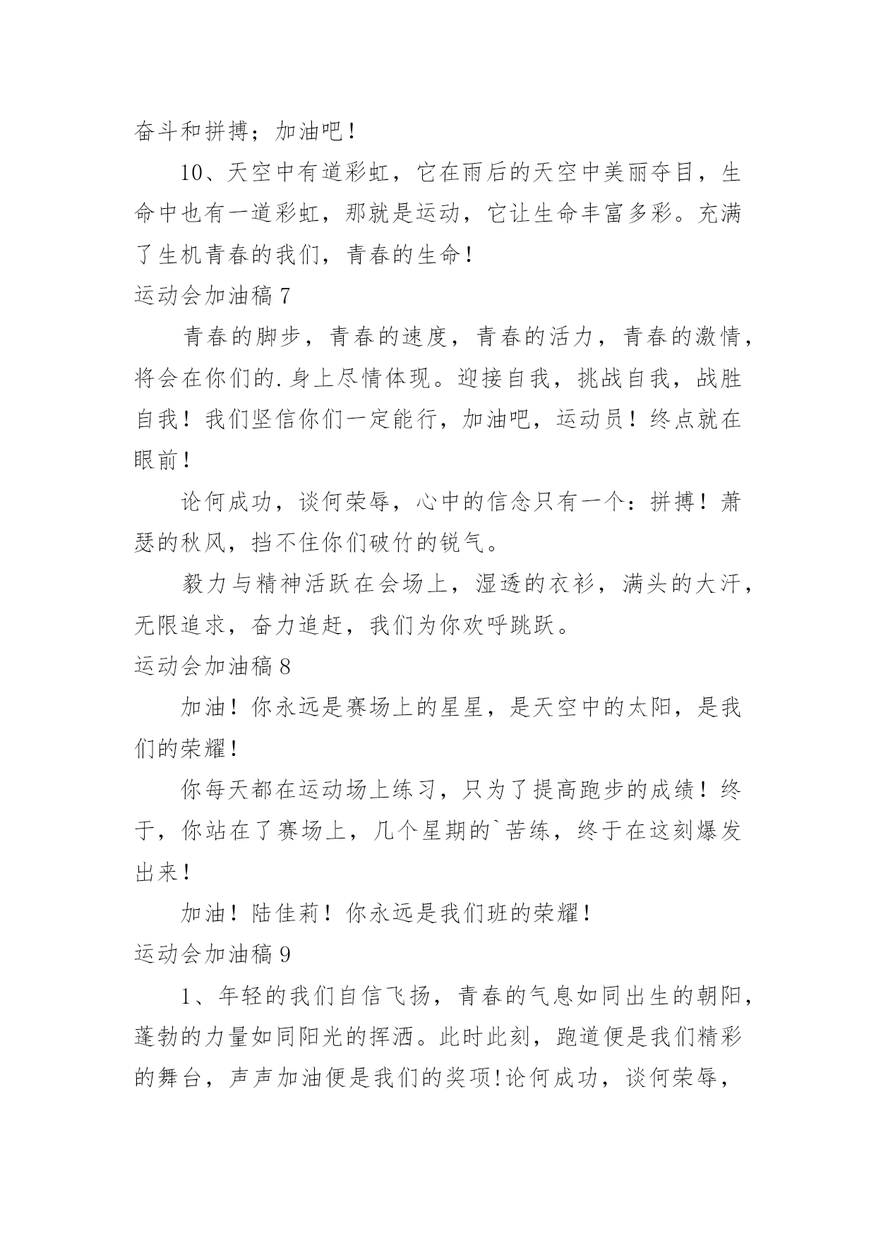 运动会加油稿运动会加油稿【必备】在日新月异的现代社会中,需要使用加油稿的场合越来越多,加油稿可以给予对方克服困难的勇气和信心。那要怎么写好加油稿呢?以下是小编为大家整理的运动会加油稿,欢迎大家借鉴与参考,希望对大家有所帮助。运动会加油稿1看到你那获胜后的笑容,谁知是用多少泪水与汗水浇灌成的。付出总有收获,上帝始终眷恋那些拼搏的人。失败时不要怨天尤人,只有拼搏才能换来成功。在竞争激烈的赛场上,只有爱拼才会赢;在艰苦的高中学习中,只有爱拼才会赢,在绚丽多彩的人生舞台上,只有爱拼才会赢。亲爱的健儿们,你们要充满自信。比赛中没有挡风的墙,没有遮风的'伞,也没有撑船的帆,更没有拉船的纤。事在人为,人定胜天。愿你们养精蓄锐,对充满爱意的世界说:我自信,我拼搏,我会赢。运动会加油稿21.运动场上的你们,是胜利的标志,运动场上的你们,是青春的赞叹。去吧!去迎接那伟大的挑战,去吧!去做一名追风的少年。2.看,终点就在眼前,听,同学为你呼喊。鼓起勇气奋力向前,用你的荣誉带给我们希望。3.天空中有道彩虹,它在雨后的天空中美丽夺目,生命中也有一道彩虹,那就是运动,他让生命丰富多彩。4.虽然你们在场上的时间很短暂,但你们的身影依然停留在人们的脑海里,因为你们是赛场上最可爱的人。5.心中坚定的信念,脚下沉稳的步伐,你用行动告诉我们一个不变之理,没有走不完的.路,没有过不了的山,成功正在终点冲着你高高的招手,用你那顽强的意志去努力,去迎接终点的鲜花与掌声,相信成功一定是属于你。6.看!运动场上那一幕幕,一股股,无论是哭是笑,市喜是悲,其中都融入了他们的汗水、辛劳。他们是真正的矫健者,是运动场上的骄儿,更是我们心中的英雄。加油吧!英雄们!7.深深的呼吸,等待你的是艰难的1500米。相信胜利会属于你们。但在这征途上,需要你勇敢的心去面对。8.真心祝愿机会是什么?是不可错过的刹那间。呐喊是什么?是为那刹那间的真心祝愿。加油!加油!9.当一声声的枪声从耳边飘过,你们,飞快地奔跑着,奔跑着。早晨,你们放飞气球,系托希望,来年,你们放飞希望,收获成功。梦想由希望构成,希望,由信念启航!愿你们在跑道上挥洒青春,让希望翱翔!加油,选手们!我们个同学都在看着你呢!10.1500米既是对你实力的考验,又是对你耐力的考察,经过1500米之后,及将变得更强,龚桂枝,我们的小花,我们的开心过,向前冲吧!1500米虽漫长。但我们的情谊更长,小花加油!11.你在红色的跑道上撒下了努力的汗水,献进了你的风采,固然你没有获得第一,但是有那默默的奉献就已经足够了,希望在下一个比赛能取得好成绩。我们会为你加油的。12.晨风轻轻地唤醒骄阳,校园的操场传来发令枪的声响,彩旗与呐喊声一起在飘荡着,心和起点紧紧的相连,用青春和热血来铺洒白色的跑道,用激情点燃胜利的曙光。13.秋风羽,天气淡淡的转凉。然而这人的秋在今天更加迷人,不是因为它的秋高气爽,也不是因为它的明媚阳光,是因为今天的人儿倍加精神气爽。14.枪响了,你们开始了并不长的征程,笔直的跑道上有你们稳健的足迹,不远的终点将留下你们冲刺时矫捷的背影,加油吧,掌声将为你响起,加油吧,胜利和鲜花终将属于你们。15.运动场上有你们的飒爽英姿,运动场上有你们拼搏的身影,面对漫漫的征程,你没有畏惧和退缩,任汗水打湿脊背,任疲惫爬满全身,依然分离追赶,只有一个目标,只有一个信念,为班级赢得荣誉,拼搏吧,我为你们呐喊,加油!16.看!那一面面迎风飘舞的彩旗,是一朵朵盛开的鲜花;听!那一阵阵惊天动地的欢呼,是回响在耳边胜利的风声。17.场上英姿显自豪,脚下步伐在飞奔。你们是骄傲。你们是自豪,跑道因你幻彩,面对红色跑道,你们挥洒自如,不惧一切冲向终点。18.有多少次挥汗如雨,伤痛曾添满记忆,只因为始终相信,去拼搏才能胜利。总在鼓舞自己,要成功就得努力。热血在赛场沸腾,巨人在赛场升起。运动会加油稿3枪声伴你踏上征程,你昂着自信的头,带着必胜的信念,冲去,奔去。那一刻时光仿佛都为你停住,你的勇气振动了一切,震撼了每一个人的.心灵。终点,你赢了。虽然只是那短短的十几秒,但你在我们心中留下了永恒。跑道上,无数次站在雪白的起跑线上,无数次抬眼望着前方,无数次品味失败的苦涩,无数次品尝胜利的甘甜。这就是你,百米运动员。辉煌的背后是汗水,成功的背后是艰辛,为了这短短的一百米,你曾无数次的起跑与冲刺。这一片天地属于你,百米运动员。运动会加油稿4晨风轻轻地唤醒骄阳,校园的操场传来发令枪的声响,彩旗与呐喊声一起在飘荡着,心和起点紧紧的相连,用青春和热血来铺洒白色的跑道,用激情点燃胜利的曙光。倒下的时候,生命又怎能屹立!歪歪斜斜的身影,又怎耐的住风雨的洗礼。你若有一个不屈的灵魂,脚下才会有一方坚实的土地。昨日的失败已经过去,胜利不仅仅是一个完美的.话题。泰戈尔在诗中说,天空没有翅膀
