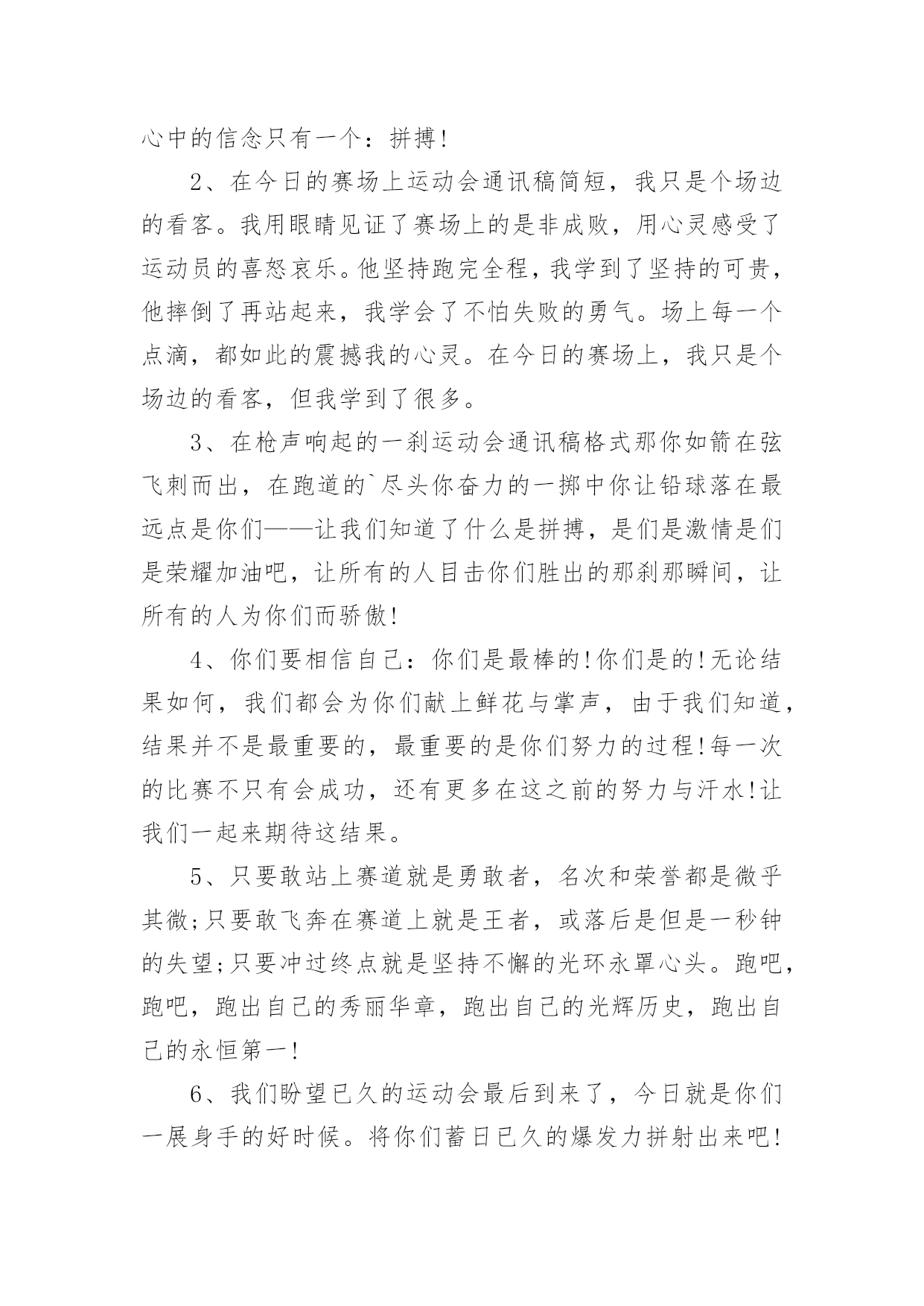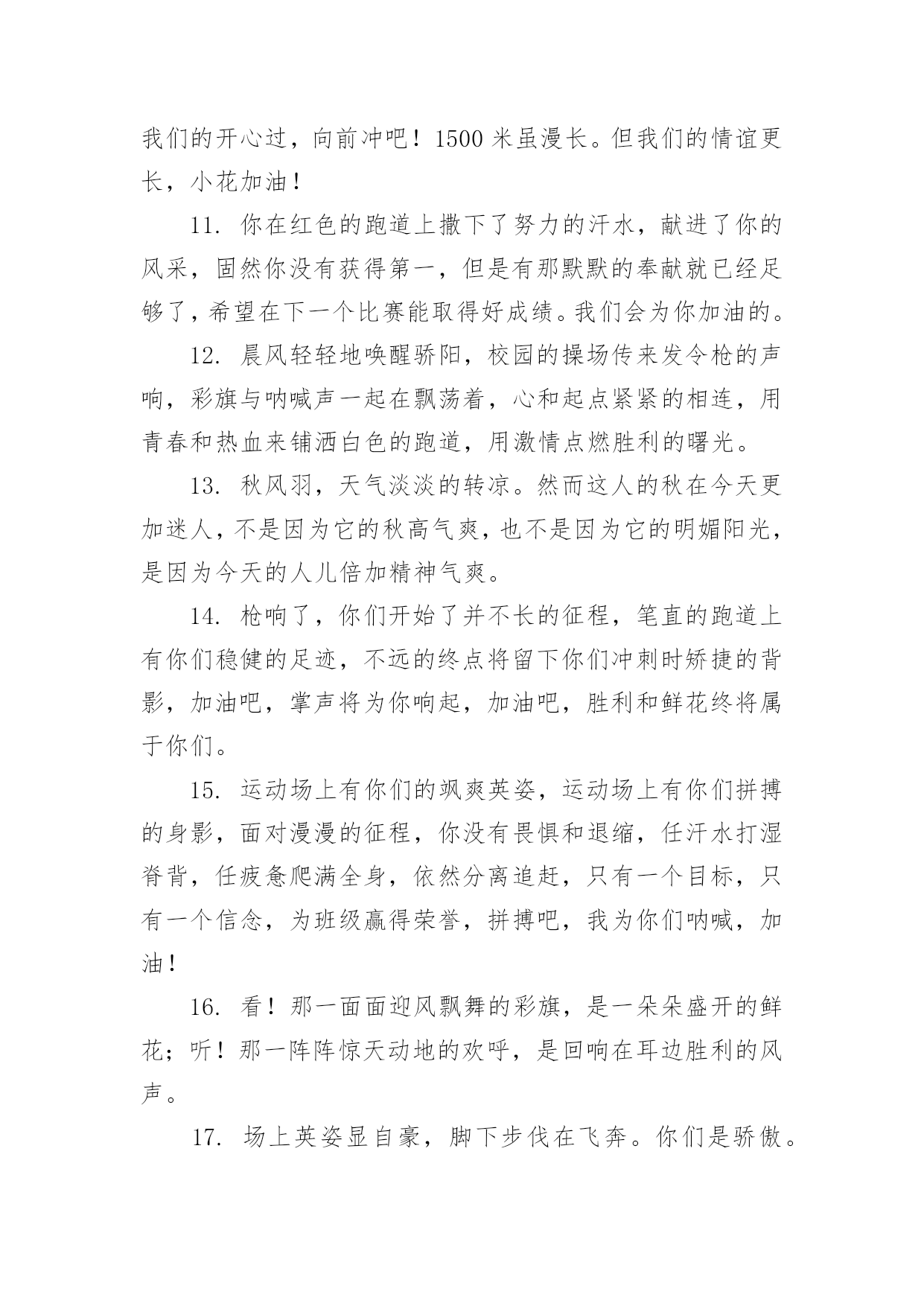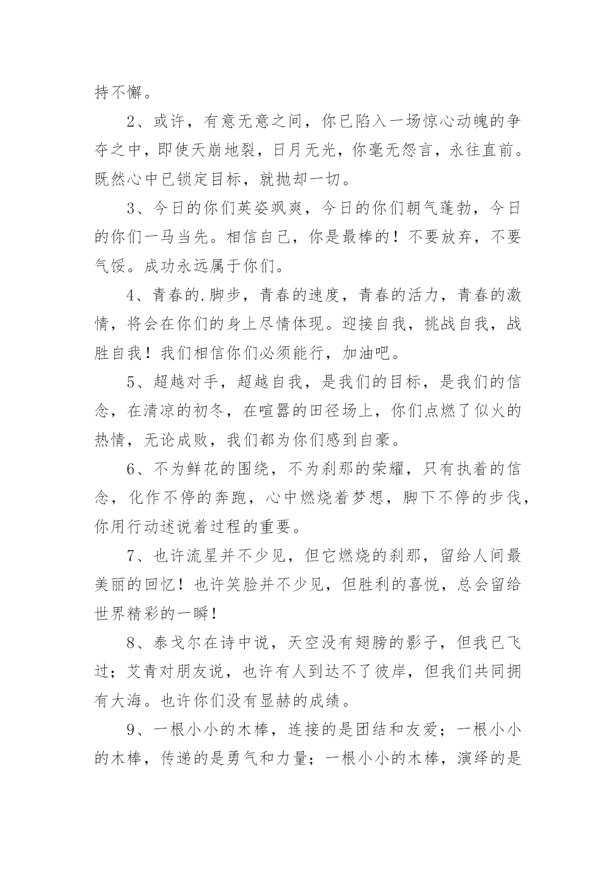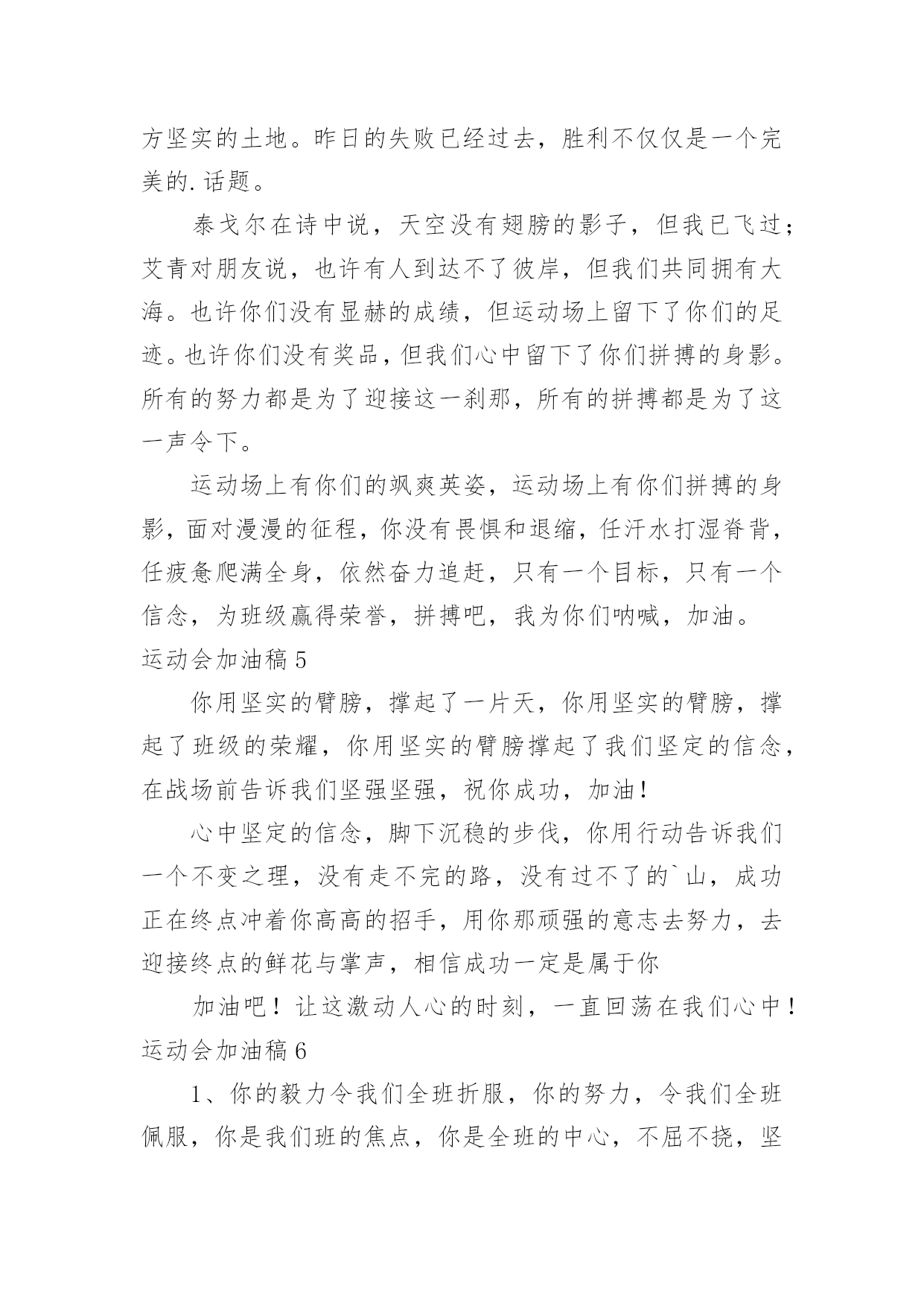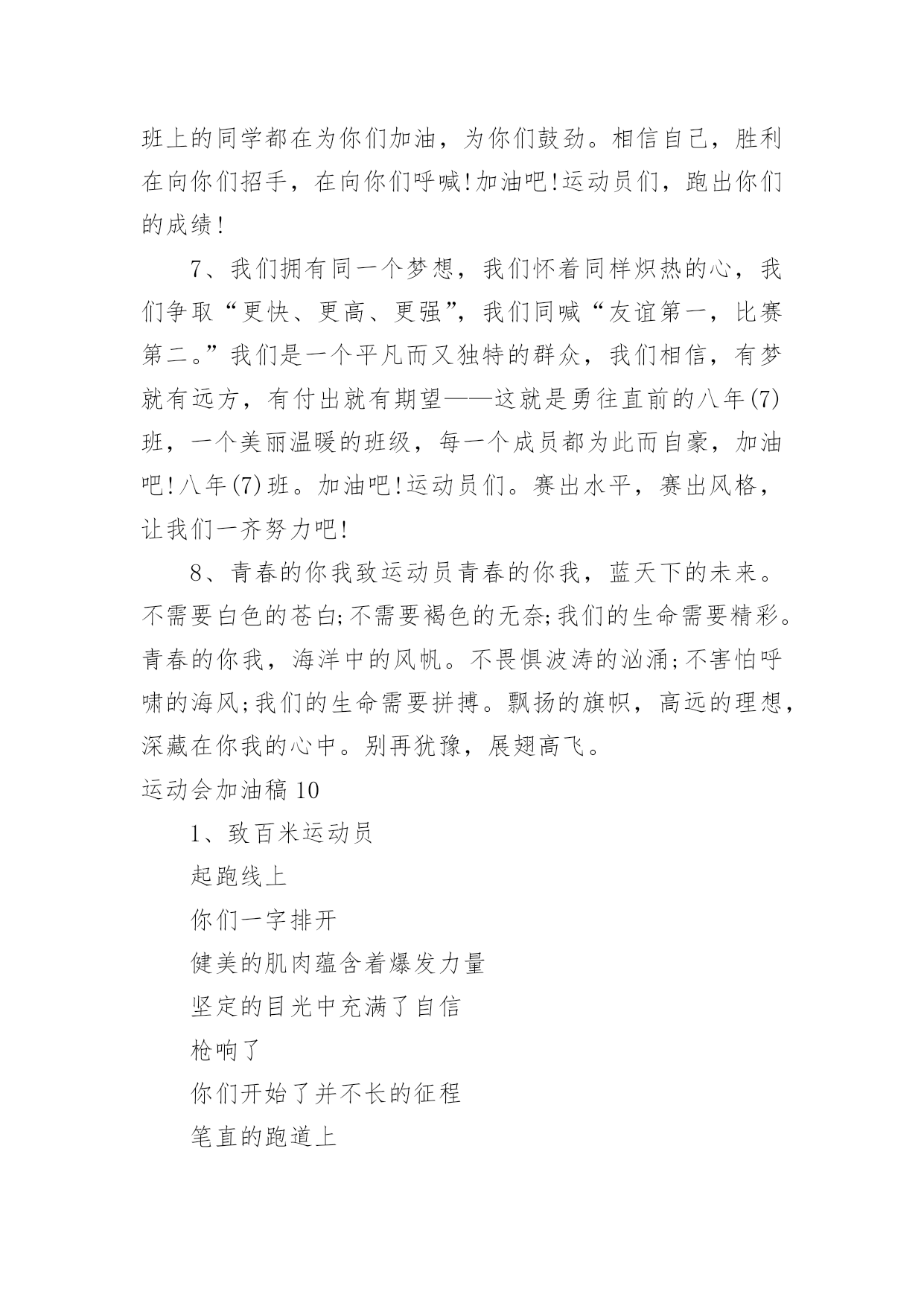 运动会加油稿运动会加油稿【必备】在日新月异的现代社会中,需要使用加油稿的场合越来越多,加油稿可以给予对方克服困难的勇气和信心。那要怎么写好加油稿呢?以下是小编为大家整理的运动会加油稿,欢迎大家借鉴与参考,希望对大家有所帮助。运动会加油稿1看到你那获胜后的笑容,谁知是用多少泪水与汗水浇灌成的。付出总有收获,上帝始终眷恋那些拼搏的人。失败时不要怨天尤人,只有拼搏才能换来成功。在竞争激烈的赛场上,只有爱拼才会赢;在艰苦的高中学习中,只有爱拼才会赢,在绚丽多彩的人生舞台上,只有爱拼才会赢。亲爱的健儿们,你们要充满自信。比赛中没有挡风的墙,没有遮风的'伞,也没有撑船的帆,更没有拉船的纤。事在人为,人定胜天。愿你们养精蓄锐,对充满爱意的世界说:我自信,我拼搏,我会赢。运动会加油稿21.运动场上的你们,是胜利的标志,运动场上的你们,是青春的赞叹。去吧!去迎接那伟大的挑战,去吧!去做一名追风的少年。2.看,终点就在眼前,听,同学为你呼喊。鼓起勇气奋力向前,用你的荣誉带给我们希望。3.天空中有道彩虹,它在雨后的天空中美丽夺目,生命中也有一道彩虹,那就是运动,他让生命丰富多彩。4.虽然你们在场上的时间很短暂,但你们的身影依然停留在人们的脑海里,因为你们是赛场上最可爱的人。5.心中坚定的信念,脚下沉稳的步伐,你用行动告诉我们一个不变之理,没有走不完的.路,没有过不了的山,成功正在终点冲着你高高的招手,用你那顽强的意志去努力,去迎接终点的鲜花与掌声,相信成功一定是属于你。6.看!运动场上那一幕幕,一股股,无论是哭是笑,市喜是悲,其中都融入了他们的汗水、辛劳。他们是真正的矫健者,是运动场上的骄儿,更是我们心中的英雄。加油吧!英雄们!7.深深的呼吸,等待你的是艰难的1500米。相信胜利会属于你们。但在这征途上,需要你勇敢的心去面对。8.真心祝愿机会是什么?是不可错过的刹那间。呐喊是什么?是为那刹那间的真心祝愿。加油!加油!9.当一声声的枪声从耳边飘过,你们,飞快地奔跑着,奔跑着。早晨,你们放飞气球,系托希望,来年,你们放飞希望,收获成功。梦想由希望构成,希望,由信念启航!愿你们在跑道上挥洒青春,让希望翱翔!加油,选手们!我们个同学都在看着你呢!10.1500米既是对你实力的考验,又是对你耐力的考察,经过1500米之后,及将变得更强,龚桂枝,我们的小花,我们的开心过,向前冲吧!1500米虽漫长。但我们的情谊更长,小花加油!11.你在红色的跑道上撒下了努力的汗水,献进了你的风采,固然你没有获得第一,但是有那默默的奉献就已经足够了,希望在下一个比赛能取得好成绩。我们会为你加油的。12.晨风轻轻地唤醒骄阳,校园的操场传来发令枪的声响,彩旗与呐喊声一起在飘荡着,心和起点紧紧的相连,用青春和热血来铺洒白色的跑道,用激情点燃胜利的曙光。13.秋风羽,天气淡淡的转凉。然而这人的秋在今天更加迷人,不是因为它的秋高气爽,也不是因为它的明媚阳光,是因为今天的人儿倍加精神气爽。14.枪响了,你们开始了并不长的征程,笔直的跑道上有你们稳健的足迹,不远的终点将留下你们冲刺时矫捷的背影,加油吧,掌声将为你响起,加油吧,胜利和鲜花终将属于你们。15.运动场上有你们的飒爽英姿,运动场上有你们拼搏的身影,面对漫漫的征程,你没有畏惧和退缩,任汗水打湿脊背,任疲惫爬满全身,依然分离追赶,只有一个目标,只有一个信念,为班级赢得荣誉,拼搏吧,我为你们呐喊,加油!16.看!那一面面迎风飘舞的彩旗,是一朵朵盛开的鲜花;听!那一阵阵惊天动地的欢呼,是回响在耳边胜利的风声。17.场上英姿显自豪,脚下步伐在飞奔。你们是骄傲。你们是自豪,跑道因你幻彩,面对红色跑道,你们挥洒自如,不惧一切冲向终点。18.有多少次挥汗如雨,伤痛曾添满记忆,只因为始终相信,去拼搏才能胜利。总在鼓舞自己,要成功就得努力。热血在赛场沸腾,巨人在赛场升起。运动会加油稿3枪声伴你踏上征程,你昂着自信的头,带着必胜的信念,冲去,奔去。那一刻时光仿佛都为你停住,你的勇气振动了一切,震撼了每一个人的.心灵。终点,你赢了。虽然只是那短短的十几秒,但你在我们心中留下了永恒。跑道上,无数次站在雪白的起跑线上,无数次抬眼望着前方,无数次品味失败的苦涩,无数次品尝胜利的甘甜。这就是你,百米运动员。辉煌的背后是汗水,成功的背后是艰辛,为了这短短的一百米,你曾无数次的起跑与冲刺。这一片天地属于你,百米运动员。运动会加油稿4晨风轻轻地唤醒骄阳,校园的操场传来发令枪的声响,彩旗与呐喊声一起在飘荡着,心和起点紧紧的相连,用青春和热血来铺洒白色的跑道,用激情点燃胜利的曙光。倒下的时候,生命又怎能屹立!歪歪斜斜的身影,又怎耐的住风雨的洗礼。你若有一个不屈的灵魂,脚下才会有一方坚实的土地。昨日的失败已经过去,胜利不仅仅是一个完美的.话题。泰戈尔在诗中说,天空没有翅膀