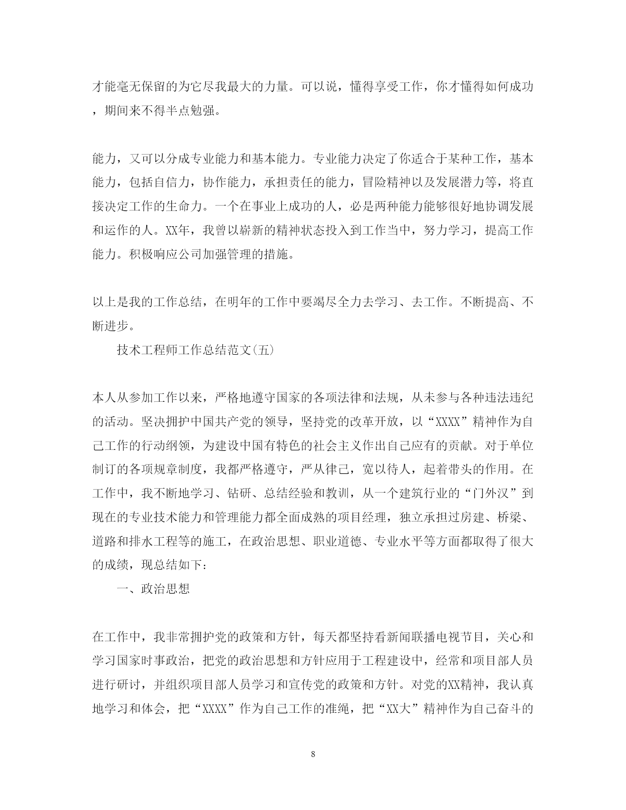 此资料由网络收集而来,如有侵权请告知上传者立即删除。资料共分享,我们负责传递知识。PAGEPAGE10技术工程师个人工作总结技术是在劳动生产方面的经验、知识和技巧,也泛指其他操作方面的技巧。以下是范文网小编为大家精心整理的技术工程师个人工作总结,欢迎大家阅读,供您参考。技术工程师个人工作总结(一)自xx年6月来到xx项目部参加工作,至今已一年有余。这一年来,一直在项目部担任技术员一职,先后参与建设了xx工程、xx大修改造工程、xx工程,通过这几个工程现场实践工作的锻炼,得益于项目部领导的关心培养和同事们的热心帮助、谆谆教导,我已逐步成长为一名合格的技术员。作为一名刚参加工作的技术员,我将工作定位为协助好技术负责人的工作和不断的自我学习充实,在参与建设的工程中,除了协助技术负责人编制项目质量计划、施工方案、作业指导书、技术交底,并负责进场原材料的取样送检、工程技术资料的编制,和施工员一起进行现场质量检查,以及施工测量工作。在工程施工过程中,我一直以积极的心态认真地对待自己的工作,在从事的各项工作中,都能尽职尽责,以求完满的完成工作任务。“不要急于出成绩,埋下头来干工作”,是我常拿来提醒自己的警言,提醒自己不要好高骛远,而要脚踏实地,多干实事,在实践中检验自己的知识并获得施工现场的经验累积。一年来的现场工作更使我深深明白,在学校学习的东西和自己翻看规范、规程死记硬背的知识远不如实际经历过的记得牢固,而且好多学问更是书本里学不来的,完全是凭自己的经验。在这一年来的时间里,我一直在多看,多学,碰到施工现场的做法与书本里不一样的地方及时的向专业工长和施工班组长请教,尽管很多时候得不到理论上的解释,但是却是很好的经验。刚工作时觉得技术资料工作、测量工作,质量检查工作都比较简单,而实际上却学问大着,一直觉得自己会,而实际操作起来才发觉自己的不足,时常事倍功半,缺乏效率。现在实践操作多了,方法掌握了,经验有了,才得心应手起来。比如说测量,重要的是要抓好其关键工作,个人认为,测量关键性的工作一是选择施测方案,二是一定要进行复测以避免人为错误。一年来的从事工程施工工作,在不断的取得进步,自己的专业知识得到了长进和加深,工作能力,包括组织协作能力、管理能力和应变能力都得到了很大的提高,更重要的是获得了宝贵的工作经验的积累。一年来的工作表现也得到了项目部领导和同事们的认可,在今后的工作中,我将以百倍的热情迎接新的挑战,在学习中进步和成熟起来,为项目部的发展贡献自己的力量。技术工程师个人工作总结(二)时光匆匆,转眼之间已经毕业三年了。在xx公司工作也已经有二年多的时间了,由于工作的需求和提高自己的技术水平,我进入xx配电设备有限公司技术部学习和工作。在xx公司工作至今两年多,已经成长为一名合格的电气工程师。刚进公司时,必须去电气车间实习。期间主要是熟悉产品,为以后的设计打基础。实习结束后,我正式进入技术部工作。刚开始时,主要负责设计小箱、pgl、ggd、一些比较标准的xgn36(15)-12等一些小订单,通常数量在几台,或者产值不超过10万的订单。这段时间跟着总工和老工程师学习,晚上培训专业技能和基础知识,然后在订单上检验学习成果。这段时间的学习和工作给我留下了深刻的印象和影响。一些比较标准的工程订单,如星三角降压启动、全压启动、自耦降压启动、电机正反转等,这些都是在学校学习过的,但当时印象不深,做了这些电动机控制的项目后,将以前的理论和实际结合在一起,能够举一反三,设计出有自己风格的控制产品。比如温度控制箱、瓦斯控制箱、路灯控制箱等等。这类产品主要遇到的问题就是元器件的布置摆放,直接影响到箱体或柜体的外型尺寸,以及电缆走向。一旦不细心,用户在安装、使用过程中就会遇到大量的问题。做这类产品时,必须要细心,多去现场和客户沟通,了解客户意图后,最好能设计出大概的布置图和外型图给客户确认。随着经验的增长,开始做比较大套的gck、通常数量在几十台或上百台,产值通常超过五十万元,甚至百万元。主要功能单元有:计量柜、进线柜、电容补偿柜、馈电柜、市发电转换柜、联络柜。计量柜基本每两年广东电网xx供电局会提出新的要求,通常提出新要求的一个月内,出现问题的情况是最多的。比如以前要求315kva及以上的变压器要求装设两组电流互感器、一个有功表、一个电子表,采用低压计费的方式。而现在为一组电流互感器、一个有功表,必须装10kv高压计量柜,采用高压计费方式。一旦不注意这个问题,出货到现场通不了电,通不过验收,现场改造工程量很大,而且会给公司带来负面影响。gck常用的馈电单元为抽屉柜,是国内较为先进的一种柜型。通常需要注意的是负载中是否有“非消防必保负荷”,这样的负荷在火灾时必须要停电,防止事故扩大。通常在塑壳断路器加装一个dc