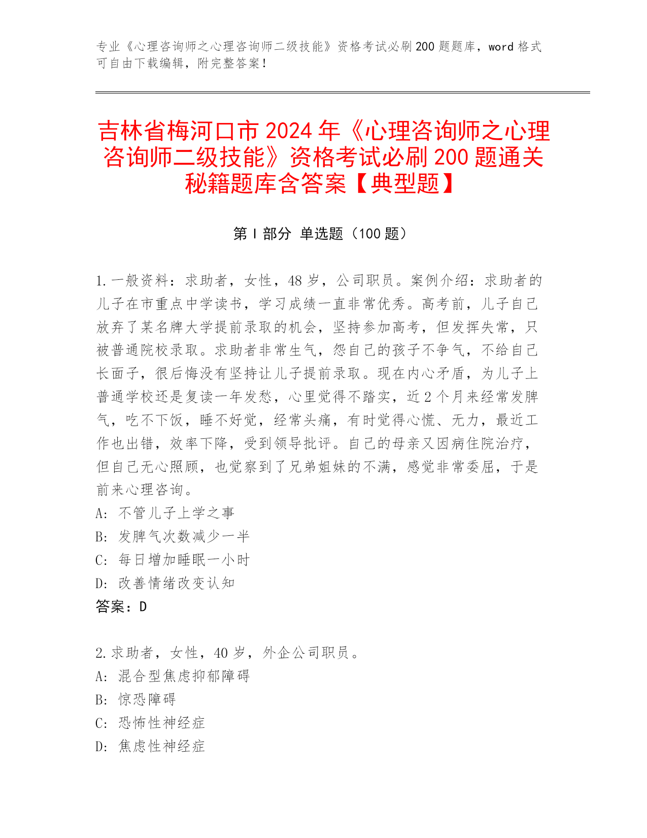 吉林省梅河口市2024年《心理咨询师之心理咨询师二级技能》资格考试必刷200题通关秘籍题库含答案【典型题】