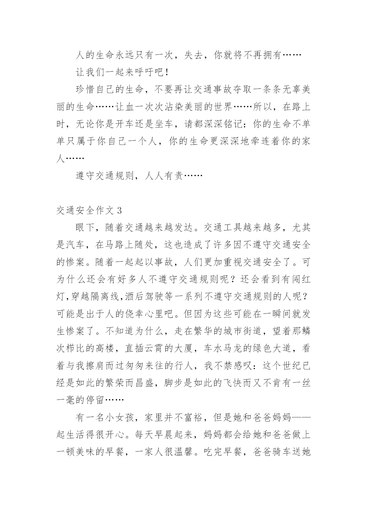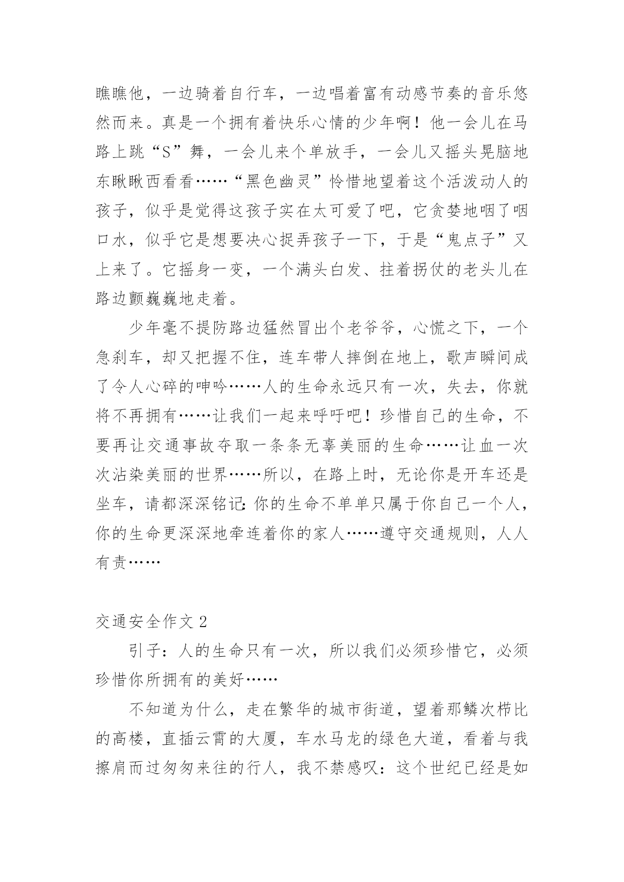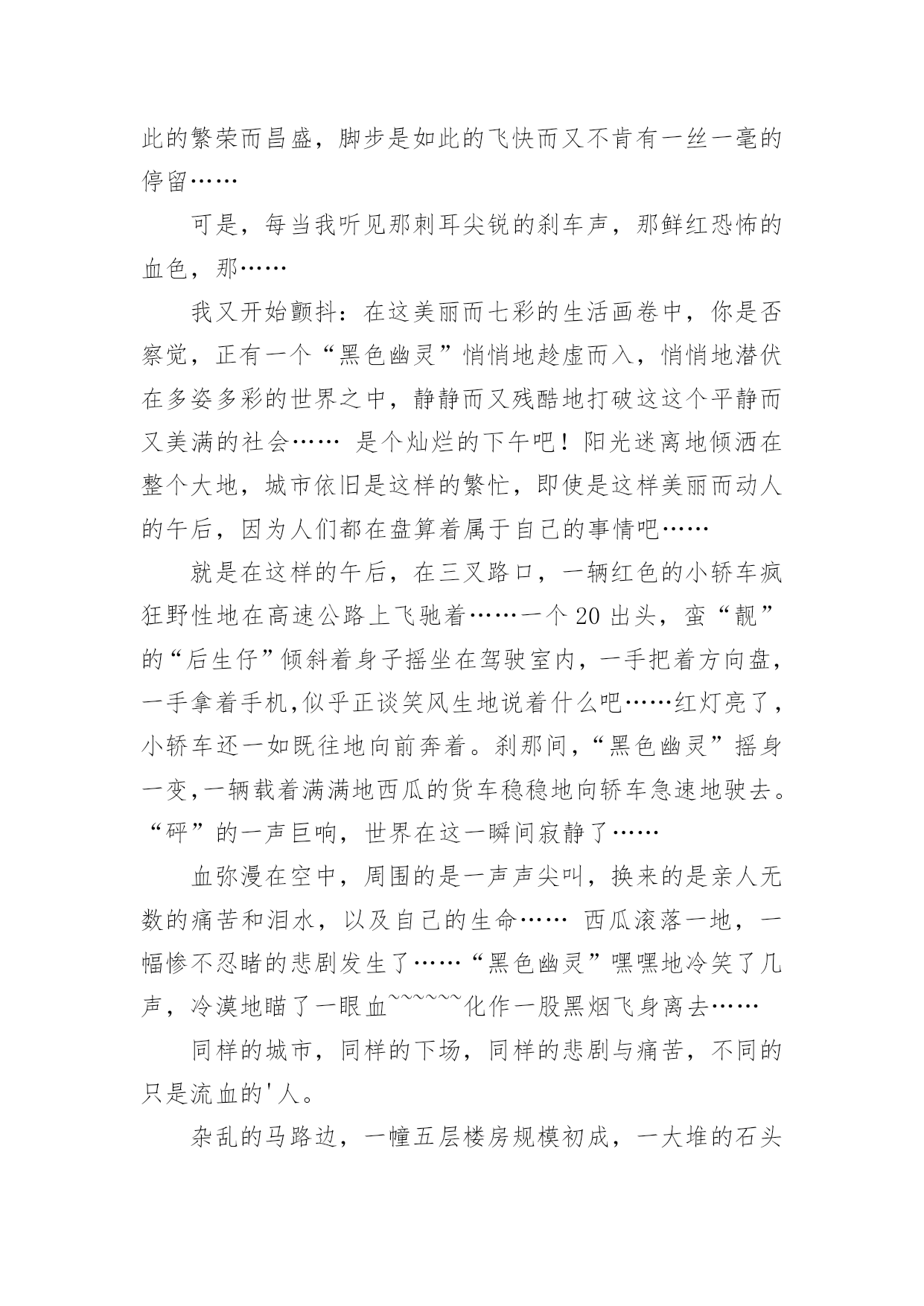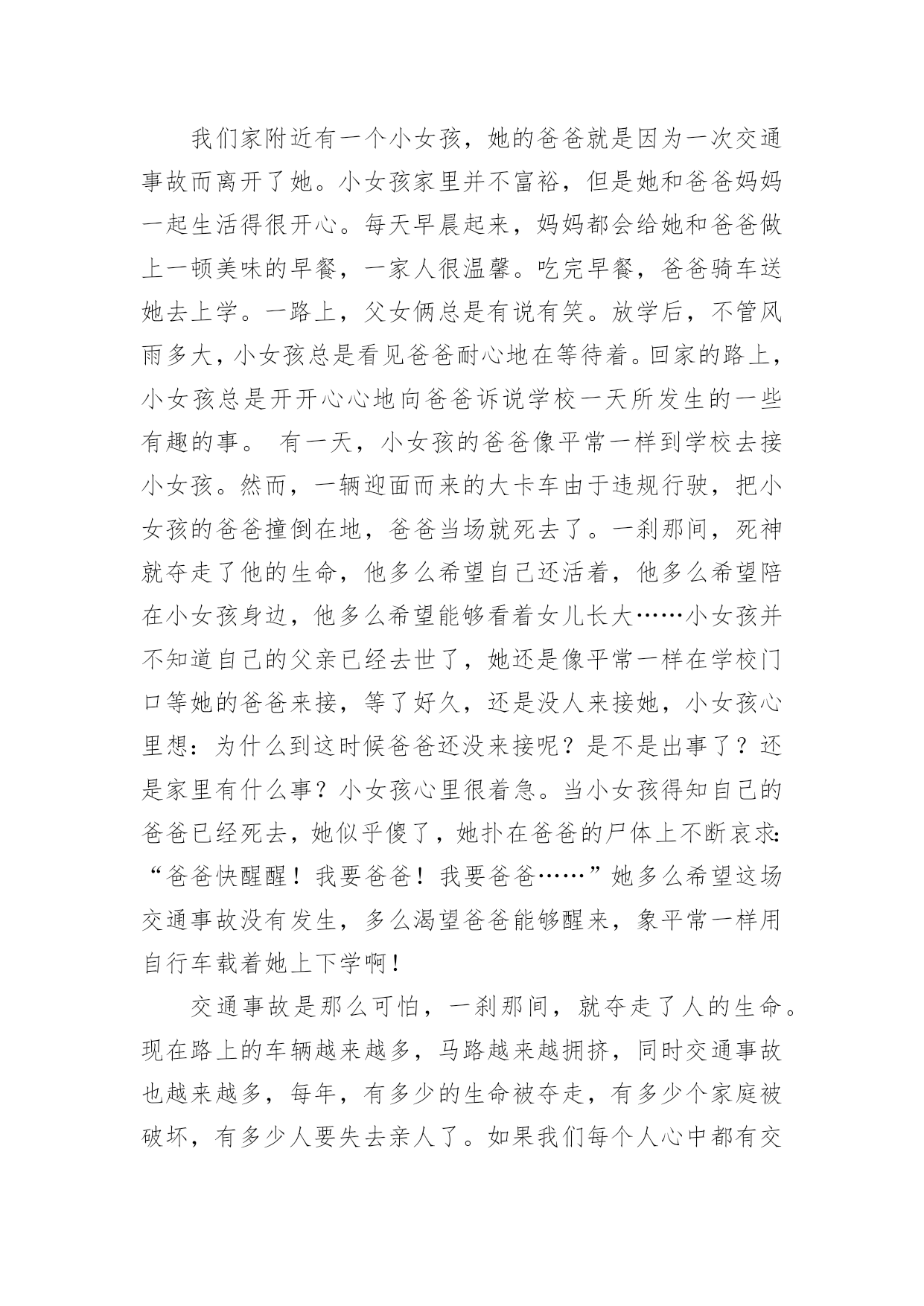 交通安全作文交通安全作文15篇[实用]在现实生活或工作学习中,许多人都有过写作文的经历,对作文都不陌生吧,作文要求篇章结构完整,一定要避免无结尾作文的出现。为了让您在写作文时更加简单方便,下面是小编收集整理的交通安全作文,仅供参考,欢迎大家阅读。交通安全作文1人的生命只有一次,所以我们必须珍惜它,必须珍惜你所拥有的美好……不知道为什么,走在繁华的城市街道,望着那鳞次栉比的高楼,直插云霄的大厦,车水马龙的绿色大道,看着与我擦肩而过匆匆来往的行人,我不禁感叹:这个世纪已经是如此的繁荣而昌盛,脚步是如此的飞快而又不肯有一丝一毫的停留……可是,每当我听见那刺耳尖锐的刹车声,那鲜红恐怖的血色,那……我又开始颤抖:在这美丽而七彩的生活画卷中,你是否察觉,正有一个“黑色幽灵”悄悄地趁虚而入,悄悄地潜伏在多姿多彩的世界之中,静静而又残酷地打破这这个平静而又美满的社会……是个灿烂的下午吧!阳光迷离地倾洒在整个大地,城市依旧是这样的繁忙,即使是这样美丽而动人的午后,因为人们都在盘算着属于自己的事情吧……就是在这样的午后,在三叉路口,一辆红色的小轿车疯狂野性地在高速公路上飞驰着……一个20出头,蛮“靓”的“后生仔”倾斜着身子摇坐在驾驶室内,一手把着方向盘,一手拿着手机,似乎正谈笑风生地说着什么吧……红灯亮了,小轿车还一如既往地向前奔着。刹那间,“黑色幽灵”摇身一变,一辆载着满满地西瓜的货车稳稳地向轿车急速地驶去。“砰”的一声巨响,世界在这一瞬间寂静了……血弥漫在空中,周围的.是一声声尖叫,换来的是亲人无数的痛苦和泪水,以及自己的生命……西瓜滚落一地,一幅惨不忍睹的悲剧发生了……“黑色幽灵”嘿嘿地冷笑了几声,冷漠地瞄了一眼血~~~~~~化作一股黑烟飞身离去……同样的城市,同样的下场,同样的悲剧与痛苦,不同的只是流血的人。杂乱的马路边,一幢五层楼房规模初成,一大堆的石头瓦砾,就这样随意的霸占了三分之一的路面。远方,一个头发随着风而飞扬的的年轻小伙子骑着摩托车,潇洒而悠闲地带着两个少女疾驰而来。“黑色幽灵”忽然瞅见了,鬼计又一次萌生在它的心头,它化成一阵狂风,狠狠地对那摩托车使了使劲,终于摩托车晃悠地把握不住,一头栽向那个高大地石堆……殷红的鲜血汩汩流出,染红了大地,染红了一片瓦砾……一幕人仰马翻的惨剧又发生了……“黑色幽灵”远远地遥望着它的杰作,得意地摇了摇身子,嘴角微微地浮现出一个邪恶地笑容,在一阵阵哭喊声中它狂笑着带这3条灿烂青春的生命悠悠地离开了……夕阳眷恋着吻别了充满了魅力的城市,在远处的山边朦胧地沉睡了……远方,传来了一阵清脆悦耳的歌声。哦~~原来是一个十多岁的少年啊!瞧瞧他,一边骑着自行车,一边唱着富有动感节奏的音乐悠然而来。真是一个拥有着快乐心情的少年啊!他一会儿在马路上跳“S”舞,一会儿来个单放手,一会儿又摇头晃脑地东瞅瞅西看看……“黑色幽灵”怜惜地望着这个活泼动人的孩子,似乎是觉得这孩子实在太可爱了吧,它贪婪地咽了咽口水,似乎它是想要决心捉弄孩子一下,于是“鬼点子”又上来了。它摇身一变,一个满头白发、拄着拐仗的老头儿在路边颤巍巍地走着。少年毫不提防路边猛然冒出个老爷爷,心慌之下,一个急刹车,却又把握不住,连车带人摔倒在地上,歌声瞬间成了令人心碎的呻吟……人的生命永远只有一次,失去,你就将不再拥有……让我们一起来呼吁吧!珍惜自己的生命,不要再让交通事故夺取一条条无辜美丽的生命……让血一次次沾染美丽的世界……所以,在路上时,无论你是开车还是坐车,请都深深铭记:你的生命不单单只属于你自己一个人,你的生命更深深地牵连着你的家人……遵守交通规则,人人有责……交通安全作文2引子:人的生命只有一次,所以我们必须珍惜它,必须珍惜你所拥有的美好……不知道为什么,走在繁华的城市街道,望着那鳞次栉比的高楼,直插云霄的大厦,车水马龙的绿色大道,看着与我擦肩而过匆匆来往的行人,我不禁感叹:这个世纪已经是如此的繁荣而昌盛,脚步是如此的飞快而又不肯有一丝一毫的停留……可是,每当我听见那刺耳尖锐的刹车声,那鲜红恐怖的血色,那……我又开始颤抖:在这美丽而七彩的生活画卷中,你是否察觉,正有一个“黑色幽灵”悄悄地趁虚而入,悄悄地潜伏在多姿多彩的世界之中,静静而又残酷地打破这这个平静而又美满的社会……是个灿烂的下午吧!阳光迷离地倾洒在整个大地,城市依旧是这样的繁忙,即使是这样美丽而动人的午后,因为人们都在盘算着属于自己的事情吧……就是在这样的午后,在三叉路口,一辆红色的小轿车疯狂野性地在高速公路上飞驰着……一个20出头,蛮“靓”的“后生仔”倾斜着身子摇坐在驾驶室内,一手把着方向盘,一手拿着手机,似乎正谈笑风生地说着什么吧……红灯亮了,小轿车还一如既往地向前奔着。刹那间,“黑色幽灵”摇身一变,一辆载着满满地西瓜的货车稳稳地向轿车急速地驶去。“砰”的一声巨响,世界在这一瞬间
