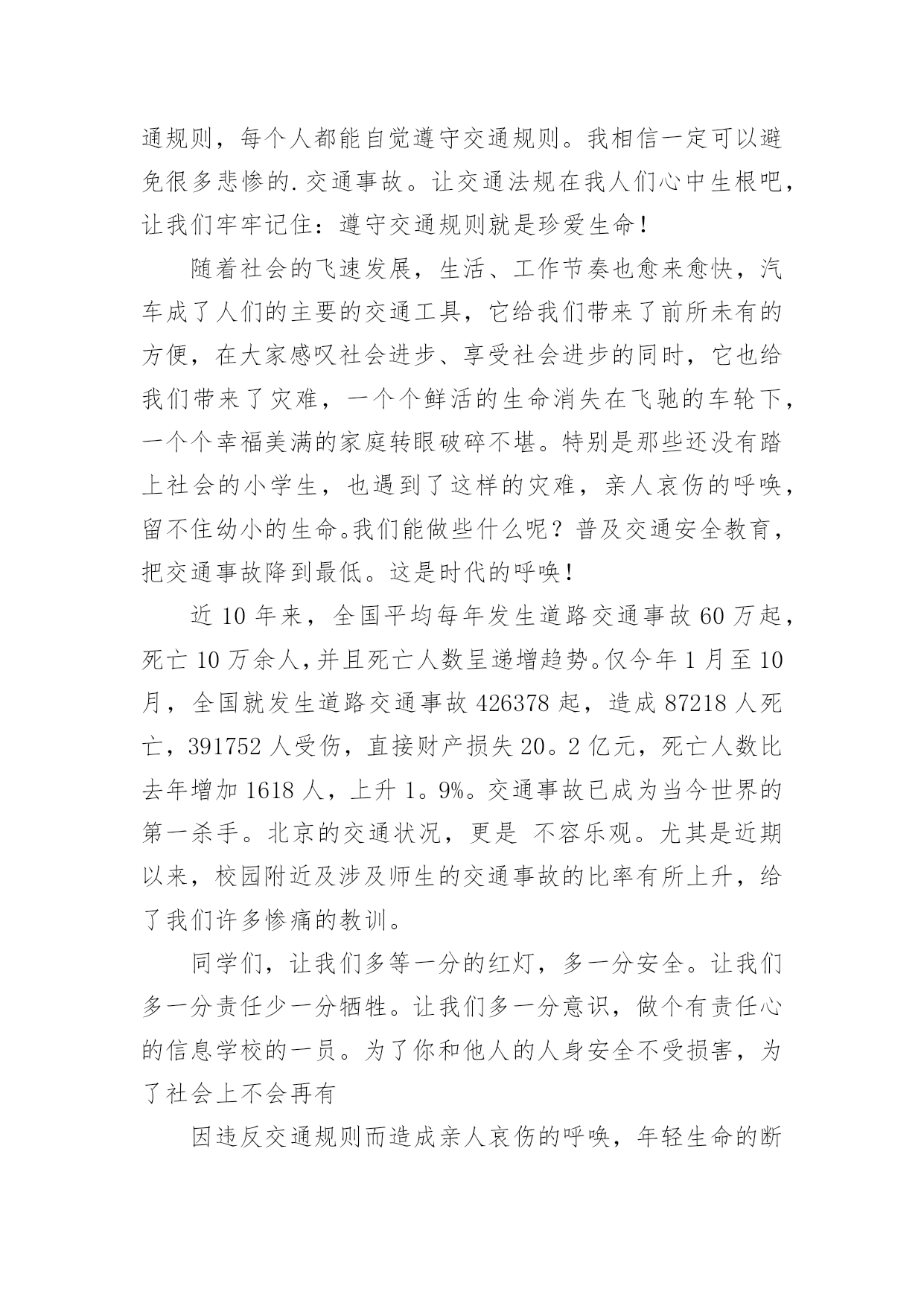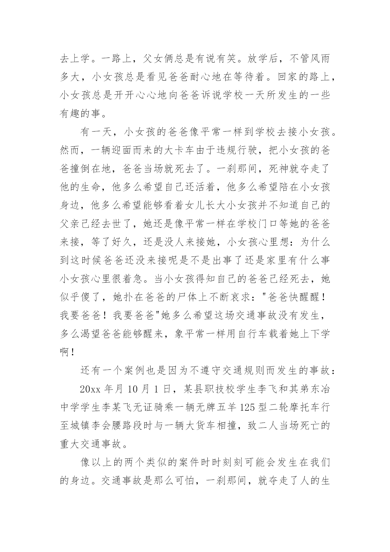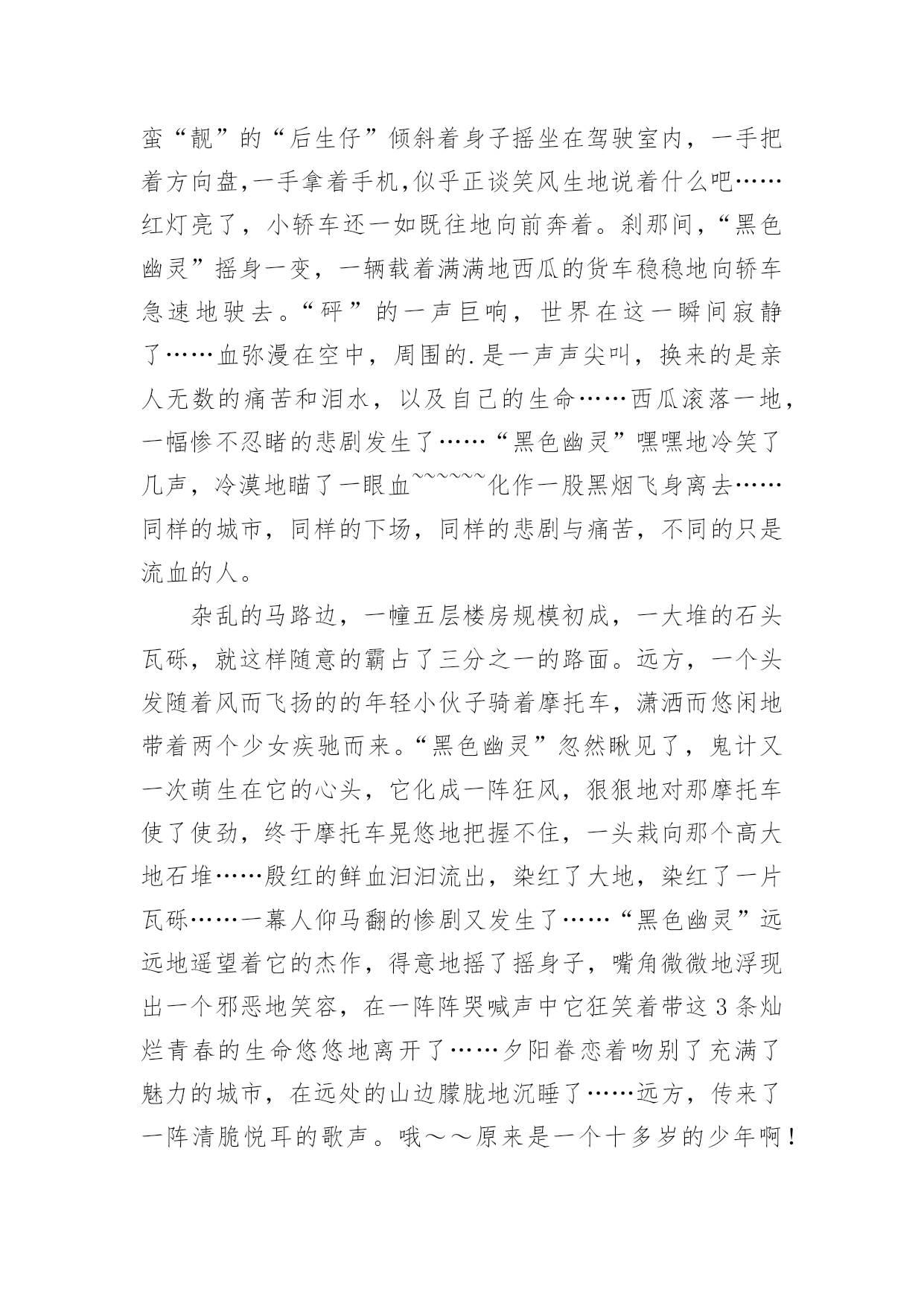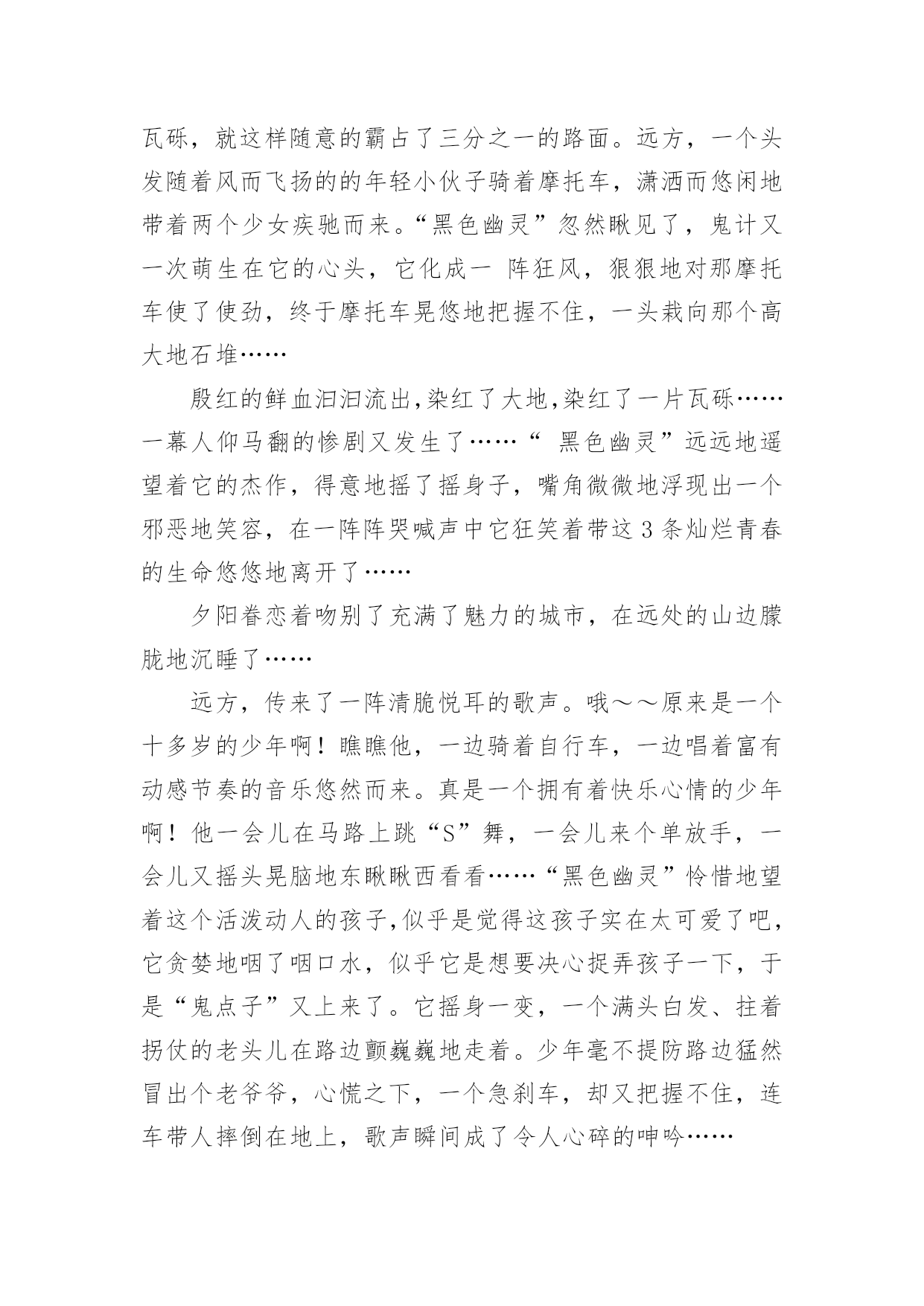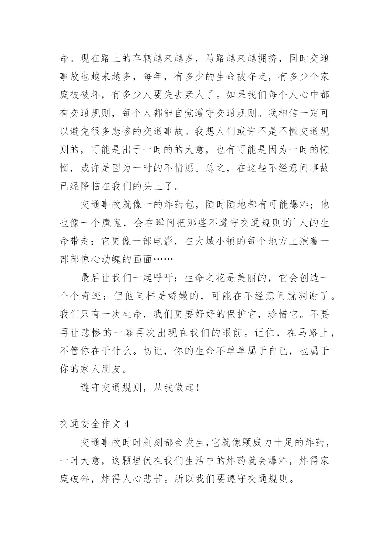 交通安全作文交通安全作文15篇[实用]在现实生活或工作学习中,许多人都有过写作文的经历,对作文都不陌生吧,作文要求篇章结构完整,一定要避免无结尾作文的出现。为了让您在写作文时更加简单方便,下面是小编收集整理的交通安全作文,仅供参考,欢迎大家阅读。交通安全作文1人的生命只有一次,所以我们必须珍惜它,必须珍惜你所拥有的美好……不知道为什么,走在繁华的城市街道,望着那鳞次栉比的高楼,直插云霄的大厦,车水马龙的绿色大道,看着与我擦肩而过匆匆来往的行人,我不禁感叹:这个世纪已经是如此的繁荣而昌盛,脚步是如此的飞快而又不肯有一丝一毫的停留……可是,每当我听见那刺耳尖锐的刹车声,那鲜红恐怖的血色,那……我又开始颤抖:在这美丽而七彩的生活画卷中,你是否察觉,正有一个“黑色幽灵”悄悄地趁虚而入,悄悄地潜伏在多姿多彩的世界之中,静静而又残酷地打破这这个平静而又美满的社会……是个灿烂的下午吧!阳光迷离地倾洒在整个大地,城市依旧是这样的繁忙,即使是这样美丽而动人的午后,因为人们都在盘算着属于自己的事情吧……就是在这样的午后,在三叉路口,一辆红色的小轿车疯狂野性地在高速公路上飞驰着……一个20出头,蛮“靓”的“后生仔”倾斜着身子摇坐在驾驶室内,一手把着方向盘,一手拿着手机,似乎正谈笑风生地说着什么吧……红灯亮了,小轿车还一如既往地向前奔着。刹那间,“黑色幽灵”摇身一变,一辆载着满满地西瓜的货车稳稳地向轿车急速地驶去。“砰”的一声巨响,世界在这一瞬间寂静了……血弥漫在空中,周围的.是一声声尖叫,换来的是亲人无数的痛苦和泪水,以及自己的生命……西瓜滚落一地,一幅惨不忍睹的悲剧发生了……“黑色幽灵”嘿嘿地冷笑了几声,冷漠地瞄了一眼血~~~~~~化作一股黑烟飞身离去……同样的城市,同样的下场,同样的悲剧与痛苦,不同的只是流血的人。杂乱的马路边,一幢五层楼房规模初成,一大堆的石头瓦砾,就这样随意的霸占了三分之一的路面。远方,一个头发随着风而飞扬的的年轻小伙子骑着摩托车,潇洒而悠闲地带着两个少女疾驰而来。“黑色幽灵”忽然瞅见了,鬼计又一次萌生在它的心头,它化成一阵狂风,狠狠地对那摩托车使了使劲,终于摩托车晃悠地把握不住,一头栽向那个高大地石堆……殷红的鲜血汩汩流出,染红了大地,染红了一片瓦砾……一幕人仰马翻的惨剧又发生了……“黑色幽灵”远远地遥望着它的杰作,得意地摇了摇身子,嘴角微微地浮现出一个邪恶地笑容,在一阵阵哭喊声中它狂笑着带这3条灿烂青春的生命悠悠地离开了……夕阳眷恋着吻别了充满了魅力的城市,在远处的山边朦胧地沉睡了……远方,传来了一阵清脆悦耳的歌声。哦~~原来是一个十多岁的少年啊!瞧瞧他,一边骑着自行车,一边唱着富有动感节奏的音乐悠然而来。真是一个拥有着快乐心情的少年啊!他一会儿在马路上跳“S”舞,一会儿来个单放手,一会儿又摇头晃脑地东瞅瞅西看看……“黑色幽灵”怜惜地望着这个活泼动人的孩子,似乎是觉得这孩子实在太可爱了吧,它贪婪地咽了咽口水,似乎它是想要决心捉弄孩子一下,于是“鬼点子”又上来了。它摇身一变,一个满头白发、拄着拐仗的老头儿在路边颤巍巍地走着。少年毫不提防路边猛然冒出个老爷爷,心慌之下,一个急刹车,却又把握不住,连车带人摔倒在地上,歌声瞬间成了令人心碎的呻吟……人的生命永远只有一次,失去,你就将不再拥有……让我们一起来呼吁吧!珍惜自己的生命,不要再让交通事故夺取一条条无辜美丽的生命……让血一次次沾染美丽的世界……所以,在路上时,无论你是开车还是坐车,请都深深铭记:你的生命不单单只属于你自己一个人,你的生命更深深地牵连着你的家人……遵守交通规则,人人有责……交通安全作文2引子:人的生命只有一次,所以我们必须珍惜它,必须珍惜你所拥有的美好……不知道为什么,走在繁华的城市街道,望着那鳞次栉比的高楼,直插云霄的大厦,车水马龙的绿色大道,看着与我擦肩而过匆匆来往的行人,我不禁感叹:这个世纪已经是如此的繁荣而昌盛,脚步是如此的飞快而又不肯有一丝一毫的停留……可是,每当我听见那刺耳尖锐的刹车声,那鲜红恐怖的血色,那……我又开始颤抖:在这美丽而七彩的生活画卷中,你是否察觉,正有一个“黑色幽灵”悄悄地趁虚而入,悄悄地潜伏在多姿多彩的世界之中,静静而又残酷地打破这这个平静而又美满的社会……是个灿烂的下午吧!阳光迷离地倾洒在整个大地,城市依旧是这样的繁忙,即使是这样美丽而动人的午后,因为人们都在盘算着属于自己的事情吧……就是在这样的午后,在三叉路口,一辆红色的小轿车疯狂野性地在高速公路上飞驰着……一个20出头,蛮“靓”的“后生仔”倾斜着身子摇坐在驾驶室内,一手把着方向盘,一手拿着手机,似乎正谈笑风生地说着什么吧……红灯亮了,小轿车还一如既往地向前奔着。刹那间,“黑色幽灵”摇身一变,一辆载着满满地西瓜的货车稳稳地向轿车急速地驶去。“砰”的一声巨响,世界在这一瞬间