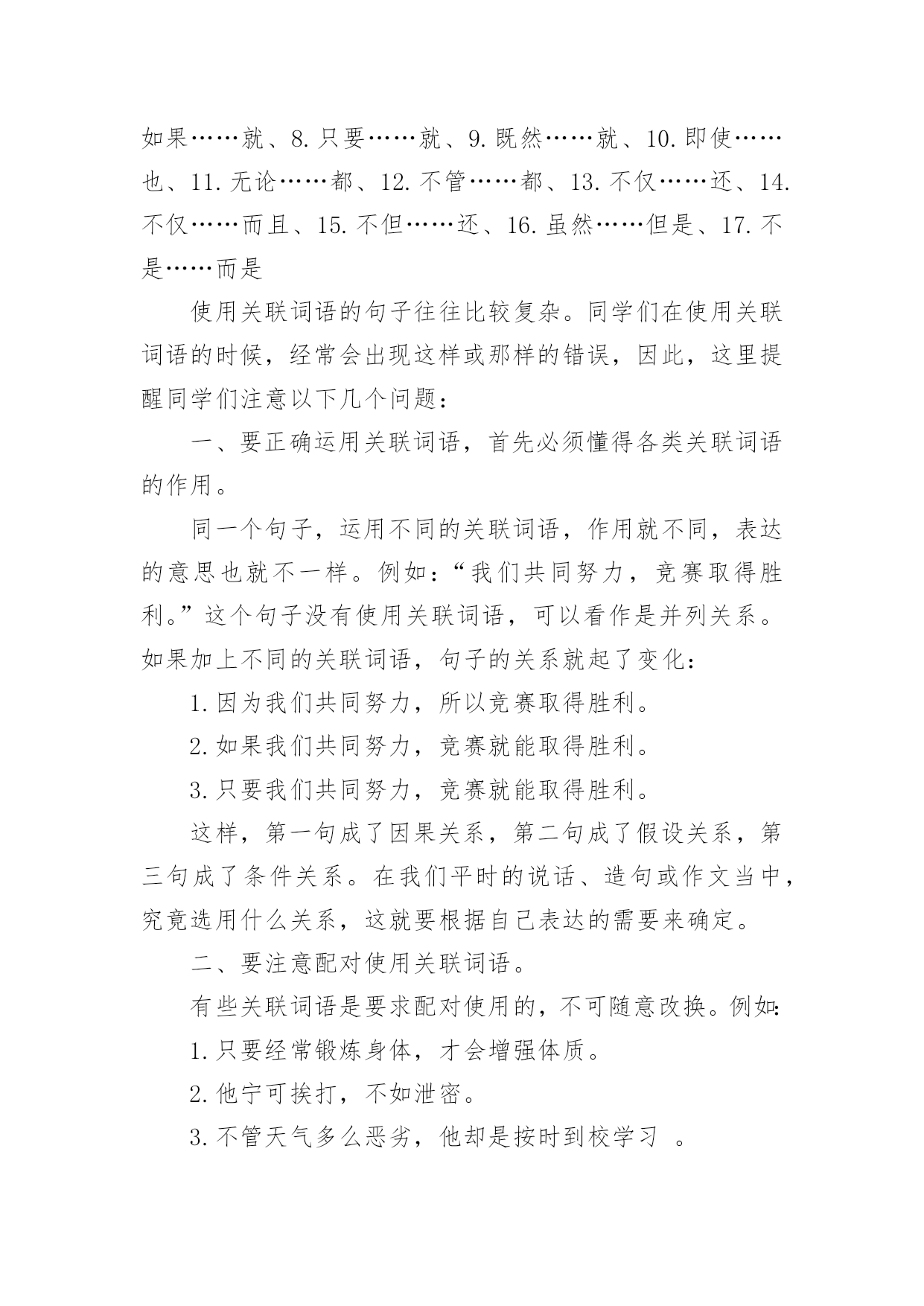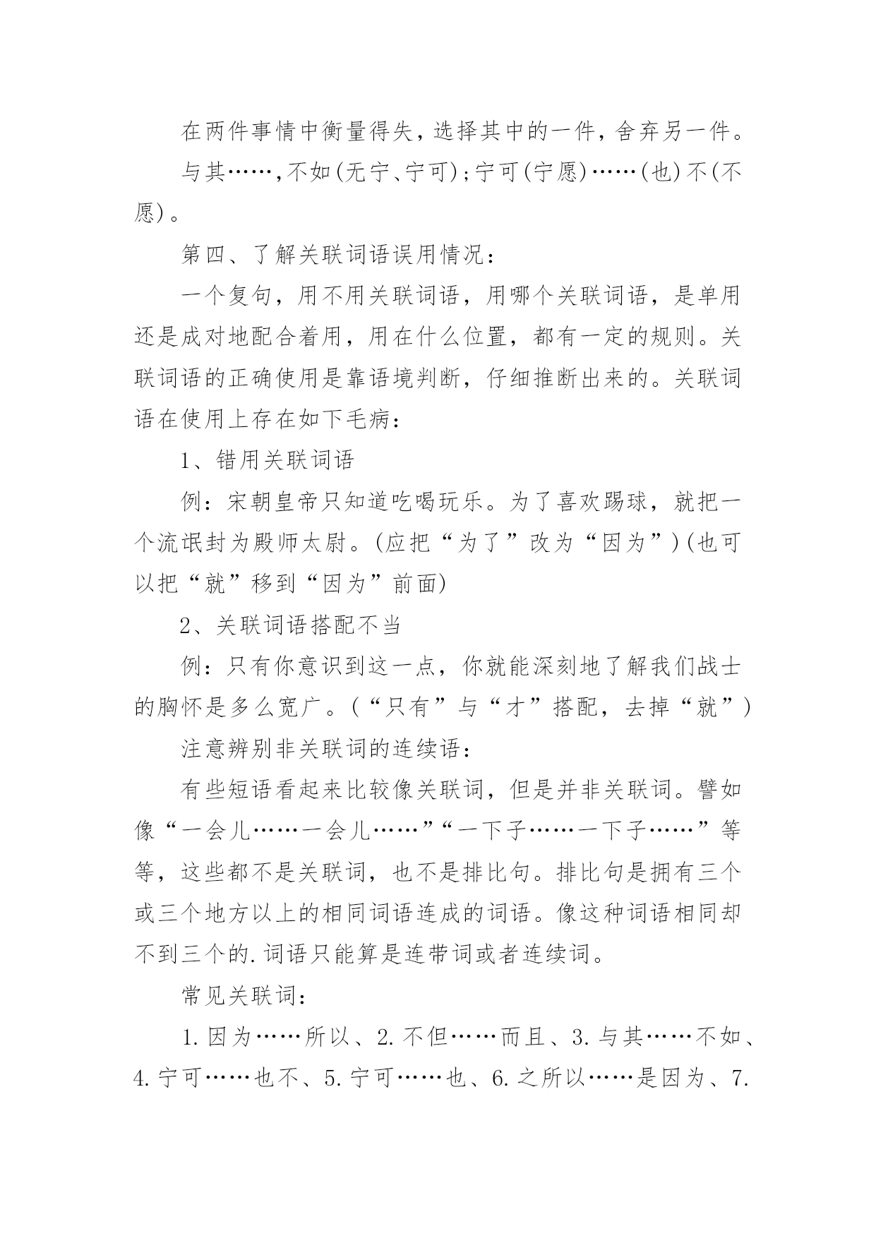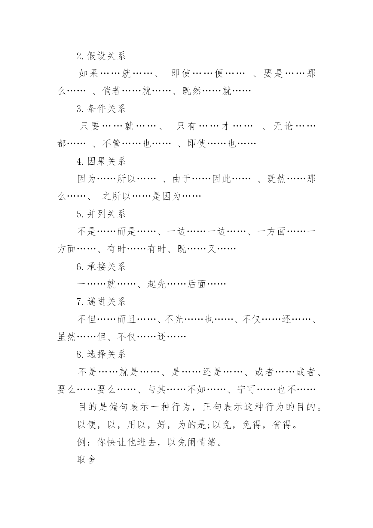 语文高考基础知识语文高考基础知识汇总古代文化常识之汉文学1、《吕氏春秋》是吕不韦召集门客集体编纂的,它又简称为为《吕览》,由十二纪、八览、六论组成。《汉书·艺文志》称这为“杂家”。2、西汉初期,著名的政论散文家是贾谊和晁错,贾谊的政论文名作是《过秦论》,鲁迅称它为“西汉鸿文”,晁错的代表作是《论贵粟书》、《贤良对策》等。3、汉初楚声短歌主要有项羽的《垓下歌》、《刘邦》的《大风歌》。4、汉代最兴盛的文学体裁是赋,但真正标志汉代文学最高成就的是《史记》中的人物传记、诗歌中的汉乐府民间歌辞和由中下层文人创作的五言诗《古诗十九首》。5、最早写赋体作品并以赋名篇,现仍有作品流传下来的是战国时的荀子。6、汉赋发展分为三个阶段,第阶段主要流行的是追随楚骚余绪的“骚体赋”;代表作家及其代表作主要有贾谊的《吊屈原赋》《鸟赋》,淮南小山的《招隐士》枚乘的《七发》。第二阶段是汉赋的鼎盛时期,流行“散体大赋”,主要的代表作家及代表作有:司马相如的《子虚赋》、《上林赋》、《大人赋》、《长门赋》等。其中《大人赋》是讽刺汉武帝好神仙的。杨雄的代表作有《甘泉赋》、《长杨赋》等。其他如王褒、东方朔等也是这一时期的代表作家。第三阶段流行的是抒情言志的“小赋”,著名的作家有张衡、蔡邕、赵壹、祢衡等。7、枚乘的《七发》是标志着散体大赋正式形成的第一篇作品。《七发》的形式对后来的辞赋是有影响的,它的体制结构后来被看做是赋体文学中的一个专体,称作“七”或“七体”。8、赵壹的《刺世疾邪赋》是短篇小赋中最著名的作品,其中“舐痔结驷,正色徒行,妪名势,抚拍豪强”揭露了当时弥漫官场的种种丑行。基础知识:关联词造句五大方法使用关联词语的句子往往比较复杂。同学们在使用关联词语的时候,经常会出现这样或那样的错误。第一,作为联接分句、标明关系的词语,关联词语总是标明抽象的关系,可以作为某类复句的特定的形式标志。第二,关联词语性质复杂。第三,说话时很容易发现必须带有的一到二个词语,虽然意思不同,但连在一起无论是说还是听都觉得很舒服。常见关联词可分为以下几类复句:1.转折关系尽管……可是……虽然……但是…………却…………然而……2.假设关系如果……就……、即使……便……、要是……那么……、倘若……就……、既然……就……3.条件关系只要……就……、只有……才……、无论……都……、不管……也……、即使……也……4.因果关系因为……所以……、由于……因此……、既然……那么……、之所以……是因为……5.并列关系不是……而是……、一边……一边……、一方面……一方面……、有时……有时、既……又……6.承接关系一……就……、起先……后面……7.递进关系不但……而且……、不光……也……、不仅……还……、虽然……但、不仅……还……8.选择关系不是……就是……、是……还是……、或者……或者、要么……要么……、与其……不如……、宁可……也不……目的是偏句表示一种行为,正句表示这种行为的目的。以便,以,用以,好,为的是;以免,免得,省得。例:你快让他进去,以免闹情绪。取舍在两件事情中衡量得失,选择其中的一件,舍弃另一件。与其……,不如(无宁、宁可);宁可(宁愿)……(也)不(不愿)。第四、了解关联词语误用情况:一个复句,用不用关联词语,用哪个关联词语,是单用还是成对地配合着用,用在什么位置,都有一定的规则。关联词语的正确使用是靠语境判断,仔细推断出来的。关联词语在使用上存在如下毛病:1、错用关联词语例:宋朝皇帝只知道吃喝玩乐。为了喜欢踢球,就把一个流氓封为殿师太尉。(应把“为了”改为“因为”)(也可以把“就”移到“因为”前面)2、关联词语搭配不当例:只有你意识到这一点,你就能深刻地了解我们战士的胸怀是多么宽广。(“只有”与“才”搭配,去掉“就”)注意辨别非关联词的连续语:有些短语看起来比较像关联词,但是并非关联词。譬如像“一会儿……一会儿……”“一下子……一下子……”等等,这些都不是关联词,也不是排比句。排比句是拥有三个或三个地方以上的相同词语连成的词语。像这种词语相同却不到三个的.词语只能算是连带词或者连续词。常见关联词:1.因为……所以、2.不但……而且、3.与其……不如、4.宁可……也不、5.宁可……也、6.之所以……是因为、7.如果……就、8.只要……就、9.既然……就、10.即使……也、11.无论……都、12.不管……都、13.不仅……还、14.不仅……而且、15.不但……还、16.虽然……但是、17.不是……而是使用关联词语的句子往往比较复杂。同学们在使用关联词语的时候,经常会出现这样或那样的错误,因此,这里提醒同学们注意以下几个问题:一、要正确运用关联词语,首先必须懂得各类关联词语的作用。同一个句子,运用不同的关联词语,作用就不同,表达的意思也就不一样。例如:“我们共同努力,竞赛取得胜利。”这个