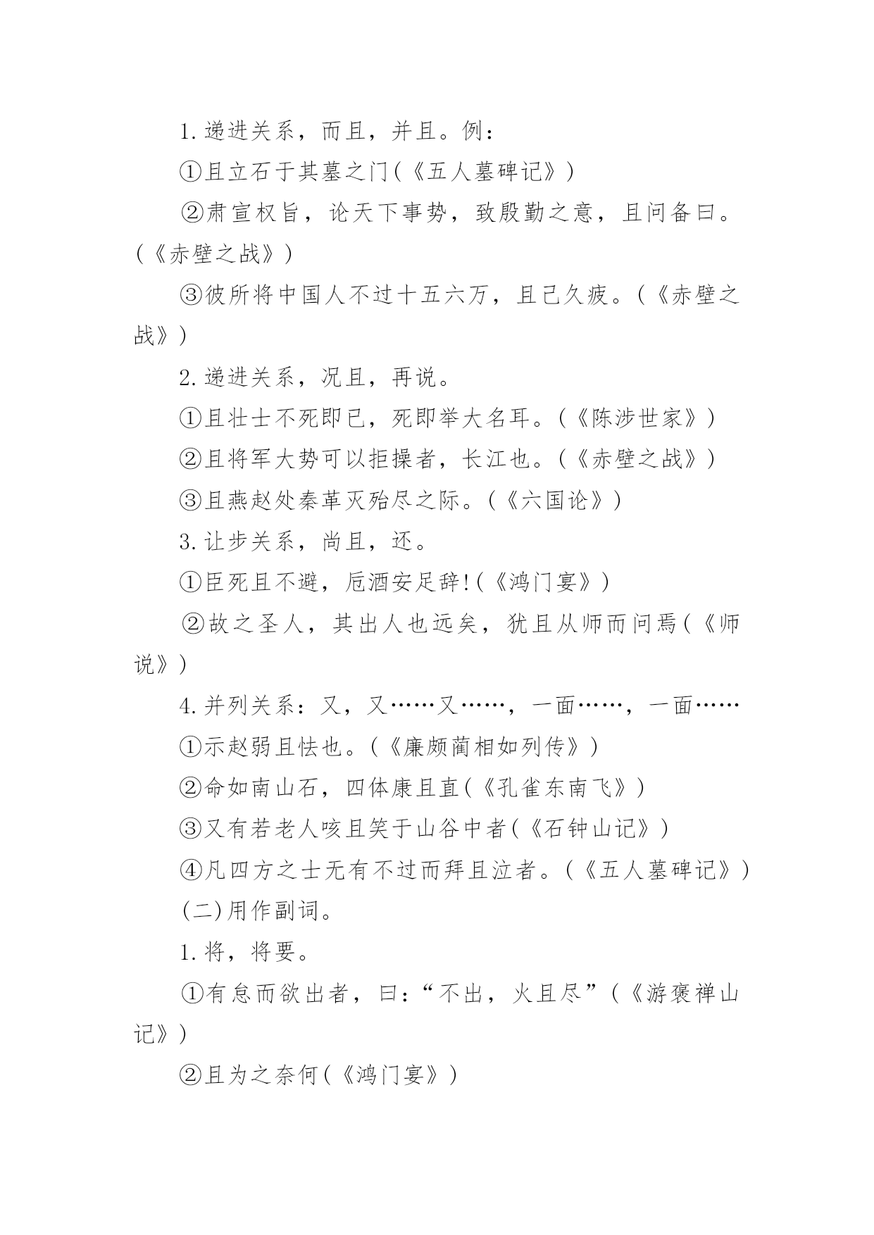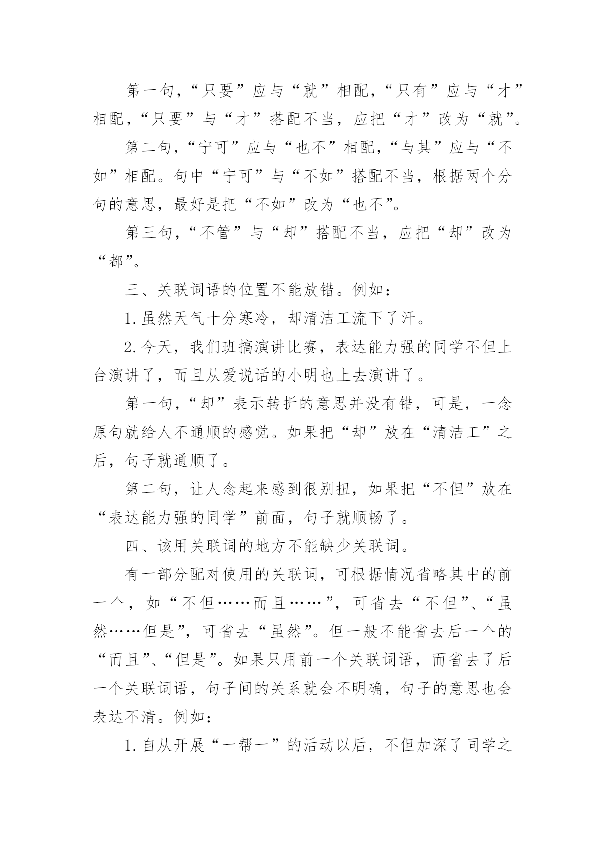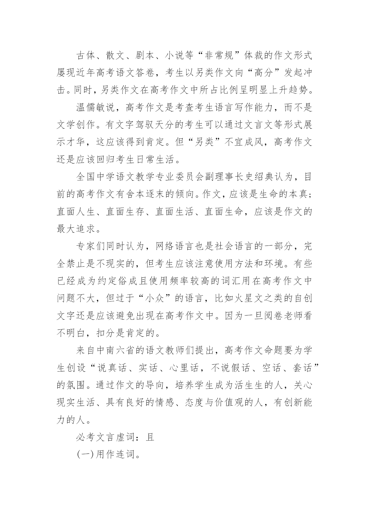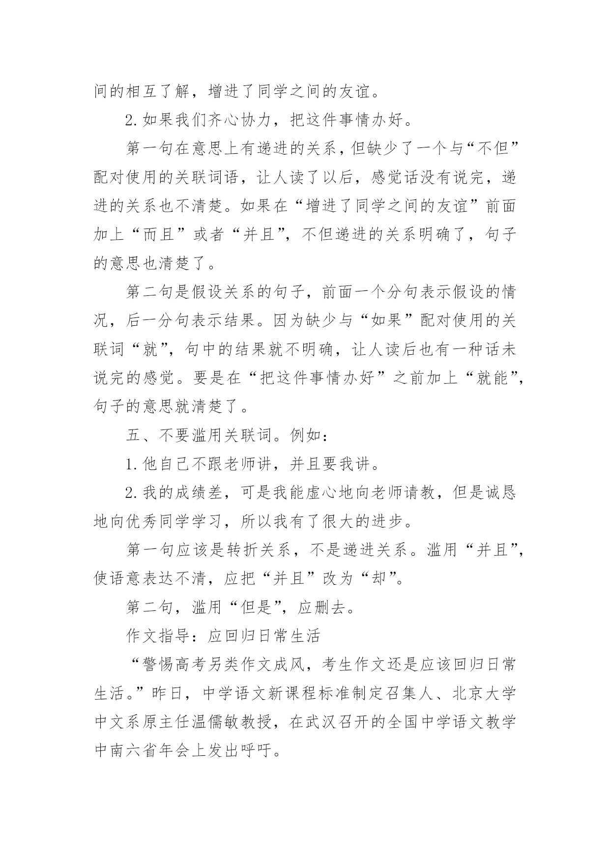 语文高考基础知识语文高考基础知识汇总古代文化常识之汉文学1、《吕氏春秋》是吕不韦召集门客集体编纂的,它又简称为为《吕览》,由十二纪、八览、六论组成。《汉书·艺文志》称这为“杂家”。2、西汉初期,著名的政论散文家是贾谊和晁错,贾谊的政论文名作是《过秦论》,鲁迅称它为“西汉鸿文”,晁错的代表作是《论贵粟书》、《贤良对策》等。3、汉初楚声短歌主要有项羽的《垓下歌》、《刘邦》的《大风歌》。4、汉代最兴盛的文学体裁是赋,但真正标志汉代文学最高成就的是《史记》中的人物传记、诗歌中的汉乐府民间歌辞和由中下层文人创作的五言诗《古诗十九首》。5、最早写赋体作品并以赋名篇,现仍有作品流传下来的是战国时的荀子。6、汉赋发展分为三个阶段,第阶段主要流行的是追随楚骚余绪的“骚体赋”;代表作家及其代表作主要有贾谊的《吊屈原赋》《鸟赋》,淮南小山的《招隐士》枚乘的《七发》。第二阶段是汉赋的鼎盛时期,流行“散体大赋”,主要的代表作家及代表作有:司马相如的《子虚赋》、《上林赋》、《大人赋》、《长门赋》等。其中《大人赋》是讽刺汉武帝好神仙的。杨雄的代表作有《甘泉赋》、《长杨赋》等。其他如王褒、东方朔等也是这一时期的代表作家。第三阶段流行的是抒情言志的“小赋”,著名的作家有张衡、蔡邕、赵壹、祢衡等。7、枚乘的《七发》是标志着散体大赋正式形成的第一篇作品。《七发》的形式对后来的辞赋是有影响的,它的体制结构后来被看做是赋体文学中的一个专体,称作“七”或“七体”。8、赵壹的《刺世疾邪赋》是短篇小赋中最著名的作品,其中“舐痔结驷,正色徒行,妪名势,抚拍豪强”揭露了当时弥漫官场的种种丑行。基础知识:关联词造句五大方法使用关联词语的句子往往比较复杂。同学们在使用关联词语的时候,经常会出现这样或那样的错误。第一,作为联接分句、标明关系的词语,关联词语总是标明抽象的关系,可以作为某类复句的特定的形式标志。第二,关联词语性质复杂。第三,说话时很容易发现必须带有的一到二个词语,虽然意思不同,但连在一起无论是说还是听都觉得很舒服。常见关联词可分为以下几类复句:1.转折关系尽管……可是……虽然……但是…………却…………然而……2.假设关系如果……就……、即使……便……、要是……那么……、倘若……就……、既然……就……3.条件关系只要……就……、只有……才……、无论……都……、不管……也……、即使……也……4.因果关系因为……所以……、由于……因此……、既然……那么……、之所以……是因为……5.并列关系不是……而是……、一边……一边……、一方面……一方面……、有时……有时、既……又……6.承接关系一……就……、起先……后面……7.递进关系不但……而且……、不光……也……、不仅……还……、虽然……但、不仅……还……8.选择关系不是……就是……、是……还是……、或者……或者、要么……要么……、与其……不如……、宁可……也不……目的是偏句表示一种行为,正句表示这种行为的目的。以便,以,用以,好,为的是;以免,免得,省得。例:你快让他进去,以免闹情绪。取舍在两件事情中衡量得失,选择其中的一件,舍弃另一件。与其……,不如(无宁、宁可);宁可(宁愿)……(也)不(不愿)。第四、了解关联词语误用情况:一个复句,用不用关联词语,用哪个关联词语,是单用还是成对地配合着用,用在什么位置,都有一定的规则。关联词语的正确使用是靠语境判断,仔细推断出来的。关联词语在使用上存在如下毛病:1、错用关联词语例:宋朝皇帝只知道吃喝玩乐。为了喜欢踢球,就把一个流氓封为殿师太尉。(应把“为了”改为“因为”)(也可以把“就”移到“因为”前面)2、关联词语搭配不当例:只有你意识到这一点,你就能深刻地了解我们战士的胸怀是多么宽广。(“只有”与“才”搭配,去掉“就”)注意辨别非关联词的连续语:有些短语看起来比较像关联词,但是并非关联词。譬如像“一会儿……一会儿……”“一下子……一下子……”等等,这些都不是关联词,也不是排比句。排比句是拥有三个或三个地方以上的相同词语连成的词语。像这种词语相同却不到三个的.词语只能算是连带词或者连续词。常见关联词:1.因为……所以、2.不但……而且、3.与其……不如、4.宁可……也不、5.宁可……也、6.之所以……是因为、7.如果……就、8.只要……就、9.既然……就、10.即使……也、11.无论……都、12.不管……都、13.不仅……还、14.不仅……而且、15.不但……还、16.虽然……但是、17.不是……而是使用关联词语的句子往往比较复杂。同学们在使用关联词语的时候,经常会出现这样或那样的错误,因此,这里提醒同学们注意以下几个问题:一、要正确运用关联词语,首先必须懂得各类关联词语的作用。同一个句子,运用不同的关联词语,作用就不同,表达的意思也就不一样。例如:“我们共同努力,竞赛取得胜利。”这个
