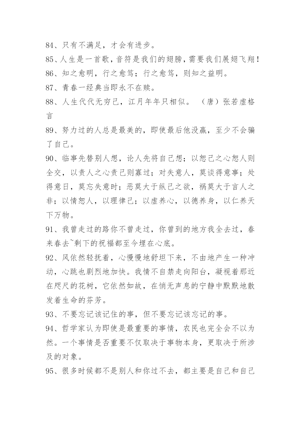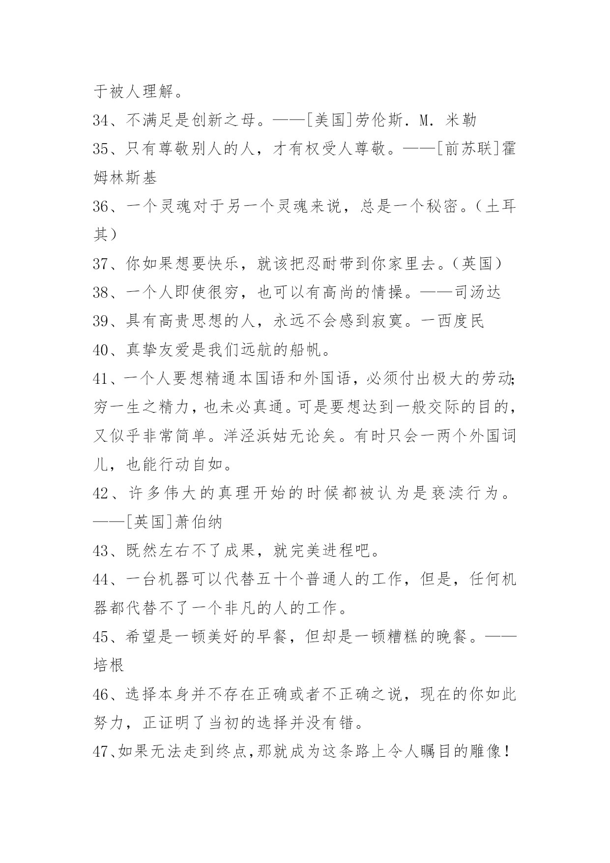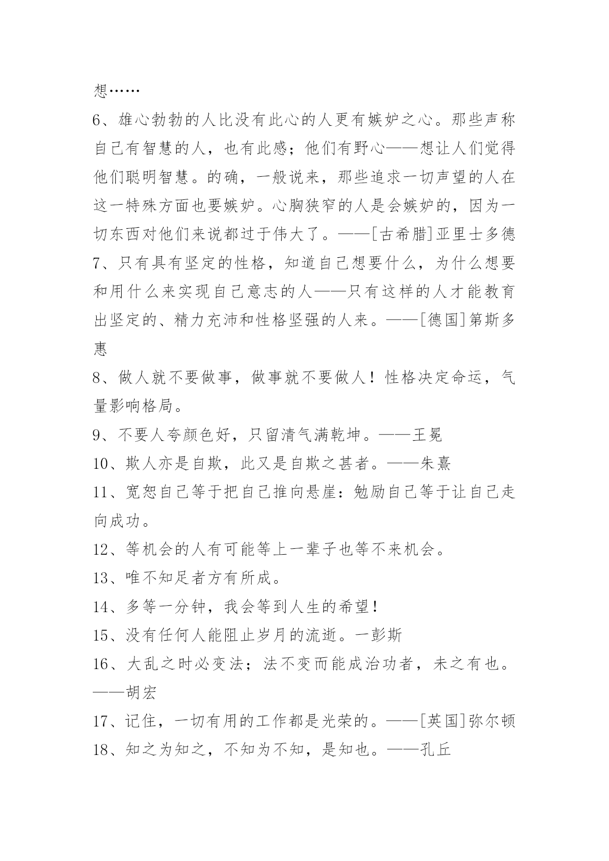 人生感悟格言95条2022年人生感悟格言锦集95条青年,是朝气最汹汹者,是生机最勃郁者,凡青年所在的地方,必是天光接引的坐标。下面是小编给各位读者分享的人生感悟格言95条,仅供参考,大家一起来看看吧。1、倘若世间的一切一切,都是完美无缺,那生活岂不少些韵味?当你亲手编织的尾声填满又一页最后的空白,当休止符号仰卧在轻柔圣洁的心地上,阅读这本诗集时,不要有任何欣慰,亦不要作任何徘徊。人生就是如此——成长与失落紧紧相偎。2、只要你觉得对的事,就去做——反正你做了有人批评,不做也会有人批评。没有人会踢一只死狗。要使别人喜欢你,首先你得改变对人的态度,把精神放得轻松点,表情自然,笑容可掬,这样别人就会对你产生喜爱之情。——卡耐基3、创造这种功绩的魔力被人冠上了一个名称,叫做兴趣。兴趣,带来的结果是专心。——[英]贡布里希4、嫉妒我的人在不知不觉之中颂扬了我。你们的理性与热情,是你航行的灵魂的舵与帆。只有在我以下的人,能忌妒我或憎恨我。妒忌的沉默是太吵闹了。在人的幻想和成就中间有一段空间,只能靠他的热望来通过。——纪伯伦5、望着渐去的夕阳,想起清晨的曙光。夕阳以它渐去的庄严,蘸满晚霞,把红色的追求,溶进我心中对明天的幻想……6、雄心勃勃的人比没有此心的人更有嫉妒之心。那些声称自己有智慧的人,也有此感;他们有野心——想让人们觉得他们聪明智慧。的确,一般说来,那些追求一切声望的人在这一特殊方面也要嫉妒。心胸狭窄的人是会嫉妒的,因为一切东西对他们来说都过于伟大了。——[古希腊]亚里士多德7、只有具有坚定的性格,知道自己想要什么,为什么想要和用什么来实现自己意志的人——只有这样的人才能教育出坚定的、精力充沛和性格坚强的人来。——[德国]第斯多惠8、做人就不要做事,做事就不要做人!性格决定命运,气量影响格局。9、不要人夸颜色好,只留清气满乾坤。——王冕10、欺人亦是自欺,此又是自欺之甚者。——朱熹11、宽恕自己等于把自己推向悬崖:勉励自己等于让自己走向成功。12、等机会的人有可能等上一辈子也等不来机会。13、唯不知足者方有所成。14、多等一分钟,我会等到人生的希望!15、没有任何人能阻止岁月的流逝。一彭斯16、大乱之时必变法;法不变而能成治功者,未之有也。——胡宏17、记住,一切有用的工作都是光荣的。——[英国]弥尔顿18、知之为知之,不知为不知,是知也。——孔丘19、梦想有多大,舞台就有多大。20、世界荣誉的`桂冠,都是用荆棘编织而成的。——[英国]卡莱尔21、对于美好的时光,没有必要太眷念,因为它是属于过去的。22、爱能打赢一切。——希尔提23、品格如同树木,名声如同树阴。我们常常考虑的是树阴,但却不知树不是根本。24、管理的主要职能是计划。——[美国]小詹姆斯等25、坚强的意志在于艰苦的锻炼:丰富的知识在于长期的积累。26、没有美育,就不可能有个性的全面发展。27、你是我的镜子,我是你的镜子,互相指出缺点错误,毫不避讳,因为我们是朋友。28、我宁肯忘掉亏欠自己的而不愿意忘掉亏欠别人的。——[德国]贝多芬29、人在他的历史中表现不出他自己,他在历史中奋斗着露出头角。一泰戈尔30、与朋友交,只取其长,不计其短。——李惺31、只有承认真理,并能向真理低头的人,才是真正的求知者。32、人可以把罪恶掩得严严实实,但却无法摆脱心灵的不安。——塞内加33、人生最大的痛苦莫过于被人误解,人生最大的幸福奠过于被人理解。34、不满足是创新之母。——[美国]劳伦斯.M.米勒35、只有尊敬别人的人,才有权受人尊敬。——[前苏联]霍姆林斯基36、一个灵魂对于另一个灵魂来说,总是一个秘密。(土耳其)37、你如果想要快乐,就该把忍耐带到你家里去。(英国)38、一个人即使很穷,也可以有高尚的情操。——司汤达39、具有高贵思想的人,永远不会感到寂寞。一西度民40、真挚友爱是我们远航的船帆。41、一个人要想精通本国语和外国语,必须付出极大的劳动;穷一生之精力,也未必真通。可是要想达到一般交际的目的,又似乎非常简单。洋泾浜姑无论矣。有时只会一两个外国词儿,也能行动自如。42、许多伟大的真理开始的时候都被认为是亵渎行为。——[英国]萧伯纳43、既然左右不了成果,就完美进程吧。44、一台机器可以代替五十个普通人的工作,但是,任何机器都代替不了一个非凡的人的工作。45、希望是一顿美好的早餐,但却是一顿糟糕的晚餐。——培根46、选择本身并不存在正确或者不正确之说,现在的你如此努力,正证明了当初的选择并没有错。47、如果无法走到终点,那就成为这条路上令人瞩目的雕像!48、理想是什么?理想是目标,没有了目标,就没有了方向,盲目地再人生的十字路口上徘徊;理想是阳光,没有了阳光就没有了希望;理想是希望,没有了希望哪来的快乐。一个人是不可能没有理想的,没有了理想人就不可能生存下去。49、平日若