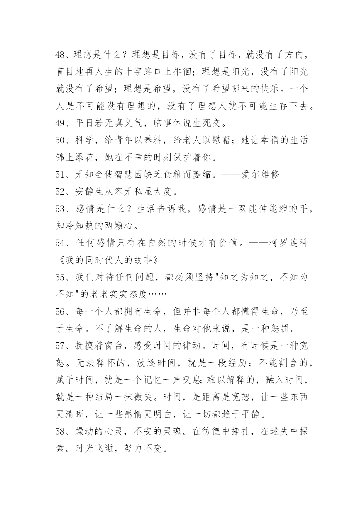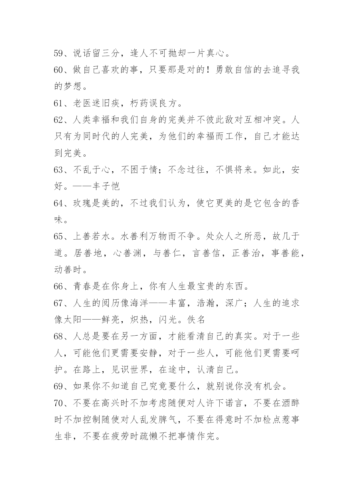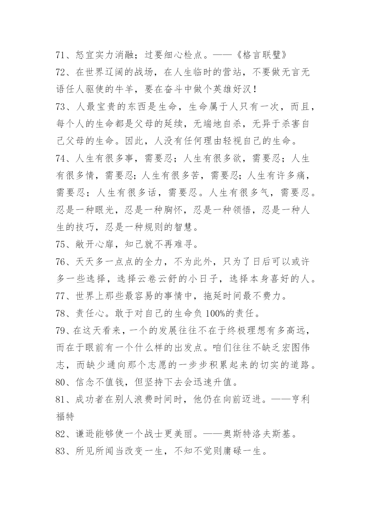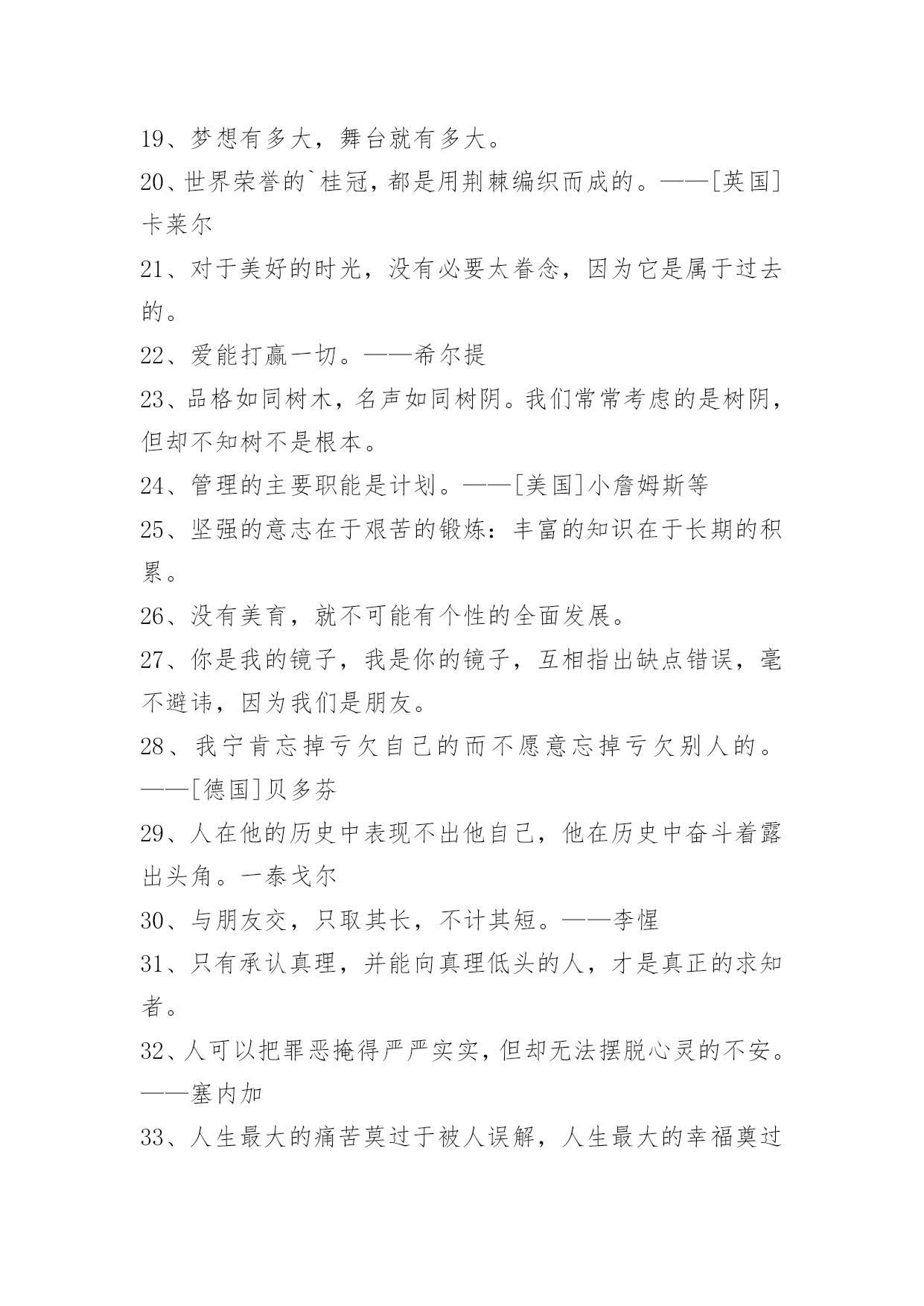 人生感悟格言95条2022年人生感悟格言锦集95条青年,是朝气最汹汹者,是生机最勃郁者,凡青年所在的地方,必是天光接引的坐标。下面是小编给各位读者分享的人生感悟格言95条,仅供参考,大家一起来看看吧。1、倘若世间的一切一切,都是完美无缺,那生活岂不少些韵味?当你亲手编织的尾声填满又一页最后的空白,当休止符号仰卧在轻柔圣洁的心地上,阅读这本诗集时,不要有任何欣慰,亦不要作任何徘徊。人生就是如此——成长与失落紧紧相偎。2、只要你觉得对的事,就去做——反正你做了有人批评,不做也会有人批评。没有人会踢一只死狗。要使别人喜欢你,首先你得改变对人的态度,把精神放得轻松点,表情自然,笑容可掬,这样别人就会对你产生喜爱之情。——卡耐基3、创造这种功绩的魔力被人冠上了一个名称,叫做兴趣。兴趣,带来的结果是专心。——[英]贡布里希4、嫉妒我的人在不知不觉之中颂扬了我。你们的理性与热情,是你航行的灵魂的舵与帆。只有在我以下的人,能忌妒我或憎恨我。妒忌的沉默是太吵闹了。在人的幻想和成就中间有一段空间,只能靠他的热望来通过。——纪伯伦5、望着渐去的夕阳,想起清晨的曙光。夕阳以它渐去的庄严,蘸满晚霞,把红色的追求,溶进我心中对明天的幻想……6、雄心勃勃的人比没有此心的人更有嫉妒之心。那些声称自己有智慧的人,也有此感;他们有野心——想让人们觉得他们聪明智慧。的确,一般说来,那些追求一切声望的人在这一特殊方面也要嫉妒。心胸狭窄的人是会嫉妒的,因为一切东西对他们来说都过于伟大了。——[古希腊]亚里士多德7、只有具有坚定的性格,知道自己想要什么,为什么想要和用什么来实现自己意志的人——只有这样的人才能教育出坚定的、精力充沛和性格坚强的人来。——[德国]第斯多惠8、做人就不要做事,做事就不要做人!性格决定命运,气量影响格局。9、不要人夸颜色好,只留清气满乾坤。——王冕10、欺人亦是自欺,此又是自欺之甚者。——朱熹11、宽恕自己等于把自己推向悬崖:勉励自己等于让自己走向成功。12、等机会的人有可能等上一辈子也等不来机会。13、唯不知足者方有所成。14、多等一分钟,我会等到人生的希望!15、没有任何人能阻止岁月的流逝。一彭斯16、大乱之时必变法;法不变而能成治功者,未之有也。——胡宏17、记住,一切有用的工作都是光荣的。——[英国]弥尔顿18、知之为知之,不知为不知,是知也。——孔丘19、梦想有多大,舞台就有多大。20、世界荣誉的`桂冠,都是用荆棘编织而成的。——[英国]卡莱尔21、对于美好的时光,没有必要太眷念,因为它是属于过去的。22、爱能打赢一切。——希尔提23、品格如同树木,名声如同树阴。我们常常考虑的是树阴,但却不知树不是根本。24、管理的主要职能是计划。——[美国]小詹姆斯等25、坚强的意志在于艰苦的锻炼:丰富的知识在于长期的积累。26、没有美育,就不可能有个性的全面发展。27、你是我的镜子,我是你的镜子,互相指出缺点错误,毫不避讳,因为我们是朋友。28、我宁肯忘掉亏欠自己的而不愿意忘掉亏欠别人的。——[德国]贝多芬29、人在他的历史中表现不出他自己,他在历史中奋斗着露出头角。一泰戈尔30、与朋友交,只取其长,不计其短。——李惺31、只有承认真理,并能向真理低头的人,才是真正的求知者。32、人可以把罪恶掩得严严实实,但却无法摆脱心灵的不安。——塞内加33、人生最大的痛苦莫过于被人误解,人生最大的幸福奠过于被人理解。34、不满足是创新之母。——[美国]劳伦斯.M.米勒35、只有尊敬别人的人,才有权受人尊敬。——[前苏联]霍姆林斯基36、一个灵魂对于另一个灵魂来说,总是一个秘密。(土耳其)37、你如果想要快乐,就该把忍耐带到你家里去。(英国)38、一个人即使很穷,也可以有高尚的情操。——司汤达39、具有高贵思想的人,永远不会感到寂寞。一西度民40、真挚友爱是我们远航的船帆。41、一个人要想精通本国语和外国语,必须付出极大的劳动;穷一生之精力,也未必真通。可是要想达到一般交际的目的,又似乎非常简单。洋泾浜姑无论矣。有时只会一两个外国词儿,也能行动自如。42、许多伟大的真理开始的时候都被认为是亵渎行为。——[英国]萧伯纳43、既然左右不了成果,就完美进程吧。44、一台机器可以代替五十个普通人的工作,但是,任何机器都代替不了一个非凡的人的工作。45、希望是一顿美好的早餐,但却是一顿糟糕的晚餐。——培根46、选择本身并不存在正确或者不正确之说,现在的你如此努力,正证明了当初的选择并没有错。47、如果无法走到终点,那就成为这条路上令人瞩目的雕像!48、理想是什么?理想是目标,没有了目标,就没有了方向,盲目地再人生的十字路口上徘徊;理想是阳光,没有了阳光就没有了希望;理想是希望,没有了希望哪来的快乐。一个人是不可能没有理想的,没有了理想人就不可能生存下去。49、平日若
