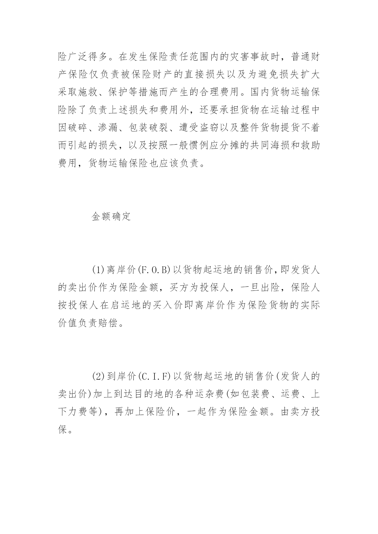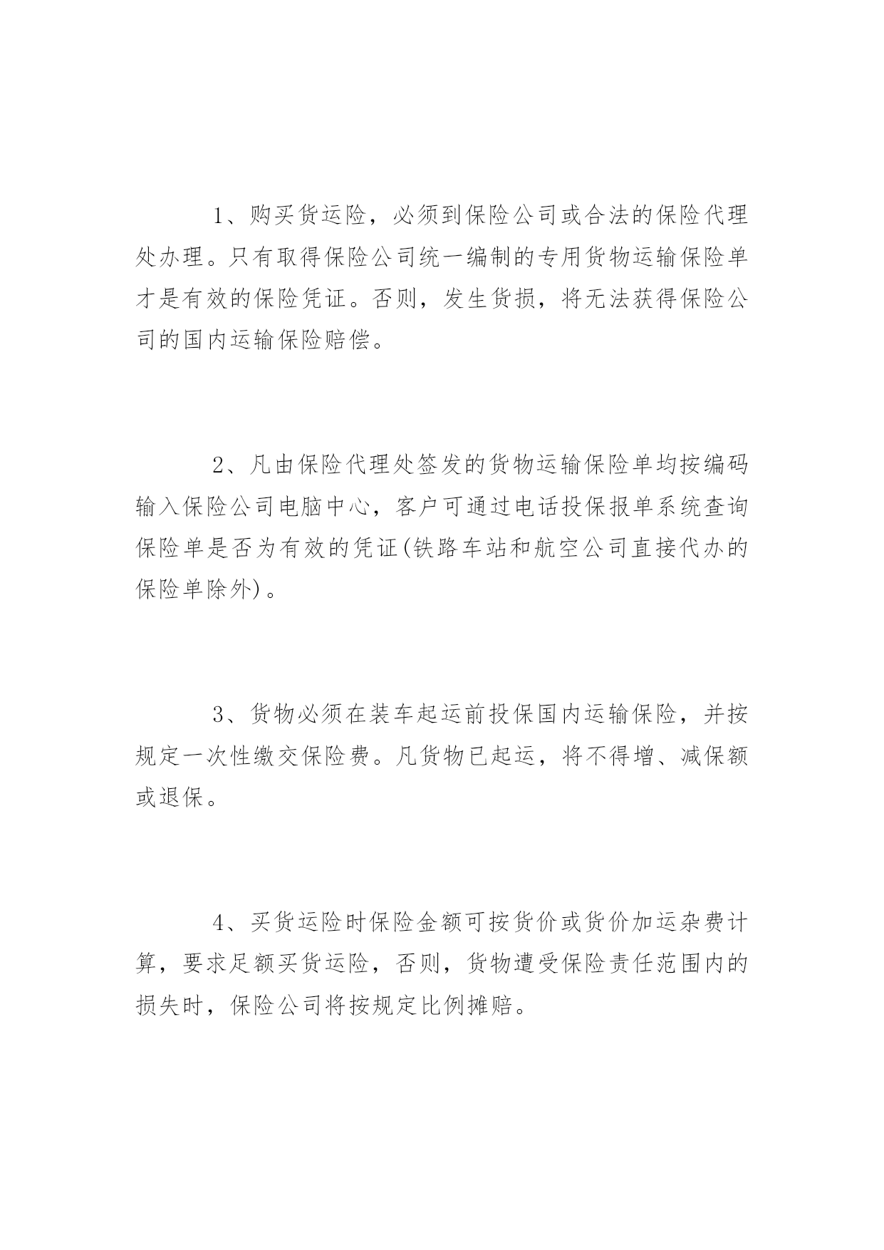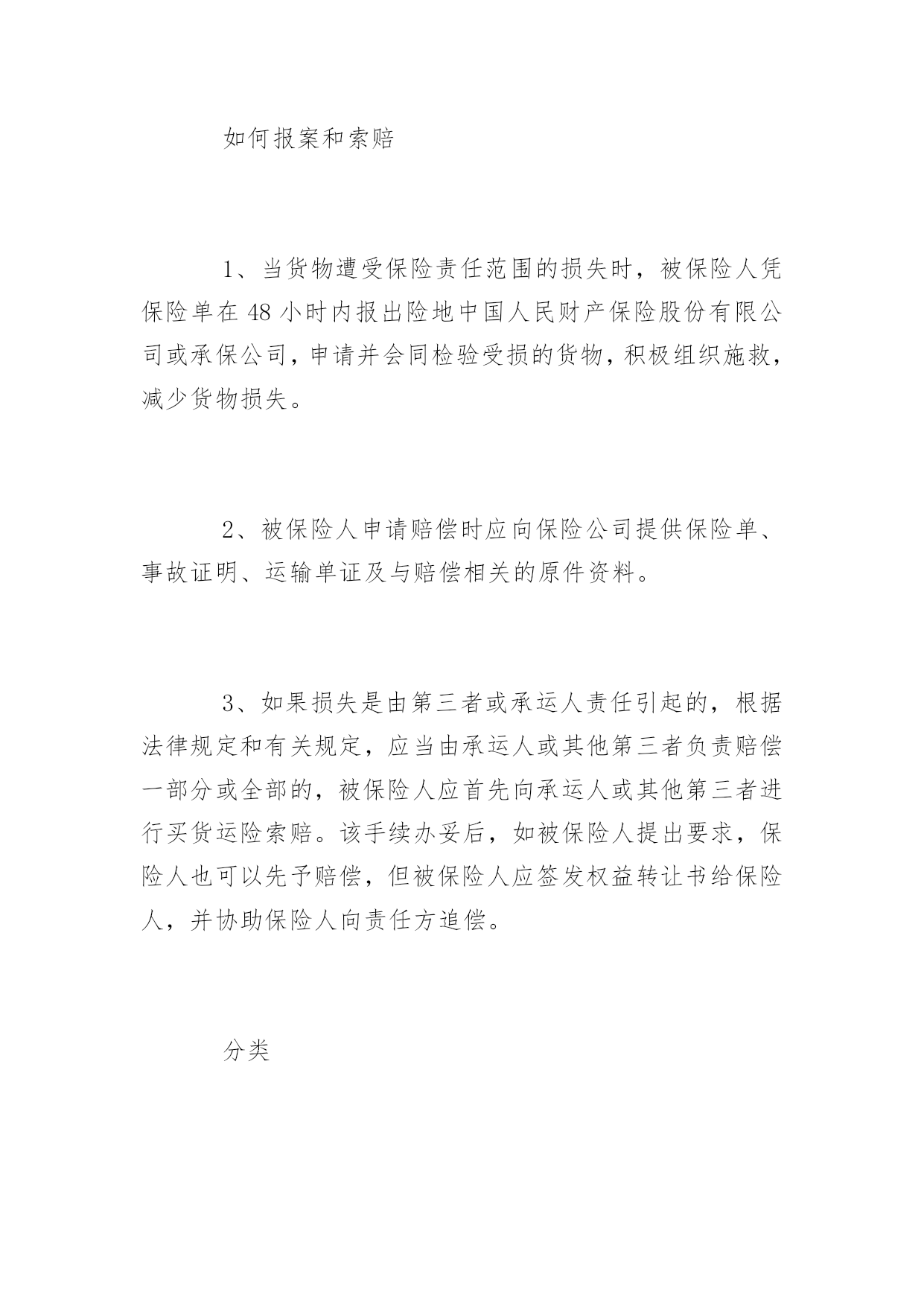 货运保险理赔基础知识货运保险理赔基础知识国内货物运输保险是以在国内运输过程中的货物为保险标的,在标的物遭遇自然灾害或意外事故所造成的损失时给予经济补偿。下面是小编为大家整理的货运保险理赔基础知识,欢迎大家阅读浏览。主要险种1、水路、铁路、公路、航空和联合运输保险;2、邮包运输保险;3、危险物品运输保险;4、旅客行包托运保险;保险期限货物运输保险期限,以一次航程为准,并按“仓至仓”条款规定办理货运险。保险责任水路、公路、铁路运输保险分为基本险和综合险责任两种,其他运输保险责任按特约确定,并受条款约束。除外责任凡属保险货物本身缺陷或自然损耗、包装不善、被保险人的故意行为或过失。如何投保1、购买货运险,必须到保险公司或合法的保险代理处办理。只有取得保险公司统一编制的专用货物运输保险单才是有效的保险凭证。否则,发生货损,将无法获得保险公司的国内运输保险赔偿。2、凡由保险代理处签发的货物运输保险单均按编码输入保险公司电脑中心,客户可通过电话投保报单系统查询保险单是否为有效的凭证(铁路车站和航空公司直接代办的保险单除外)。3、货物必须在装车起运前投保国内运输保险,并按规定一次性缴交保险费。凡货物已起运,将不得增、减保额或退保。4、买货运险时保险金额可按货价或货价加运杂费计算,要求足额买货运险,否则,货物遭受保险责任范围内的损失时,保险公司将按规定比例摊赔。如何报案和索赔1、当货物遭受保险责任范围的损失时,被保险人凭保险单在48小时内报出险地中国人民财产保险股份有限公司或承保公司,申请并会同检验受损的货物,积极组织施救,减少货物损失。2、被保险人申请赔偿时应向保险公司提供保险单、事故证明、运输单证及与赔偿相关的原件资料。3、如果损失是由第三者或承运人责任引起的,根据法律规定和有关规定,应当由承运人或其他第三者负责赔偿一部分或全部的,被保险人应首先向承运人或其他第三者进行买货运险索赔。该手续办妥后,如被保险人提出要求,保险人也可以先予赔偿,但被保险人应签发权益转让书给保险人,并协助保险人向责任方追偿。分类按运输方式的不同(1)直运货物运输保险直运货物运输保险承保的货物是从起运至目的地只用一种运输工具的运输,即使中途货物需转运,转运用的运输工龄与前一段运输所使用的运输工具仍属同一种类。(2)联运货物运输保险联运货物运输保险承保的是两种或两种以上不同的主要运输工具运送货物的运输,可以有水陆联运、江海联运、陆空联运等。联运货物运输保险的保险费率高于直达运输下的货运险费率。(3)集装箱运输保险集装箱运输也叫货柜运输,它是本世纪50年代出现的一种运输方式。集装箱运输的优点在于能做到集装单位化,即把零散包件货物集中在大型标准化货箱内,因而可以简化甚至避免沿途货物的装卸和转运,从而可以使得降低货物运输成本,加速船舶周转,减少货物残损短少成为可能。集装箱运输方式自产生以后历经了迅速的发展。若投保集装箱货物运输保险,其费率较利用其他运输方式运输货物的要低。按运输工具的不同(1)水上货物运输保险承保用水上运输工具承运货物的一种运输保险。水上运输工具指轮船、驳船、机帆船、木船、水泥船等。(2)陆上货物运输保险承保除水上运输工具和飞机以外的所有其他运输或手段运载货物的运输保险,运输工具包括机动的、人力的、畜力的,例如火车、汽车、驿运等。(3)航空货物运输保险承保以飞机为运输工具运载货物的运输保险。按运输工具的不同对国内货物运输保险进行分类是最常见的一种分类方法。在国内货物运输保险的保险单上还可以见到特殊货物保险,如排筏保险、海上抢轮木排运输保险、港内外驳运险和市内陆上运输保险等。特点保险标的普通财产保险是以存放在固定地点的各种财产作为自己的'保险对象,例如企业财产保险承保机器、设备,家庭财产保险的保险标的是家具、家用电器等,因而普通财产保险的保险标的通常处于相对静止的状态。而货物运输保险的保险标的是从一地运到另一地的货物,经常处于运动状态之中,具有较大的流动性。责任起讫普通财产保险的保险期限一般按时间计算确定,货物运输保险属于运程保险,保险责任的起讫时间从货物运离发货人仓库开始,直至运达目的地的收货人仓库或储存地为止,按保险标的实际所需的运输途程为准。保险范围从保障范围来看,国内货物运输保险要比普通财产保险广泛得多。在发生保险责任范围内的灾害事故时,普通财产保险仅负责被保险财产的直接损失以及为避免损失扩大采取施救、保护等措施而产生的合理费用。国内货物运输保险除了负责上述损失和费用外,还要承担货物在运输过程中因破碎、渗漏、包装破裂、遭受盗窃以及整件货物提货不着而引起的损失,以及按照一般惯例应分摊的共同海损和救助费用,货物运输保险也应该负责。金额确定(1)离岸价(F
