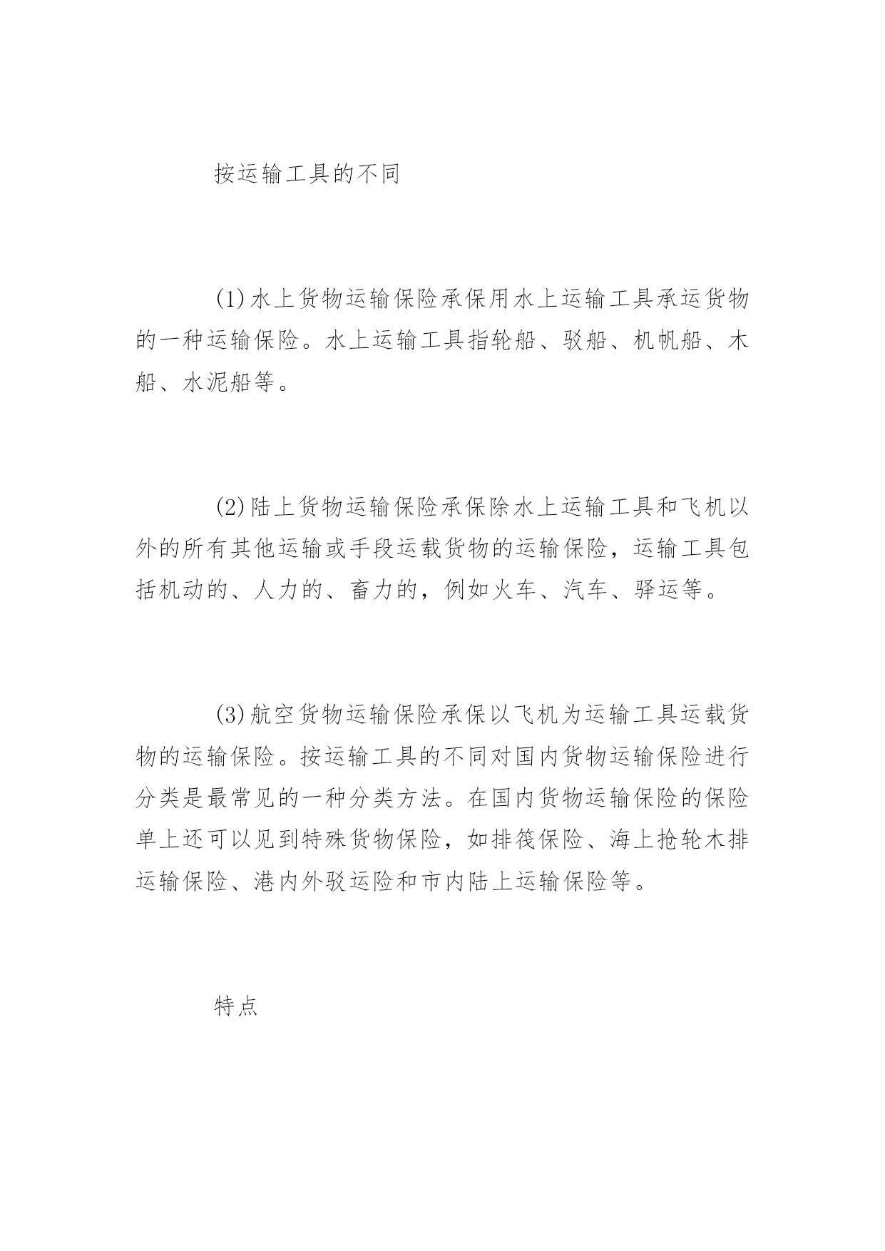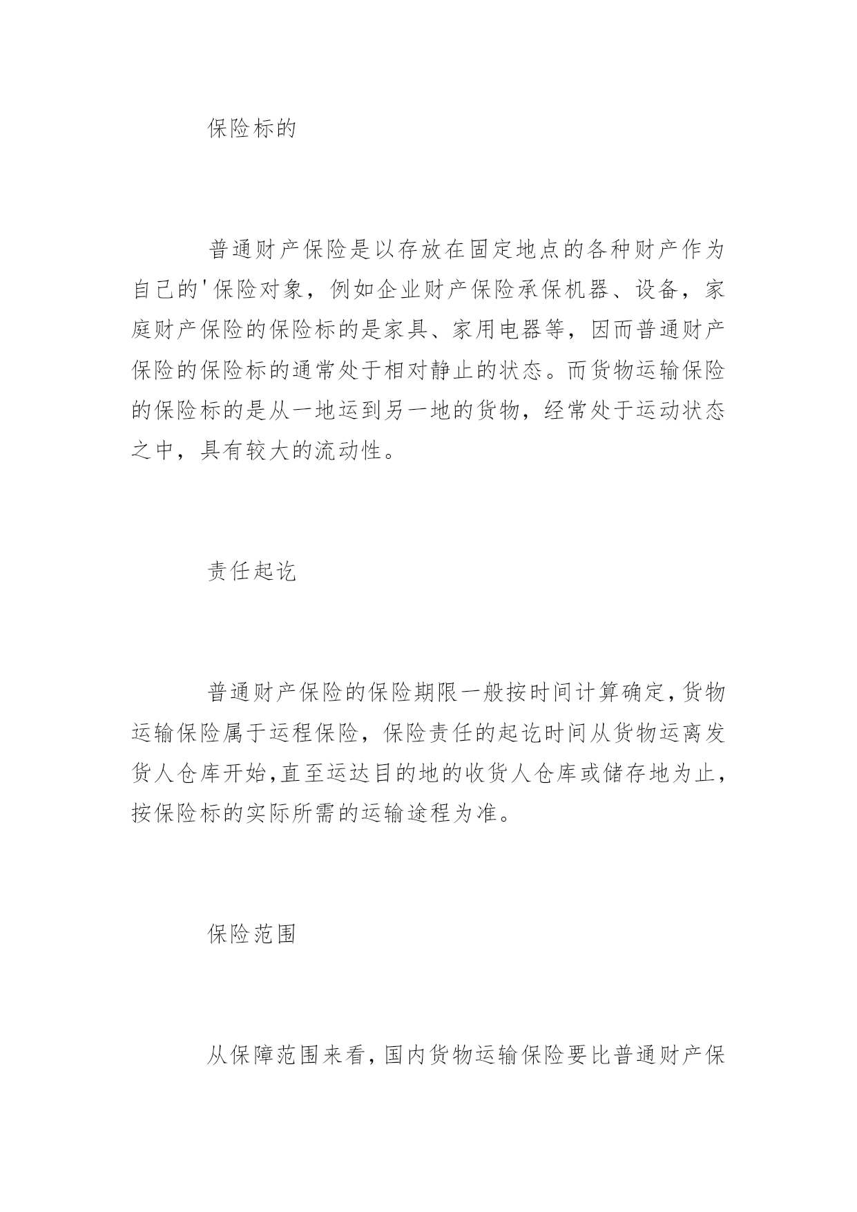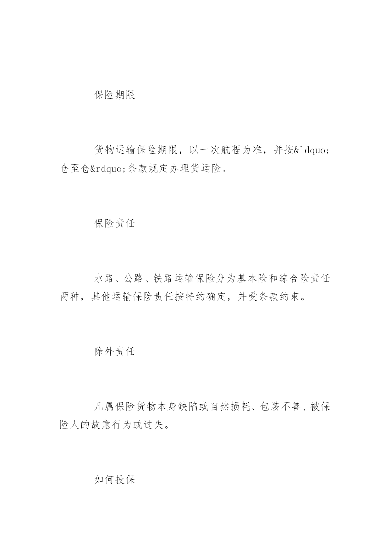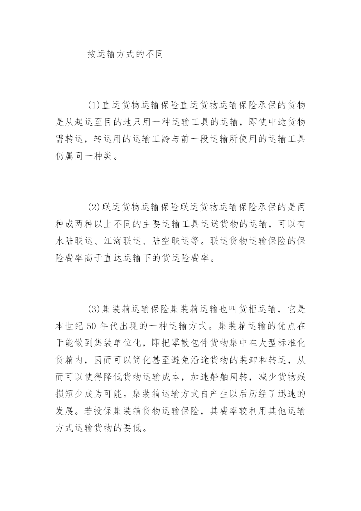 货运保险理赔基础知识货运保险理赔基础知识国内货物运输保险是以在国内运输过程中的货物为保险标的,在标的物遭遇自然灾害或意外事故所造成的损失时给予经济补偿。下面是小编为大家整理的货运保险理赔基础知识,欢迎大家阅读浏览。主要险种1、水路、铁路、公路、航空和联合运输保险;2、邮包运输保险;3、危险物品运输保险;4、旅客行包托运保险;保险期限货物运输保险期限,以一次航程为准,并按“仓至仓”条款规定办理货运险。保险责任水路、公路、铁路运输保险分为基本险和综合险责任两种,其他运输保险责任按特约确定,并受条款约束。除外责任凡属保险货物本身缺陷或自然损耗、包装不善、被保险人的故意行为或过失。如何投保1、购买货运险,必须到保险公司或合法的保险代理处办理。只有取得保险公司统一编制的专用货物运输保险单才是有效的保险凭证。否则,发生货损,将无法获得保险公司的国内运输保险赔偿。2、凡由保险代理处签发的货物运输保险单均按编码输入保险公司电脑中心,客户可通过电话投保报单系统查询保险单是否为有效的凭证(铁路车站和航空公司直接代办的保险单除外)。3、货物必须在装车起运前投保国内运输保险,并按规定一次性缴交保险费。凡货物已起运,将不得增、减保额或退保。4、买货运险时保险金额可按货价或货价加运杂费计算,要求足额买货运险,否则,货物遭受保险责任范围内的损失时,保险公司将按规定比例摊赔。如何报案和索赔1、当货物遭受保险责任范围的损失时,被保险人凭保险单在48小时内报出险地中国人民财产保险股份有限公司或承保公司,申请并会同检验受损的货物,积极组织施救,减少货物损失。2、被保险人申请赔偿时应向保险公司提供保险单、事故证明、运输单证及与赔偿相关的原件资料。3、如果损失是由第三者或承运人责任引起的,根据法律规定和有关规定,应当由承运人或其他第三者负责赔偿一部分或全部的,被保险人应首先向承运人或其他第三者进行买货运险索赔。该手续办妥后,如被保险人提出要求,保险人也可以先予赔偿,但被保险人应签发权益转让书给保险人,并协助保险人向责任方追偿。分类按运输方式的不同(1)直运货物运输保险直运货物运输保险承保的货物是从起运至目的地只用一种运输工具的运输,即使中途货物需转运,转运用的运输工龄与前一段运输所使用的运输工具仍属同一种类。(2)联运货物运输保险联运货物运输保险承保的是两种或两种以上不同的主要运输工具运送货物的运输,可以有水陆联运、江海联运、陆空联运等。联运货物运输保险的保险费率高于直达运输下的货运险费率。(3)集装箱运输保险集装箱运输也叫货柜运输,它是本世纪50年代出现的一种运输方式。集装箱运输的优点在于能做到集装单位化,即把零散包件货物集中在大型标准化货箱内,因而可以简化甚至避免沿途货物的装卸和转运,从而可以使得降低货物运输成本,加速船舶周转,减少货物残损短少成为可能。集装箱运输方式自产生以后历经了迅速的发展。若投保集装箱货物运输保险,其费率较利用其他运输方式运输货物的要低。按运输工具的不同(1)水上货物运输保险承保用水上运输工具承运货物的一种运输保险。水上运输工具指轮船、驳船、机帆船、木船、水泥船等。(2)陆上货物运输保险承保除水上运输工具和飞机以外的所有其他运输或手段运载货物的运输保险,运输工具包括机动的、人力的、畜力的,例如火车、汽车、驿运等。(3)航空货物运输保险承保以飞机为运输工具运载货物的运输保险。按运输工具的不同对国内货物运输保险进行分类是最常见的一种分类方法。在国内货物运输保险的保险单上还可以见到特殊货物保险,如排筏保险、海上抢轮木排运输保险、港内外驳运险和市内陆上运输保险等。特点保险标的普通财产保险是以存放在固定地点的各种财产作为自己的'保险对象,例如企业财产保险承保机器、设备,家庭财产保险的保险标的是家具、家用电器等,因而普通财产保险的保险标的通常处于相对静止的状态。而货物运输保险的保险标的是从一地运到另一地的货物,经常处于运动状态之中,具有较大的流动性。责任起讫普通财产保险的保险期限一般按时间计算确定,货物运输保险属于运程保险,保险责任的起讫时间从货物运离发货人仓库开始,直至运达目的地的收货人仓库或储存地为止,按保险标的实际所需的运输途程为准。保险范围从保障范围来看,国内货物运输保险要比普通财产保险广泛得多。在发生保险责任范围内的灾害事故时,普通财产保险仅负责被保险财产的直接损失以及为避免损失扩大采取施救、保护等措施而产生的合理费用。国内货物运输保险除了负责上述损失和费用外,还要承担货物在运输过程中因破碎、渗漏、包装破裂、遭受盗窃以及整件货物提货不着而引起的损失,以及按照一般惯例应分摊的共同海损和救助费用,货物运输保险也应该负责。金额确定(1)离岸价(F