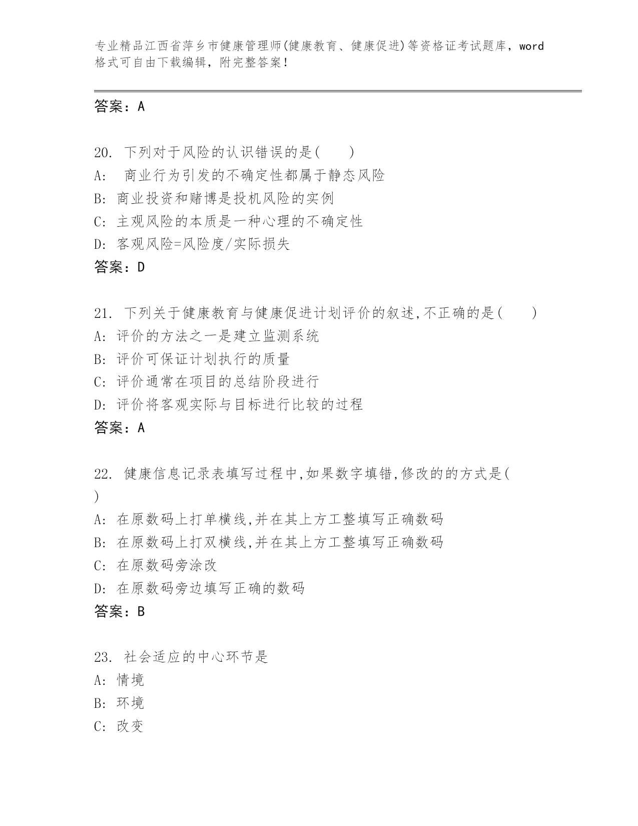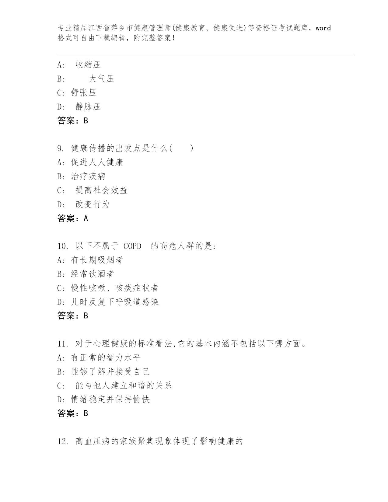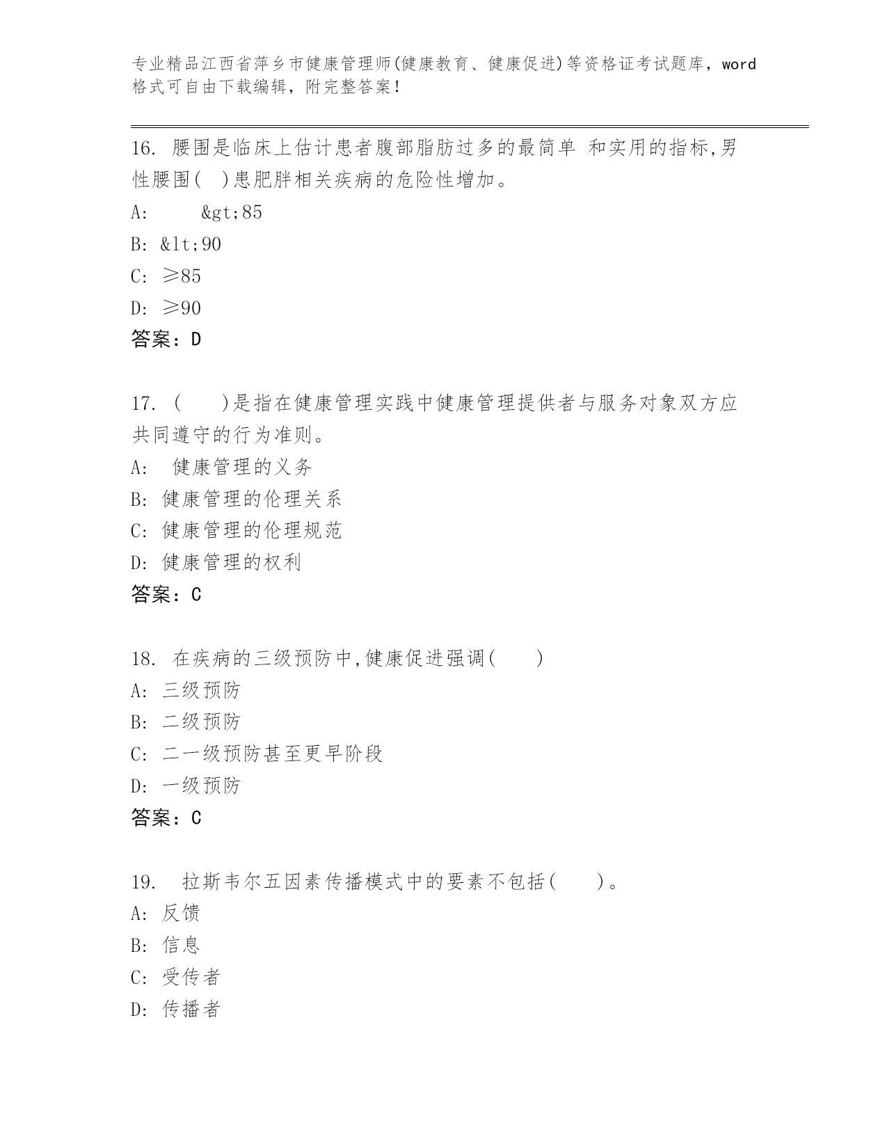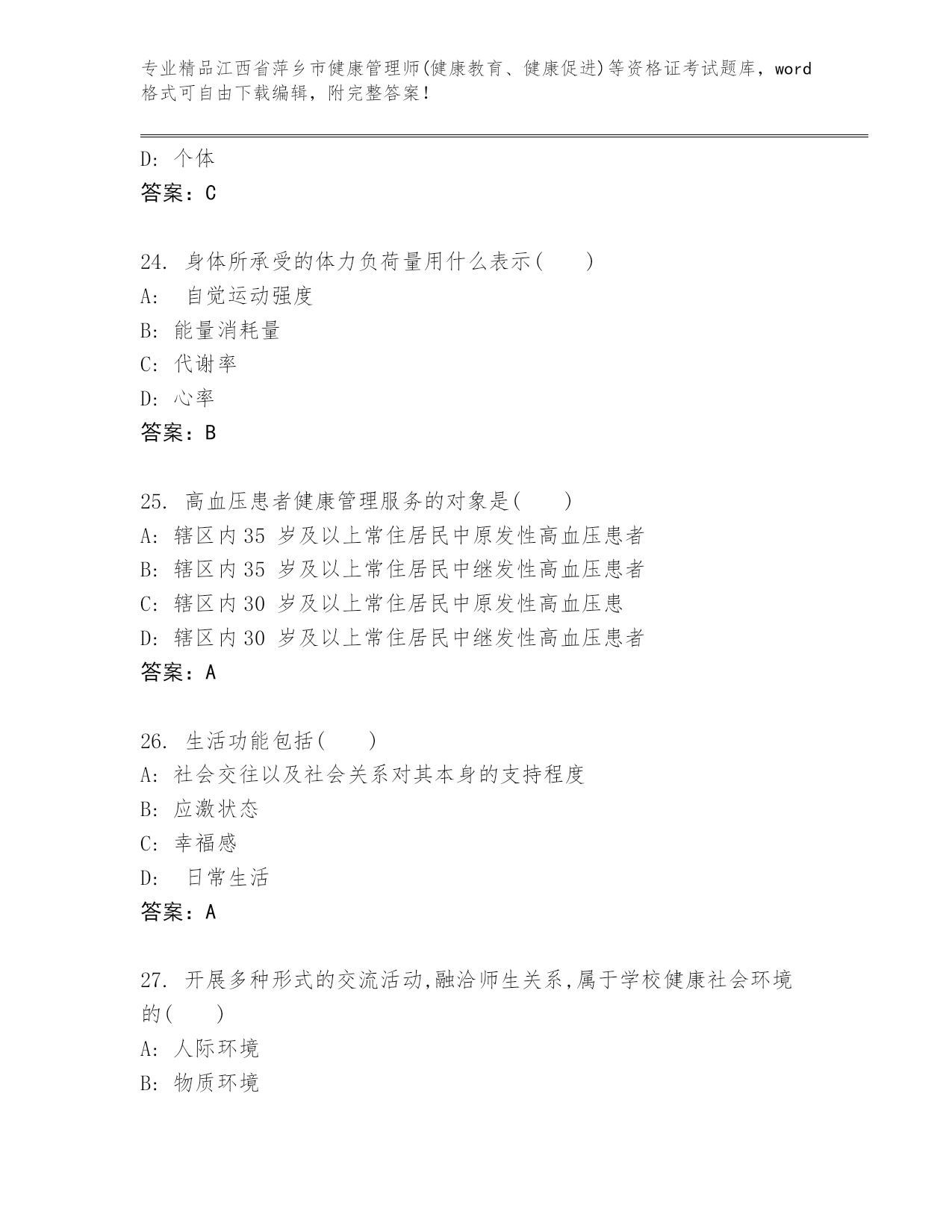 江西省萍乡市健康管理师(健康教育、健康促进)等资格证考试大全及答案【全国通用】