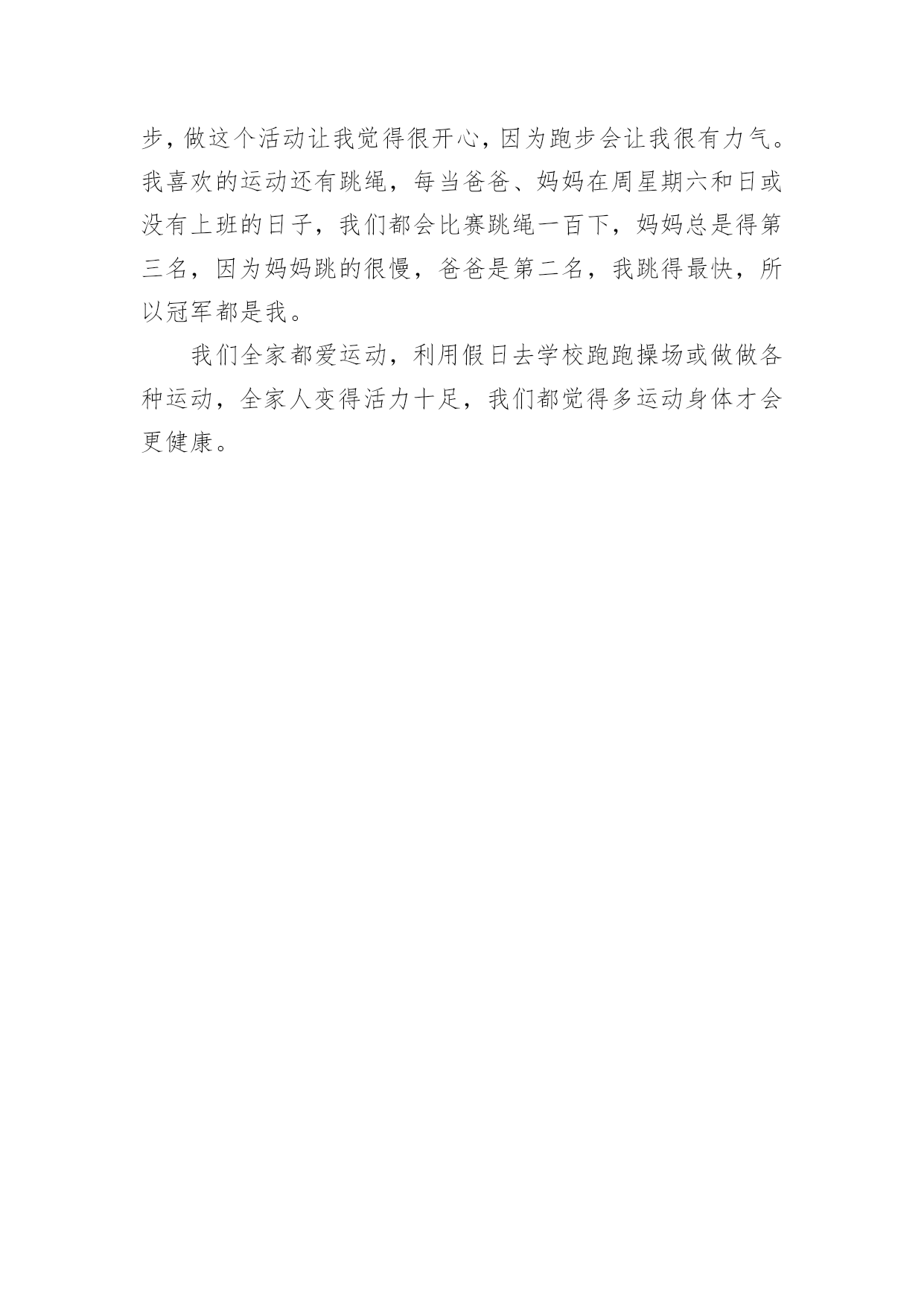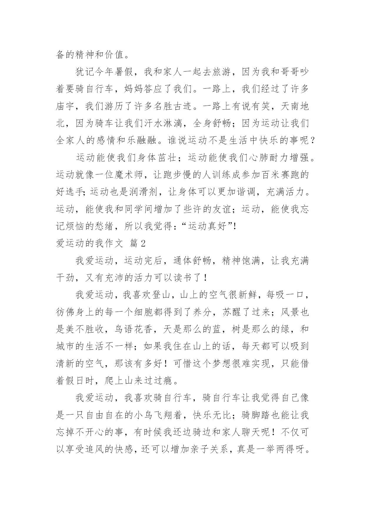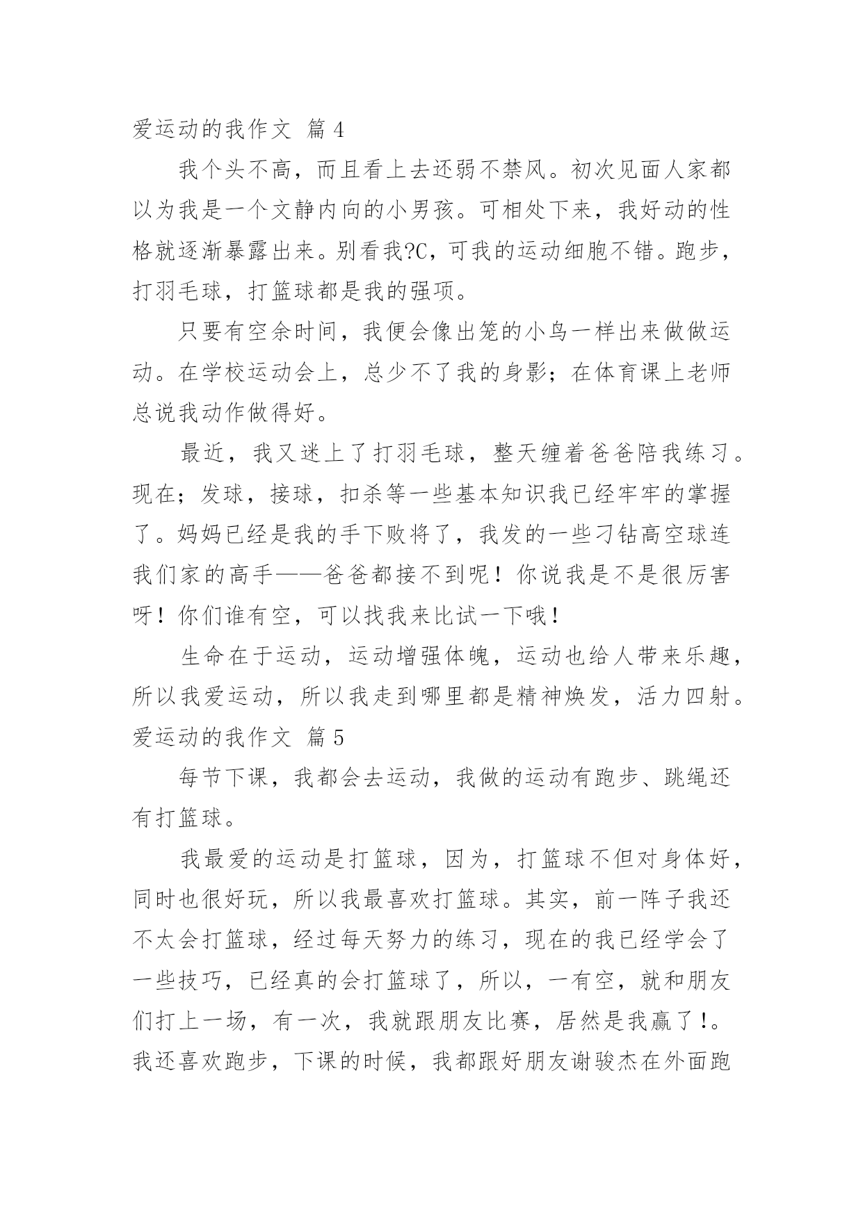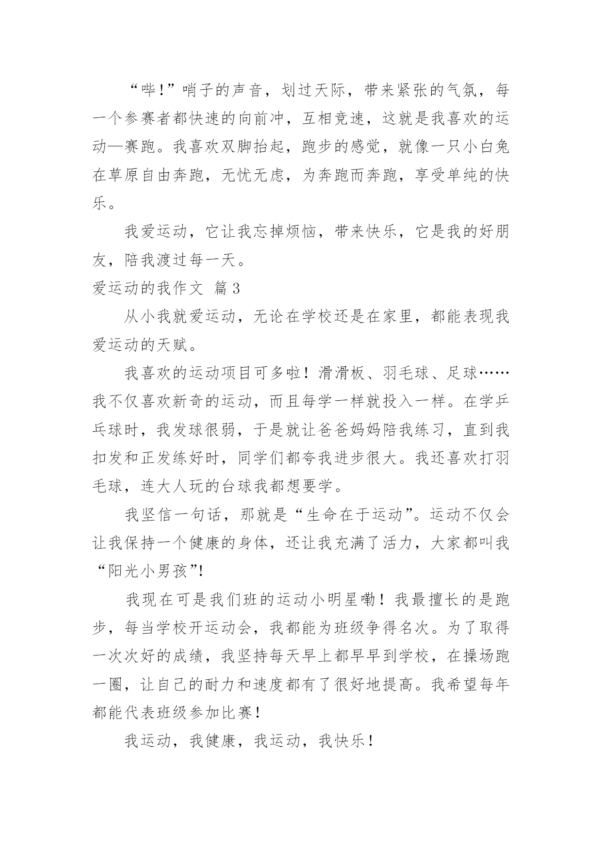 爱运动的我作文关于爱运动的我作文五篇在日复一日的学习、工作或生活中,许多人都写过作文吧,写作文是培养人们的观察力、联想力、想象力、思考力和记忆力的重要手段。你知道作文怎样写才规范吗?以下是小编精心整理的爱运动的我作文5篇,欢迎大家借鉴与参考,希望对大家有所帮助。爱运动的我作文篇1在学校里,每当下课钟声响起,校园的每个角落,总会有许多同学跳绳、跑步、打篮球……,各式各样的运动,都在这十分钟里热烈展开。喜欢运动的我,当然也不会放过这短暂的时间。其中,我喜欢的运动就是打篮球。当老师的哨音响起,男生们就会以“迅雷不及掩耳”的速度攻击女生。女生也不甘示弱的以“回马枪”的力量攻击男生,一场激烈的躲避球赛就此展开……。在炽热的阳光下运动,虽然有人说是一种折磨。但是,对我而言,却是一种“幸福”的滋味。在运动的过程中,难免会受伤,或者是发生意外。可是,我们都会互相关心,彼此照应。即便有同学受伤,大家就会带去健康中心“报到”。在运动的过程中,难免会有输赢,但是赢了却不会骄傲,反而更积极争取分数;输的.也不会气馁,反而再接再厉。因为老师常常说过“胜不骄,败不馁”,这可是身为运动员必备的精神和价值。犹记今年暑假,我和家人一起去旅游,因为我和哥哥吵着要骑自行车,妈妈答应了我们。一路上,我们经过了许多庙宇,我们游历了许多名胜古迹。一路上有说有笑,天南地北,因为骑车让我们汗水淋漓,全身舒畅;因为运动让我们全家人的感情和乐融融。谁说运动不是生活中快乐的事呢?运动能使我们身体茁壮;运动能使我们心肺耐力增强。运动就像一位魔术师,让跑步慢的人训练成参加百米赛跑的好选手;运动也是润滑剂,让身体可以更加谐调,充满活力。运动,能使我和同学间增加了些许的友谊;运动,能使我忘记烦恼的愁绪,所以我觉得:“运动真好”!爱运动的我作文篇2我爱运动,运动完后,通体舒畅,精神饱满,让我充满干劲,又有充沛的活力可以读书了!我爱运动,我喜欢登山,山上的空气很新鲜,每吸一口,彷佛身上的每一个细胞都得到了养分,苏醒了过来;风景也是美不胜收,鸟语花香,天是那么的蓝,树是那么的绿,和城市的生活不一样;如果我住在山上的话,每天都可以吸到清新的空气,那该有多好!可惜这个梦想很难实现,只能借着假日时,爬上山来过过瘾。我爱运动,我喜欢骑自行车,骑自行车让我觉得自己像是一只自由自在的小鸟飞翔着,快乐无比;骑脚踏也能让我忘掉不开心的事,有时候我还边骑边和家人聊天呢!不仅可以享受追风的快感,还可以增加亲子关系,真是一举两得呀。“哔!”哨子的声音,划过天际,带来紧张的气氛,每一个参赛者都快速的向前冲,互相竞速,这就是我喜欢的运动—赛跑。我喜欢双脚抬起,跑步的感觉,就像一只小白兔在草原自由奔跑,无忧无虑,为奔跑而奔跑,享受单纯的快乐。我爱运动,它让我忘掉烦恼,带来快乐,它是我的好朋友,陪我渡过每一天。爱运动的我作文篇3从小我就爱运动,无论在学校还是在家里,都能表现我爱运动的天赋。我喜欢的运动项目可多啦!滑滑板、羽毛球、足球……我不仅喜欢新奇的运动,而且每学一样就投入一样。在学乒乓球时,我发球很弱,于是就让爸爸妈妈陪我练习,直到我扣发和正发练好时,同学们都夸我进步很大。我还喜欢打羽毛球,连大人玩的台球我都想要学。我坚信一句话,那就是“生命在于运动”。运动不仅会让我保持一个健康的身体,还让我充满了活力,大家都叫我“阳光小男孩”!我现在可是我们班的运动小明星嘞!我最擅长的是跑步,每当学校开运动会,我都能为班级争得名次。为了取得一次次好的成绩,我坚持每天早上都早早到学校,在操场跑一圈,让自己的耐力和速度都有了很好地提高。我希望每年都能代表班级参加比赛!我运动,我健康,我运动,我快乐!爱运动的我作文篇4我个头不高,而且看上去还弱不禁风。初次见面人家都以为我是一个文静内向的小男孩。可相处下来,我好动的性格就逐渐暴露出来。别看我?C,可我的运动细胞不错。跑步,打羽毛球,打篮球都是我的强项。只要有空余时间,我便会像出笼的小鸟一样出来做做运动。在学校运动会上,总少不了我的身影;在体育课上老师总说我动作做得好。最近,我又迷上了打羽毛球,整天缠着爸爸陪我练习。现在;发球,接球,扣杀等一些基本知识我已经牢牢的掌握了。妈妈已经是我的手下败将了,我发的一些刁钻高空球连我们家的高手——爸爸都接不到呢!你说我是不是很厉害呀!你们谁有空,可以找我来比试一下哦!生命在于运动,运动增强体魄,运动也给人带来乐趣,所以我爱运动,所以我走到哪里都是精神焕发,活力四射。爱运动的我作文篇5每节下课,我都会去运动,我做的运动有跑步、跳绳还有打篮球。我最爱的运动是打篮球,因为,打篮球不但对身体好,同时也很好玩,所以我最喜欢打篮球。其实,前一阵子我还不太会打篮球,经过每天努力的练习,现在的我已经学会了一些技巧,已经真的会打篮球了,所以,一有空,就和朋友们打上一场