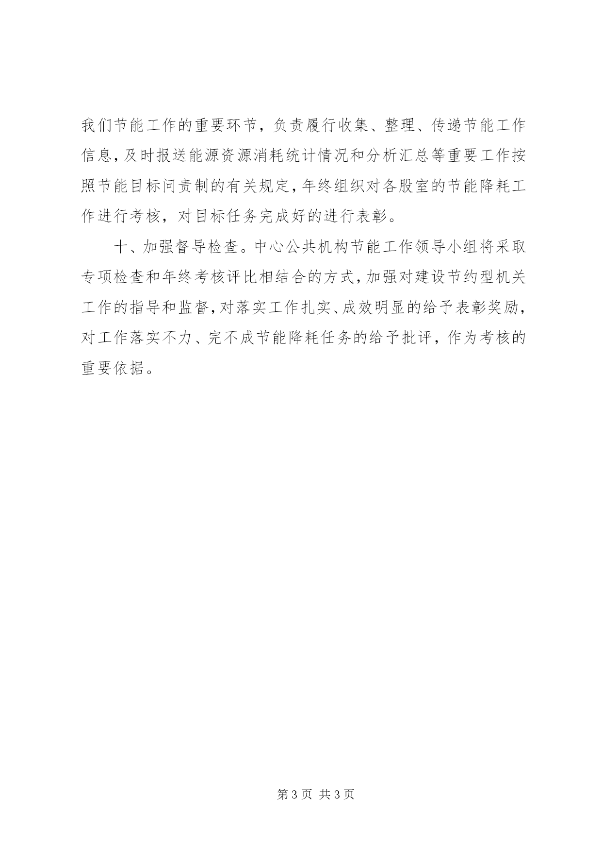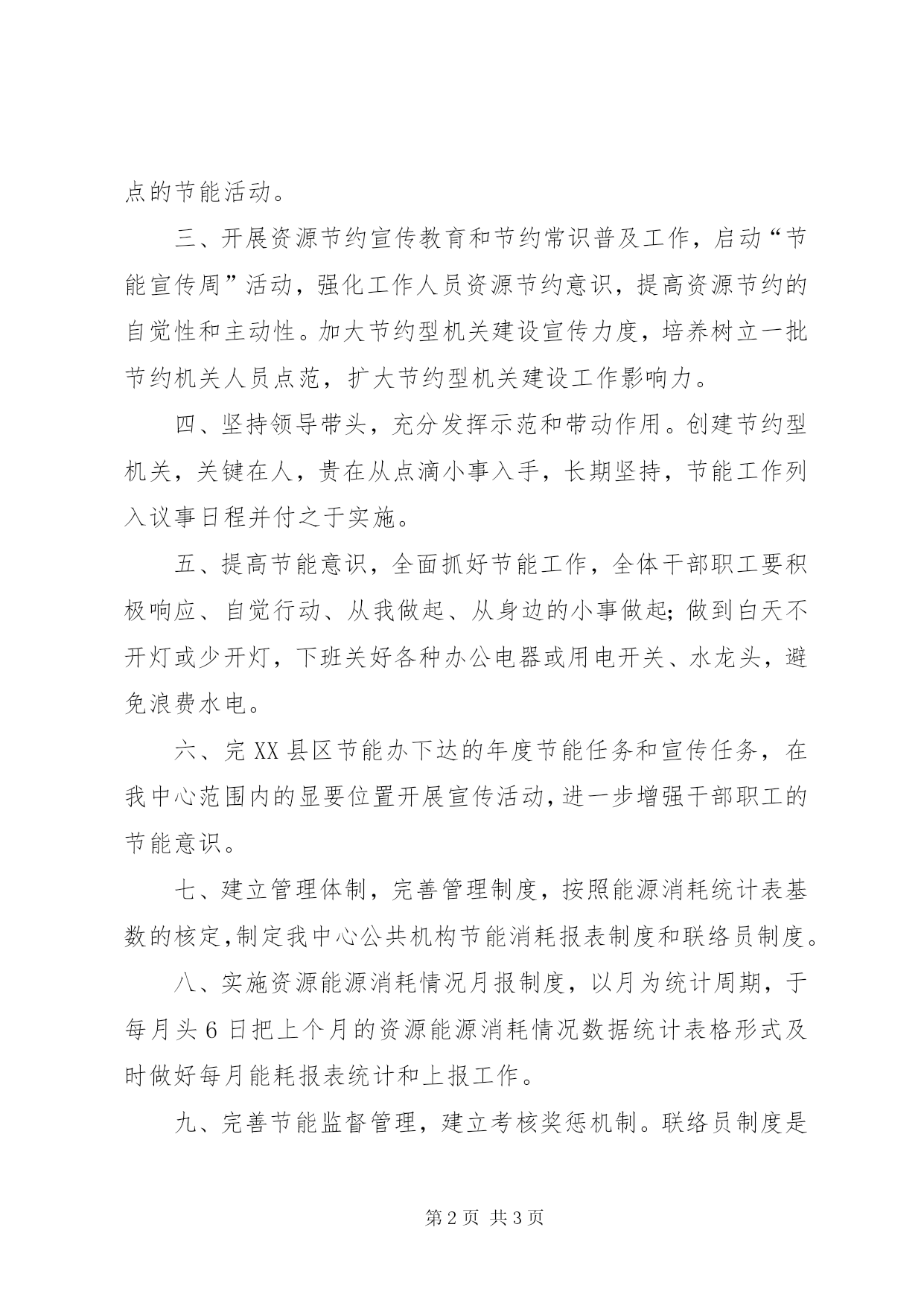 第PAGE\*Arabic\*MERGEFORMAT3页共NUMPAGES\*MERGEFORMAT3页粮食中心公共机构节能工作计划为贯彻落实《公共机构节能条例》,推动我中心公共机构节能工作深入开展,加快节约型单位建设,结合工作实际,制定2014年公共机构节能工作计划。指导思想以提高公共机构能源利用率为核心,以节电、节水、节油、节办公耗材为主要内容,以制度建设为保障,加强组织领导,强化宣传教育,自觉历行节约,反对铺张浪费,扎实推进公共机构节能工作,为建设“环境友好型、资源节约型”社会做出应有的贡献。基本原则坚持不影响机关工作效率和干部职工生活质量的原则,坚持技术节能和管理节能相结合的原则,坚持突出重点、分类指导的原则,坚持领导干部带头、全体干部职工共同参与的原则。一、拟定2014年节能工作目标,在2013年的基础上全面下降5%,把今年的各种开支,尤其是水、电、油分别控制在较低水平。二、把节约型机关建设工作纳入重要议事日程,结合实际制定公共机构节能工作实施方案,建立相应的领导机构,主要领导亲自抓,分管领导具体抓,建立健全工作责任制,做到层层有责任、逐级抓落实,开展以节电、节水、节油、节约办公用品为重点的节能活动。三、开展资源节约宣传教育和节约常识普及工作,启动“节能宣传周”活动,强化工作人员资源节约意识,提高资源节约的自觉性和主动性。加大节约型机关建设宣传力度,培养树立一批节约机关人员点范,扩大节约型机关建设工作影响力。四、坚持领导带头,充分发挥示范和带动作用。创建节约型机关,关键在人,贵在从点滴小事入手,长期坚持,节能工作列入议事日程并付之于实施。五、提高节能意识,全面抓好节能工作,全体干部职工要积极响应、自觉行动、从我做起、从身边的小事做起;做到白天不开灯或少开灯,下班关好各种办公电器或用电开关、水龙头,避免浪费水电。六、完XX县区节能办下达的年度节能任务和宣传任务,在我中心范围内的显要位置开展宣传活动,进一步增强干部职工的节能意识。七、建立管理体制,完善管理制度,按照能源消耗统计表基数的核定,制定我中心公共机构节能消耗报表制度和联络员制度。八、实施资源能源消耗情况月报制度,以月为统计周期,于每月头6日把上个月的资源能源消耗情况数据统计表格形式及时做好每月能耗报表统计和上报工作。九、完善节能监督管理,建立考核奖惩机制。联络员制度是我们节能工作的重要环节,负责履行收集、整理、传递节能工作信息,及时报送能源资源消耗统计情况和分析汇总等重要工作按照节能目标问责制的有关规定,年终组织对各股室的节能降耗工作进行考核,对目标任务完成好的进行表彰。十、加强督导检查。中心公共机构节能工作领导小组将采取专项检查和年终考核评比相结合的方式,加强对建设节约型机关工作的指导和监督,对落实工作扎实、成效明显的给予表彰奖励,对工作落实不力、完不成节能降耗任务的给予批评,作为考核的重要依据。