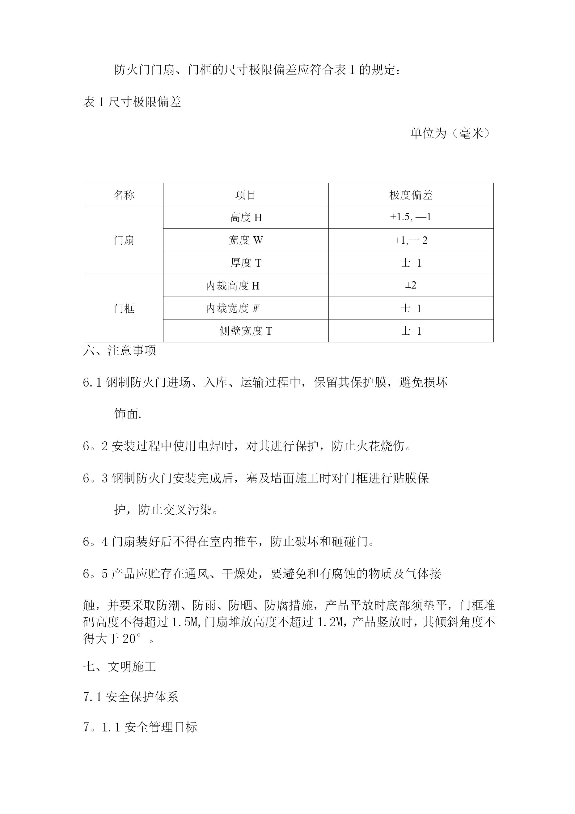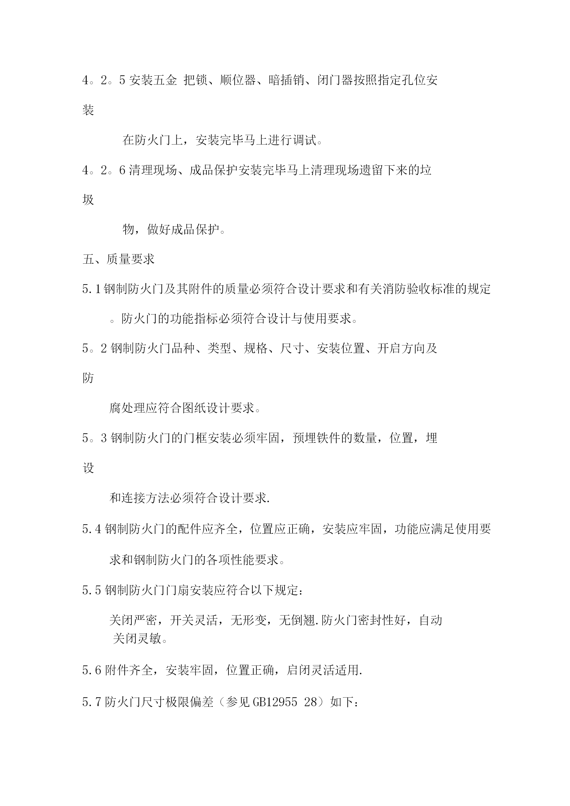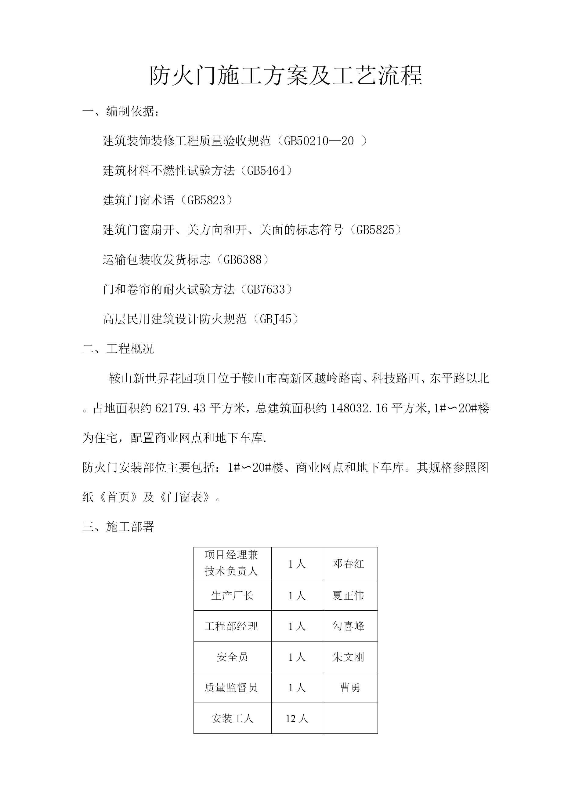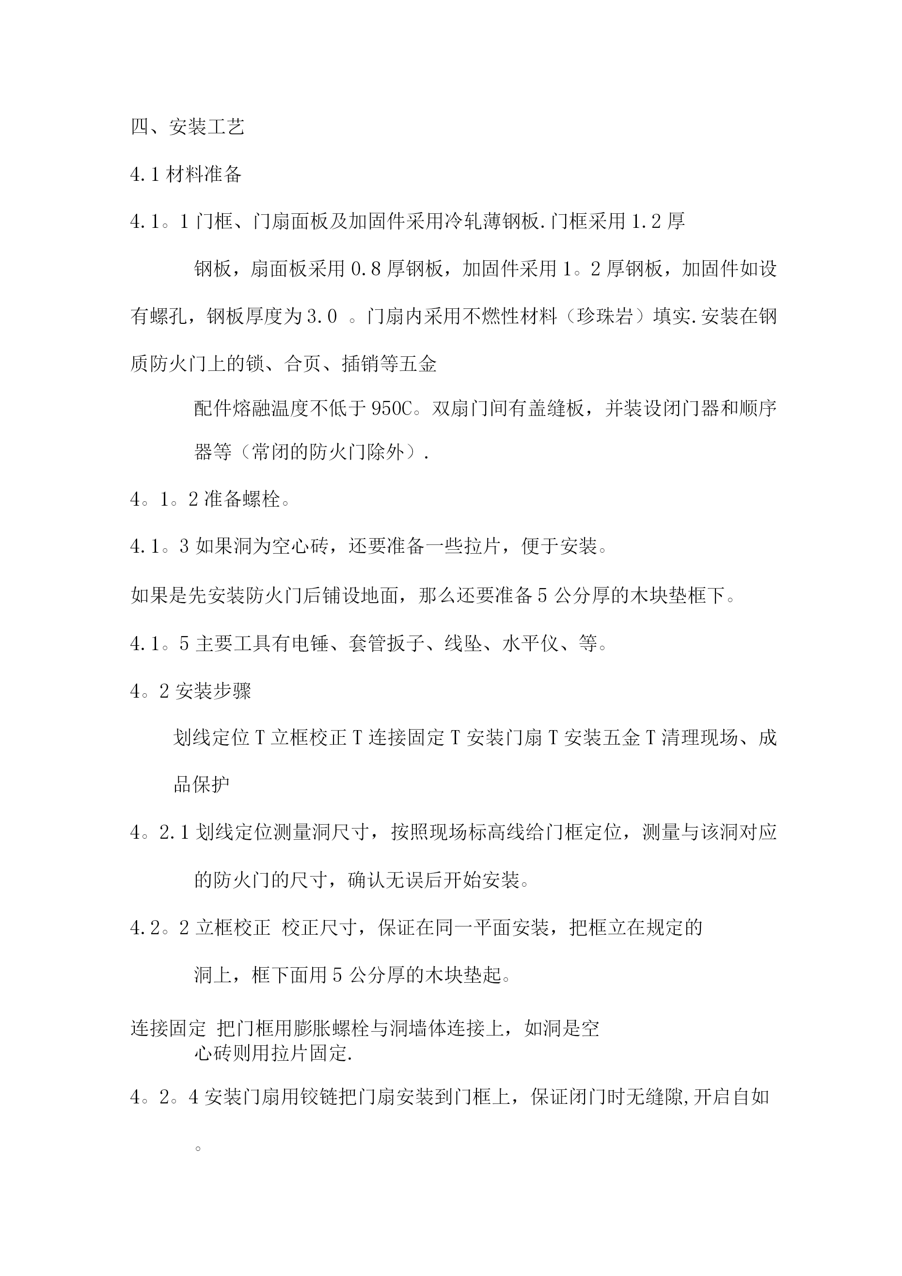 防火门施工方案及工艺流程一、编制依据:建筑装饰装修工程质量验收规范(GB50210—20)建筑材料不燃性试验方法(GB5464)建筑门窗术语(GB5823)建筑门窗扇开、关方向和开、关面的标志符号(GB5825)运输包装收发货标志(GB6388)门和卷帘的耐火试验方法(GB7633)高层民用建筑设计防火规范(GBJ45)二、工程概况鞍山新世界花园项目位于鞍山市高新区越岭路南、科技路西、东平路以北。占地面积约62179.43平方米,总建筑面积约148032.16平方米,1#〜20#楼为住宅,配置商业网点和地下车库.防火门安装部位主要包括:1#〜20#楼、商业网点和地下车库。其规格参照图纸《首页》及《门窗表》。三、施工部署项目经理兼技术负责人1人邓春红生产厂长1人夏正伟工程部经理1人勾喜峰安全员1人朱文刚质量监督员1人曹勇安装工人12人四、安装工艺4.1材料准备4.1。1门框、门扇面板及加固件采用冷轧薄钢板.门框采用1.2厚钢板,扇面板采用0.8厚钢板,加固件采用1。2厚钢板,加固件如设有螺孔,钢板厚度为3.0。门扇内采用不燃性材料(珍珠岩)填实.安装在钢质防火门上的锁、合页、插销等五金配件熔融温度不低于950C。双扇门间有盖缝板,并装设闭门器和顺序器等(常闭的防火门除外).4。1。2准备螺栓。4.1。3如果洞为空心砖,还要准备一些拉片,便于安装。如果是先安装防火门后铺设地面,那么还要准备5公分厚的木块垫框下。4.1。5主要工具有电锤、套管扳子、线坠、水平仪、等。4。2安装步骤划线定位T立框校正T连接固定T安装门扇T安装五金T清理现场、成品保护4。2.1划线定位测量洞尺寸,按照现场标高线给门框定位,测量与该洞对应的防火门的尺寸,确认无误后开始安装。4.2。2立框校正校正尺寸,保证在同一平面安装,把框立在规定的洞上,框下面用5公分厚的木块垫起。连接固定把门框用膨胀螺栓与洞墙体连接上,如洞是空心砖则用拉片固定.4。2。4安装门扇用铰链把门扇安装到门框上,保证闭门时无缝隙,开启自如。4。2。5安装五金把锁、顺位器、暗插销、闭门器按照指定孔位安装在防火门上,安装完毕马上进行调试。4。2。6清理现场、成品保护安装完毕马上清理现场遗留下来的垃圾物,做好成品保护。五、质量要求5.1钢制防火门及其附件的质量必须符合设计要求和有关消防验收标准的规定。防火门的功能指标必须符合设计与使用要求。5。2钢制防火门品种、类型、规格、尺寸、安装位置、开启方向及防腐处理应符合图纸设计要求。5。3钢制防火门的门框安装必须牢固,预埋铁件的数量,位置,埋设和连接方法必须符合设计要求.5.4钢制防火门的配件应齐全,位置应正确,安装应牢固,功能应满足使用要求和钢制防火门的各项性能要求。5.5钢制防火门门扇安装应符合以下规定:关闭严密,开关灵活,无形变,无倒翘.防火门密封性好,自动关闭灵敏。5.6附件齐全,安装牢固,位置正确,启闭灵活适用.5.7防火门尺寸极限偏差(参见GB1295528)如下:防火门门扇、门框的尺寸极限偏差应符合表1的规定:表1尺寸极限偏差单位为(毫米)名称项目极度偏差门扇高度H+1.5,—1宽度W+1,一2厚度T士1门框内裁高度H±2内裁宽度W士1侧壁宽度T士1六、注意事项6.1钢制防火门进场、入库、运输过程中,保留其保护膜,避免损坏饰面.6。2安装过程中使用电焊时,对其进行保护,防止火花烧伤。6。3钢制防火门安装完成后,塞及墙面施工时对门框进行贴膜保护,防止交叉污染。6。4门扇装好后不得在室内推车,防止破坏和砸碰门。6。5产品应贮存在通风、干燥处,要避免和有腐蚀的物质及气体接触,并要采取防潮、防雨、防晒、防腐措施,产品平放时底部须垫平,门框堆码高度不得超过1.5M,门扇堆放高度不超过1.2M,产品竖放时,其倾斜角度不得大于20°。七、文明施工7.1安全保护体系7。1.1安全管理目标零事故是我们的目标,我们致力于消除一切危及人身安全、财产安全的事故或隐患。安全工作的方针安全第一、预防为主,全员动手、综合管理.坚持“管生产必须管安全”、“谁主管,谁负责”的原则。在施工中实行“全员、全过程、全方位、全天候”的安全监督和管理。做到:“我要安全,我懂安全,人人负责,确保安全”,在施工中做到“三不伤害”。7.1。3安全保证体系对安装现场的安全监督与管理,落实到每一个人,每周一次安全会使施工人员加强对安全的意识,对不遵守安全措施并造成安全隐患者视情节轻重予以头警告、经济处罚直到开除。全体项目人员必须认真遵守本投标书中《安全保证措施》,无一例外;在工作现场,纠正他人违章操作和排除险情是每个人义不容辞的职责,不得视而不见。7。2