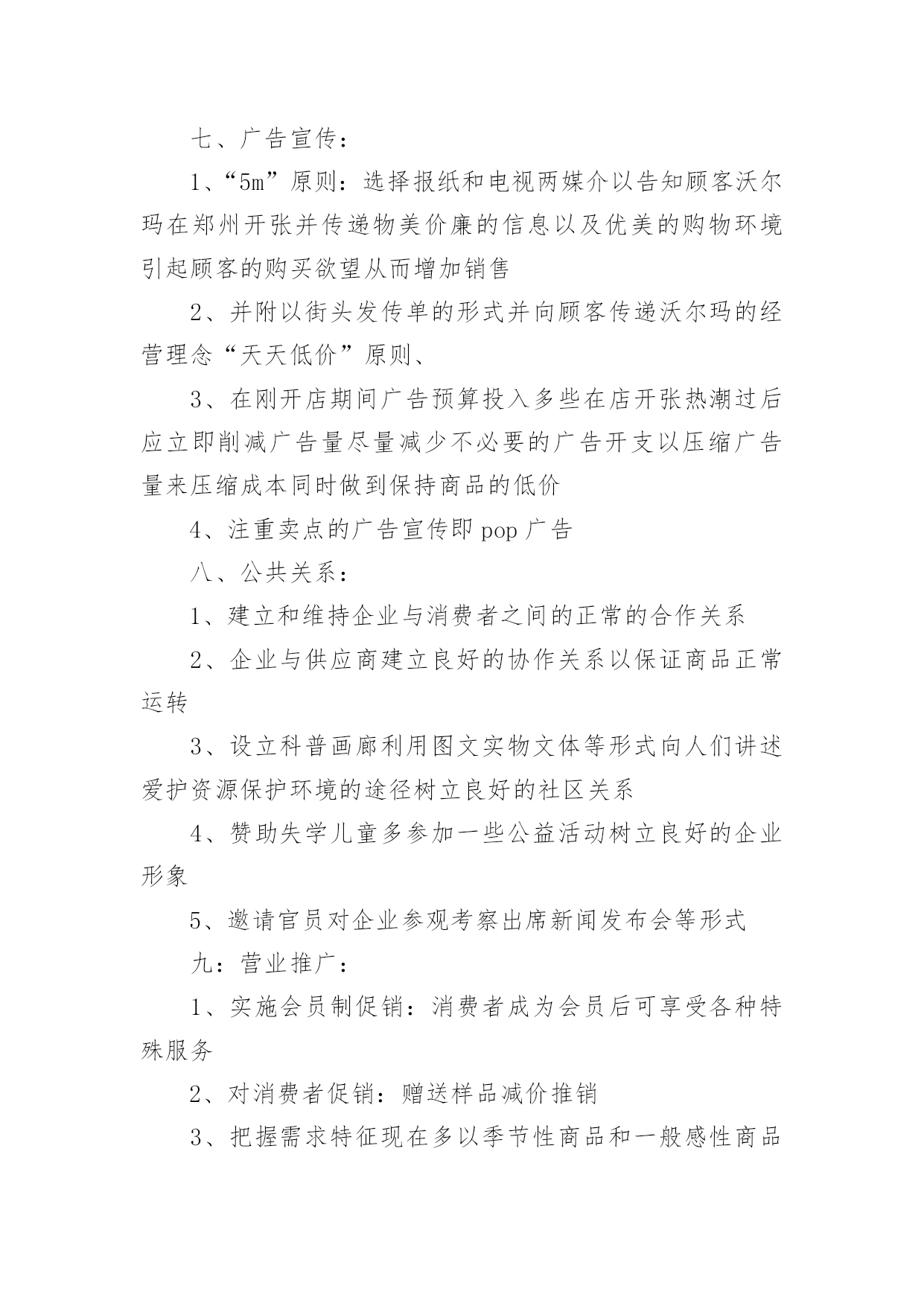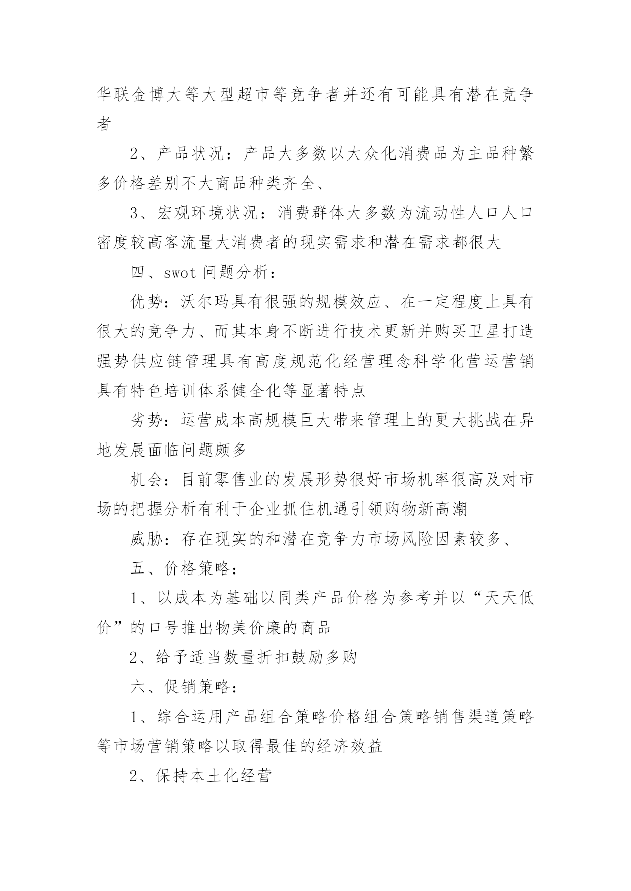 商场促销活动方案商场促销活动方案集锦为了确保事情或工作有序有效开展,通常会被要求事先制定方案,方案是解决一个问题或者一项工程,一个课题的详细过程。那么优秀的方案是什么样的呢?下面是小编为大家整理的商场促销活动方案集锦,欢迎大家分享。一、活动背景沃尔玛由一个乡镇小企业壮大为一个世界皆知的“零售帝国”、并逐步发展成为零售企业的龙头老大其足迹几乎遍布世界各地获得了消费者的一致好评、从一九九六年在深圳开业现已有多家连锁超市也相继开业、现在沃尔玛入驻郑州的第一家分店即将开业其具体活动安排如下:二、活动目的:1、基本目标:为庆祝本店开业及端午佳节到来之际以低价让利物美价廉的产品优质的服务来赢取顾客、扩散商场知名度树立良好的企业形象2、营销目标:通过各项活动扩大顾客的活动参与度拉动销售增加商场效益并通过娱乐营销的方式增加企业利润3、长期目标:提高销售额扩大市场占有率最终实现经济效益和社会效益的统一三、目前营销状况:1、市场状况:选址在繁华商业区周围具有现实的北京华联金博大等大型超市等竞争者并还有可能具有潜在竞争者2、产品状况:产品大多数以大众化消费品为主品种繁多价格差别不大商品种类齐全、3、宏观环境状况:消费群体大多数为流动性人口人口密度较高客流量大消费者的现实需求和潜在需求都很大四、swot问题分析:优势:沃尔玛具有很强的规模效应、在一定程度上具有很大的竞争力、而其本身不断进行技术更新并购买卫星打造强势供应链管理具有高度规范化经营理念科学化营运营销具有特色培训体系健全化等显著特点劣势:运营成本高规模巨大带来管理上的更大挑战在异地发展面临问题颇多机会:目前零售业的发展形势很好市场机率很高及对市场的把握分析有利于企业抓住机遇引领购物新高潮威胁:存在现实的和潜在竞争力市场风险因素较多、五、价格策略:1、以成本为基础以同类产品价格为参考并以“天天低价”的口号推出物美价廉的商品2、给予适当数量折扣鼓励多购六、促销策略:1、综合运用产品组合策略价格组合策略销售渠道策略等市场营销策略以取得最佳的经济效益2、保持本土化经营七、广告宣传:1、“5m”原则:选择报纸和电视两媒介以告知顾客沃尔玛在郑州开张并传递物美价廉的信息以及优美的购物环境引起顾客的购买欲望从而增加销售2、并附以街头发传单的形式并向顾客传递沃尔玛的经营理念“天天低价”原则、3、在刚开店期间广告预算投入多些在店开张热潮过后应立即削减广告量尽量减少不必要的广告开支以压缩广告量来压缩成本同时做到保持商品的低价4、注重卖点的广告宣传即pop广告八、公共关系:1、建立和维持企业与消费者之间的正常的合作关系2、企业与供应商建立良好的协作关系以保证商品正常运转3、设立科普画廊利用图文实物文体等形式向人们讲述爱护资源保护环境的途径树立良好的社区关系4、赞助失学儿童多参加一些公益活动树立良好的企业形象5、邀请官员对企业参观考察出席新闻发布会等形式九:营业推广:1、实施会员制促销:消费者成为会员后可享受各种特殊服务2、对消费者促销:赠送样品减价推销3、把握需求特征现在多以季节性商品和一般感性商品进行促销以刺激消费需求扩大销售额十、物流配送:在物流管理上采用配送中心在营业区域内最合适的地点保障促销期间商品的正常运转