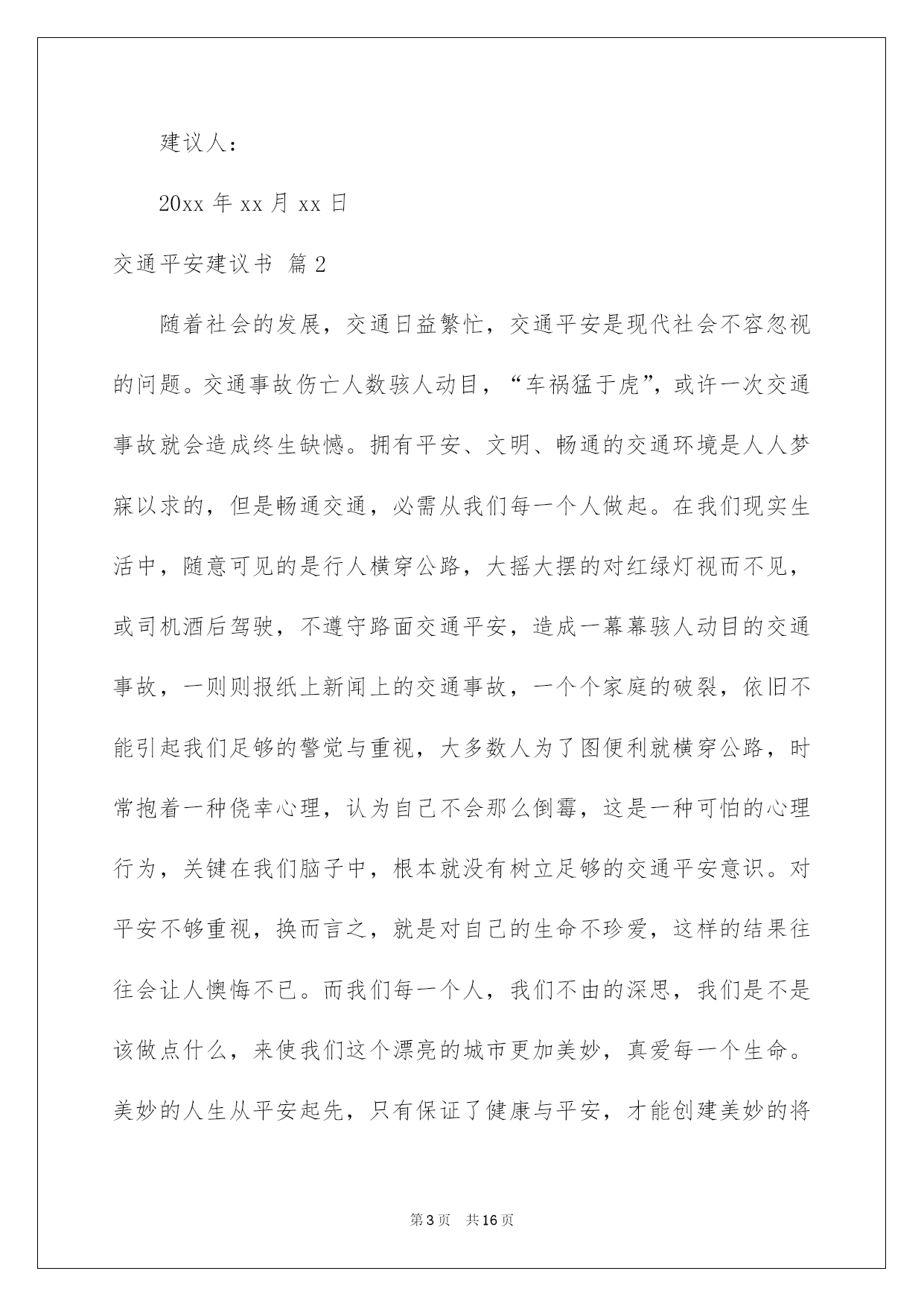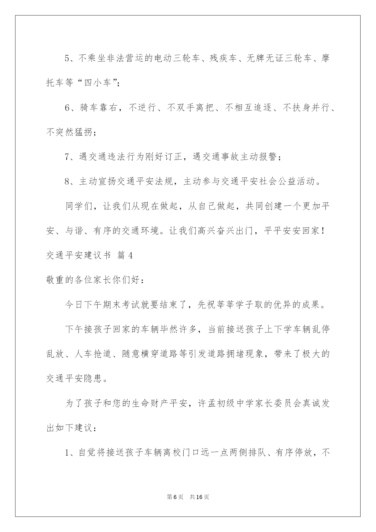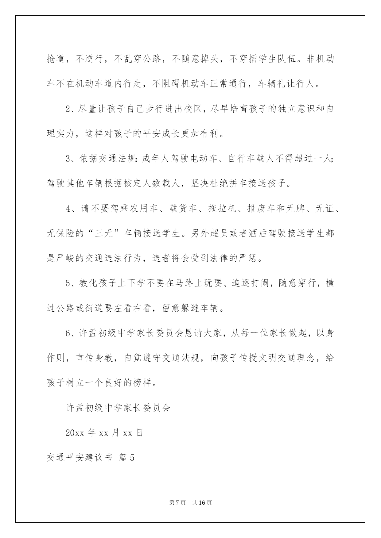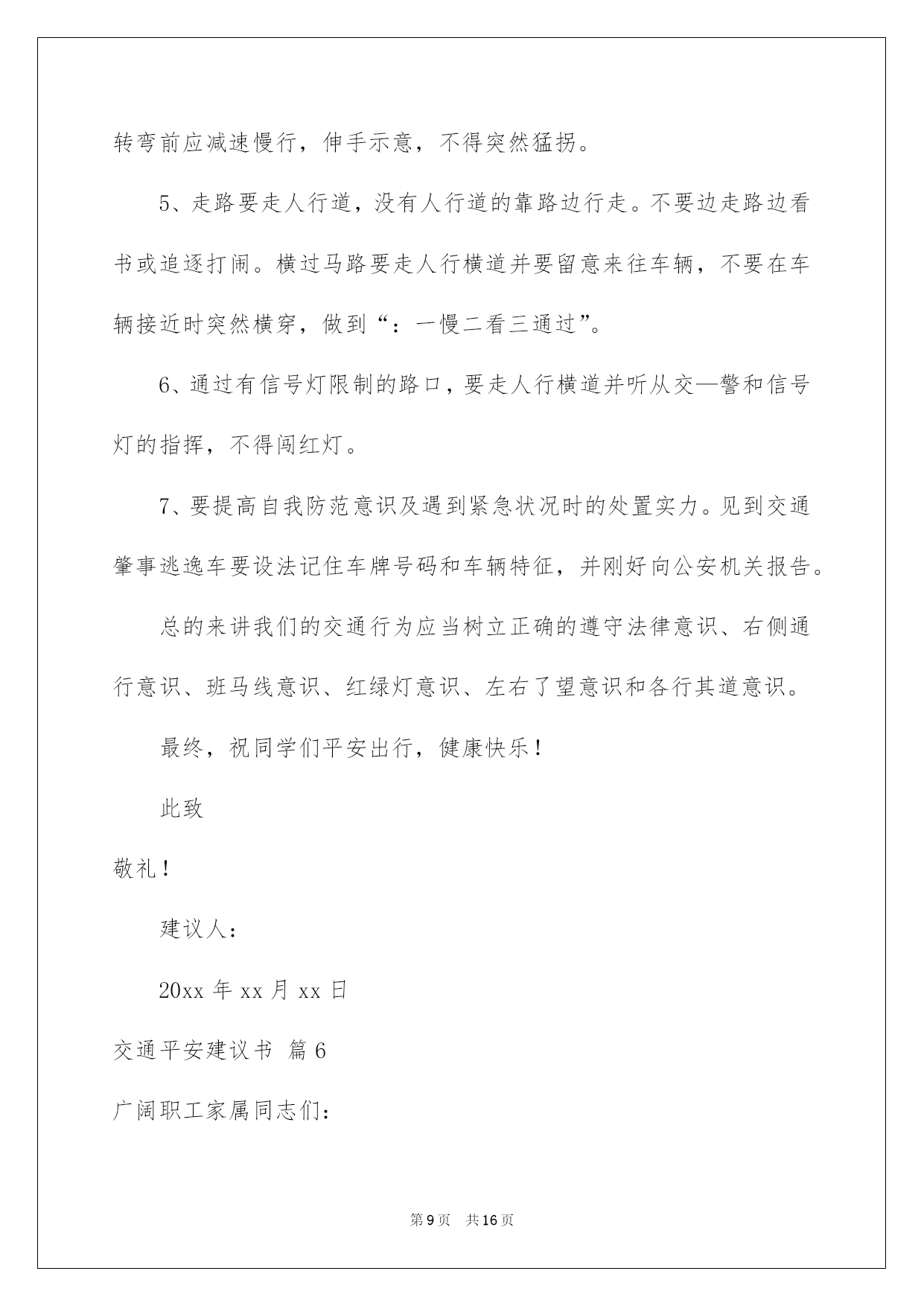 第PAGE\*Arabic\*MERGEFORMAT16页共NUMPAGES\*Arabic\*MERGEFORMAT16页第PAGE\*MERGEFORMAT16页共NUMPAGES\*MERGEFORMAT16页第PAGE\*MERGEFORMAT16页共NUMPAGES\*MERGEFORMAT16页第PAGE\*MERGEFORMAT16页共NUMPAGES\*MERGEFORMAT16页第PAGE\*MERGEFORMAT16页共NUMPAGES\*MERGEFORMAT16页第PAGE\*MERGEFORMAT16页共NUMPAGES\*MERGEFORMAT16页第PAGE\*MERGEFORMAT16页共NUMPAGES\*MERGEFORMAT16页第PAGE\*MERGEFORMAT16页共NUMPAGES\*MERGEFORMAT16页第PAGE\*MERGEFORMAT16页共NUMPAGES\*MERGEFORMAT16页第PAGE\*MERGEFORMAT16页共NUMPAGES\*MERGEFORMAT16页第PAGE\*MERGEFORMAT16页共NUMPAGES\*MERGEFORMAT16页2022交通安全建议书交通平安建议书集锦八篇在现实社会中,能够利用到建议书的场合越来越多,建议书在工作中往往有着承上启下的作用。那么问题来了,究竟应如何写一份恰当的建议书呢?下面是我整理的交通平安建议书8篇,希望能够帮助到大家。交通平安建议书篇1敬重的老师、敬爱的小挚友们:大家早上好!交通平安,人人有责。交通与我们的生活密不行分。在来园、离园的路上,我们常常会看到一些人不遵守交通规则,他们闯红灯、逆向行驶、不走规定车道,这些都是不文明的交通行为。特殊在我们幼儿园门前的那条小路,常常挤满了车辆,人们总是从车缝间穿行,他们淡薄的平安意识增加了很多交通隐患。本周是我园的“交通平安宣扬周”,在此,向全体教职工、小挚友、家长挚友们发出如下建议:1、我们要仔细学习交通平安的法律法规,遵守交通规则,加强平安意识,树立交通平安文明公德。2、当我们走在人来车往的公路时,请时刻保持醒悟的头脑,不在公路上游戏打闹,亲密留意机动车的行驶状况,预防道路交通事故的发生。3、当我们穿过公路时,多一份谦让与耐性,不闯红灯,走人行横道,绝不能为贪一时之快横穿公路,要做到:“红灯停,绿灯行,黄灯停一停。”4、驾驶车辆要严格遵守交通法规,规范行车,规范停车。5、自觉协作交警和协管员做好规范行路、行车。6、遵守交通规则是文明学校评定的重要条件之一,因此,每个教职工都要谛视自己的交通行为是否做到自觉遵守交通法规,是否做到平安出行,把遵守交通法规牢记于心。老师、小挚友们,让我们行动起来,从我做起,从小事做起,为交通的平安及畅通,为珍贵的生命,请遵守交通规则吧!此致敬礼!建议人:20xx年xx月xx日交通平安建议书篇2随着社会的发展,交通日益繁忙,交通平安是现代社会不容忽视的问题。交通事故伤亡人数骇人动目,“车祸猛于虎”,或许一次交通事故就会造成终生缺憾。拥有平安、文明、畅通的交通环境是人人梦寐以求的,但是畅通交通,必需从我们每一个人做起。在我们现实生活中,随意可见的是行人横穿公路,大摇大摆的对红绿灯视而不见,或司机酒后驾驶,不遵守路面交通平安,造成一幕幕骇人动目的交通事故,一则则报纸上新闻上的交通事故,一个个家庭的破裂,依旧不能引起我们足够的警觉与重视,大多数人为了图便利就横穿公路,时常抱着一种侥幸心理,认为自己不会那么倒霉,这是一种可怕的心理行为,关键在我们脑子中,根本就没有树立足够的交通平安意识。对平安不够重视,换而言之,就是对自己的生命不珍爱,这样的结果往往会让人懊悔不已。而我们每一个人,我们不由的深思,我们是不是该做点什么,来使我们这个漂亮的城市更加美妙,真爱每一个生命。美妙的人生从平安起先,只有保证了健康与平安,才能创建美妙的将来,大家肯定要培育文明交通意识,养成自觉遵守交通法规的良好习惯。那么,从今日起,就让我们与生命同行,与平安同行!在此,XX公司为增加员工的交通平安意识,拟开展“交通平安,百日行动”签名活动,并倡议如下:一、关爱生命,从遵守交通平安起。二、多等三分钟,不抢一秒钟。三、细读交通规则,遵守从自己先做起。四、牢记“三个平安”:平安走路,平安乘车,平安行车。五、留意加强宣扬,在全公司内掀起遵守交通规则,真爱生命的风气。通过本次“关爱生命、文明出行”签名活动,让我们心中有交通平安的意识,关爱我们的生命,爱惜我们的生活,营造我们的便利人生,是我们的宗旨与主见。让我们一起遵