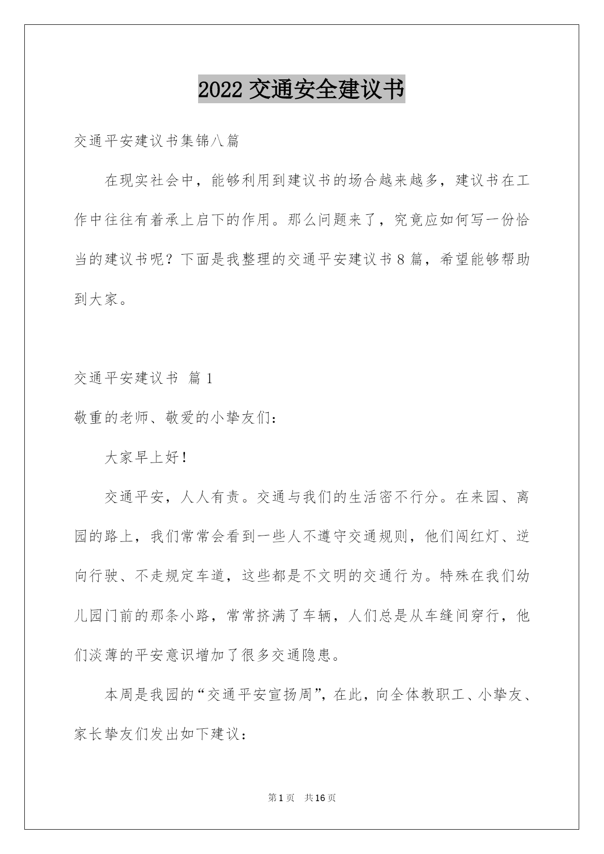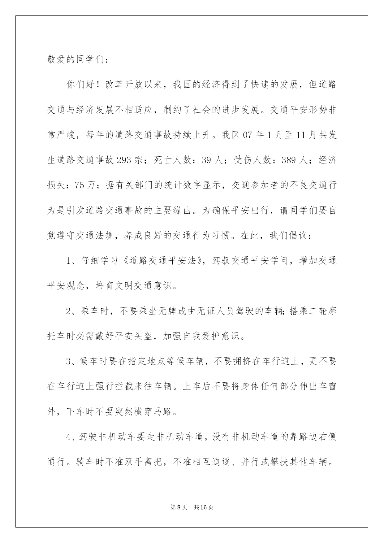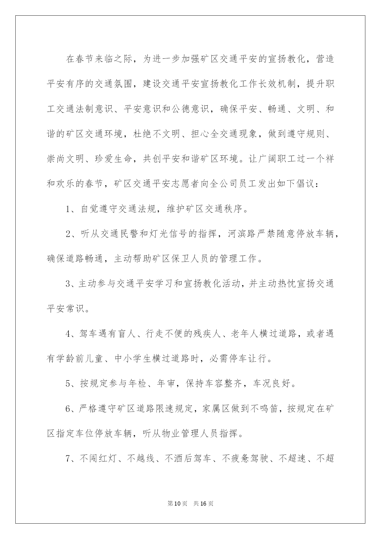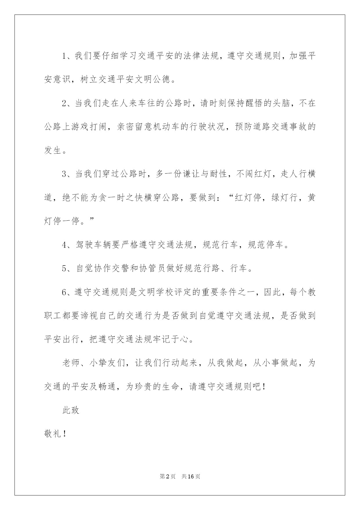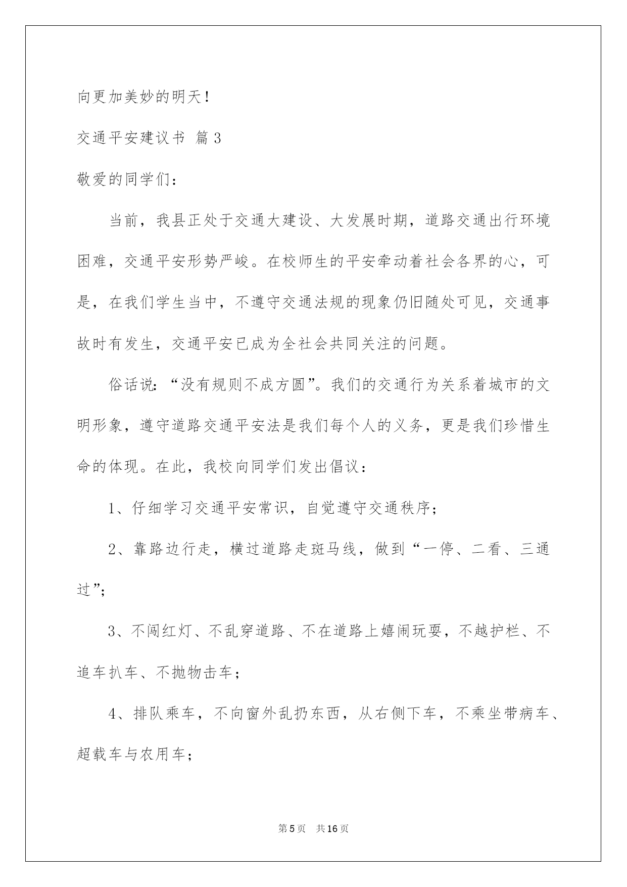 第PAGE\*Arabic\*MERGEFORMAT16页共NUMPAGES\*Arabic\*MERGEFORMAT16页第PAGE\*MERGEFORMAT16页共NUMPAGES\*MERGEFORMAT16页第PAGE\*MERGEFORMAT16页共NUMPAGES\*MERGEFORMAT16页第PAGE\*MERGEFORMAT16页共NUMPAGES\*MERGEFORMAT16页第PAGE\*MERGEFORMAT16页共NUMPAGES\*MERGEFORMAT16页第PAGE\*MERGEFORMAT16页共NUMPAGES\*MERGEFORMAT16页第PAGE\*MERGEFORMAT16页共NUMPAGES\*MERGEFORMAT16页第PAGE\*MERGEFORMAT16页共NUMPAGES\*MERGEFORMAT16页第PAGE\*MERGEFORMAT16页共NUMPAGES\*MERGEFORMAT16页第PAGE\*MERGEFORMAT16页共NUMPAGES\*MERGEFORMAT16页第PAGE\*MERGEFORMAT16页共NUMPAGES\*MERGEFORMAT16页2022交通安全建议书交通平安建议书集锦八篇在现实社会中,能够利用到建议书的场合越来越多,建议书在工作中往往有着承上启下的作用。那么问题来了,究竟应如何写一份恰当的建议书呢?下面是我整理的交通平安建议书8篇,希望能够帮助到大家。交通平安建议书篇1敬重的老师、敬爱的小挚友们:大家早上好!交通平安,人人有责。交通与我们的生活密不行分。在来园、离园的路上,我们常常会看到一些人不遵守交通规则,他们闯红灯、逆向行驶、不走规定车道,这些都是不文明的交通行为。特殊在我们幼儿园门前的那条小路,常常挤满了车辆,人们总是从车缝间穿行,他们淡薄的平安意识增加了很多交通隐患。本周是我园的“交通平安宣扬周”,在此,向全体教职工、小挚友、家长挚友们发出如下建议:1、我们要仔细学习交通平安的法律法规,遵守交通规则,加强平安意识,树立交通平安文明公德。2、当我们走在人来车往的公路时,请时刻保持醒悟的头脑,不在公路上游戏打闹,亲密留意机动车的行驶状况,预防道路交通事故的发生。3、当我们穿过公路时,多一份谦让与耐性,不闯红灯,走人行横道,绝不能为贪一时之快横穿公路,要做到:“红灯停,绿灯行,黄灯停一停。”4、驾驶车辆要严格遵守交通法规,规范行车,规范停车。5、自觉协作交警和协管员做好规范行路、行车。6、遵守交通规则是文明学校评定的重要条件之一,因此,每个教职工都要谛视自己的交通行为是否做到自觉遵守交通法规,是否做到平安出行,把遵守交通法规牢记于心。老师、小挚友们,让我们行动起来,从我做起,从小事做起,为交通的平安及畅通,为珍贵的生命,请遵守交通规则吧!此致敬礼!建议人:20xx年xx月xx日交通平安建议书篇2随着社会的发展,交通日益繁忙,交通平安是现代社会不容忽视的问题。交通事故伤亡人数骇人动目,“车祸猛于虎”,或许一次交通事故就会造成终生缺憾。拥有平安、文明、畅通的交通环境是人人梦寐以求的,但是畅通交通,必需从我们每一个人做起。在我们现实生活中,随意可见的是行人横穿公路,大摇大摆的对红绿灯视而不见,或司机酒后驾驶,不遵守路面交通平安,造成一幕幕骇人动目的交通事故,一则则报纸上新闻上的交通事故,一个个家庭的破裂,依旧不能引起我们足够的警觉与重视,大多数人为了图便利就横穿公路,时常抱着一种侥幸心理,认为自己不会那么倒霉,这是一种可怕的心理行为,关键在我们脑子中,根本就没有树立足够的交通平安意识。对平安不够重视,换而言之,就是对自己的生命不珍爱,这样的结果往往会让人懊悔不已。而我们每一个人,我们不由的深思,我们是不是该做点什么,来使我们这个漂亮的城市更加美妙,真爱每一个生命。美妙的人生从平安起先,只有保证了健康与平安,才能创建美妙的将来,大家肯定要培育文明交通意识,养成自觉遵守交通法规的良好习惯。那么,从今日起,就让我们与生命同行,与平安同行!在此,XX公司为增加员工的交通平安意识,拟开展“交通平安,百日行动”签名活动,并倡议如下:一、关爱生命,从遵守交通平安起。二、多等三分钟,不抢一秒钟。三、细读交通规则,遵守从自己先做起。四、牢记“三个平安”:平安走路,平安乘车,平安行车。五、留意加强宣扬,在全公司内掀起遵守交通规则,真爱生命的风气。通过本次“关爱生命、文明出行”签名活动,让我们心中有交通平安的意识,关爱我们的生命,爱惜我们的生活,营造我们的便利人生,是我们的宗旨与主见。让我们一起遵