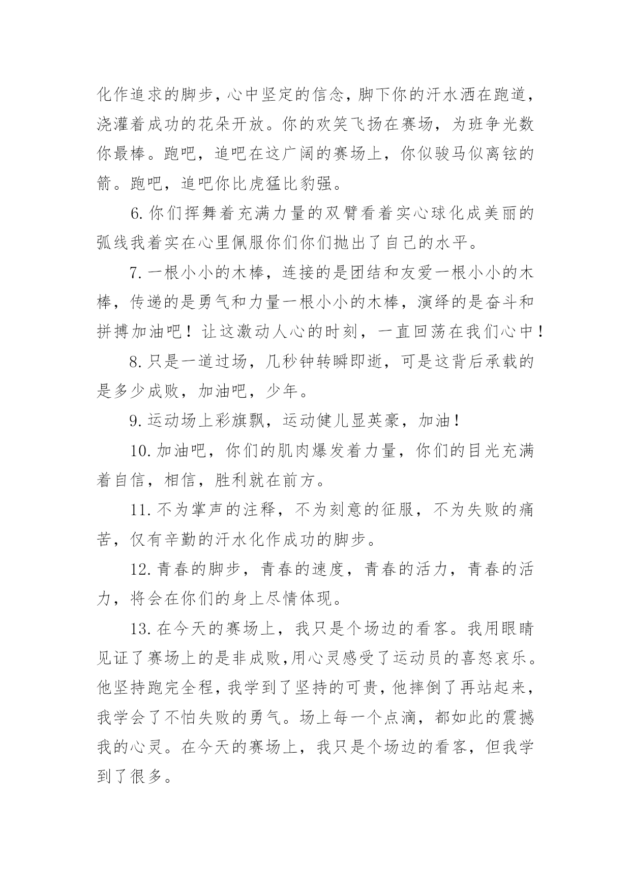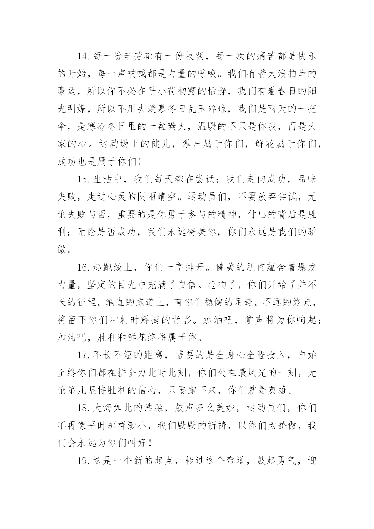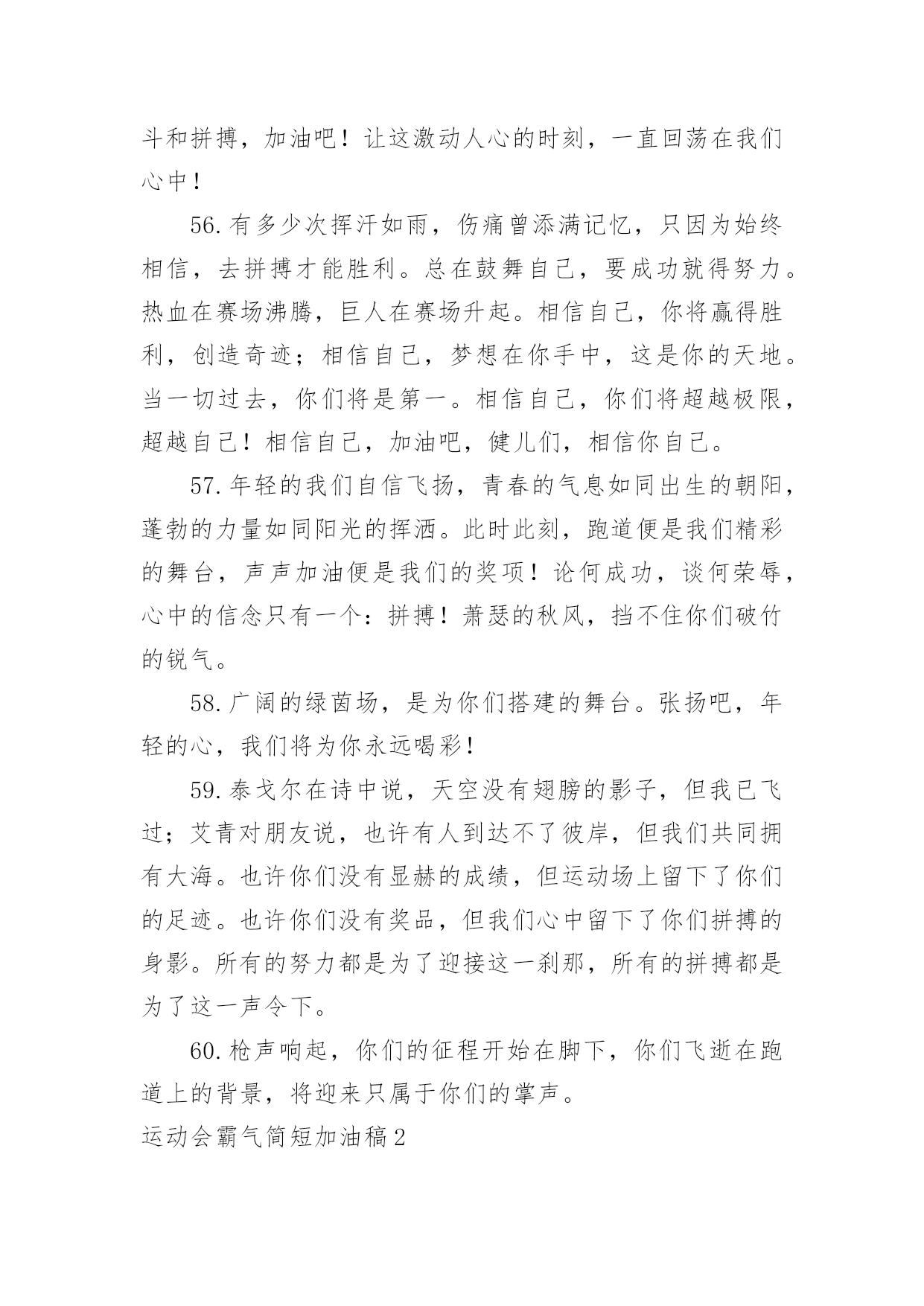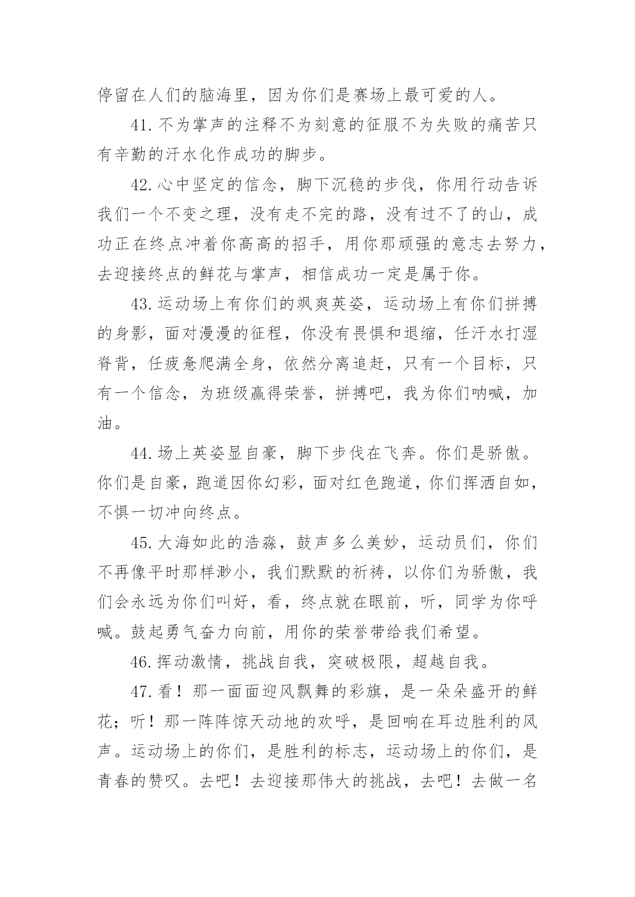 运动会霸气简短加油稿运动会霸气简短加油稿现如今,接触并使用加油稿的人越来越多,加油稿可以促进对方完成目标的进程。你所见过的加油稿是什么样的呢?下面是小编为大家整理的运动会霸气简短加油稿,仅供参考,欢迎大家阅读。运动会霸气简短加油稿11.你的风姿,你的呼吸还有你呼啸而过的飓风,今日注定是属于你的日子,今日你注定将要创造辉煌。2.迎接自我,挑战自我,战胜自我!我们相信你们必须能行,加油吧,运动员!终点就在眼前!3.理想毕竟不同于现实,失败是生活的一部分,谁也无法选择,无法拒绝。人生要自己去拼搏,去奋斗,在风雨中百折不挠勇往前进,在集资的每个驿站上都留下一段不悔的回忆。流泪不是失落,徘徊不是迷惑,成功属于那些战胜失败,坚持不懈、勇于追求梦想的人。加油吧,运动健儿们!4.真心祝愿机会是什么?是不可错过的刹那间。呐喊是什么?是为那刹那间的真心祝愿。加油加油你肯定听到了那一声声呐喊你肯定看到了那双双期待的眼睛你肯定感受到了那发自内心的祝愿。5.不为掌声的诠释,不为刻意的征服,只有辛勤的汗水化作追求的脚步,心中坚定的信念,脚下你的汗水洒在跑道,浇灌着成功的花朵开放。你的欢笑飞扬在赛场,为班争光数你最棒。跑吧,追吧在这广阔的赛场上,你似骏马似离铉的箭。跑吧,追吧你比虎猛比豹强。6.你们挥舞着充满力量的双臂看着实心球化成美丽的弧线我着实在心里佩服你们你们抛出了自己的水平。7.一根小小的木棒,连接的是团结和友爱一根小小的木棒,传递的是勇气和力量一根小小的木棒,演绎的是奋斗和拼搏加油吧!让这激动人心的时刻,一直回荡在我们心中!8.只是一道过场,几秒钟转瞬即逝,可是这背后承载的是多少成败,加油吧,少年。9.运动场上彩旗飘,运动健儿显英豪,加油!10.加油吧,你们的肌肉爆发着力量,你们的目光充满着自信,相信,胜利就在前方。11.不为掌声的注释,不为刻意的征服,不为失败的痛苦,仅有辛勤的汗水化作成功的脚步。12.青春的脚步,青春的速度,青春的活力,青春的活力,将会在你们的身上尽情体现。13.在今天的赛场上,我只是个场边的看客。我用眼睛见证了赛场上的是非成败,用心灵感受了运动员的喜怒哀乐。他坚持跑完全程,我学到了坚持的可贵,他摔倒了再站起来,我学会了不怕失败的勇气。场上每一个点滴,都如此的震撼我的心灵。在今天的赛场上,我只是个场边的看客,但我学到了很多。14.每一份辛劳都有一份收获,每一次的痛苦都是快乐的开始,每一声呐喊都是力量的呼唤。我们有着大浪拍岸的豪迈,所以你不必在乎小荷初露的恬静,我们有着春日的阳光明媚,所以不用去羡慕冬日乱玉碎琼,我们是雨天的一把伞,是寒冷冬日里的一盆碳火,温暖的不只是你我,而是大家的心。运动场上的健儿,掌声属于你们,鲜花属于你们,成功也是属于你们!15.生活中,我们每天都在尝试;我们走向成功,品味失败,走过心灵的阴雨晴空。运动员们,不要放弃尝试,无论失败与否,重要的是你勇于参与的精神,付出的背后是胜利;无论是否成功,我们永远赞美你,你们永远是我们的骄傲。16.起跑线上,你们一字排开。健美的肌肉蕴含着爆发力量,坚定的目光中充满了自信。枪响了,你们开始了并不长的征程。笔直的跑道上,有你们稳健的足迹。不远的终点,将留下你们冲刺时矫捷的背影。加油吧,掌声将为你响起;加油吧,胜利和鲜花终将属于你。17.不长不短的距离,需要的是全身心全程投入,自始至终你们都在拼全力此时此刻,你们处在最风光的一刻,无论第几坚持胜利的信心,只要跑下来,你们就是英雄。18.大海如此的浩淼,鼓声多么美妙,运动员们,你们不再像平时那样渺小,我们默默的祈祷,以你们为骄傲,我们会永远为你们叫好!19.这是一个新的起点,转过这个弯道,鼓起勇气,迎接你的将是最终的挑战,最终的胜利。20.枪声响起,冲刺向前,一马当先,咫尺天涯,永恒之巅,冲吧,向着未来冲刺,向着胜利冲刺。21.温暖的阳光洒在赛场上,男子乙组标枪的比赛即将开始。赛场上,一道道优美的弧线将轻盈地划过天空。健儿们用手中的标枪向距离的权限发起一轮又一轮的挑战。标枪在空中轻盈的姿态,是健儿们强健的力量和熟练的技巧的结合。谁能在这场激烈的竞争中获胜让我们拭目以待,让我们为他们呐喊助威吧!仅有将力量与技巧合二为一的人,才能获得胜利的桂冠!22.踏上跑道,是一种选择。离开起点,是一种勇气。驰骋赛场,是一种胜利。23.向参加校运会的体育健儿学习致敬!24.你的汗水洒在跑道,浇灌着成功的花朵开放。你的欢笑飞扬在赛场,为班争光数你最棒。跑吧,追吧在这广阔的赛场上,你似骏马似离铉的箭。跑吧,追吧你比虎猛比豹强!25.投球奔跑本领高,运动健儿多自豪,风流人物看今朝。26.你用行动述说着过城的重要,没有无尽的终点,没有无法攀登的险峰,期望载着终点在向你微笑,拼搏吧!经历是一种精彩,迸发你全部的能量,成功是你汗水的写照。27.勇夺第一
