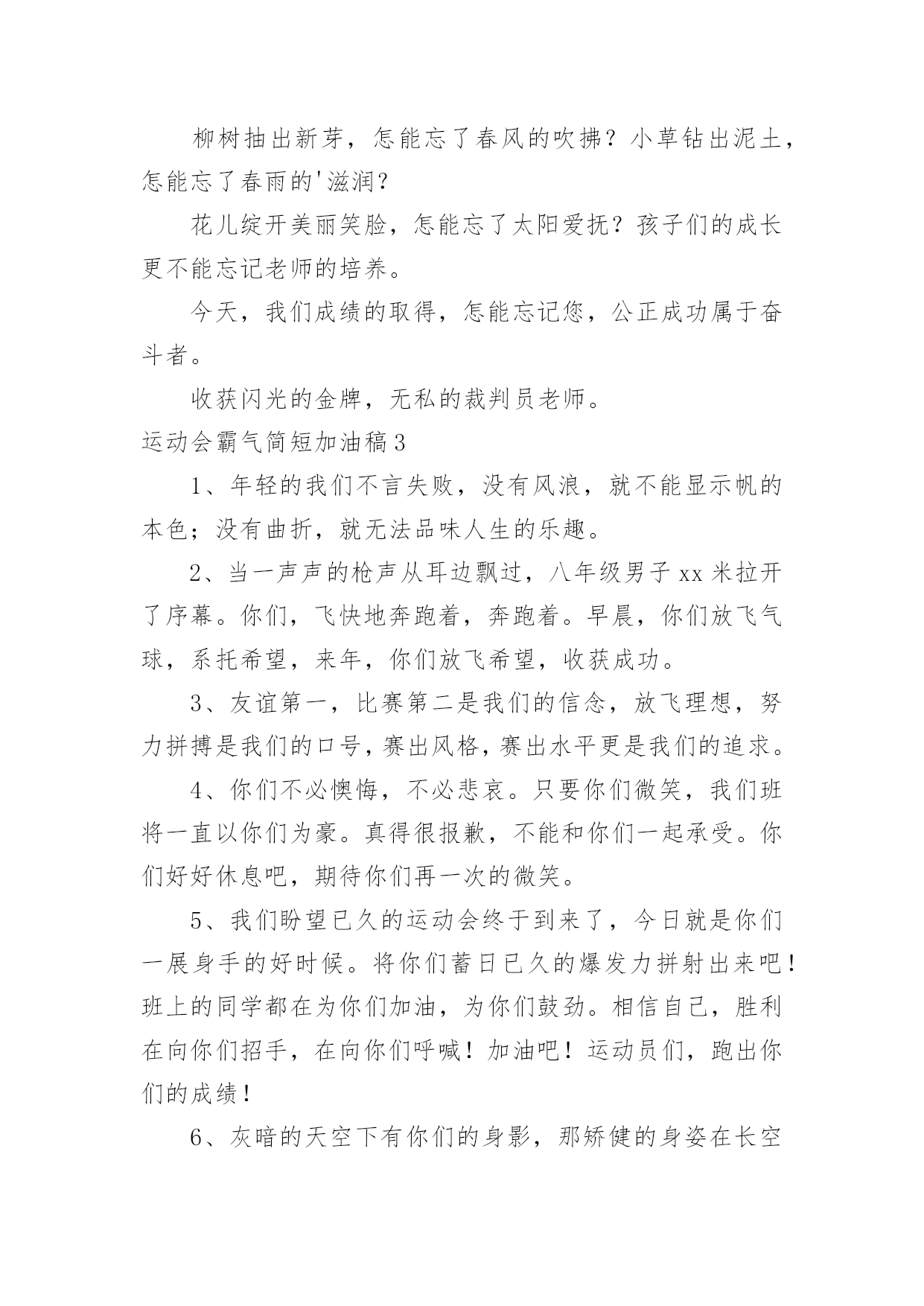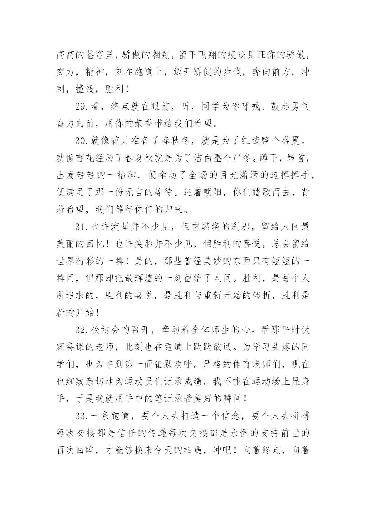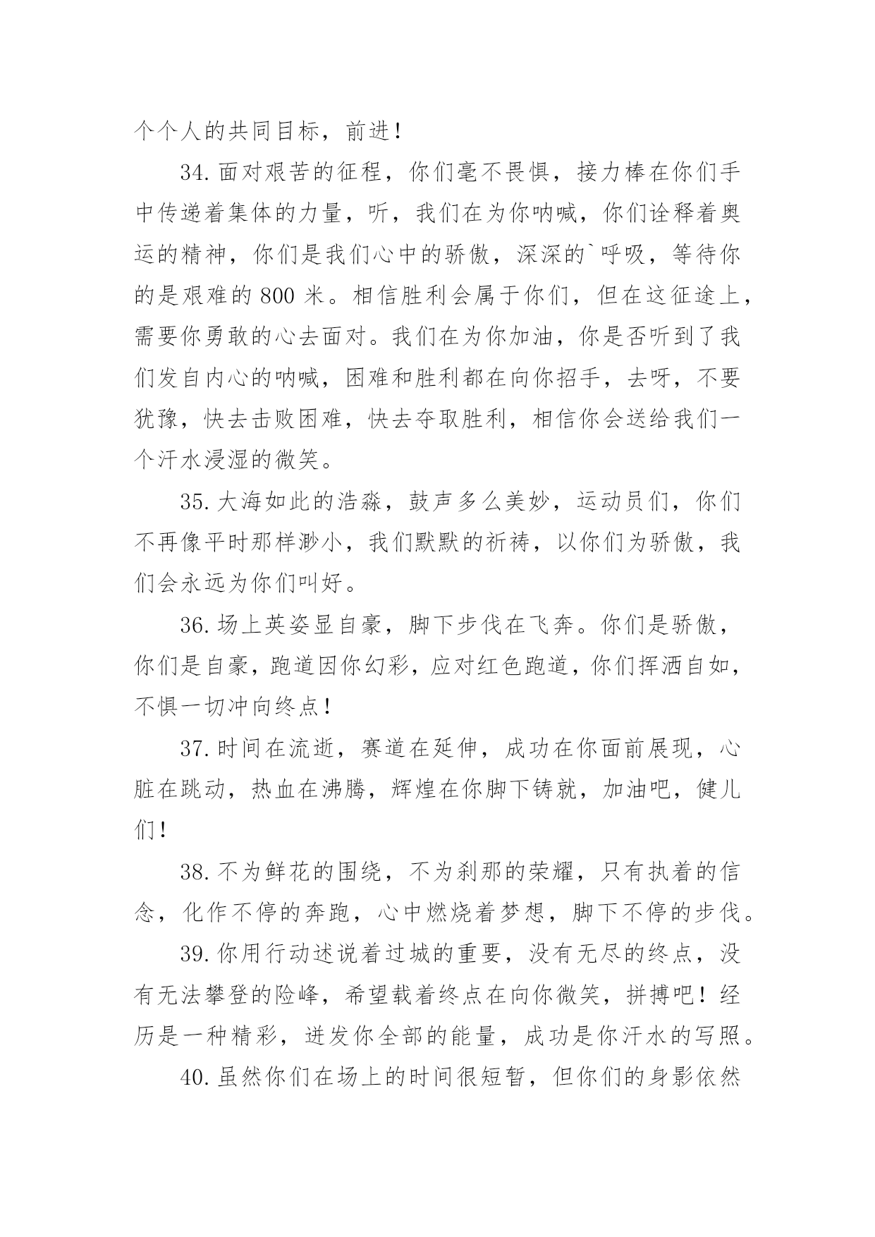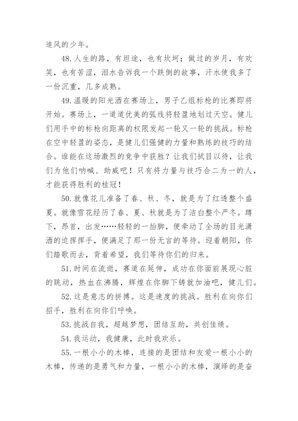 运动会霸气简短加油稿运动会霸气简短加油稿现如今,接触并使用加油稿的人越来越多,加油稿可以促进对方完成目标的进程。你所见过的加油稿是什么样的呢?下面是小编为大家整理的运动会霸气简短加油稿,仅供参考,欢迎大家阅读。运动会霸气简短加油稿11.你的风姿,你的呼吸还有你呼啸而过的飓风,今日注定是属于你的日子,今日你注定将要创造辉煌。2.迎接自我,挑战自我,战胜自我!我们相信你们必须能行,加油吧,运动员!终点就在眼前!3.理想毕竟不同于现实,失败是生活的一部分,谁也无法选择,无法拒绝。人生要自己去拼搏,去奋斗,在风雨中百折不挠勇往前进,在集资的每个驿站上都留下一段不悔的回忆。流泪不是失落,徘徊不是迷惑,成功属于那些战胜失败,坚持不懈、勇于追求梦想的人。加油吧,运动健儿们!4.真心祝愿机会是什么?是不可错过的刹那间。呐喊是什么?是为那刹那间的真心祝愿。加油加油你肯定听到了那一声声呐喊你肯定看到了那双双期待的眼睛你肯定感受到了那发自内心的祝愿。5.不为掌声的诠释,不为刻意的征服,只有辛勤的汗水化作追求的脚步,心中坚定的信念,脚下你的汗水洒在跑道,浇灌着成功的花朵开放。你的欢笑飞扬在赛场,为班争光数你最棒。跑吧,追吧在这广阔的赛场上,你似骏马似离铉的箭。跑吧,追吧你比虎猛比豹强。6.你们挥舞着充满力量的双臂看着实心球化成美丽的弧线我着实在心里佩服你们你们抛出了自己的水平。7.一根小小的木棒,连接的是团结和友爱一根小小的木棒,传递的是勇气和力量一根小小的木棒,演绎的是奋斗和拼搏加油吧!让这激动人心的时刻,一直回荡在我们心中!8.只是一道过场,几秒钟转瞬即逝,可是这背后承载的是多少成败,加油吧,少年。9.运动场上彩旗飘,运动健儿显英豪,加油!10.加油吧,你们的肌肉爆发着力量,你们的目光充满着自信,相信,胜利就在前方。11.不为掌声的注释,不为刻意的征服,不为失败的痛苦,仅有辛勤的汗水化作成功的脚步。12.青春的脚步,青春的速度,青春的活力,青春的活力,将会在你们的身上尽情体现。13.在今天的赛场上,我只是个场边的看客。我用眼睛见证了赛场上的是非成败,用心灵感受了运动员的喜怒哀乐。他坚持跑完全程,我学到了坚持的可贵,他摔倒了再站起来,我学会了不怕失败的勇气。场上每一个点滴,都如此的震撼我的心灵。在今天的赛场上,我只是个场边的看客,但我学到了很多。14.每一份辛劳都有一份收获,每一次的痛苦都是快乐的开始,每一声呐喊都是力量的呼唤。我们有着大浪拍岸的豪迈,所以你不必在乎小荷初露的恬静,我们有着春日的阳光明媚,所以不用去羡慕冬日乱玉碎琼,我们是雨天的一把伞,是寒冷冬日里的一盆碳火,温暖的不只是你我,而是大家的心。运动场上的健儿,掌声属于你们,鲜花属于你们,成功也是属于你们!15.生活中,我们每天都在尝试;我们走向成功,品味失败,走过心灵的阴雨晴空。运动员们,不要放弃尝试,无论失败与否,重要的是你勇于参与的精神,付出的背后是胜利;无论是否成功,我们永远赞美你,你们永远是我们的骄傲。16.起跑线上,你们一字排开。健美的肌肉蕴含着爆发力量,坚定的目光中充满了自信。枪响了,你们开始了并不长的征程。笔直的跑道上,有你们稳健的足迹。不远的终点,将留下你们冲刺时矫捷的背影。加油吧,掌声将为你响起;加油吧,胜利和鲜花终将属于你。17.不长不短的距离,需要的是全身心全程投入,自始至终你们都在拼全力此时此刻,你们处在最风光的一刻,无论第几坚持胜利的信心,只要跑下来,你们就是英雄。18.大海如此的浩淼,鼓声多么美妙,运动员们,你们不再像平时那样渺小,我们默默的祈祷,以你们为骄傲,我们会永远为你们叫好!19.这是一个新的起点,转过这个弯道,鼓起勇气,迎接你的将是最终的挑战,最终的胜利。20.枪声响起,冲刺向前,一马当先,咫尺天涯,永恒之巅,冲吧,向着未来冲刺,向着胜利冲刺。21.温暖的阳光洒在赛场上,男子乙组标枪的比赛即将开始。赛场上,一道道优美的弧线将轻盈地划过天空。健儿们用手中的标枪向距离的权限发起一轮又一轮的挑战。标枪在空中轻盈的姿态,是健儿们强健的力量和熟练的技巧的结合。谁能在这场激烈的竞争中获胜让我们拭目以待,让我们为他们呐喊助威吧!仅有将力量与技巧合二为一的人,才能获得胜利的桂冠!22.踏上跑道,是一种选择。离开起点,是一种勇气。驰骋赛场,是一种胜利。23.向参加校运会的体育健儿学习致敬!24.你的汗水洒在跑道,浇灌着成功的花朵开放。你的欢笑飞扬在赛场,为班争光数你最棒。跑吧,追吧在这广阔的赛场上,你似骏马似离铉的箭。跑吧,追吧你比虎猛比豹强!25.投球奔跑本领高,运动健儿多自豪,风流人物看今朝。26.你用行动述说着过城的重要,没有无尽的终点,没有无法攀登的险峰,期望载着终点在向你微笑,拼搏吧!经历是一种精彩,迸发你全部的能量,成功是你汗水的写照。27.勇夺第一