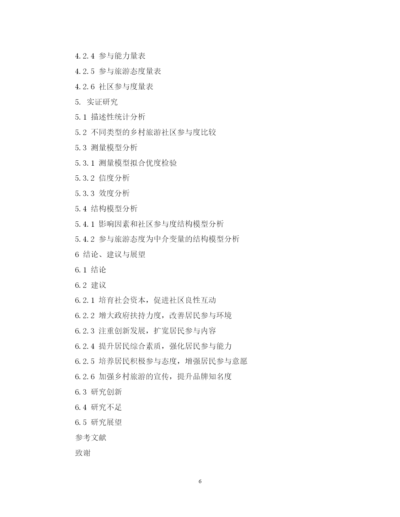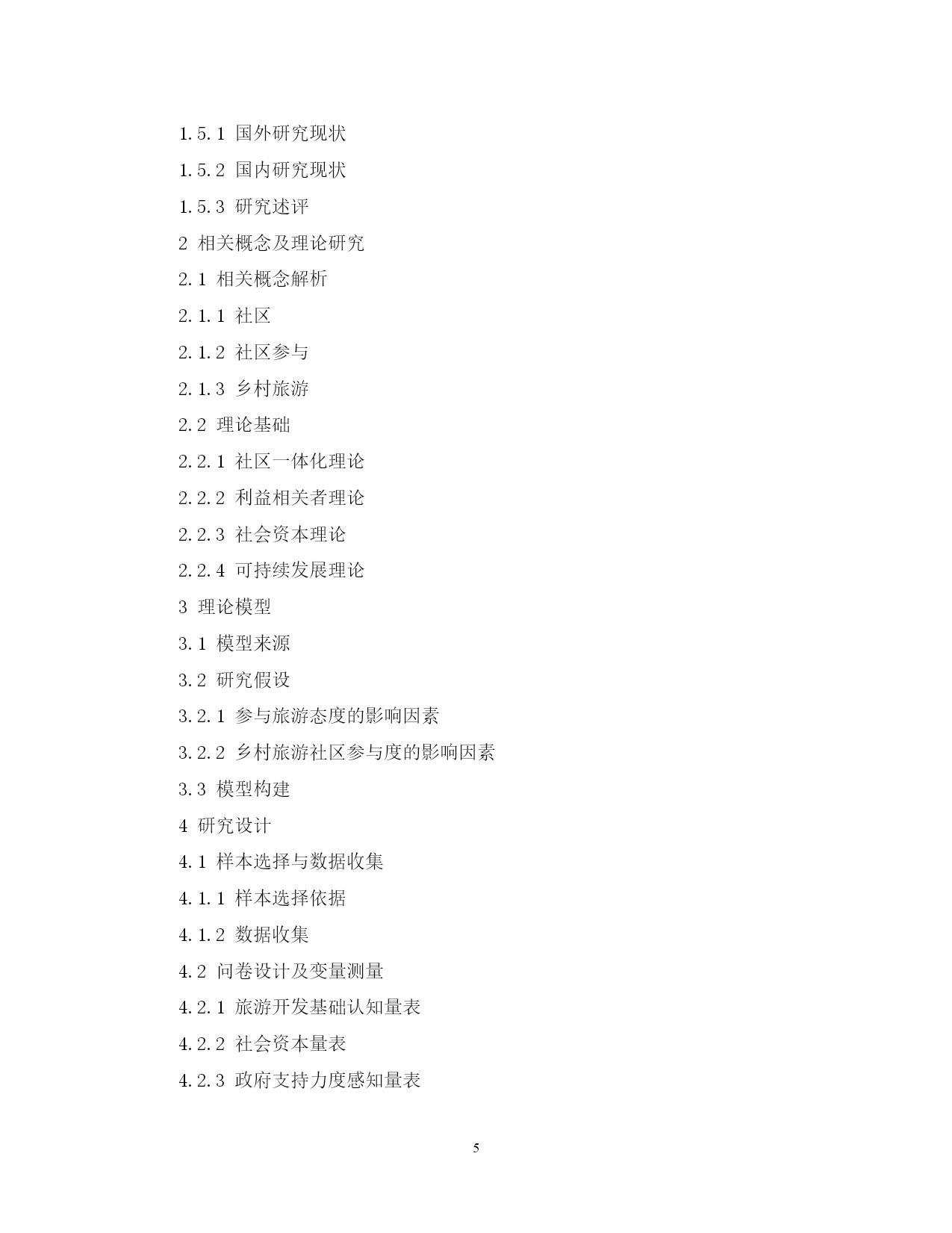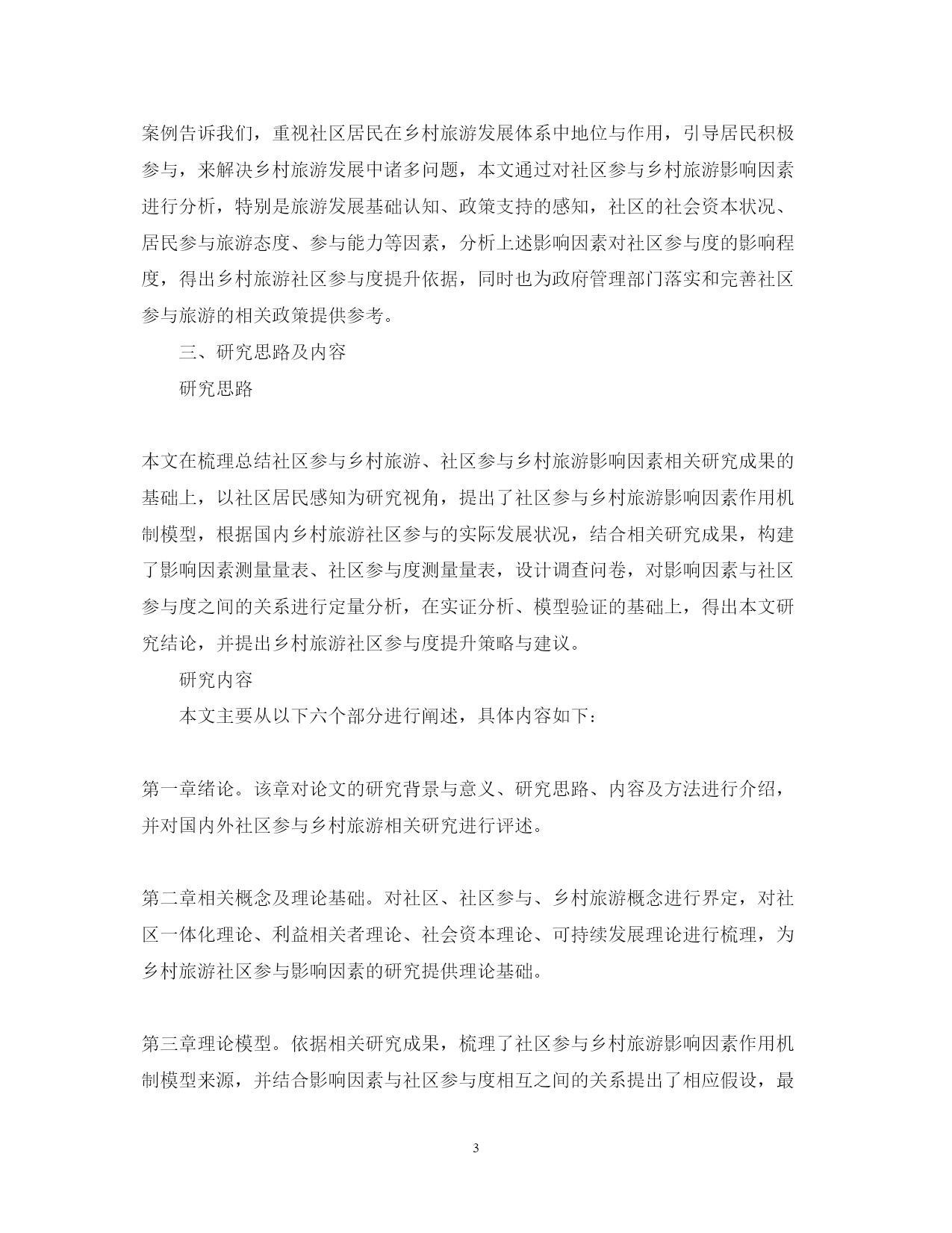 此资料由网络收集而来,如有侵权请告知上传者立即删除。资料共分享,我们负责传递知识。PAGEPAGE9毕业论文开题报告:乡村旅游一、研究背景乡村旅游在我国起步较晚,在20世纪80年代以后开始萌芽,经过三十多年发展,乡村旅游已具有一定规模,形成了围绕大中城市、名胜景区、山水生态区、特色农业区的乡村旅游发展格局,并涌现出一批先进典型。据有关资料统计,2019年,全国休闲农业和乡村旅游接待游客近21亿人次,约占国内旅游接待总量的1/2,营业收入超过5700亿元,带动672万户农民受益。2019年中国休闲农业与乡村旅游行业现状研究分析与发展趋势预测报告显示,在近5年的时间里,休闲农业与乡村旅游行业市场规模快速发展。经历初创期--发展期--扩张期--升级期四个发展阶段,乡村旅游从过去的小旅游、中旅游时代,现已进入到大旅游发展时代,发展形势迅猛。政策支持为乡村旅游快速发展提供了坚强的后盾。2019年,中央一号文件《关于加大改革创新力度加快农业现代化建设的若干意见》中首次提出推进农业一二三产业融合发展,延长农业产业链,打造特色鲜明的旅游产品。2019年《国民经济和社会发展第十三个五年规划纲要》提出推进精准扶贫,积极对扶贫开发方式进行创新,健全精准扶贫工作机制。2019年,在全国旅游工作报告中,表示积极推进“旅游+农村”,积极发展乡村旅游与休闲农业,并提出要继续进行旅游扶贫模式的推广,加强乡村旅游“千千万万”品牌建设,并突出乡村旅游扶贫在旅游扶贫的重要地位。发展乡村旅游在扩宽居民增收渠道、促进保护农业生态和乡土文化,以及促进农业转型升级具有重要的意义。乡村旅游不仅能够满足都市游客休闲度假的需求,也为发展社区经济投入了鲜活的生命力。首先,发展乡村旅游能够增加社区居民就业机会,带动社区居民增收致富,提升了社区居民生活满意度与幸福指数。其次,发展乡村旅游使当地社区在交通、电力、通讯、水利等基础设施方面得到建设,改善了社区居民生活环境。最后,城乡居民互动的过程中,生活观念、消费意识、价值观念等意识形态相互渗透,有利于提高社区居民文化素质,同时利于提高妇女的地位,使居民见多识广,思想观念发生转变。在区域经济方面,乡村旅游发挥综合带动效应,促进一二三产业融合发展,实现农业与旅游、教育、文化、健康养老等产业深度融,促进农村地区经济结构调整,实现精准扶贫,加快农村地区的城市化进程。二、研究意义理论意义目前,国内外学者关于社区参与乡村旅游影响因素研究所得的成果还较为薄弱,涉及到该领域的学者较少,大部分学者的研究视角多集中于社区参与模式、社区参与机制研究领域,并且对社区参与影响因素研究仅仅停留在定性分析的层面,对于社区居民参与乡村旅游影响因素的重要程度、影响因素的作用机制难以用定量的方式进行表述与呈现。本文通过构建结构方程模型,验证影响因素与社区参与度之间复杂的作用机理,通过量化的形式说明上述关系,为社区参与乡村旅游更深入的研究奠定基础。现实意义以社区为主导的乡村旅游发展模式能够有效增加社区居民收入、保护社区居民利益、减轻社区居民负担等一系列重要的现实问题,对于提高旅游扶贫综合效益、乡村旅游提质升级、推进全域旅游发展具有重要意义。现阶段,国家大力支持旅游扶贫,通过发展旅游带动落后地区经济发展,减小贫富差距,欧美国家的成功案例告诉我们,重视社区居民在乡村旅游发展体系中地位与作用,引导居民积极参与,来解决乡村旅游发展中诸多问题,本文通过对社区参与乡村旅游影响因素进行分析,特别是旅游发展基础认知、政策支持的感知,社区的社会资本状况、居民参与旅游态度、参与能力等因素,分析上述影响因素对社区参与度的影响程度,得出乡村旅游社区参与度提升依据,同时也为政府管理部门落实和完善社区参与旅游的相关政策提供参考。三、研究思路及内容研究思路本文在梳理总结社区参与乡村旅游、社区参与乡村旅游影响因素相关研究成果的基础上,以社区居民感知为研究视角,提出了社区参与乡村旅游影响因素作用机制模型,根据国内乡村旅游社区参与的实际发展状况,结合相关研究成果,构建了影响因素测量量表、社区参与度测量量表,设计调查问卷,对影响因素与社区参与度之间的关系进行定量分析,在实证分析、模型验证的基础上,得出本文研究结论,并提出乡村旅游社区参与度提升策略与建议。研究内容本文主要从以下六个部分进行阐述,具体内容如下:第一章绪论。该章对论文的研究背景与意义、研究思路、内容及方法进行介绍,并对国内外社区参与乡村旅游相关研究进行评述。第二章相关概念及理论基础。对社区、社区参与、乡村旅游概念进行界定,对社区一体化理论、利益相关者理论、社会资本理论、可持续发展理论进行梳理,为乡村旅游社区参与影响因素的研究提供理论基础。第三章理论模型。依据相关研究成果,梳理了社区参与乡