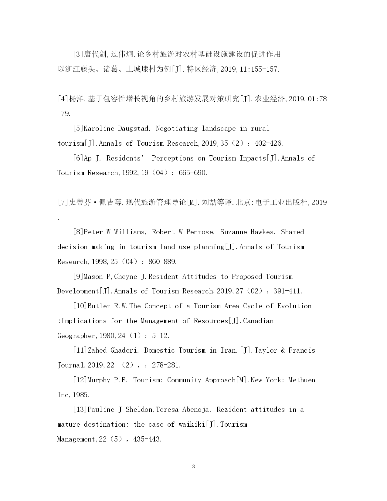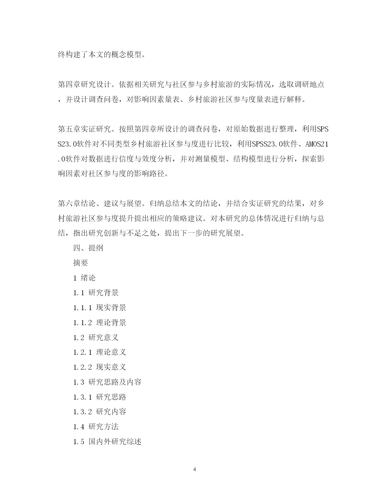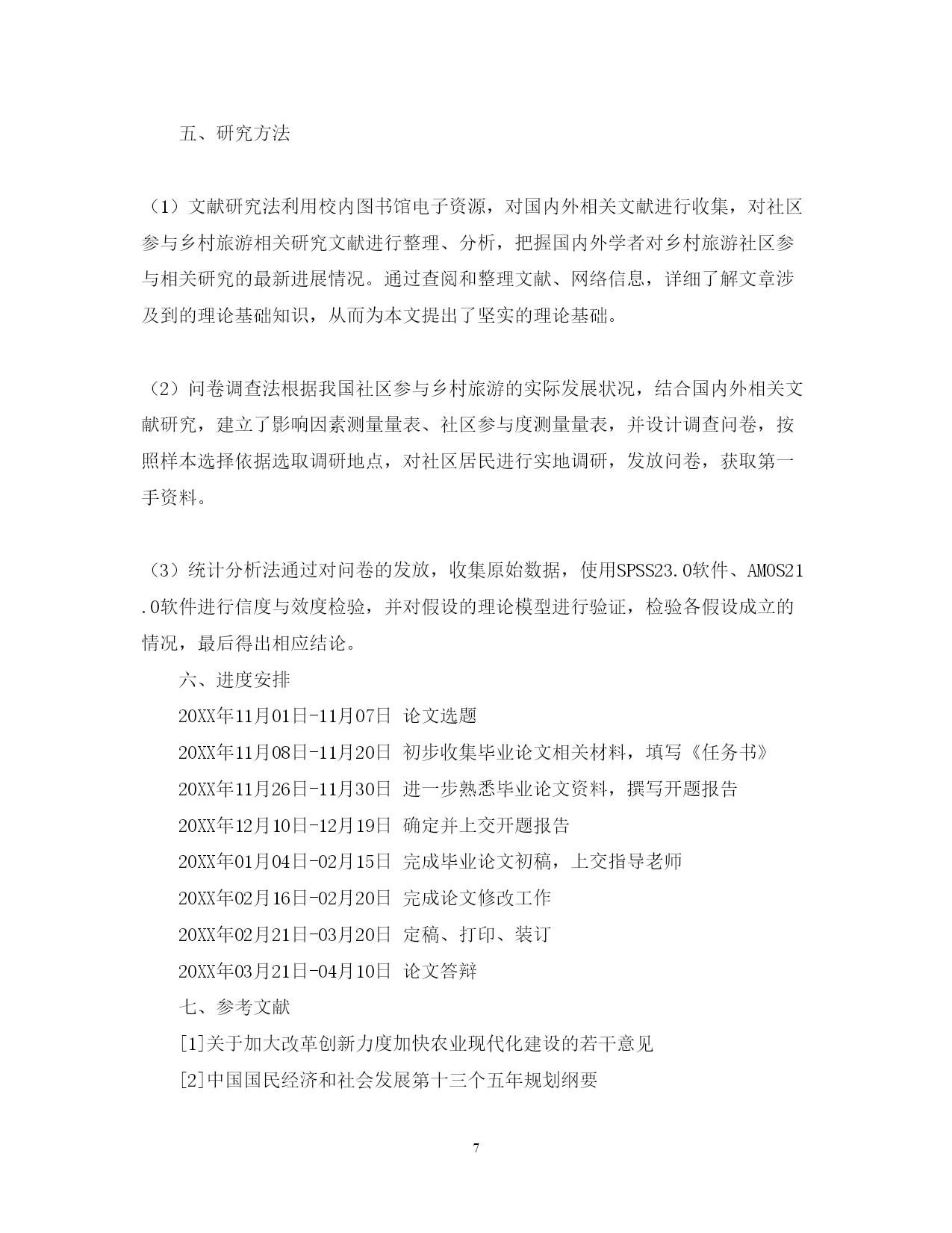 此资料由网络收集而来,如有侵权请告知上传者立即删除。资料共分享,我们负责传递知识。PAGEPAGE9毕业论文开题报告:乡村旅游一、研究背景乡村旅游在我国起步较晚,在20世纪80年代以后开始萌芽,经过三十多年发展,乡村旅游已具有一定规模,形成了围绕大中城市、名胜景区、山水生态区、特色农业区的乡村旅游发展格局,并涌现出一批先进典型。据有关资料统计,2019年,全国休闲农业和乡村旅游接待游客近21亿人次,约占国内旅游接待总量的1/2,营业收入超过5700亿元,带动672万户农民受益。2019年中国休闲农业与乡村旅游行业现状研究分析与发展趋势预测报告显示,在近5年的时间里,休闲农业与乡村旅游行业市场规模快速发展。经历初创期--发展期--扩张期--升级期四个发展阶段,乡村旅游从过去的小旅游、中旅游时代,现已进入到大旅游发展时代,发展形势迅猛。政策支持为乡村旅游快速发展提供了坚强的后盾。2019年,中央一号文件《关于加大改革创新力度加快农业现代化建设的若干意见》中首次提出推进农业一二三产业融合发展,延长农业产业链,打造特色鲜明的旅游产品。2019年《国民经济和社会发展第十三个五年规划纲要》提出推进精准扶贫,积极对扶贫开发方式进行创新,健全精准扶贫工作机制。2019年,在全国旅游工作报告中,表示积极推进“旅游+农村”,积极发展乡村旅游与休闲农业,并提出要继续进行旅游扶贫模式的推广,加强乡村旅游“千千万万”品牌建设,并突出乡村旅游扶贫在旅游扶贫的重要地位。发展乡村旅游在扩宽居民增收渠道、促进保护农业生态和乡土文化,以及促进农业转型升级具有重要的意义。乡村旅游不仅能够满足都市游客休闲度假的需求,也为发展社区经济投入了鲜活的生命力。首先,发展乡村旅游能够增加社区居民就业机会,带动社区居民增收致富,提升了社区居民生活满意度与幸福指数。其次,发展乡村旅游使当地社区在交通、电力、通讯、水利等基础设施方面得到建设,改善了社区居民生活环境。最后,城乡居民互动的过程中,生活观念、消费意识、价值观念等意识形态相互渗透,有利于提高社区居民文化素质,同时利于提高妇女的地位,使居民见多识广,思想观念发生转变。在区域经济方面,乡村旅游发挥综合带动效应,促进一二三产业融合发展,实现农业与旅游、教育、文化、健康养老等产业深度融,促进农村地区经济结构调整,实现精准扶贫,加快农村地区的城市化进程。二、研究意义理论意义目前,国内外学者关于社区参与乡村旅游影响因素研究所得的成果还较为薄弱,涉及到该领域的学者较少,大部分学者的研究视角多集中于社区参与模式、社区参与机制研究领域,并且对社区参与影响因素研究仅仅停留在定性分析的层面,对于社区居民参与乡村旅游影响因素的重要程度、影响因素的作用机制难以用定量的方式进行表述与呈现。本文通过构建结构方程模型,验证影响因素与社区参与度之间复杂的作用机理,通过量化的形式说明上述关系,为社区参与乡村旅游更深入的研究奠定基础。现实意义以社区为主导的乡村旅游发展模式能够有效增加社区居民收入、保护社区居民利益、减轻社区居民负担等一系列重要的现实问题,对于提高旅游扶贫综合效益、乡村旅游提质升级、推进全域旅游发展具有重要意义。现阶段,国家大力支持旅游扶贫,通过发展旅游带动落后地区经济发展,减小贫富差距,欧美国家的成功案例告诉我们,重视社区居民在乡村旅游发展体系中地位与作用,引导居民积极参与,来解决乡村旅游发展中诸多问题,本文通过对社区参与乡村旅游影响因素进行分析,特别是旅游发展基础认知、政策支持的感知,社区的社会资本状况、居民参与旅游态度、参与能力等因素,分析上述影响因素对社区参与度的影响程度,得出乡村旅游社区参与度提升依据,同时也为政府管理部门落实和完善社区参与旅游的相关政策提供参考。三、研究思路及内容研究思路本文在梳理总结社区参与乡村旅游、社区参与乡村旅游影响因素相关研究成果的基础上,以社区居民感知为研究视角,提出了社区参与乡村旅游影响因素作用机制模型,根据国内乡村旅游社区参与的实际发展状况,结合相关研究成果,构建了影响因素测量量表、社区参与度测量量表,设计调查问卷,对影响因素与社区参与度之间的关系进行定量分析,在实证分析、模型验证的基础上,得出本文研究结论,并提出乡村旅游社区参与度提升策略与建议。研究内容本文主要从以下六个部分进行阐述,具体内容如下:第一章绪论。该章对论文的研究背景与意义、研究思路、内容及方法进行介绍,并对国内外社区参与乡村旅游相关研究进行评述。第二章相关概念及理论基础。对社区、社区参与、乡村旅游概念进行界定,对社区一体化理论、利益相关者理论、社会资本理论、可持续发展理论进行梳理,为乡村旅游社区参与影响因素的研究提供理论基础。第三章理论模型。依据相关研究成果,梳理了社区参与乡