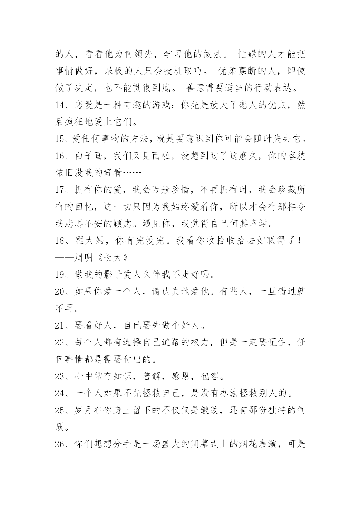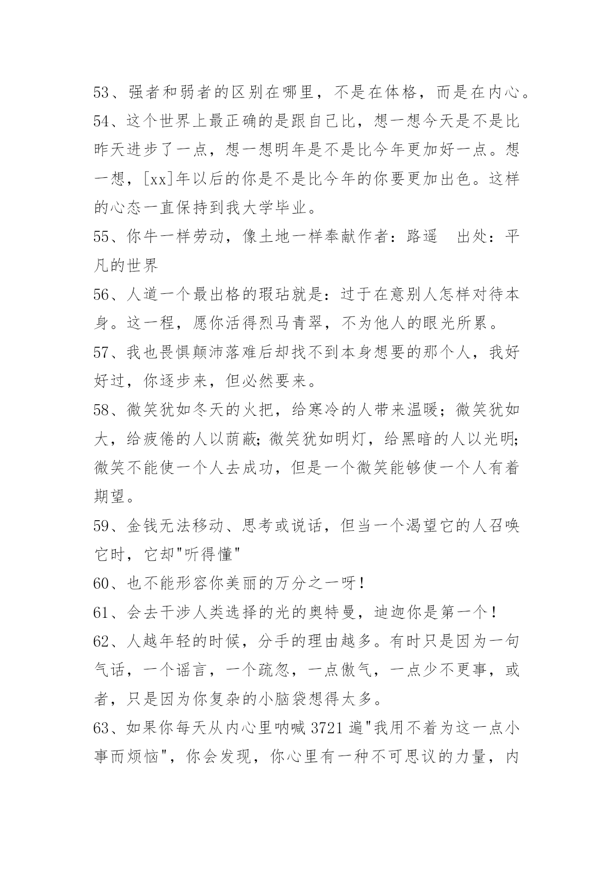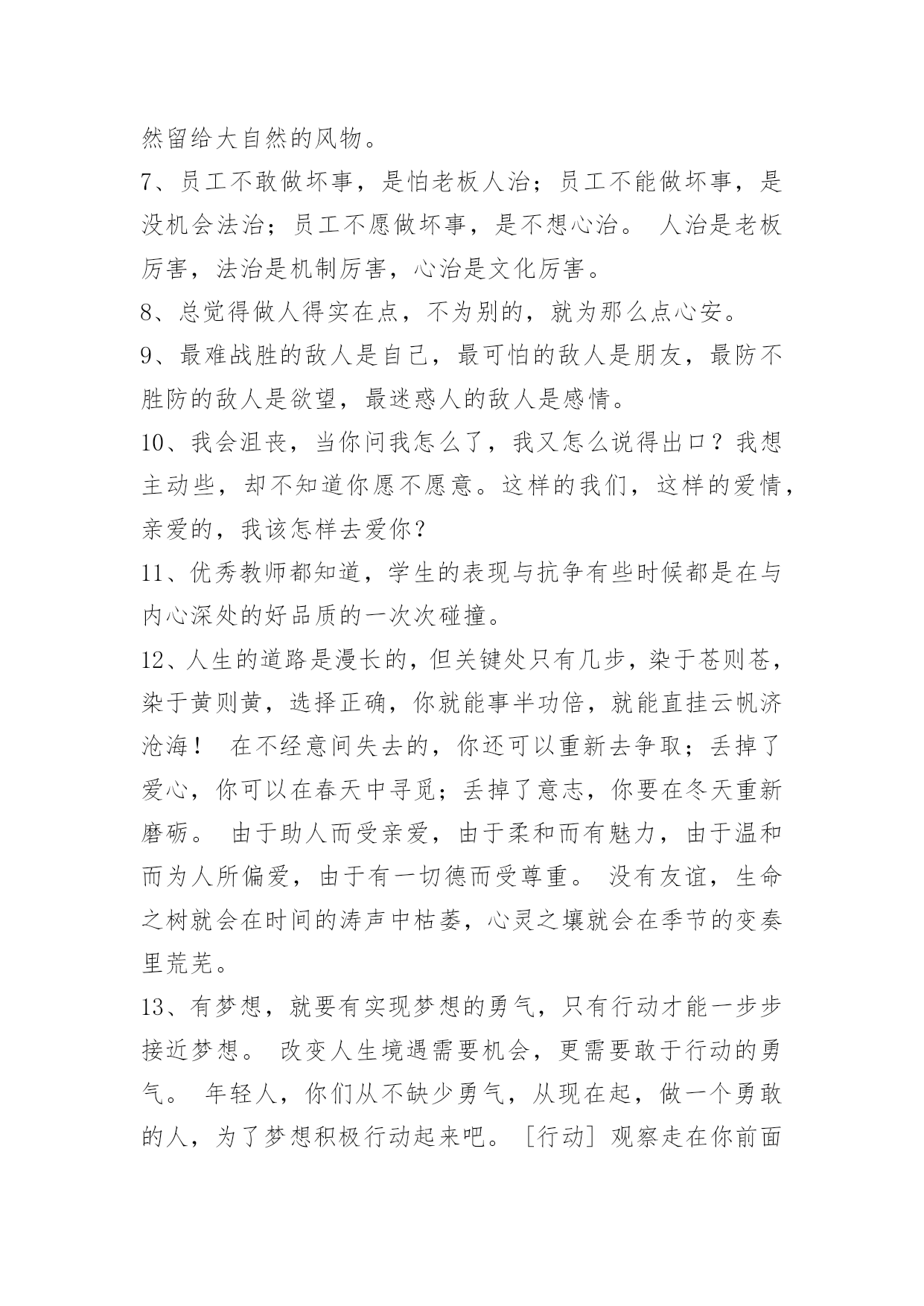 经典的生活语录精选经典的生活语录合集66句结婚可能一种债务关系,也可能是一种聘雇关系。男人惟一能报复女人的方式,就是成为一位服装设计师,设计出一件件不堪入目,怪里怪气的衣服来,然后着女人趋之若鹜,争相采购,加诸身上。下面是小编为大家提供的经典的生活语录66句,感兴趣的一起来看看吧。1、经年的天空,我将最美的心情给了文字。那些没有颜色的文字,缓缓流淌在渐渐泛黄的素笺之上。生活中的春花秋月,闲言碎语,随时光去了遥远的原乡。一切,在经年的等待中发芽,即使偶尔不知所措的情怀,亦被点点文字渐渐释然。2、生活就像是盒子里的巧克力,你永远也不知道下一颗的滋味。美好或苦涩,两种截然不同的结果。我们需要付出百分百的努力,才能尝到味道美好的巧克力。3、岁月老了,听故事的人,成了讲故事的人,讲故事的人,成了故事里的人。4、冰河中或有突兀的温泉,海水里哪有截然的淡水?5、人只有见识过若干种活法,对自己能拥有的活法才具备了想象力。6、惋叹,美好总是短暂。那么,就请我们在美好消失之前,静静倾听花开的声音;虔诚去看飞蛾扑火的壮烈;留下深情,给挚爱、给缘分;留下欣赏给友情;把奋进留给青春;把淡然留给大自然的风物。7、员工不敢做坏事,是怕老板人治;员工不能做坏事,是没机会法治;员工不愿做坏事,是不想心治。人治是老板厉害,法治是机制厉害,心治是文化厉害。8、总觉得做人得实在点,不为别的,就为那么点心安。9、最难战胜的敌人是自己,最可怕的敌人是朋友,最防不胜防的敌人是欲望,最迷惑人的敌人是感情。10、我会沮丧,当你问我怎么了,我又怎么说得出口?我想主动些,却不知道你愿不愿意。这样的我们,这样的爱情,亲爱的,我该怎样去爱你?11、优秀教师都知道,学生的表现与抗争有些时候都是在与内心深处的好品质的一次次碰撞。12、人生的道路是漫长的,但关键处只有几步,染于苍则苍,染于黄则黄,选择正确,你就能事半功倍,就能直挂云帆济沧海!在不经意间失去的,你还可以重新去争取;丢掉了爱心,你可以在春天中寻觅;丢掉了意志,你要在冬天重新磨砺。由于助人而受亲爱,由于柔和而有魅力,由于温和而为人所偏爱,由于有一切德而受尊重。没有友谊,生命之树就会在时间的涛声中枯萎,心灵之壤就会在季节的变奏里荒芜。13、有梦想,就要有实现梦想的勇气,只有行动才能一步步接近梦想。改变人生境遇需要机会,更需要敢于行动的勇气。年轻人,你们从不缺少勇气,从现在起,做一个勇敢的人,为了梦想积极行动起来吧。[行动]观察走在你前面的人,看看他为何领先,学习他的做法。忙碌的人才能把事情做好,呆板的人只会投机取巧。优柔寡断的人,即使做了决定,也不能贯彻到底。善意需要适当的行动表达。14、恋爱是一种有趣的游戏:你先是放大了恋人的优点,然后疯狂地爱上它们。15、爱任何事物的方法,就是要意识到你可能会随时失去它。16、白子画,我们又见面啦,没想到过了这麽久,你的容貌依旧没我的好看……17、拥有你的爱,我会万般珍惜,不再拥有时,我会珍藏所有的回忆,这一切只因为我始终爱着你,所以才会有那样令我忐忑不安的顾虑。遇见你,我觉得自己何其幸运。18、程大妈,你有完没完。我看你收拾收拾去妇联得了!——周明《长大》19、做我的影子爱人久伴我不走好吗。20、如果你爱一个人,请认真地爱他。有些人,一旦错过就不再。21、要看好人,自已要先做个好人。22、每个人都有选择自己道路的权力,但是一定要记住,任何事情都是需要付出的。23、心中常存知识,善解,感恩,包容。24、一个人如果不先拯救自己,是没有办法拯救别人的。25、岁月在你身上留下的不仅仅是皱纹,还有那份独特的气质。26、你们想想分手是一场盛大的闭幕式上的烟花表演,可是不是,分手其实是,所有的烟花散去之后,无尽的空洞和冷漠。27、我不觉得人的心智成熟是越来越宽容涵盖,什么都能够理解。相反,我觉得那应当是一个逐渐剔除的过程,知道自我最重要的是什么,知道不重要的东西是什么。而后,做一个纯简的人。28、如果时间真的`会让人忘记一切,我又该如何去找寻属于自我的那片美丽的幸福,我寻觅着遗失的完美,等待昏辉下最终一缕光芒。而当我再次回头,转身的时候,发现我已经不在原地。29、买了一只精美的小表可时间还是那么无聊。30、我们不小心跌倒时,不要急著爬起来,既然已经摔倒了,就在原地享受一下摔倒的滋味。31、不要嫌父母老、爸妈脏,因为他们是世界上最不嫌你脏的人,父母的恩是我们一辈子都还不清的32、我似乎开始失去对生活的一些把握。我感到心中有些什么,有些难以捉摸的东西慢慢滤去了。我还发现自己产生了对什么人的某种义务感,这种感觉,不是引起我的知恩图报之心,而是隐约的愤懑—一个人,不管乐意与否,在受人恩惠时都会产生的那种特有的情绪。33、在人生的舞台上,如果不能做一个出色的演员,那么就做一个安静的看客,默数风云,但笑不语;即使