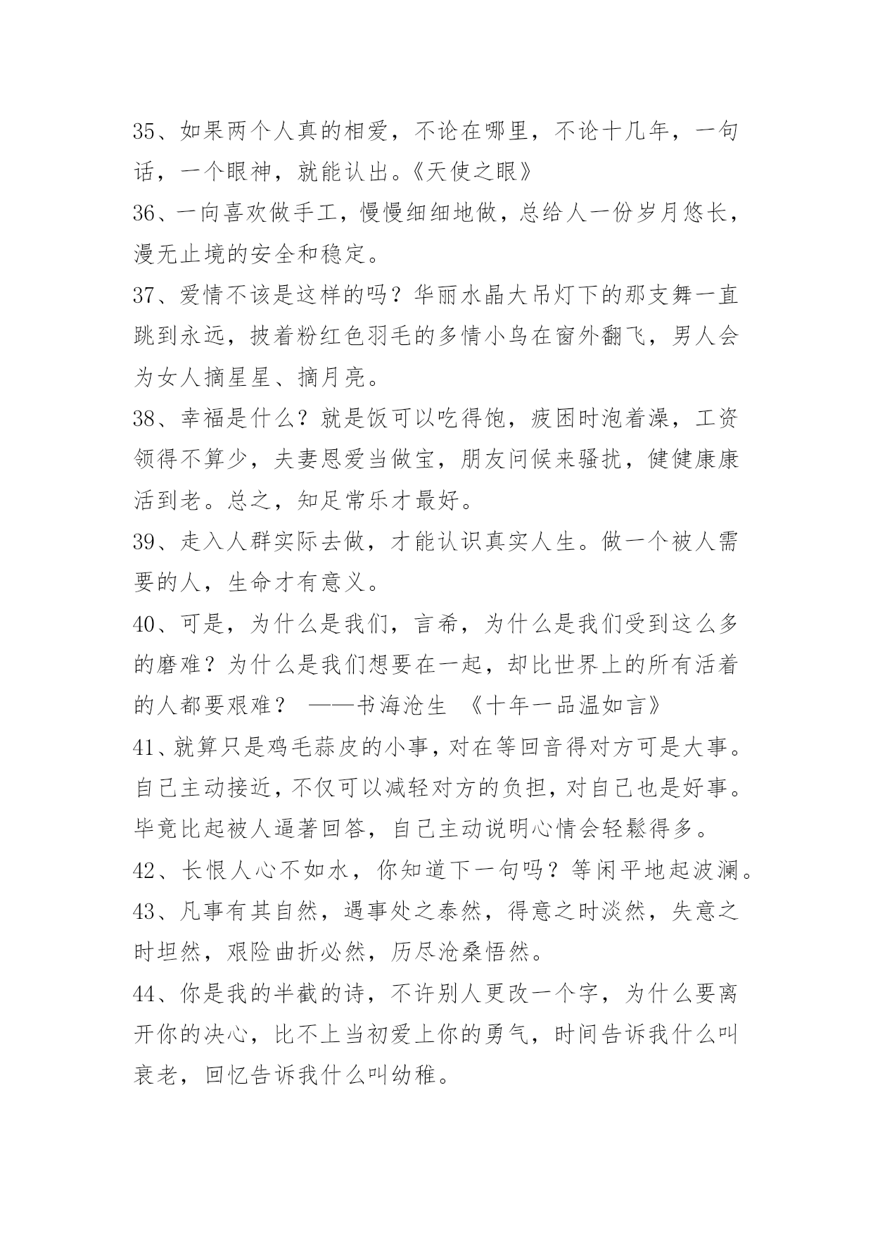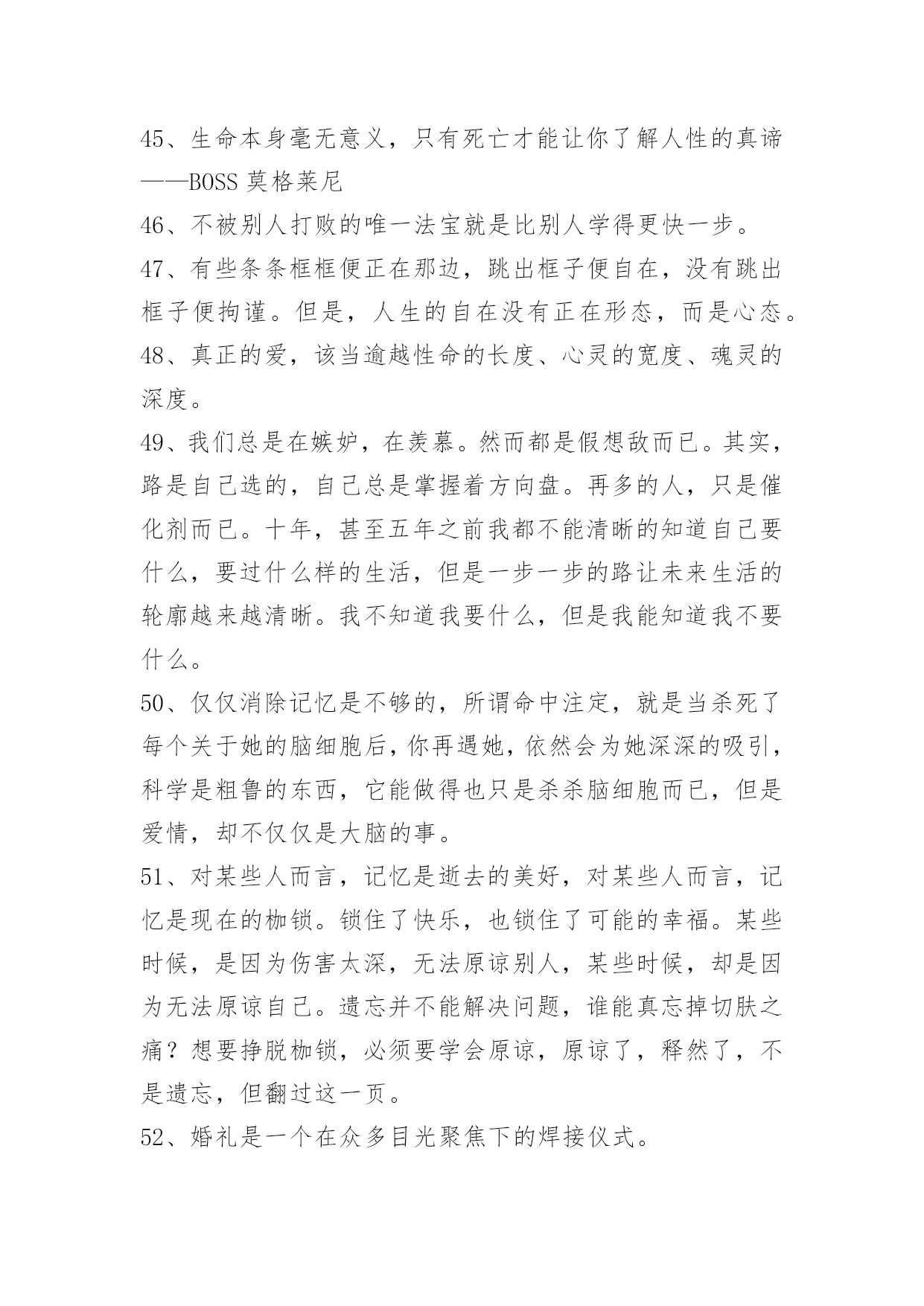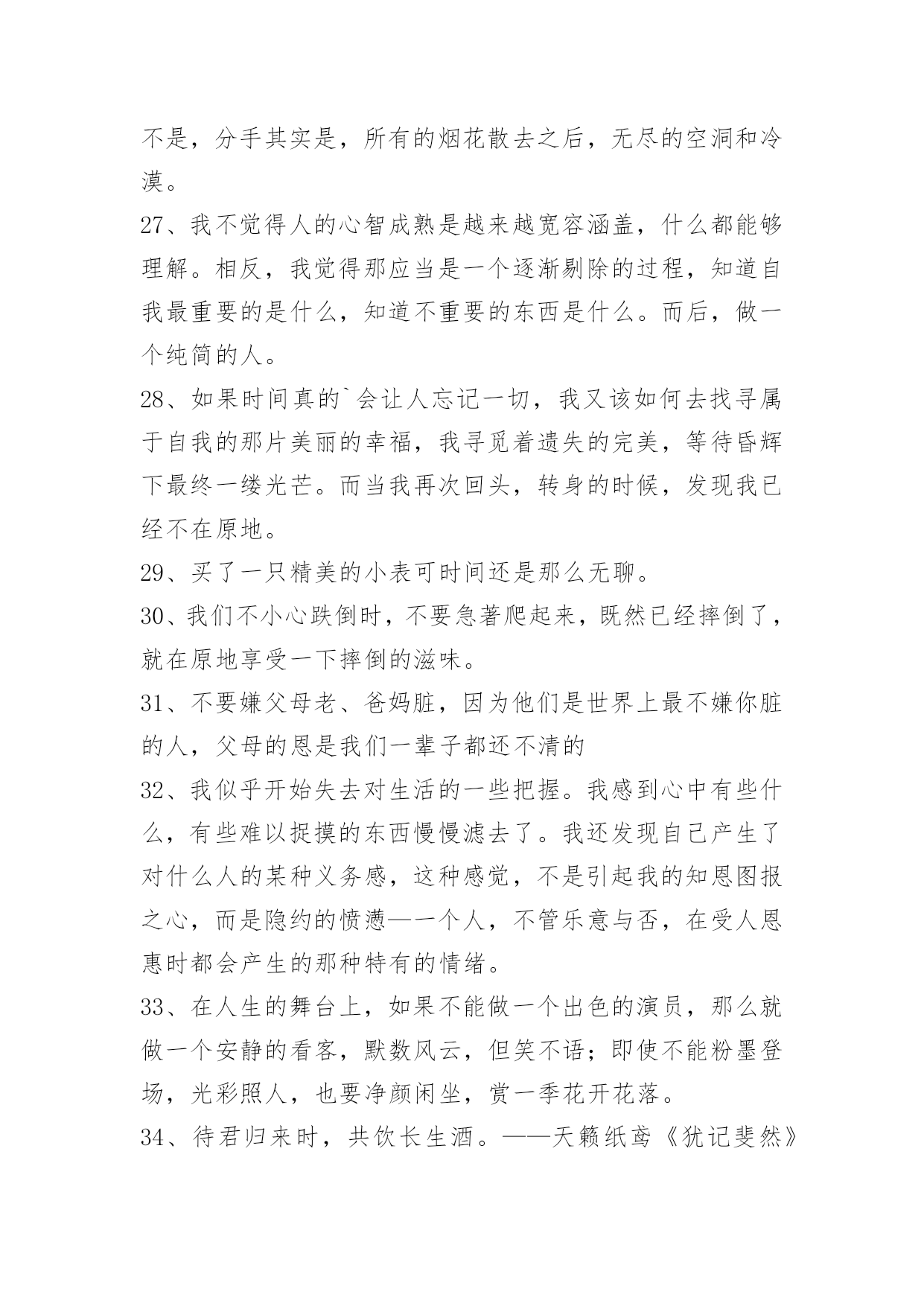 经典的生活语录精选经典的生活语录合集66句结婚可能一种债务关系,也可能是一种聘雇关系。男人惟一能报复女人的方式,就是成为一位服装设计师,设计出一件件不堪入目,怪里怪气的衣服来,然后着女人趋之若鹜,争相采购,加诸身上。下面是小编为大家提供的经典的生活语录66句,感兴趣的一起来看看吧。1、经年的天空,我将最美的心情给了文字。那些没有颜色的文字,缓缓流淌在渐渐泛黄的素笺之上。生活中的春花秋月,闲言碎语,随时光去了遥远的原乡。一切,在经年的等待中发芽,即使偶尔不知所措的情怀,亦被点点文字渐渐释然。2、生活就像是盒子里的巧克力,你永远也不知道下一颗的滋味。美好或苦涩,两种截然不同的结果。我们需要付出百分百的努力,才能尝到味道美好的巧克力。3、岁月老了,听故事的人,成了讲故事的人,讲故事的人,成了故事里的人。4、冰河中或有突兀的温泉,海水里哪有截然的淡水?5、人只有见识过若干种活法,对自己能拥有的活法才具备了想象力。6、惋叹,美好总是短暂。那么,就请我们在美好消失之前,静静倾听花开的声音;虔诚去看飞蛾扑火的壮烈;留下深情,给挚爱、给缘分;留下欣赏给友情;把奋进留给青春;把淡然留给大自然的风物。7、员工不敢做坏事,是怕老板人治;员工不能做坏事,是没机会法治;员工不愿做坏事,是不想心治。人治是老板厉害,法治是机制厉害,心治是文化厉害。8、总觉得做人得实在点,不为别的,就为那么点心安。9、最难战胜的敌人是自己,最可怕的敌人是朋友,最防不胜防的敌人是欲望,最迷惑人的敌人是感情。10、我会沮丧,当你问我怎么了,我又怎么说得出口?我想主动些,却不知道你愿不愿意。这样的我们,这样的爱情,亲爱的,我该怎样去爱你?11、优秀教师都知道,学生的表现与抗争有些时候都是在与内心深处的好品质的一次次碰撞。12、人生的道路是漫长的,但关键处只有几步,染于苍则苍,染于黄则黄,选择正确,你就能事半功倍,就能直挂云帆济沧海!在不经意间失去的,你还可以重新去争取;丢掉了爱心,你可以在春天中寻觅;丢掉了意志,你要在冬天重新磨砺。由于助人而受亲爱,由于柔和而有魅力,由于温和而为人所偏爱,由于有一切德而受尊重。没有友谊,生命之树就会在时间的涛声中枯萎,心灵之壤就会在季节的变奏里荒芜。13、有梦想,就要有实现梦想的勇气,只有行动才能一步步接近梦想。改变人生境遇需要机会,更需要敢于行动的勇气。年轻人,你们从不缺少勇气,从现在起,做一个勇敢的人,为了梦想积极行动起来吧。[行动]观察走在你前面的人,看看他为何领先,学习他的做法。忙碌的人才能把事情做好,呆板的人只会投机取巧。优柔寡断的人,即使做了决定,也不能贯彻到底。善意需要适当的行动表达。14、恋爱是一种有趣的游戏:你先是放大了恋人的优点,然后疯狂地爱上它们。15、爱任何事物的方法,就是要意识到你可能会随时失去它。16、白子画,我们又见面啦,没想到过了这麽久,你的容貌依旧没我的好看……17、拥有你的爱,我会万般珍惜,不再拥有时,我会珍藏所有的回忆,这一切只因为我始终爱着你,所以才会有那样令我忐忑不安的顾虑。遇见你,我觉得自己何其幸运。18、程大妈,你有完没完。我看你收拾收拾去妇联得了!——周明《长大》19、做我的影子爱人久伴我不走好吗。20、如果你爱一个人,请认真地爱他。有些人,一旦错过就不再。21、要看好人,自已要先做个好人。22、每个人都有选择自己道路的权力,但是一定要记住,任何事情都是需要付出的。23、心中常存知识,善解,感恩,包容。24、一个人如果不先拯救自己,是没有办法拯救别人的。25、岁月在你身上留下的不仅仅是皱纹,还有那份独特的气质。26、你们想想分手是一场盛大的闭幕式上的烟花表演,可是不是,分手其实是,所有的烟花散去之后,无尽的空洞和冷漠。27、我不觉得人的心智成熟是越来越宽容涵盖,什么都能够理解。相反,我觉得那应当是一个逐渐剔除的过程,知道自我最重要的是什么,知道不重要的东西是什么。而后,做一个纯简的人。28、如果时间真的`会让人忘记一切,我又该如何去找寻属于自我的那片美丽的幸福,我寻觅着遗失的完美,等待昏辉下最终一缕光芒。而当我再次回头,转身的时候,发现我已经不在原地。29、买了一只精美的小表可时间还是那么无聊。30、我们不小心跌倒时,不要急著爬起来,既然已经摔倒了,就在原地享受一下摔倒的滋味。31、不要嫌父母老、爸妈脏,因为他们是世界上最不嫌你脏的人,父母的恩是我们一辈子都还不清的32、我似乎开始失去对生活的一些把握。我感到心中有些什么,有些难以捉摸的东西慢慢滤去了。我还发现自己产生了对什么人的某种义务感,这种感觉,不是引起我的知恩图报之心,而是隐约的愤懑—一个人,不管乐意与否,在受人恩惠时都会产生的那种特有的情绪。33、在人生的舞台上,如果不能做一个出色的演员,那么就做一个安静的看客,默数风云,但笑不语;即使