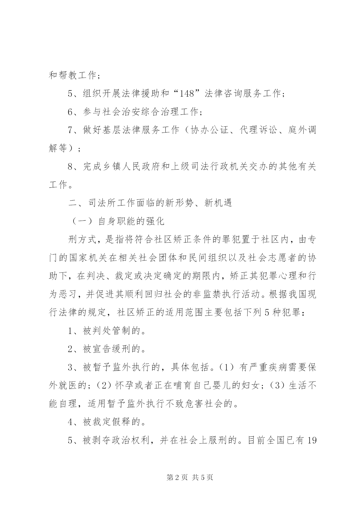 第PAGE\*Arabic\*MERGEFORMAT5页共NUMPAGES\*MERGEFORMAT5页XX年司法行政工作计划篇一:2016年司法所工作计划范文2016年司法所工作计划范文以下是一篇2016年司法所工作计划范文,文中主要讲述了两部分,有司法所基本职能,司法所工作面临的新形势、新机遇,具体内容让我们一起看看全文吧~在刚刚过去的一年里,镇司法所的工作得到了镇党委、政府的大力支持,高标准完成了新所建设任务。2016年,为了充分发挥镇司法所的职能作用,促进社会稳定,构建和谐**,特将司法所的基本职能、新时期的新任务和2016年的工作计划汇报如下:一、基本职能根据XX市司法局的统一部署,2015年5月我所顺利完成了司法所、法律服务所两所合并任务,使司法所职能得到加强。具体职能是:1、协助乡镇政府开展依法治理工作和行政执法检查监督工作;2、指导管理人民调解工作,代表乡镇人民政府处理民间纠纷,参与重大疑难民间纠纷调解工作;3、组织开展普法宣传和法制教育工作;4、组织开展对刑满释放和解除劳动教养人员的过渡性安置和帮教工作;5、组织开展法律援助和“148”法律咨询服务工作;6、参与社会治安综合治理工作;7、做好基层法律服务工作(协办公证、代理诉讼、庭外调解等);8、完成乡镇人民政府和上级司法行政机关交办的其他有关工作。二、司法所工作面临的新形势、新机遇(一)自身职能的强化刑方式,是指将符合社区矫正条件的罪犯置于社区内,由专门的国家机关在相关社会团体和民间组织以及社会志愿者的协助下,在判决、裁定或决定确定的期限内,矫正其犯罪心理和行为恶习,并促进其顺利回归社会的非监禁执行活动。根据我国现行法律的规定,社区矫正的适用范围主要包括下列5种犯罪:1、被判处管制的。2、被宣告缓刑的。3、被暂予监外执行的,具体包括。(1)有严重疾病需要保外就医的;(2)怀孕或者正在哺育自己婴儿的妇女;(3)生活不能自理,适用暂予监外执行不致危害社会的。4、被裁定假释的。5、被剥夺政治权利,并在社会上服刑的。目前全国已有19个省、直辖市试行,正在扩大试点范围。(二)乡镇政府职能的转变随着乡镇政府的社会管理职能的不断强化和村级政权自治程度的提高,依法治理和人民调解工作将得到进一步的重视和加强。(三)弱势群体的法律需求弱势群体的利益越来越受到党和政府的关注。针对他们的经济和社会保障体系日益完善,其中包括法律保障,政府通过实施法律援助来实现“有理无钱也可以打官司”的目标,让弱势群体有理也可以讲出来。(四)构建和谐社会的需要和谐社会不是没有矛盾的社会,而是一个建立有完善矛盾纠纷排查调处制度和体系、能够及时有效运转、依法消除危害因素的社会。当前,社会处于转型期,也是各种矛盾凸现期,历史遗留的和经济社会发展带来的大量矛盾纠纷有85%是非诉讼案件,需要化解调处,乡村两级组织维护稳定的任务越来越重,依法解决矛盾是大势所趋。今年,我市正在整合政法资源,在各乡镇设立矛盾纠纷排查调处中心,建立大排查、大调处格局。三、2016年工作打算(一)工作思路以创建省级依法治理先进乡镇和国家级文明司法所为载体,突出人民调解和法律援助两大服务主题,按照“打基础、找位置、树形象、创佳迹”的要求,全面推进司法行政和法律服务工作的专业化、规范化、效能化建设,为维护稳定、构建和谐发挥好职能作用。(二)工作目标1、人民调解。充分发挥镇村两级调解组织的作用,积极配合信访部门和各管区,深入持久地开展矛盾纠纷大排查、大调处活动,发现一起调处一起,调成率达到100%。2、法律援助。积极为城镇低保、农村低保和五保户及符合援助条件的群体办理法律援助案件,做到有一起援助一起,立案率、办案率、群众满意率均达到100%,争取办理1——2起有重大影响的案件。3、普法依法治镇。制订2016年“五五”普法和“三五”依法治镇工作规划;利用农村庙会、大集,开展大型普法活动,做到逢会必办;在全镇中小学中积极开展法制教育活动,设立法制课堂、创办法制园地,使中小学校开课率达到100%。4、两劳帮教。做到回来一个帮教一个,并严格按照国家有关规定,做好登记、建档、回访、安置、监控等工作,将本辖区两劳回归人员重新犯罪率控制在1%以下。5、法律服务。在抓好常规业务的同时,注重公证业务的开发和企事业单位法律顾问点的拓展,在5—8个企业设立顾问点。6、信息报道。全年向上级刊物和信息部门报送有价值的信息5篇,全方位宣传**有关工作,吸引媒体聚焦**、有关领导关注**。(三)采取措施1、宣传到位。普法宣传的重点由国家干部转为农村居民和中小学生;制作印制有“**镇人民政府主办、司法所、法律服务所承办、劳保、计生、信访、土地、安全等部门协办”标识的大型普法主题背景挂图,到各村、各企事业单位巡回展出;改变普法宣传的单一模式,普法宣传