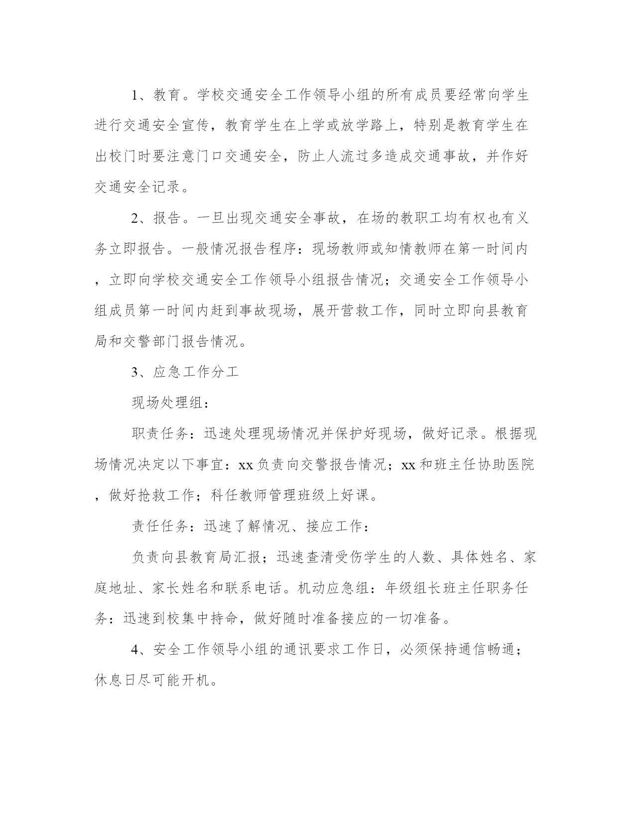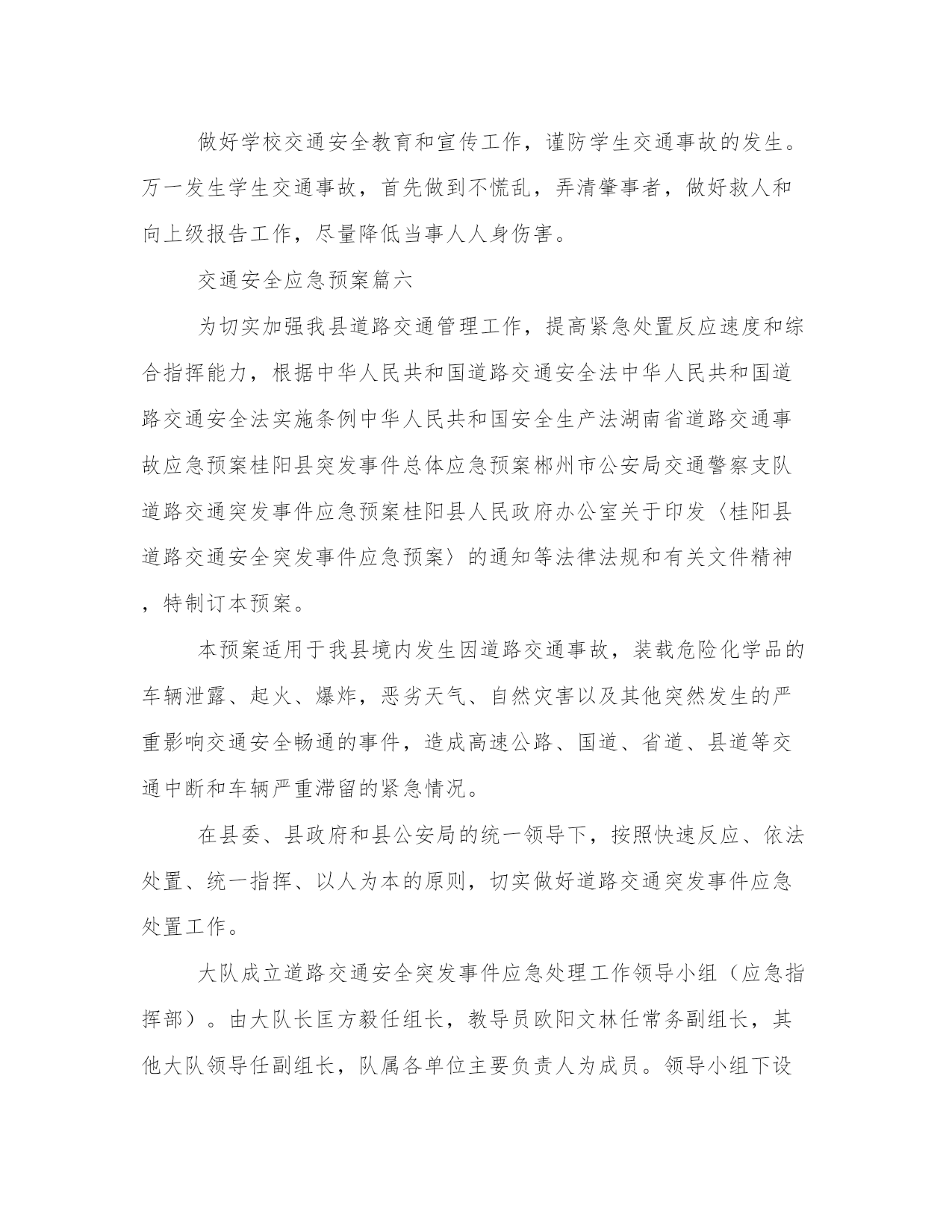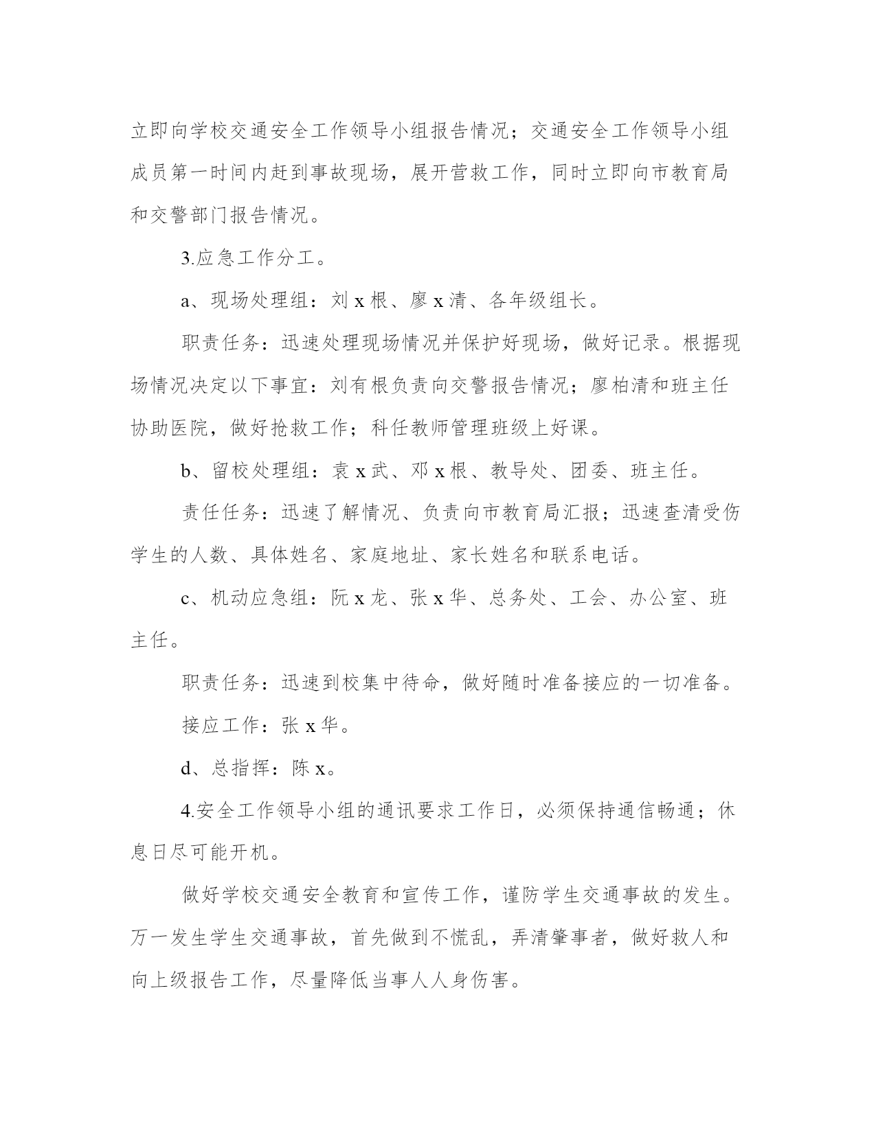 交通安全应急预案(通用9篇)教育的重要性一直被人们所强调,它是个人和社会发展的基石。怎样才能写出一篇完美的总结呢?著名企业家总结了自己的创业经历和经验,与大家分享。交通安全应急预案篇一为了确保师生的人身安全,保证一旦发生学校交通安全事故能够及时处理,特制定我校。组长:袁伟斌。副组长:潘奕城。组员:各课任老师。1.组长负责部署相关工作,安排、检查学校交通安全重大事宜。2.副组长负责学校安全应急预案的落实情况,处理突发交通安全事故,完成校领导交办的各项任务。3.领导小组成员具体负责学校各年级、突发交通安全事故的`处理、监控、报告等事宜,并保证领导小组指令的畅通。做好交通安全工作的宣传、教育、落实、检查、处理等,把交通安全事故减少到最低限度。1.每天保证学校门口有校领导和教师值班,早上和中午都必须提前半小时到校,放学时待全部学生离校方可下班。若在校门口学生发生交通事故,应及时处理,把学生送往医院,并通知其家长,及时报警。2.学生上下楼梯,在各个楼梯口必须有指定教师看护,值班人员及时检查。若学生发生拥挤踩伤事件,看护教师立即制止全体学生原地不动,救护踩伤学生,及时把受伤学生送往医院。3.各班选出一名交通安全监督员,每日在教室、班级门口楼道内检查,制止不安全行为。4.学生碰伤、撞伤后,任课教师必须立即送医院治疗,及时通知学生家长,上报学校,按学生伤害处理办法条例迅速处理。5.学生上操及集会安全由班主任负责,下操及散会时学生回班依规定顺序排队回班。6.实行安全事件报告制度和安全责任追究制度。1、认真落实“教育在先,预防在前”的工作原则,牢固树立安全意识,提高防范和救护措能力。2、利用国旗下讲话、主题班队会、黑板报、健康教育课等多种形式,加强对学生进行安全教育。3、定期举行全校性的安全教育报告会。4、经常开展丰富多彩的安全教育活动,让学生学会生存,掌握自救本领。5、安全教育渗透到各科教学之中,时时讲,事事讲。总之,安全工作重于泰山,全体教职工必须高度重视安全工作,若因工作失职造成安全事故的,将直接追究有关人员责任,按学校规定严肃处理。交通安全应急预案篇二组长:副组长:组员:校委会成员年级组长班主任。1、教育。学校交通安全工作领导小组的所有成员要经常向学生进行交通安全宣传,教育学生在上学或放学路上,特别是教育学生在出校门时要注意门口交通安全,防止人流过多造成交通事故,并作好交通安全记录。2、报告。一旦出现交通安全事故,在场的教职工均有权也有义务立即报告。一般情况报告程序:现场教师或知情教师在第一时间内,立即向学校交通安全工作领导小组报告情况;交通安全工作领导小组成员第一时间内赶到事故现场,展开营救工作,同时立即向县教育局和交警部门报告情况。3、应急工作分工现场处理组:各年级组长责任任务:迅速了解情况、接应工作:负责向县教育局汇报;迅速查清受伤学生的人数、具体姓名、家庭地址、家长姓名和联系电话。机动应急组:年级组长班主任职务任务:迅速到校集中持命,做好随时准备接应的一切准备。4、安全工作领导小组的通讯要求工作日,必须保持通信畅通;休息日尽可能开机。做好学校交通安全教育和宣传工作,谨防学生交通事故的发生。万一发生学生交通事故,首先做到不慌乱,弄清肇事者,做好救人和向上级报告工作,尽量降低当事人人身伤害。交通安全应急预案篇三为预防我校学生发生交通不安全事故,确保在第一时间内做好抢救和消除隐患工作,确保学生安全,特制定我校学生交通事故安全应急预案。组长:陈x。副组长:袁x武、阮x龙、刘x根。组员:校委会成员、年级组长、班主任。1.教育。学校交通安全工作领导小组的所有成员要经常向学生进行交通安全宣传,教育学生在上学或放学路上,特别是教育学生在出校门时要注意门口交通安全,防止人流过多造成交通事故,并作好交通安全记录。2.报告。一旦出现交通安全事故,在场的教职工均有权也有义务立即报告。一般情况报告程序:现场教师或知情教师在第一时间内,立即向学校交通安全工作领导小组报告情况;交通安全工作领导小组成员第一时间内赶到事故现场,展开营救工作,同时立即向市教育局和交警部门报告情况。3.应急工作分工。a、现场处理组:刘x根、廖x清、各年级组长。职责任务:迅速处理现场情况并保护好现场,做好记录。根据现场情况决定以下事宜:刘有根负责向交警报告情况;廖柏清和班主任协助医院,做好抢救工作;科任教师管理班级上好课。b、留校处理组:袁x武、邓x根、教导处、团委、班主任。责任任务:迅速了解情况、负责向市教育局汇报;迅速查清受伤学生的人数、具体姓名、家庭地址、家长姓名和联系电话。c、机动应急组:阮x龙、张x华、总务处、工会、办公室、班主任。职责任务:迅速到校集中待命,做好随时准备接应的一切