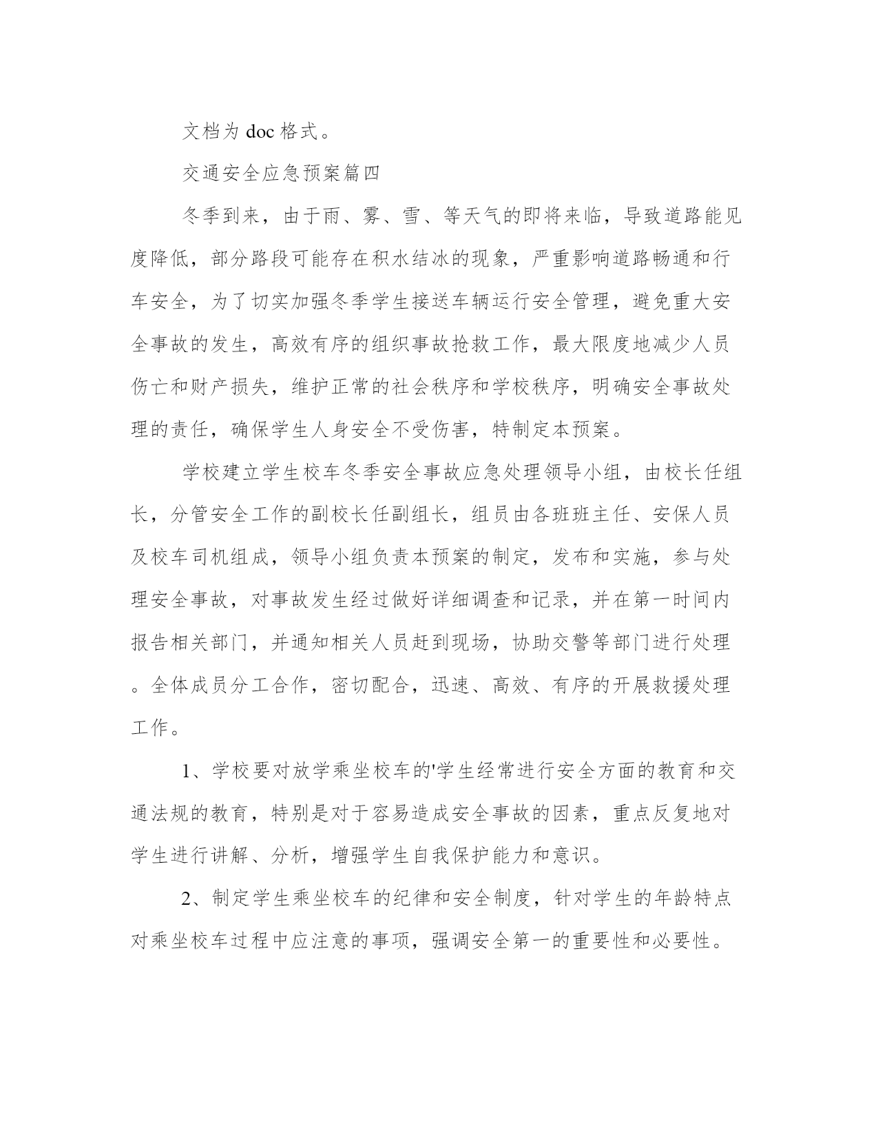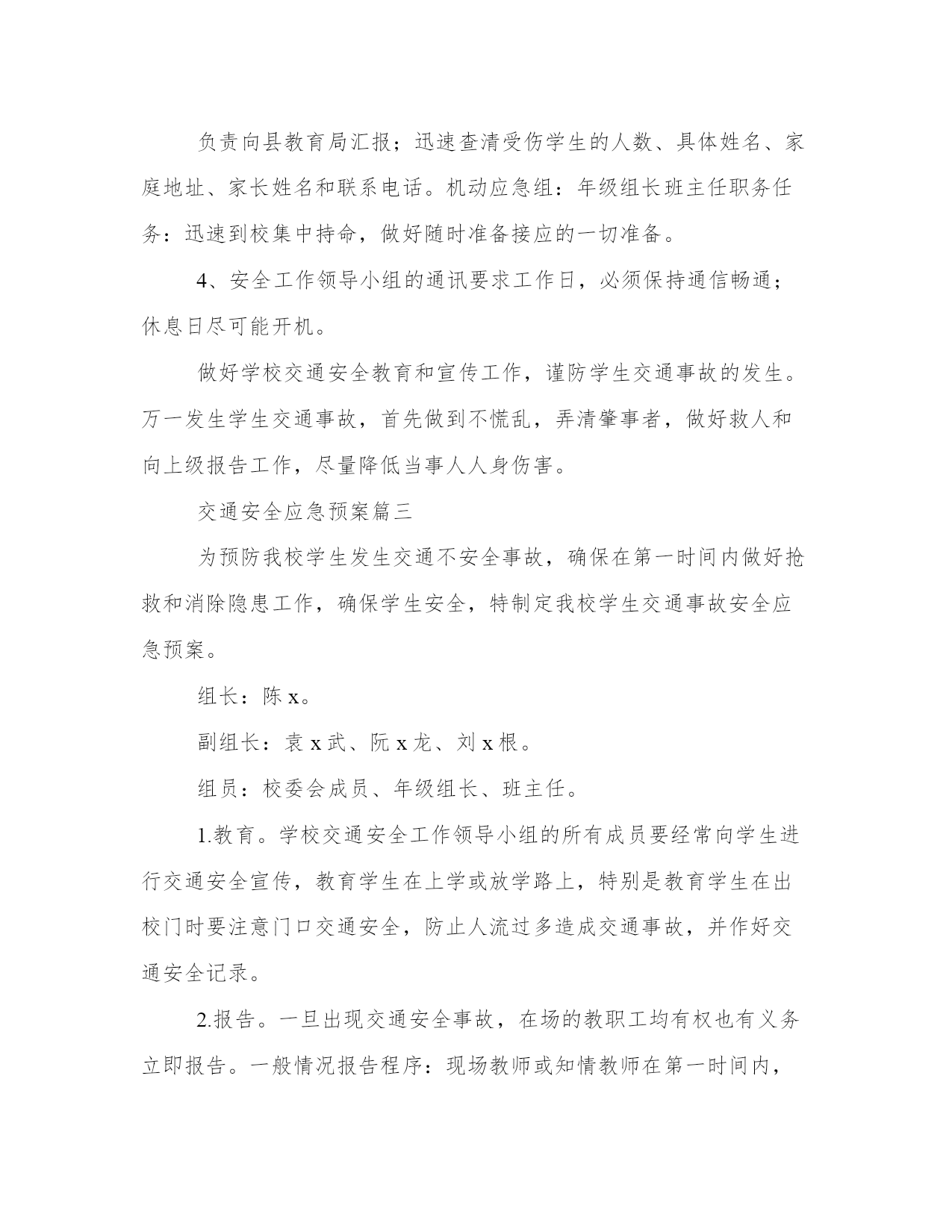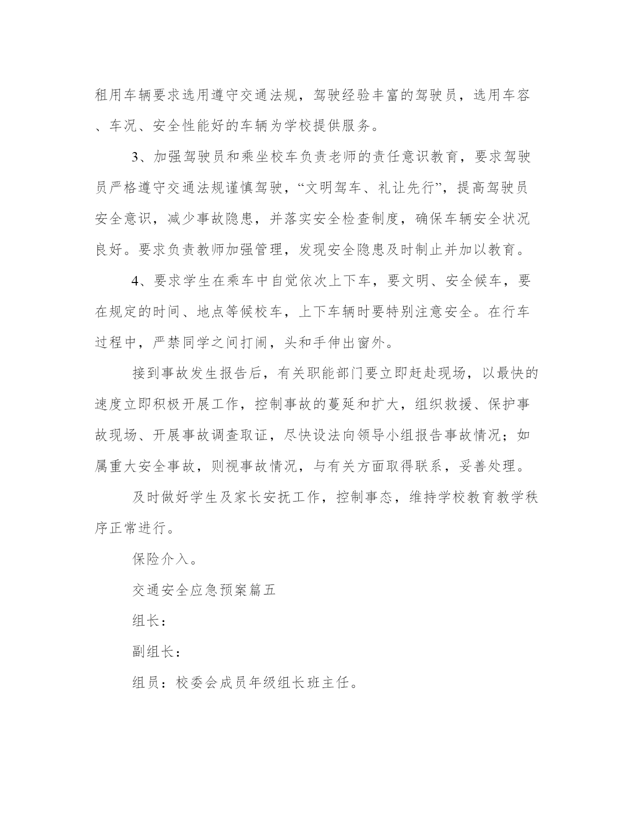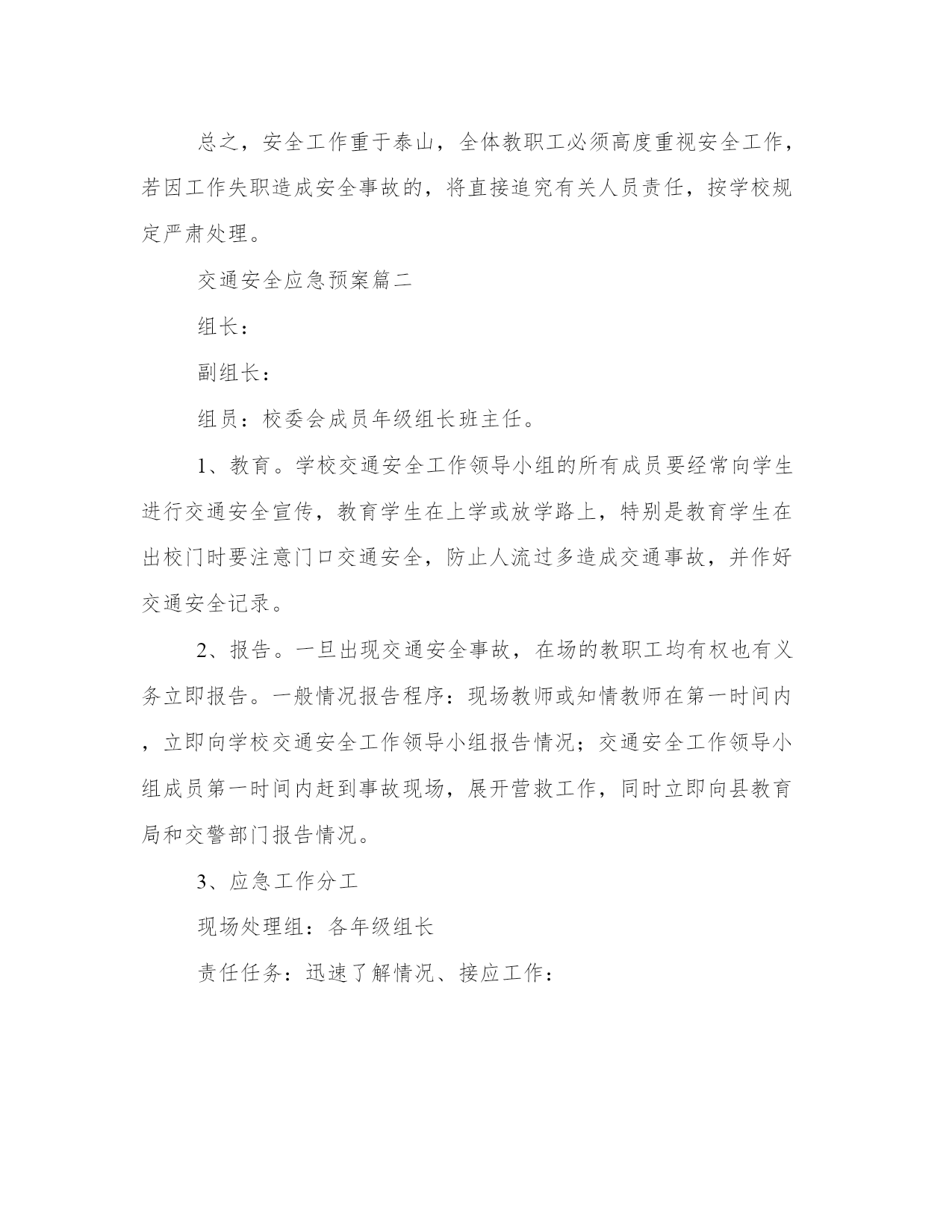 交通安全应急预案(通用9篇)教育的重要性一直被人们所强调,它是个人和社会发展的基石。怎样才能写出一篇完美的总结呢?著名企业家总结了自己的创业经历和经验,与大家分享。交通安全应急预案篇一为了确保师生的人身安全,保证一旦发生学校交通安全事故能够及时处理,特制定我校。组长:袁伟斌。副组长:潘奕城。组员:各课任老师。1.组长负责部署相关工作,安排、检查学校交通安全重大事宜。2.副组长负责学校安全应急预案的落实情况,处理突发交通安全事故,完成校领导交办的各项任务。3.领导小组成员具体负责学校各年级、突发交通安全事故的`处理、监控、报告等事宜,并保证领导小组指令的畅通。做好交通安全工作的宣传、教育、落实、检查、处理等,把交通安全事故减少到最低限度。1.每天保证学校门口有校领导和教师值班,早上和中午都必须提前半小时到校,放学时待全部学生离校方可下班。若在校门口学生发生交通事故,应及时处理,把学生送往医院,并通知其家长,及时报警。2.学生上下楼梯,在各个楼梯口必须有指定教师看护,值班人员及时检查。若学生发生拥挤踩伤事件,看护教师立即制止全体学生原地不动,救护踩伤学生,及时把受伤学生送往医院。3.各班选出一名交通安全监督员,每日在教室、班级门口楼道内检查,制止不安全行为。4.学生碰伤、撞伤后,任课教师必须立即送医院治疗,及时通知学生家长,上报学校,按学生伤害处理办法条例迅速处理。5.学生上操及集会安全由班主任负责,下操及散会时学生回班依规定顺序排队回班。6.实行安全事件报告制度和安全责任追究制度。1、认真落实“教育在先,预防在前”的工作原则,牢固树立安全意识,提高防范和救护措能力。2、利用国旗下讲话、主题班队会、黑板报、健康教育课等多种形式,加强对学生进行安全教育。3、定期举行全校性的安全教育报告会。4、经常开展丰富多彩的安全教育活动,让学生学会生存,掌握自救本领。5、安全教育渗透到各科教学之中,时时讲,事事讲。总之,安全工作重于泰山,全体教职工必须高度重视安全工作,若因工作失职造成安全事故的,将直接追究有关人员责任,按学校规定严肃处理。交通安全应急预案篇二组长:副组长:组员:校委会成员年级组长班主任。1、教育。学校交通安全工作领导小组的所有成员要经常向学生进行交通安全宣传,教育学生在上学或放学路上,特别是教育学生在出校门时要注意门口交通安全,防止人流过多造成交通事故,并作好交通安全记录。2、报告。一旦出现交通安全事故,在场的教职工均有权也有义务立即报告。一般情况报告程序:现场教师或知情教师在第一时间内,立即向学校交通安全工作领导小组报告情况;交通安全工作领导小组成员第一时间内赶到事故现场,展开营救工作,同时立即向县教育局和交警部门报告情况。3、应急工作分工现场处理组:各年级组长责任任务:迅速了解情况、接应工作:负责向县教育局汇报;迅速查清受伤学生的人数、具体姓名、家庭地址、家长姓名和联系电话。机动应急组:年级组长班主任职务任务:迅速到校集中持命,做好随时准备接应的一切准备。4、安全工作领导小组的通讯要求工作日,必须保持通信畅通;休息日尽可能开机。做好学校交通安全教育和宣传工作,谨防学生交通事故的发生。万一发生学生交通事故,首先做到不慌乱,弄清肇事者,做好救人和向上级报告工作,尽量降低当事人人身伤害。交通安全应急预案篇三为预防我校学生发生交通不安全事故,确保在第一时间内做好抢救和消除隐患工作,确保学生安全,特制定我校学生交通事故安全应急预案。组长:陈x。副组长:袁x武、阮x龙、刘x根。组员:校委会成员、年级组长、班主任。1.教育。学校交通安全工作领导小组的所有成员要经常向学生进行交通安全宣传,教育学生在上学或放学路上,特别是教育学生在出校门时要注意门口交通安全,防止人流过多造成交通事故,并作好交通安全记录。2.报告。一旦出现交通安全事故,在场的教职工均有权也有义务立即报告。一般情况报告程序:现场教师或知情教师在第一时间内,立即向学校交通安全工作领导小组报告情况;交通安全工作领导小组成员第一时间内赶到事故现场,展开营救工作,同时立即向市教育局和交警部门报告情况。3.应急工作分工。a、现场处理组:刘x根、廖x清、各年级组长。职责任务:迅速处理现场情况并保护好现场,做好记录。根据现场情况决定以下事宜:刘有根负责向交警报告情况;廖柏清和班主任协助医院,做好抢救工作;科任教师管理班级上好课。b、留校处理组:袁x武、邓x根、教导处、团委、班主任。责任任务:迅速了解情况、负责向市教育局汇报;迅速查清受伤学生的人数、具体姓名、家庭地址、家长姓名和联系电话。c、机动应急组:阮x龙、张x华、总务处、工会、办公室、班主任。职责任务:迅速到校集中待命,做好随时准备接应的一切