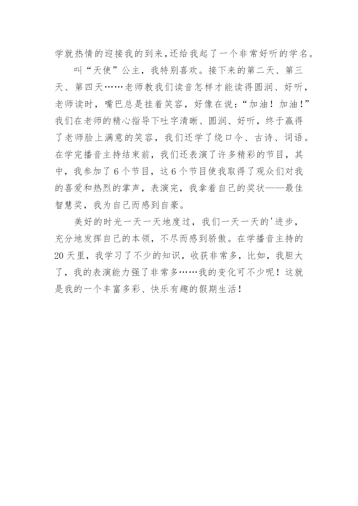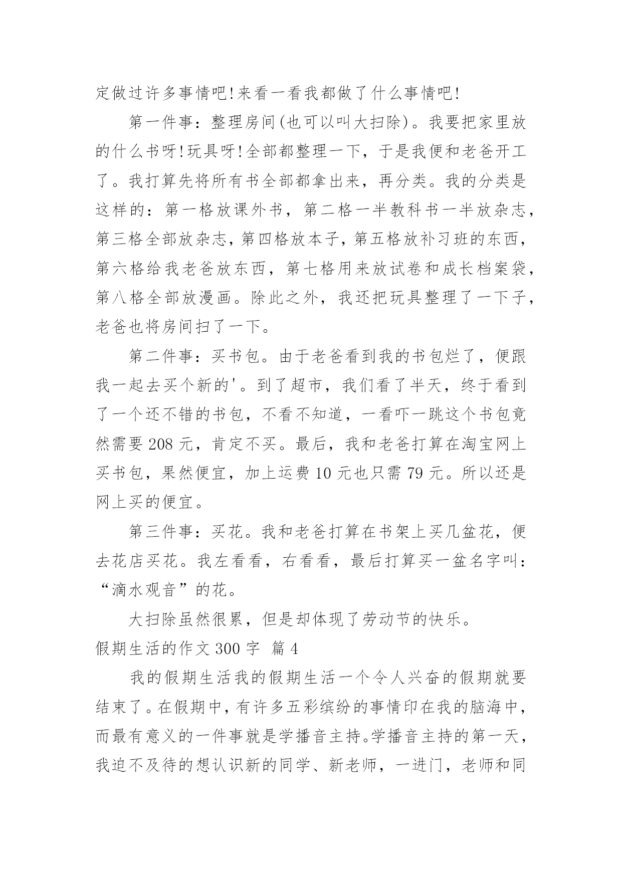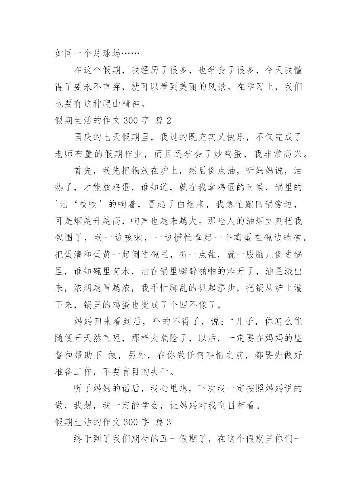 假期生活的作文300字(优选)假期生活的作文300字4篇无论是身处学校还是步入社会,大家总少不了接触作文吧,作文可分为小学作文、中学作文、大学作文(论文)。那么你知道一篇好的作文该怎么写吗?以下是小编为大家整理的假期生活的作文300字4篇,欢迎大家分享。假期生活的作文300字篇1在暑假里,时间过得飞快,仿佛只是一眨眼。我在假期里踢足球、打篮球、游泳……但令我印象最深的是我们全家去爬山。我们的目的地是太行峡谷。我们早上吃完早饭,坐车出发。一路上,我们看到了松柏、飞鸟、野花……到达林州太行大峡谷,可谓是人山人海,开始了今天的主要任务——爬山。我们一家四口有说有笑,走向山顶。没走一会儿,我的意志就破灭了,眼看还有一大半的路,我便打退堂鼓。咦,前面那是什么?哦,原来是玻璃栈道呀。我兴致勃勃地走上前去,随着电梯不断升高,我的心情也越来越紧张,从景观台上可以看到绿水青山,玻璃栈道分为三层,第一层人最多,而三层人很少,我想大概是人们恐高吧。我和爸爸一起走向第三层,我终于知道为什么人这么少了,因为这里是一个悬空的景观台。我的腿也忍不住抖了起来。告别了玻璃栈道,我们继续朝山顶走去,我又精神焕发。来到山顶,风景无限好。公路犹如一条长长的.蚯蚓,田野如同一个足球场……在这个假期,我经历了很多,也学会了很多,今天我懂得了要永不言弃,就可以看到美丽的风景。在学习上,我们也要有这种爬山精神。假期生活的作文300字篇2国庆的七天假期里,我过的既充实又快乐,不仅完成了老师布置的假期作业,而且还学会了炒鸡蛋,我非常高兴。首先,我先把锅放在炉上,然后倒点油,听妈妈说,油热了,才能放鸡蛋,谁知道,就在我拿鸡蛋的时候,锅里的'油‘吱吱’的响着,冒起了白烟来,我急忙跑回锅旁边,可是烟越升越高,响声也越来越大。那呛人的油烟立刻把我包围了,我一边咳嗽,一边慌忙拿起一个鸡蛋在碗边磕破。把蛋清和蛋黄一起倒进碗里,抓一点盐,就一股脑儿倒进锅里,谁知碗里有水,油在锅里噼噼啪啪的炸开了,油星溅出来,浓烟越冒越浓,我手忙脚乱的抓起湿步,把锅从炉上端下来,锅里的鸡蛋也变成了个四不像了,妈妈回来看到后,吓的不得了,说;‘儿子,你怎么能随便开天然气呢,那样太危险了,以后,一定要在妈妈的监督和帮助下做,另外,在你做任何事情之前,都要先做好准备工作,不要盲目的去干。听了妈妈的话后,我心里想,下次我一定按照妈妈说的做,我想,我一定能学会,让妈妈对我刮目相看。假期生活的作文300字篇3终于到了我们期待的五一假期了,在这个假期里你们一定做过许多事情吧!来看一看我都做了什么事情吧!第一件事:整理房间(也可以叫大扫除)。我要把家里放的什么书呀!玩具呀!全部都整理一下,于是我便和老爸开工了。我打算先将所有书全部都拿出来,再分类。我的分类是这样的:第一格放课外书,第二格一半教科书一半放杂志,第三格全部放杂志,第四格放本子,第五格放补习班的东西,第六格给我老爸放东西,第七格用来放试卷和成长档案袋,第八格全部放漫画。除此之外,我还把玩具整理了一下子,老爸也将房间扫了一下。第二件事:买书包。由于老爸看到我的书包烂了,便跟我一起去买个新的'。到了超市,我们看了半天,终于看到了一个还不错的书包,不看不知道,一看吓一跳这个书包竟然需要208元,肯定不买。最后,我和老爸打算在淘宝网上买书包,果然便宜,加上运费10元也只需79元。所以还是网上买的便宜。第三件事:买花。我和老爸打算在书架上买几盆花,便去花店买花。我左看看,右看看,最后打算买一盆名字叫:“滴水观音”的花。大扫除虽然很累,但是却体现了劳动节的快乐。假期生活的作文300字篇4我的假期生活我的假期生活一个令人兴奋的假期就要结束了。在假期中,有许多五彩缤纷的事情印在我的脑海中,而最有意义的一件事就是学播音主持。学播音主持的第一天,我迫不及待的想认识新的同学、新老师,一进门,老师和同学就热情的迎接我的到来,还给我起了一个非常好听的学名。叫“天使”公主,我特别喜欢。接下来的第二天、第三天、第四天……老师教我们读音怎样才能读得圆润、好听,老师读时,嘴巴总是挂着笑容,好像在说:“加油!加油!”我们在老师的精心指导下吐字清晰、圆润、好听,终于赢得了老师脸上满意的笑容,我们还学了绕口令、古诗、词语。在学完播音主持结束前,我们还表演了许多精彩的节目,其中,我参加了6个节目,这6个节目使我取得了观众们对我的喜爱和热烈的掌声,表演完,我拿着自己的奖状——最佳智慧奖,我为自己而感到自豪。美好的时光一天一天地度过,我们一天一天的'进步,充分地发挥自己的本领,不尽而感到骄傲。在学播音主持的20天里,我学习了不少的知识,收获非常多,比如,我胆大了,我的表演能力强了非常多……我的变化可不少呢!这就是我的一个丰富多彩、快乐有趣的假期生活!